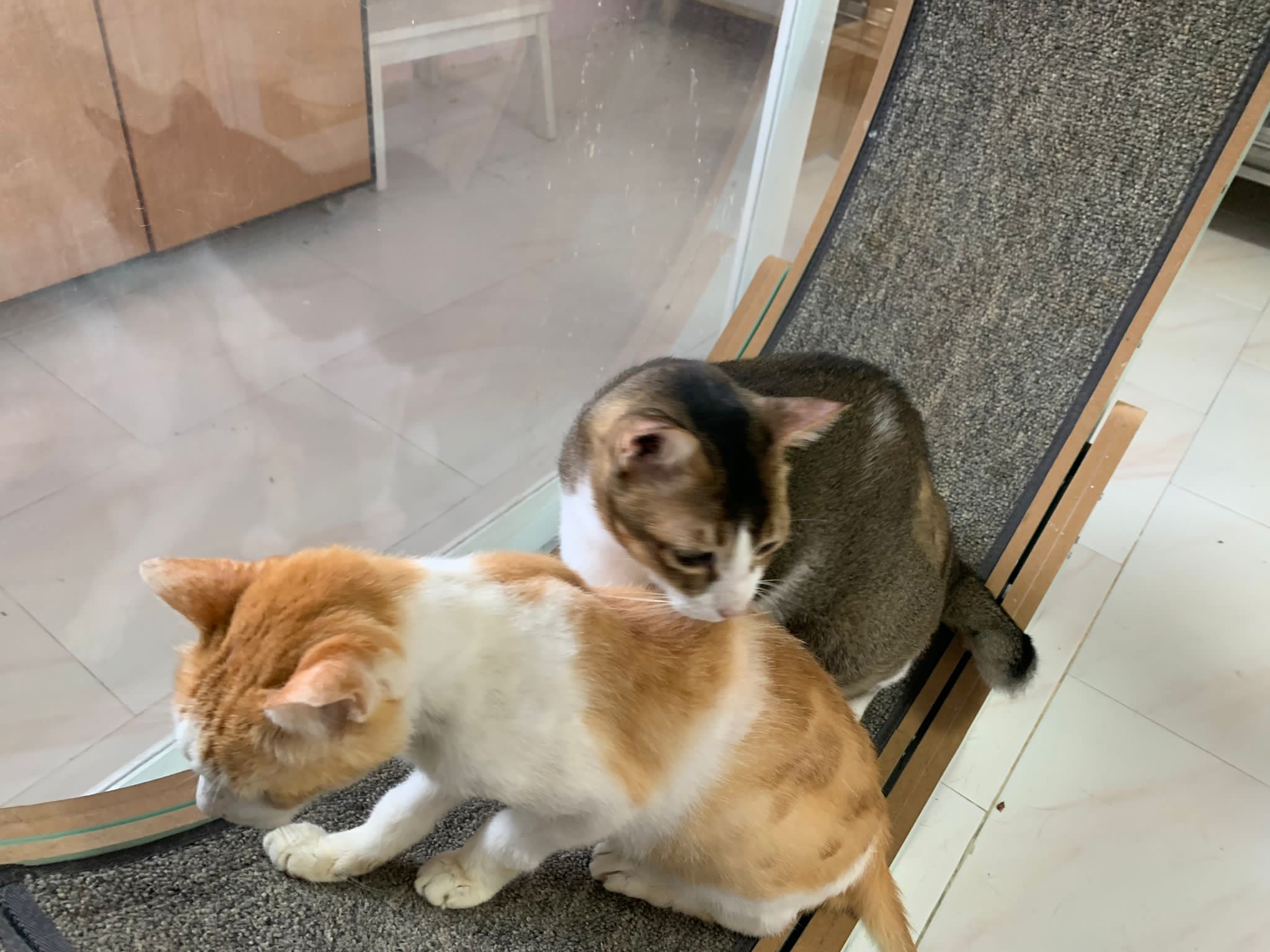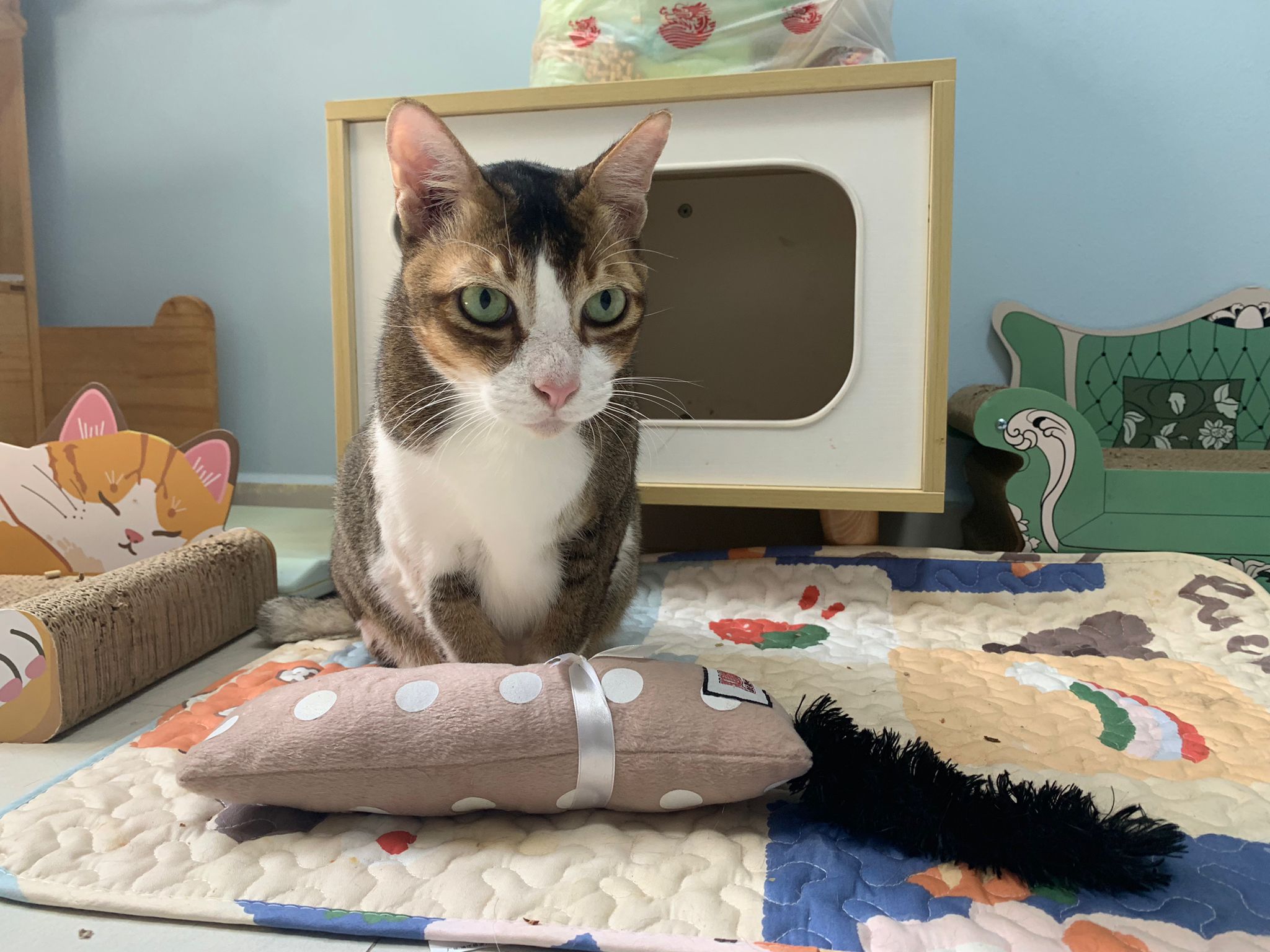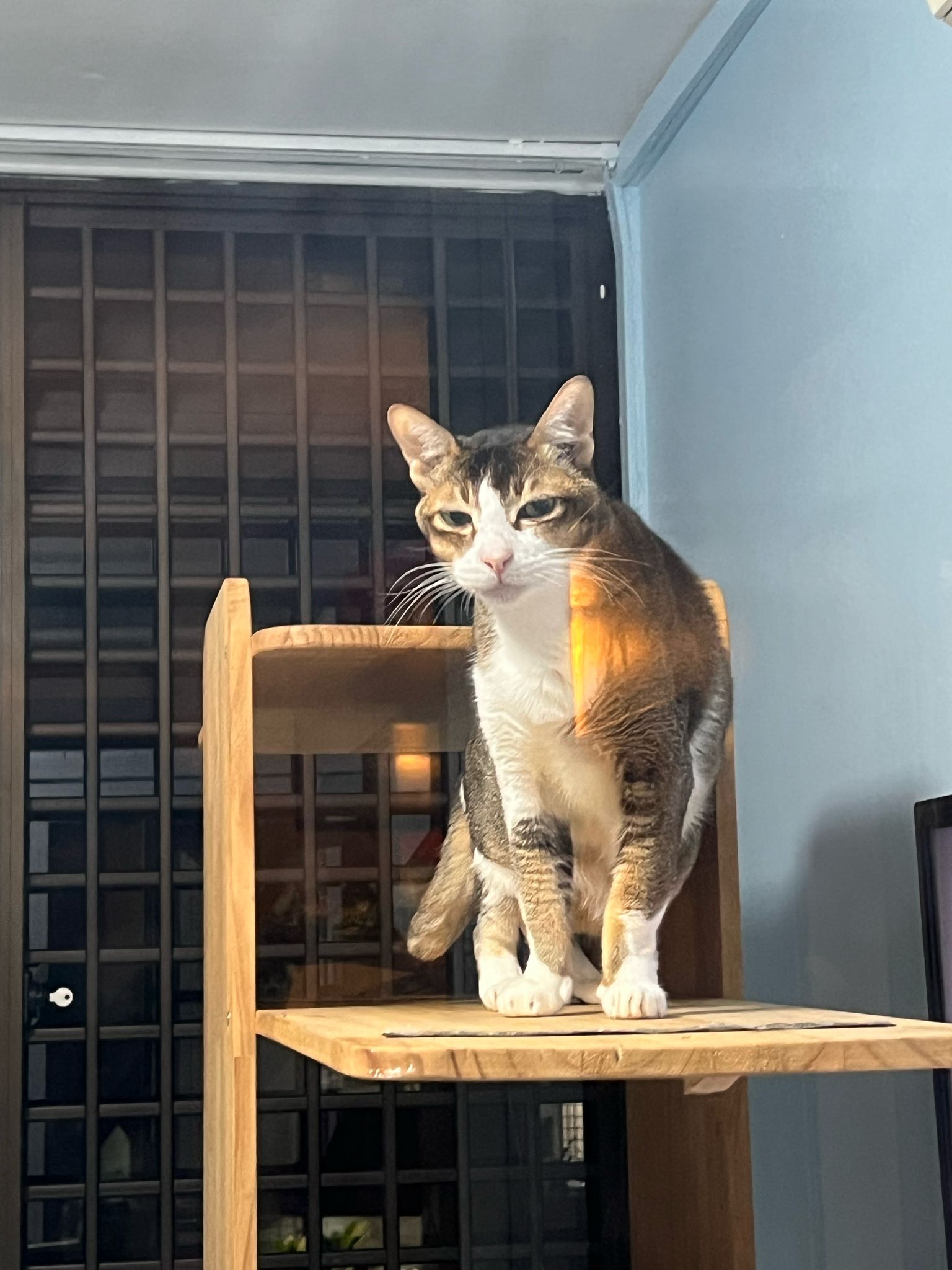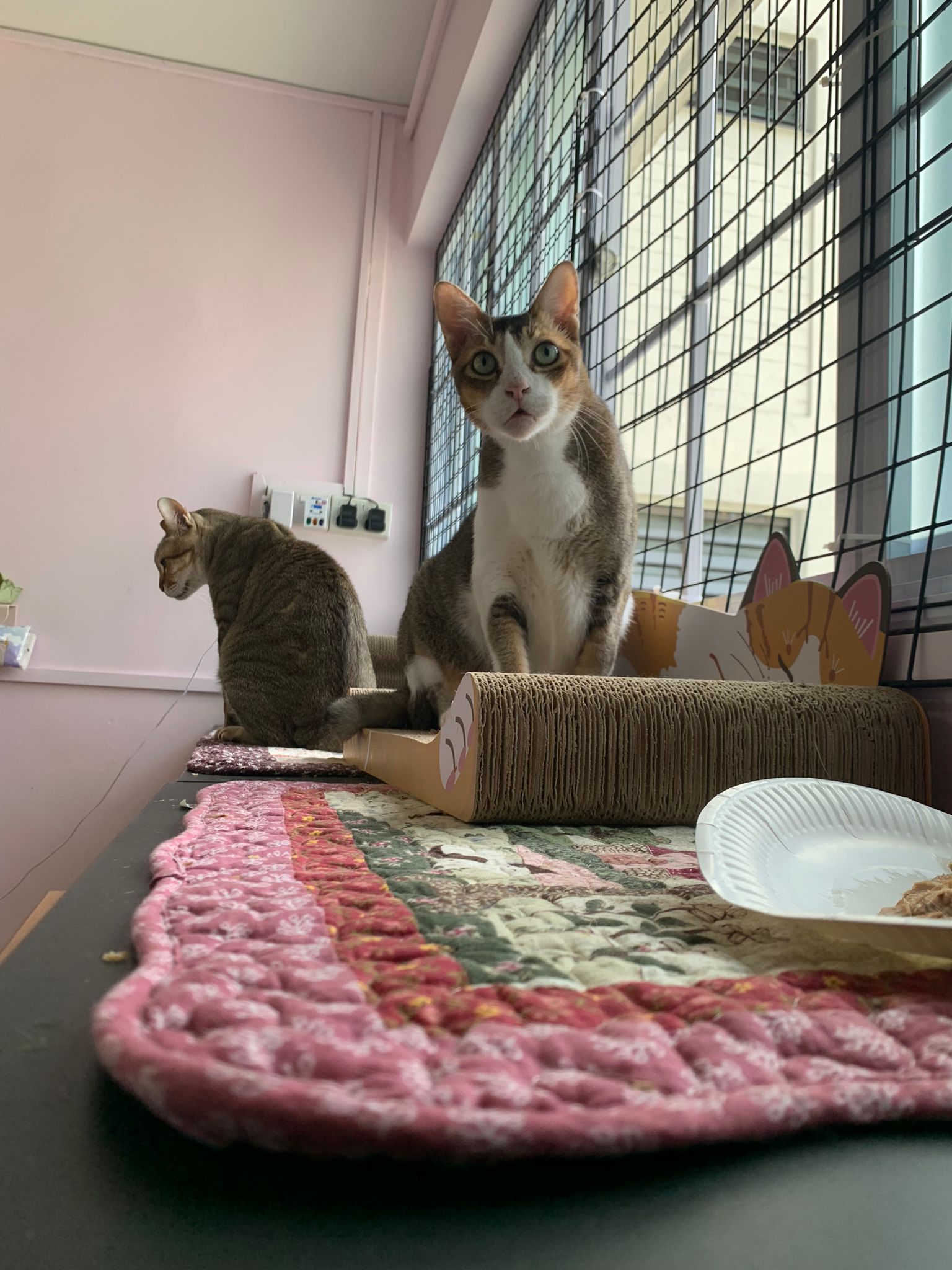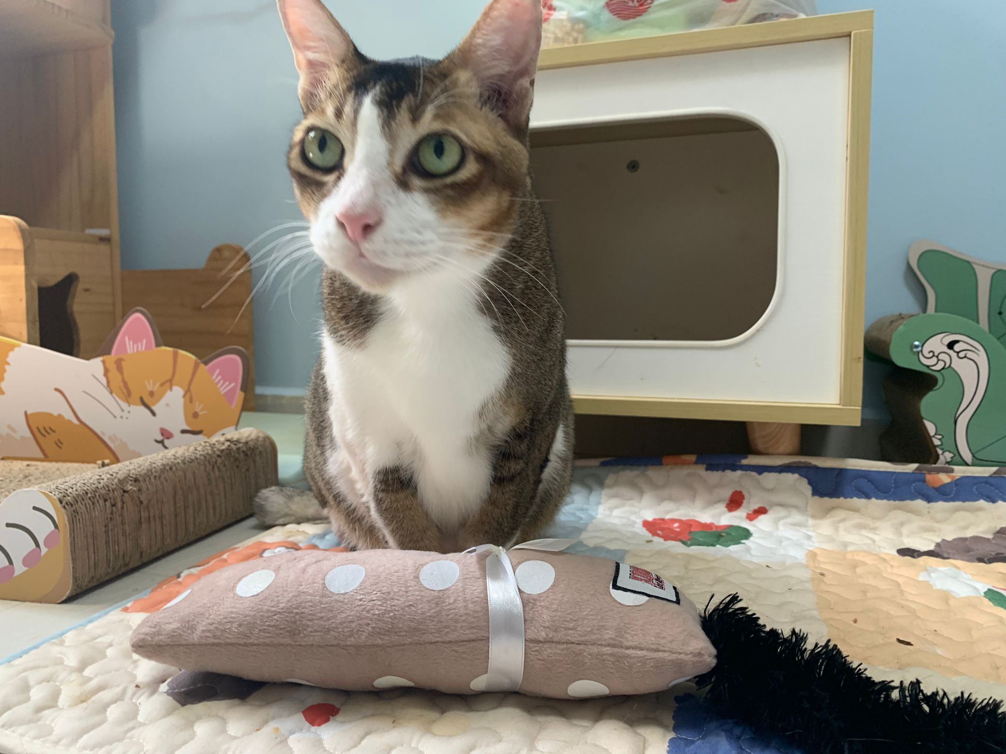1pm+: I Waited so long their bench delivery not here yet. Today throw half their cat tree away. Rearrange a little. Tmr then give them the bench 🙂