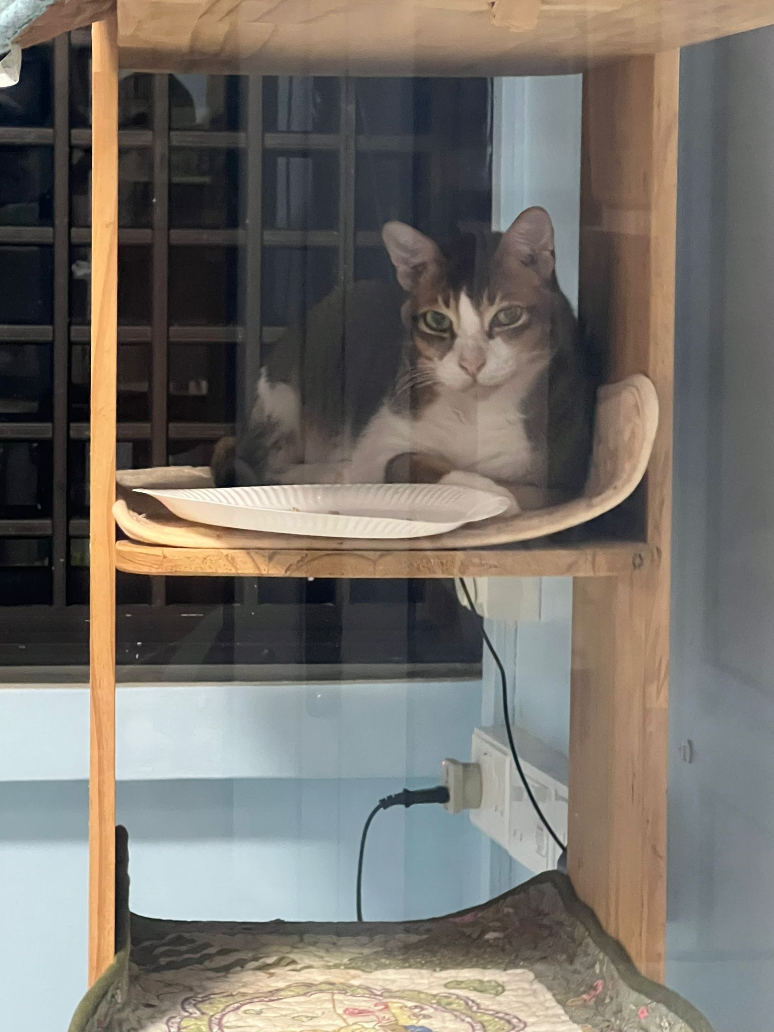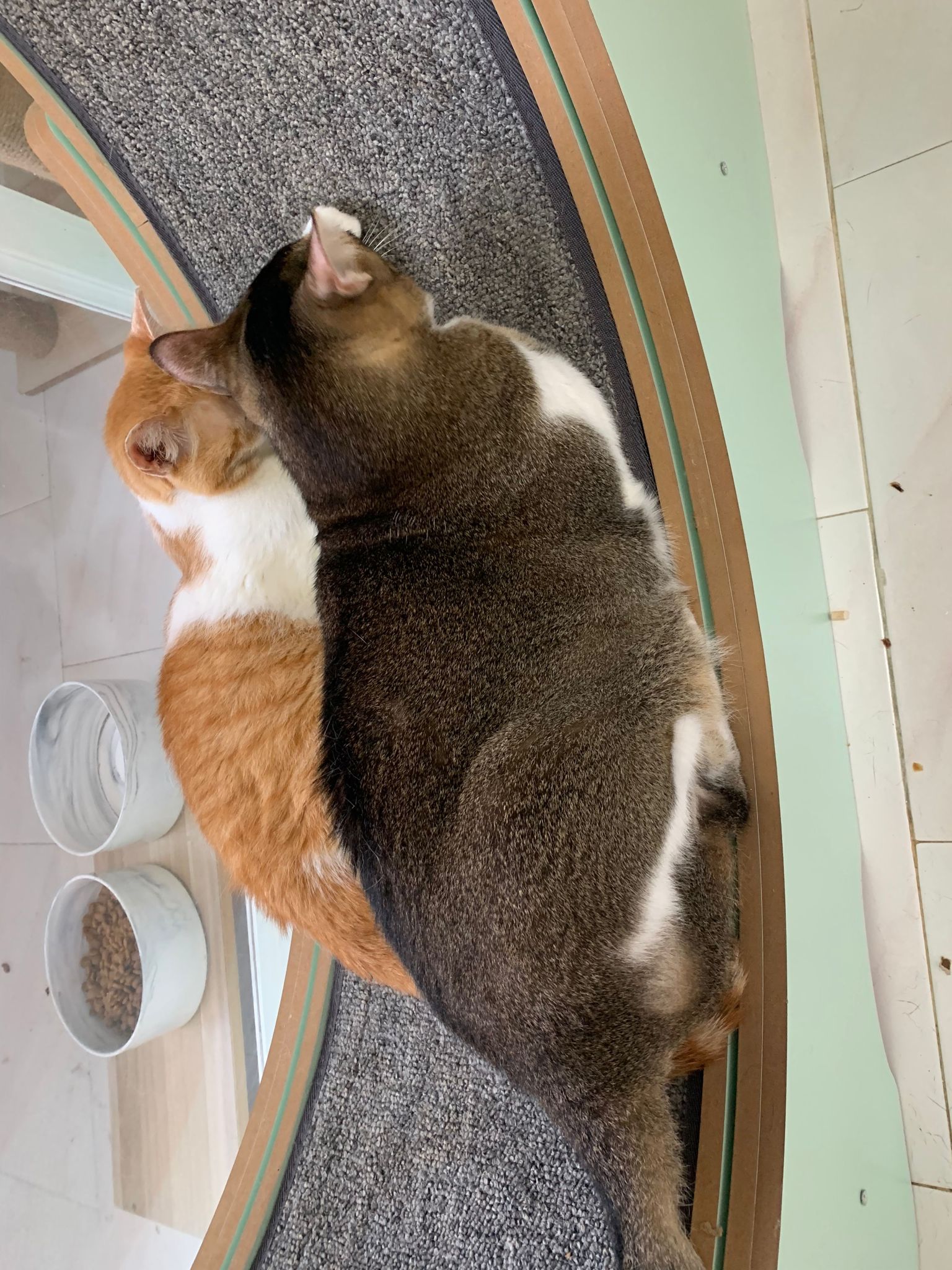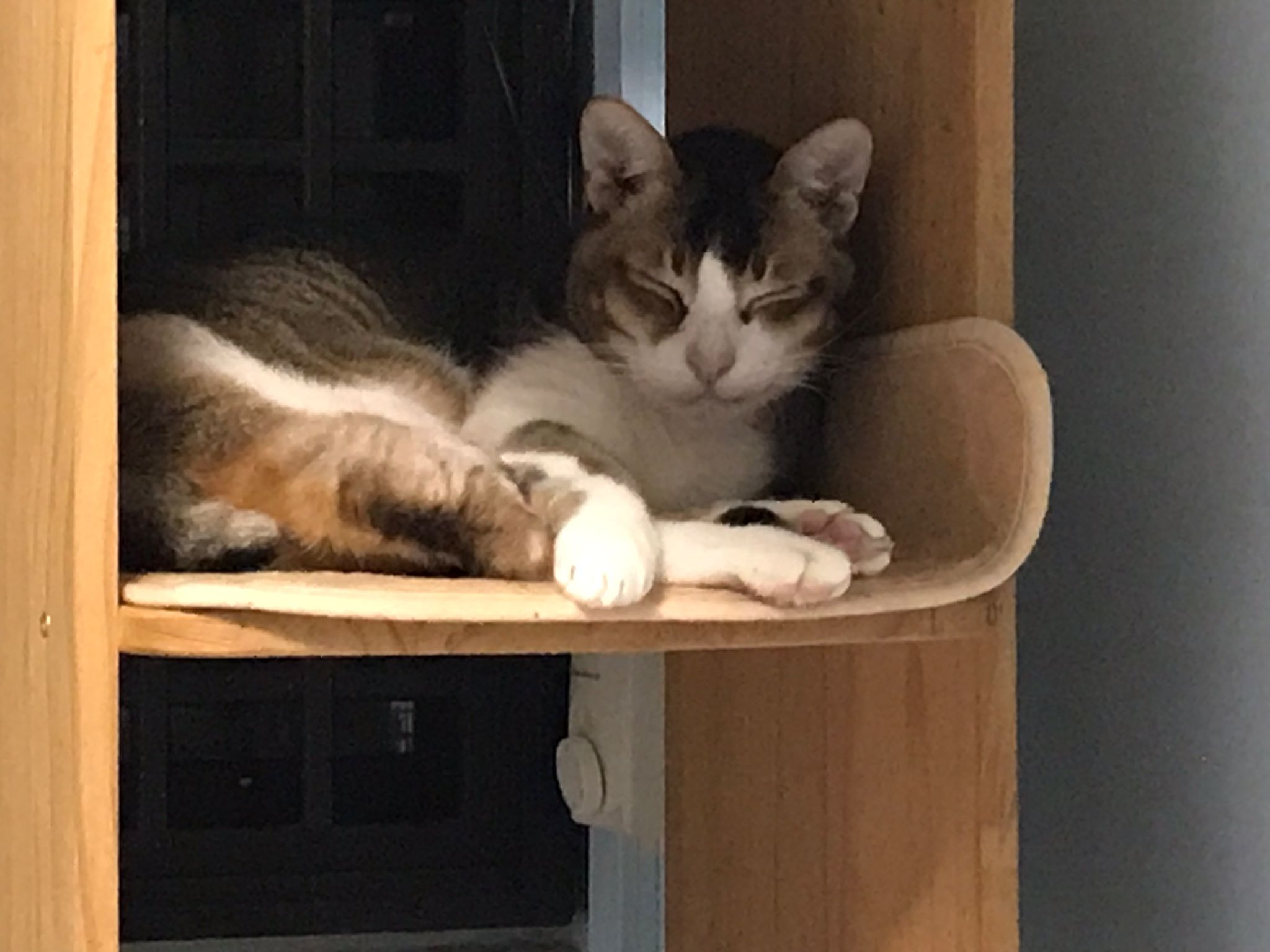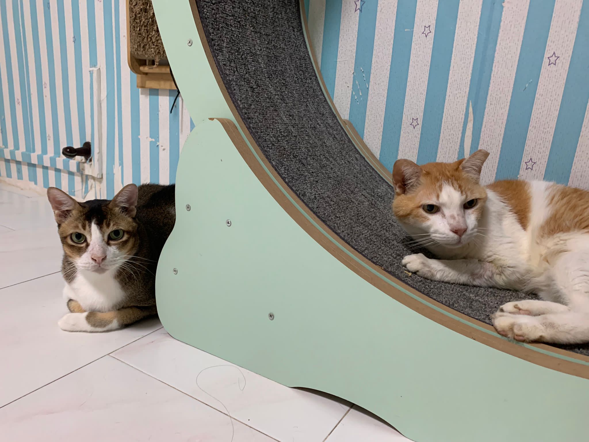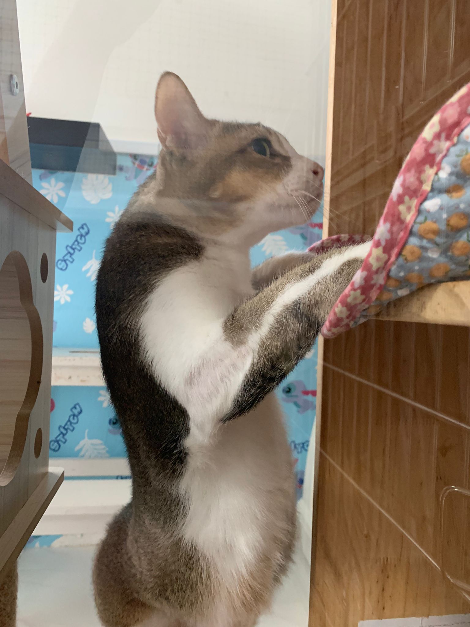 1pm+: I Waited so long their bench delivery not here yet. Today throw half their cat tree away. Rearrange a little. Tmr then give them the bench 🙂