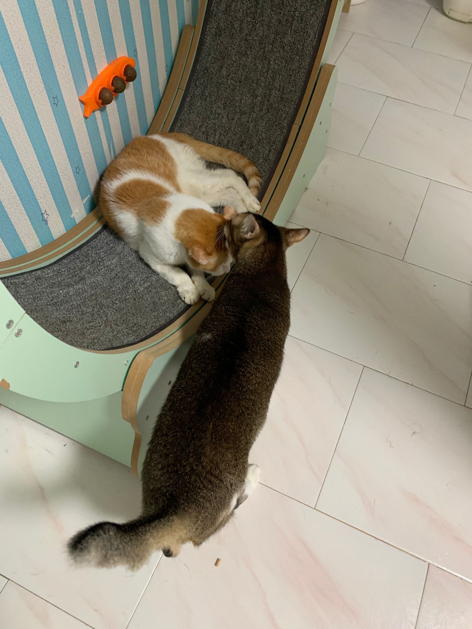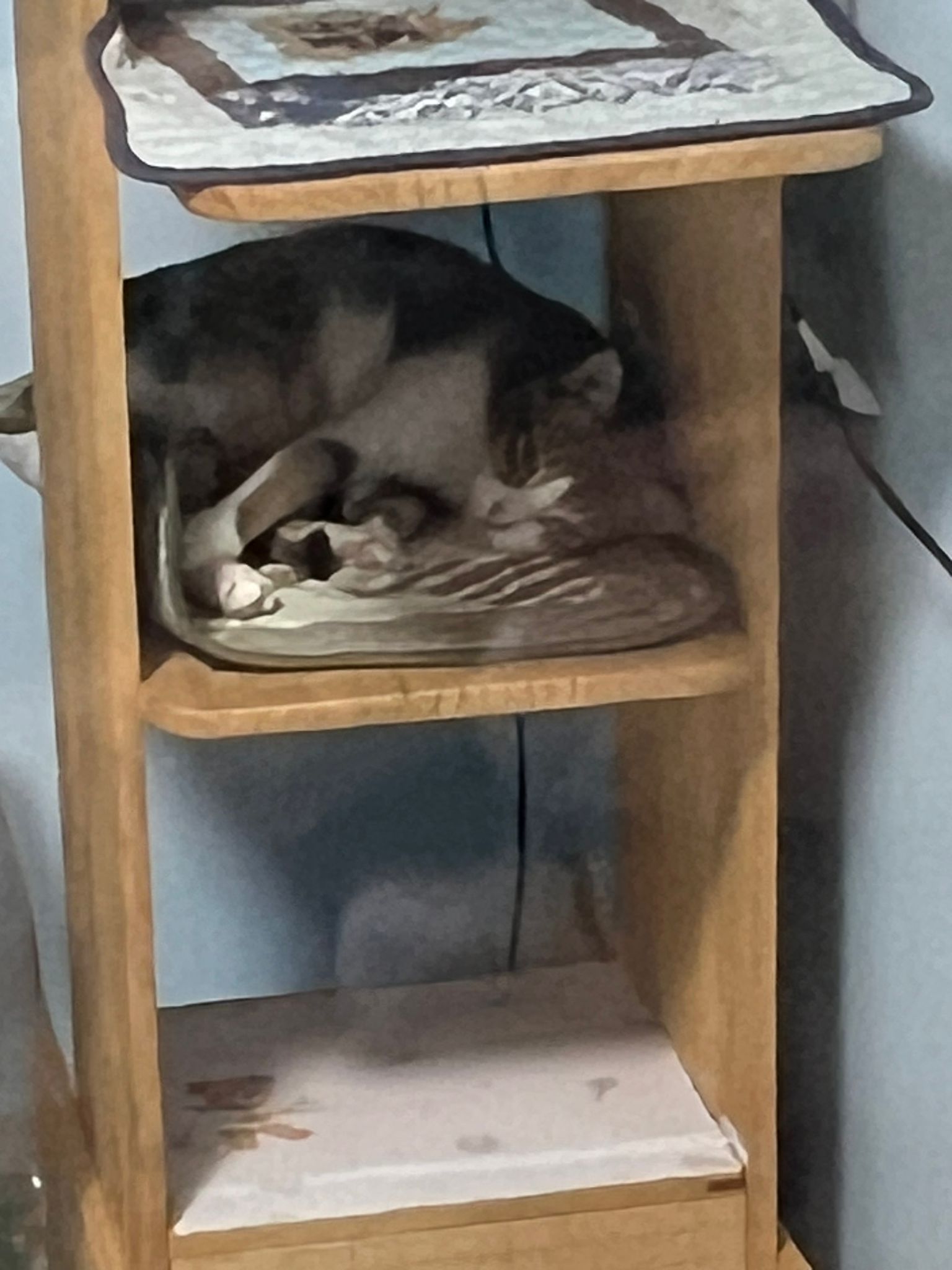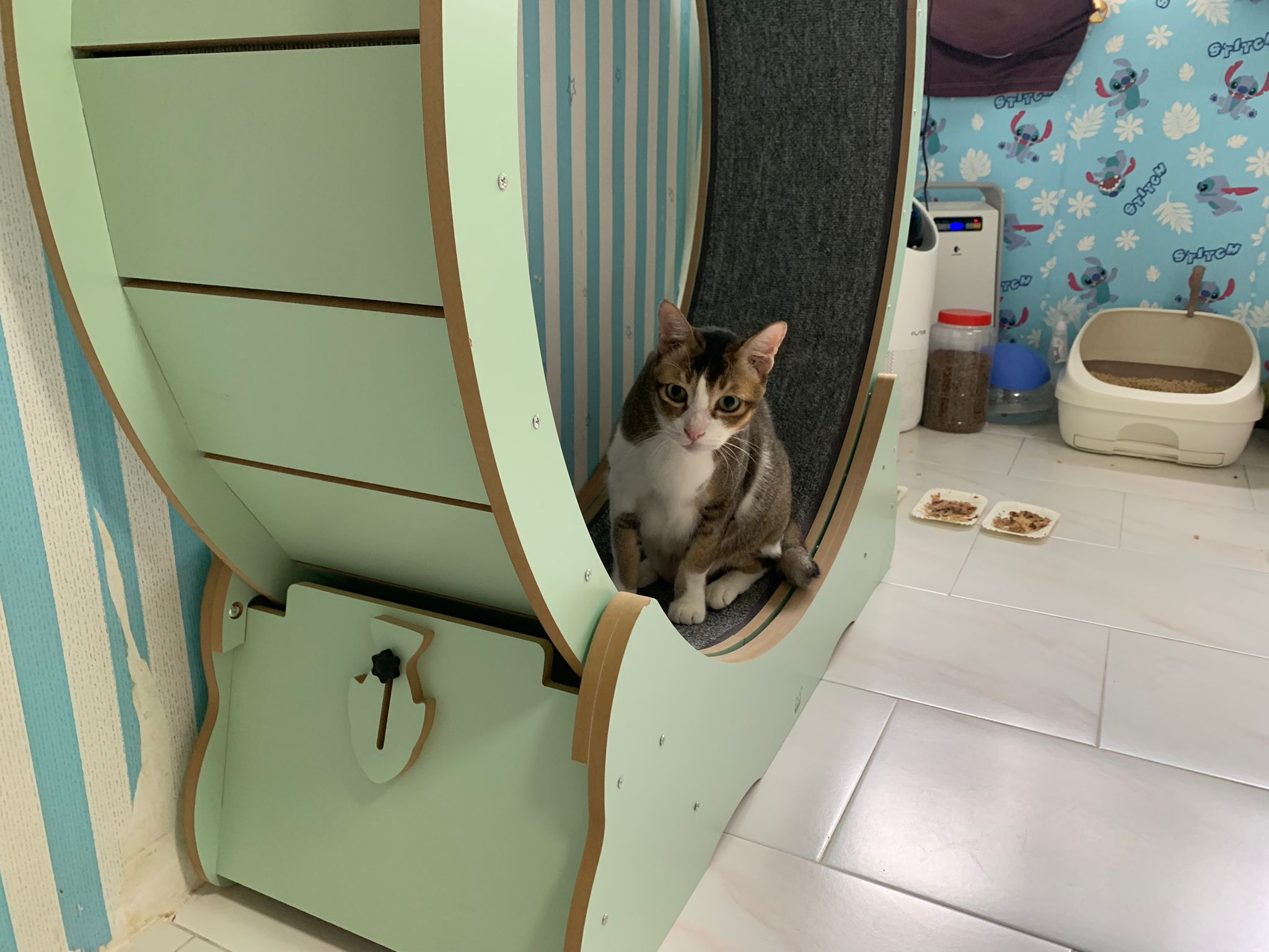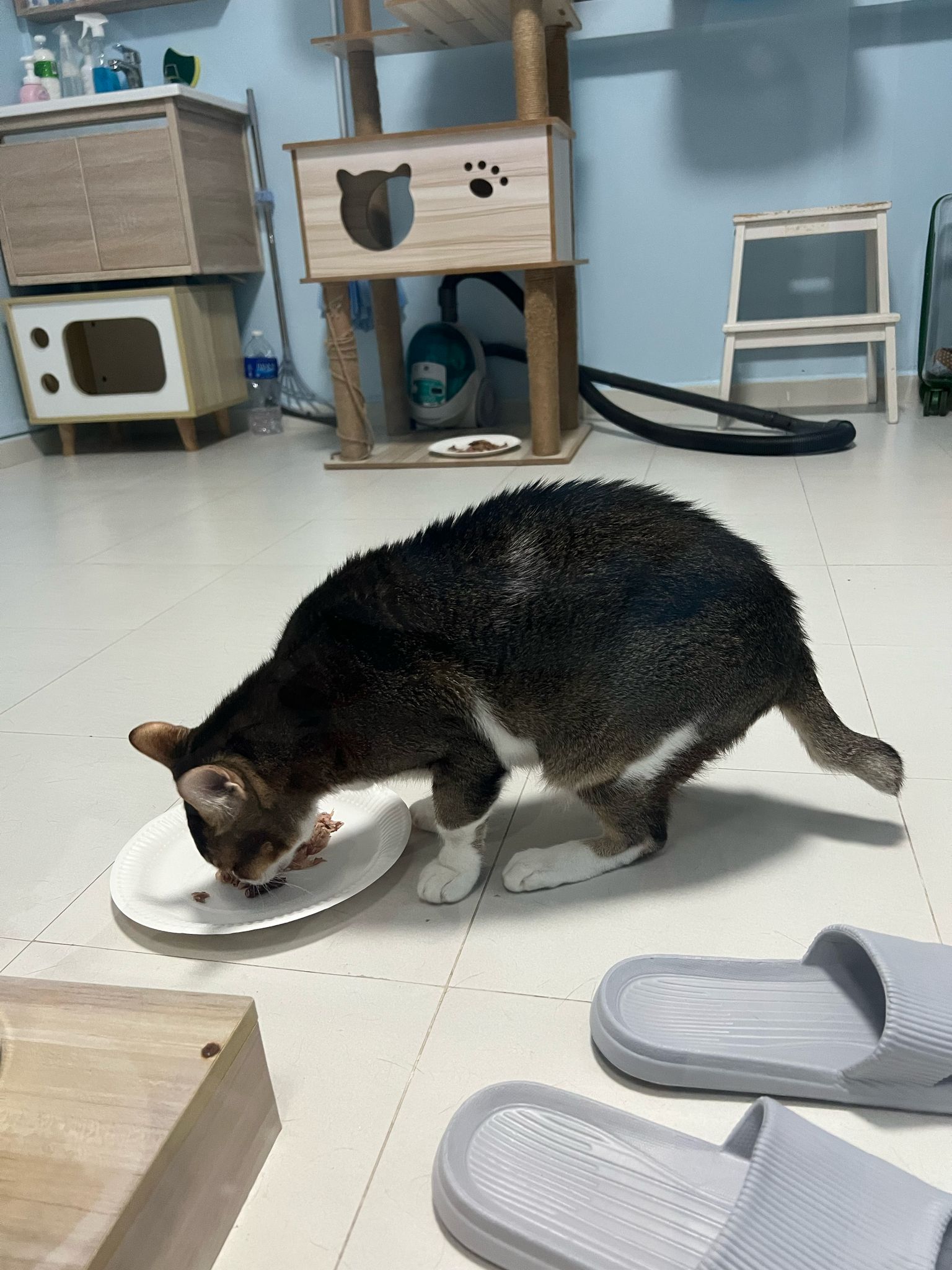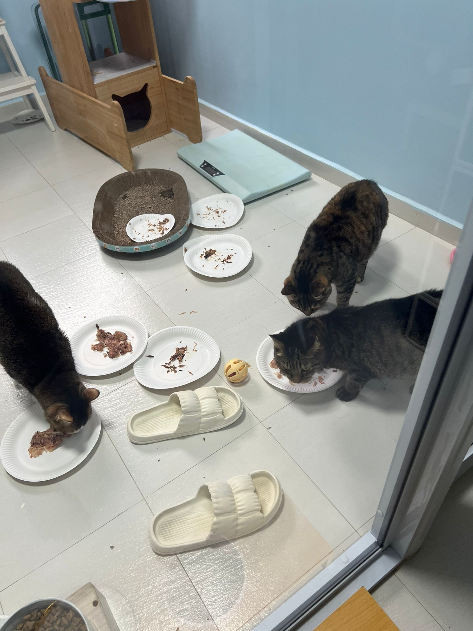 1pm+: I Waited so long their bench delivery not here yet. Today throw half their cat tree away. Rearrange a little. Tmr then give them the bench 🙂