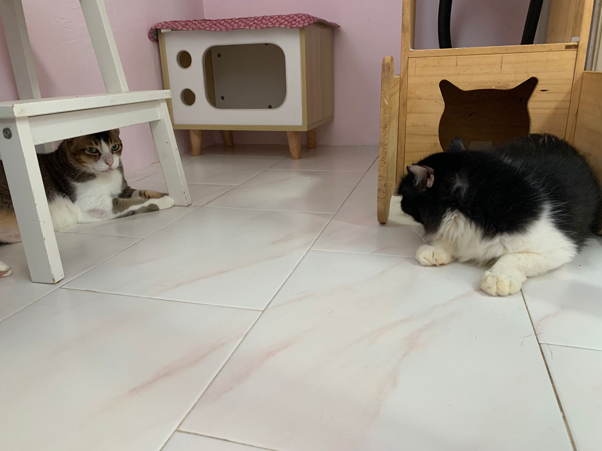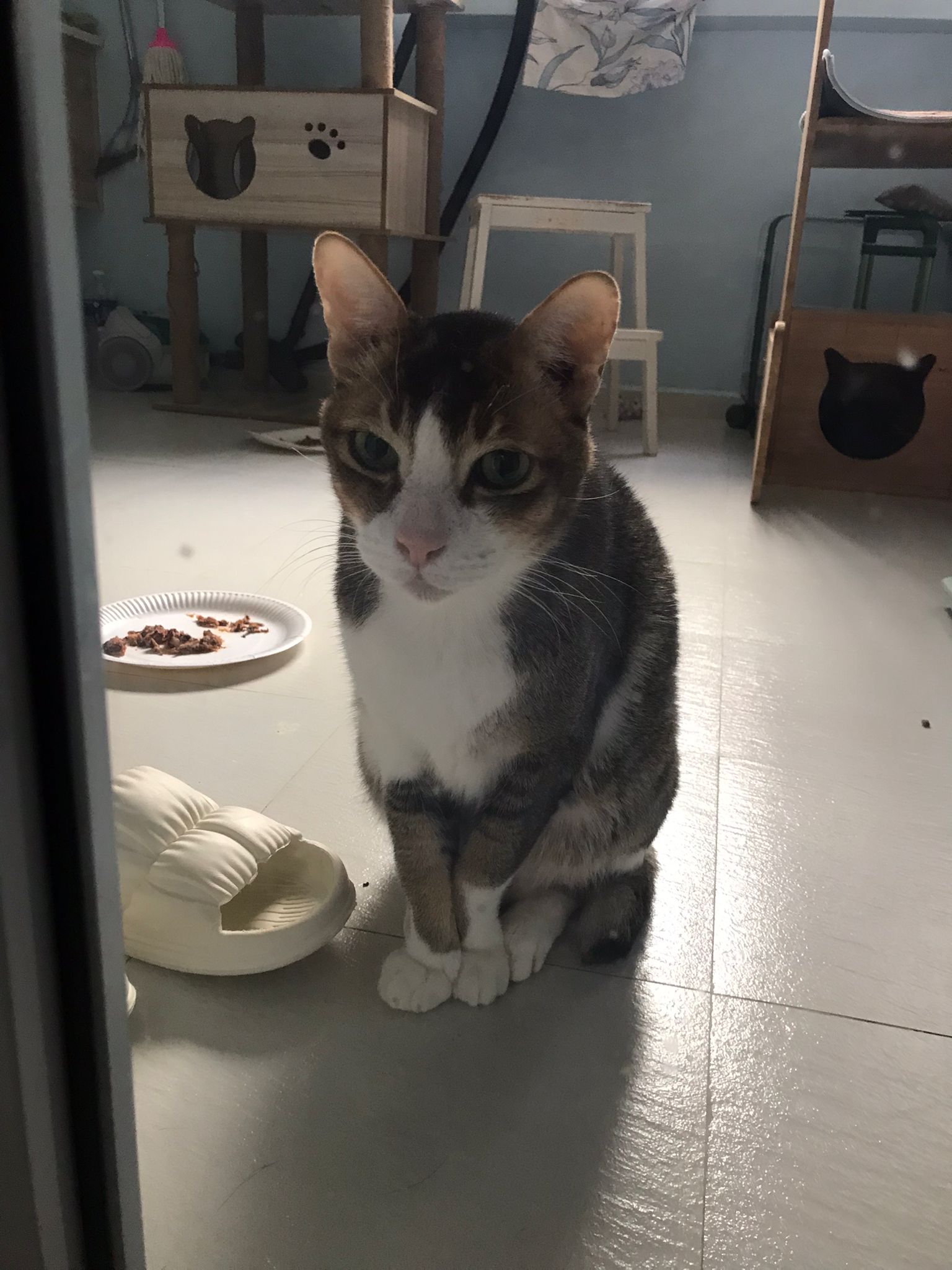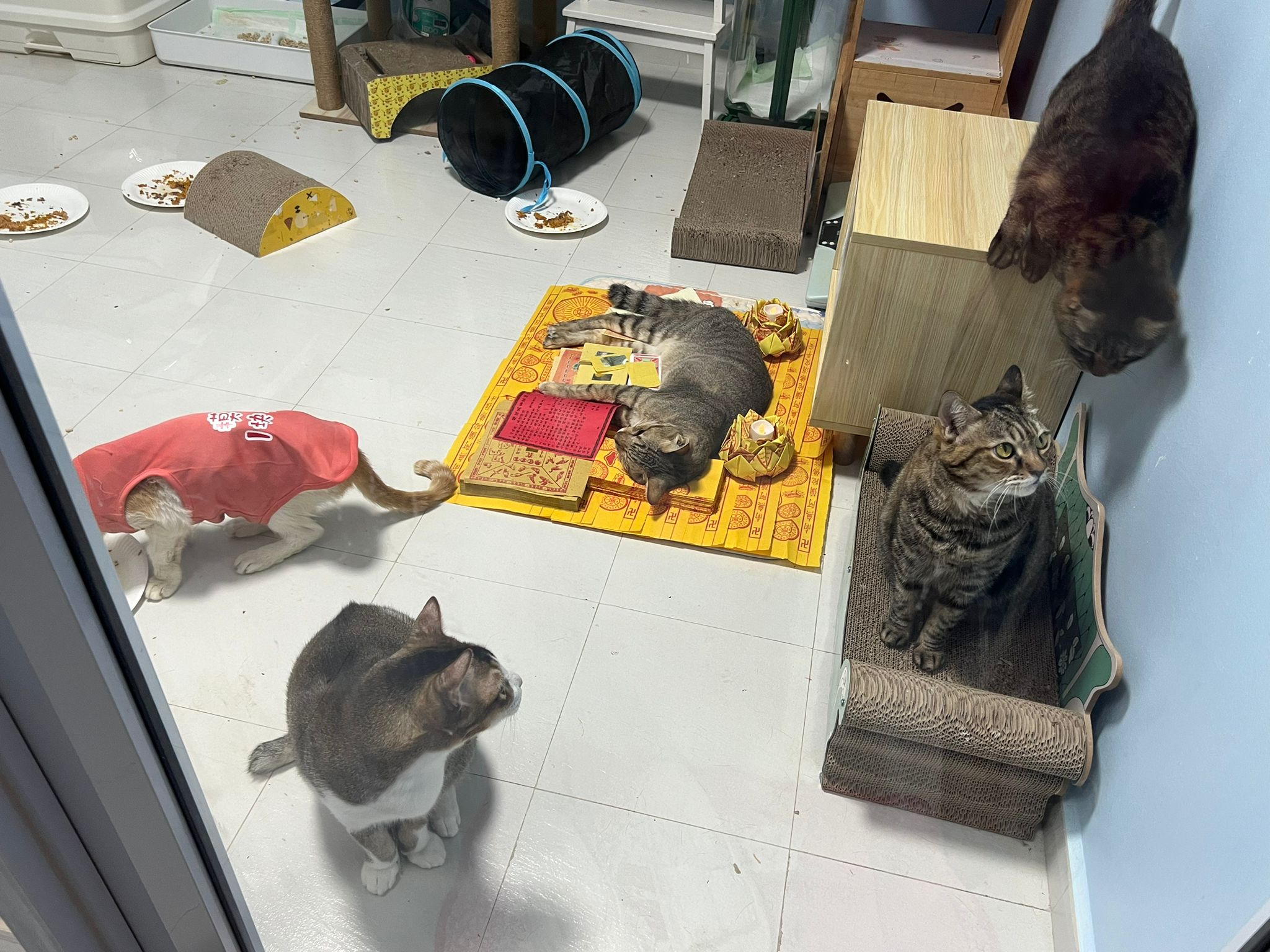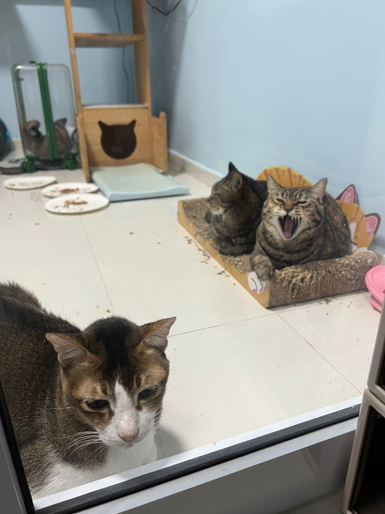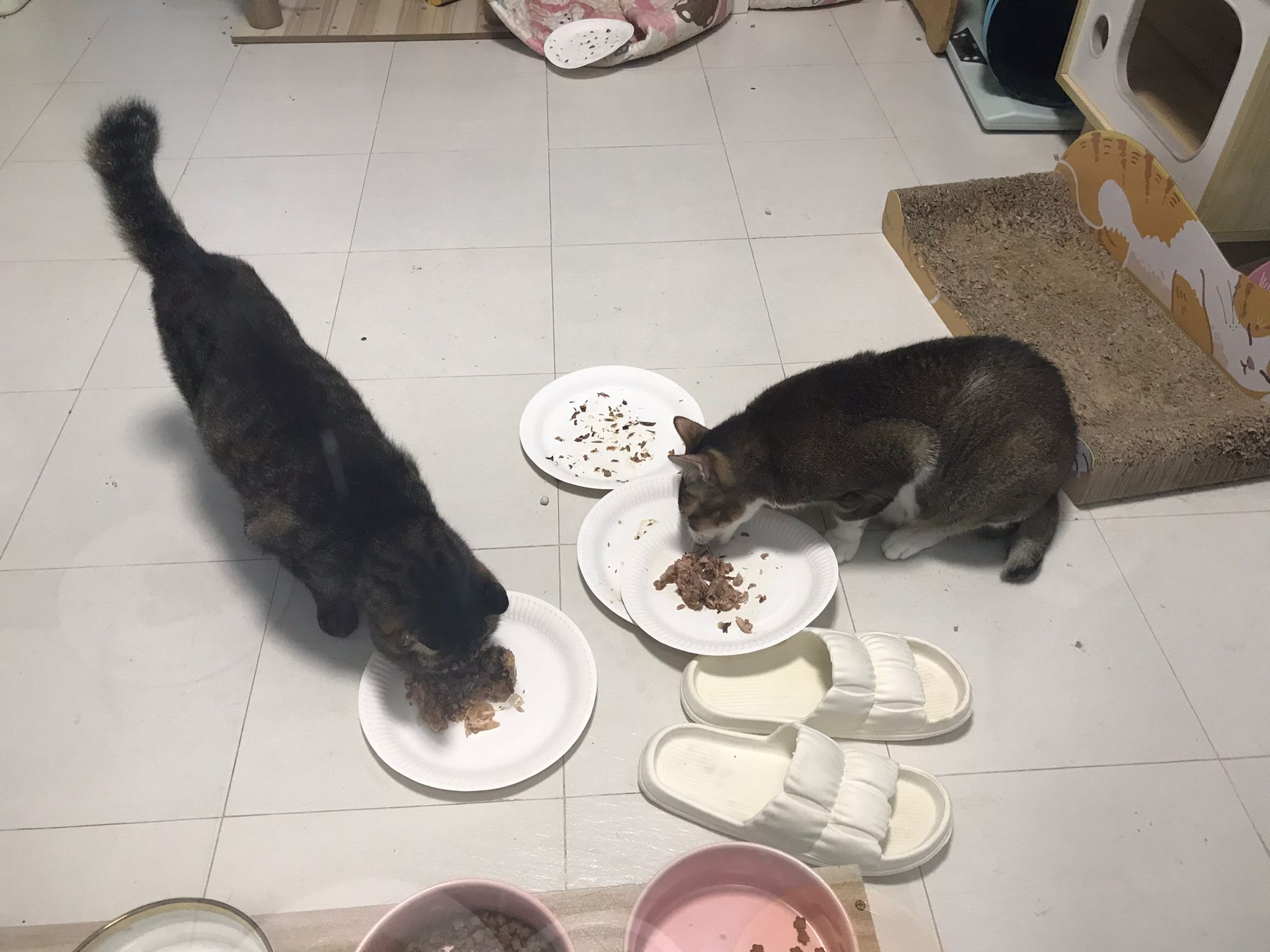 1pm+: I Waited so long their bench delivery not here yet. Today throw half their cat tree away. Rearrange a little. Tmr then give them the bench 🙂