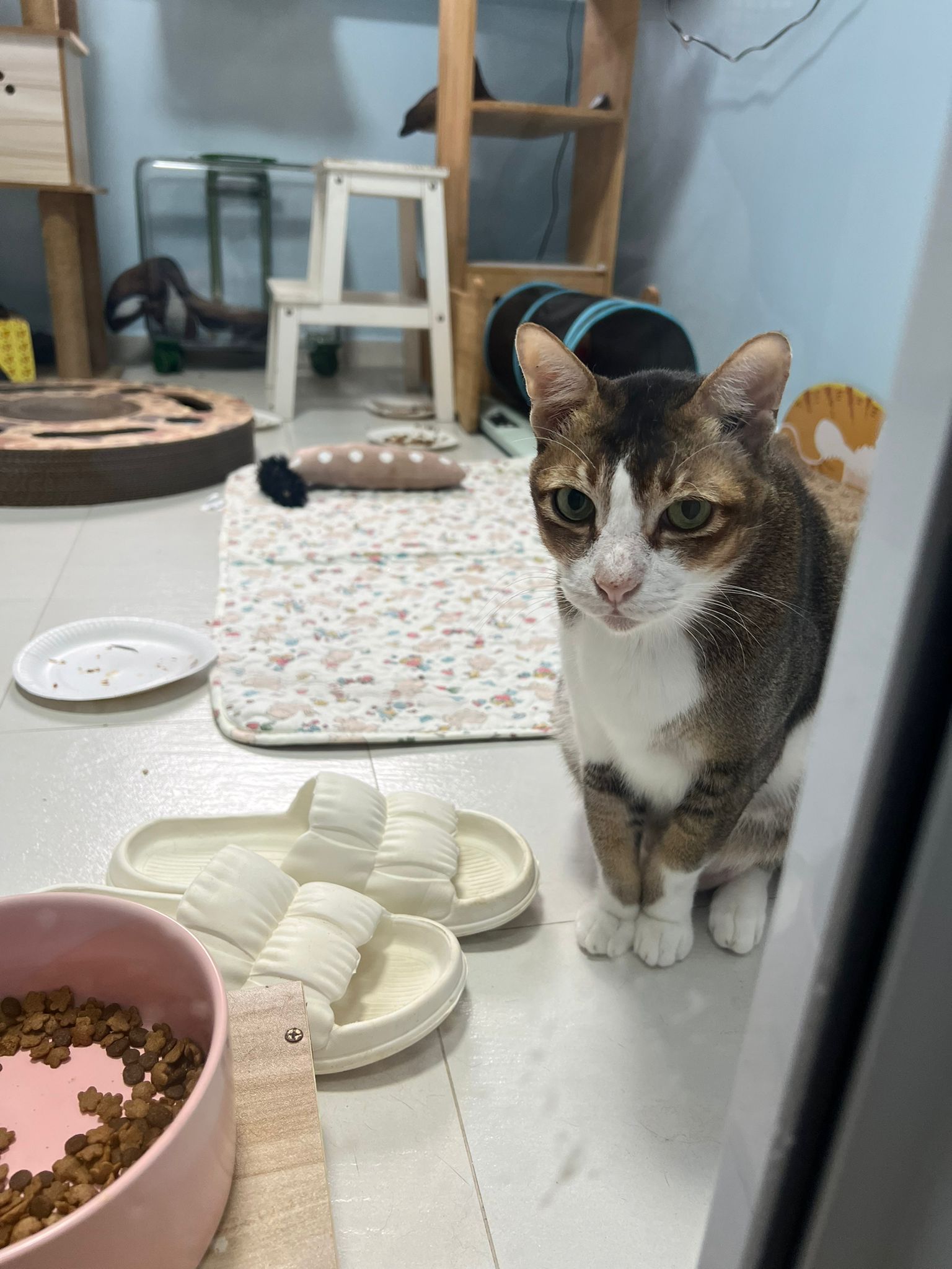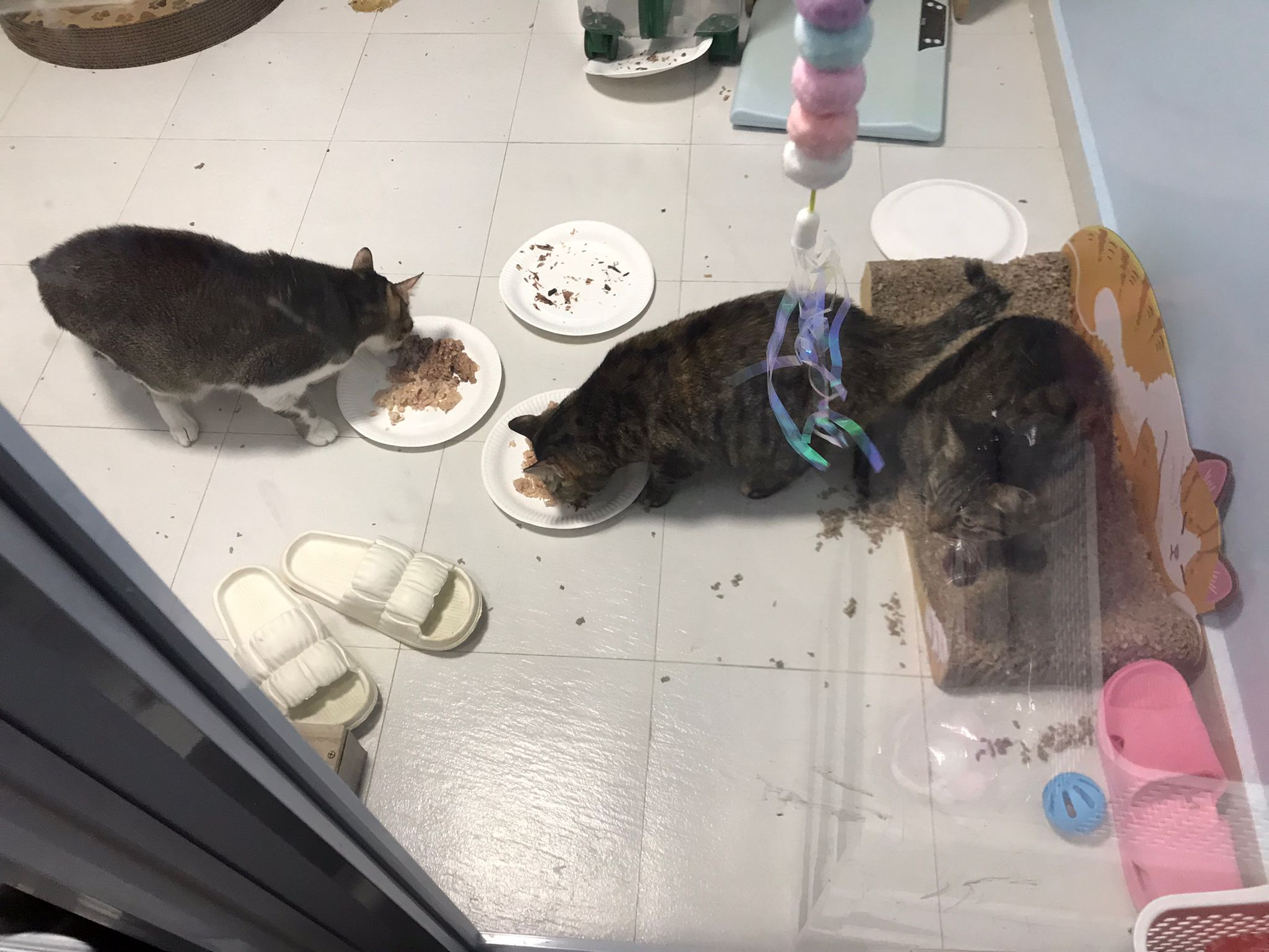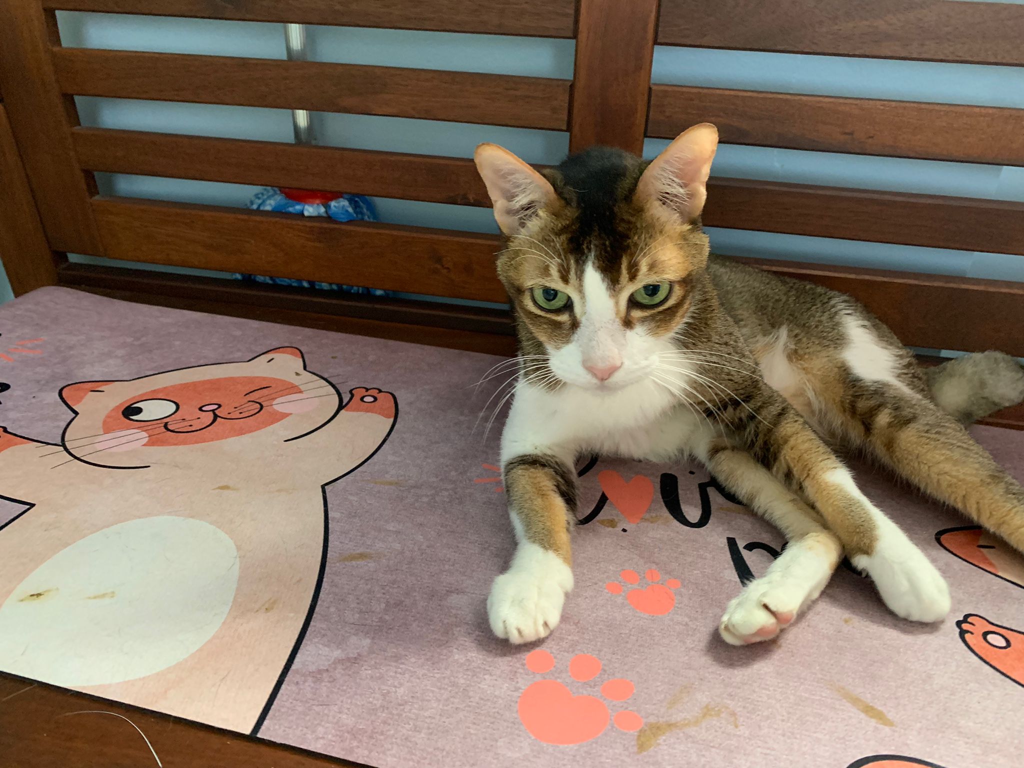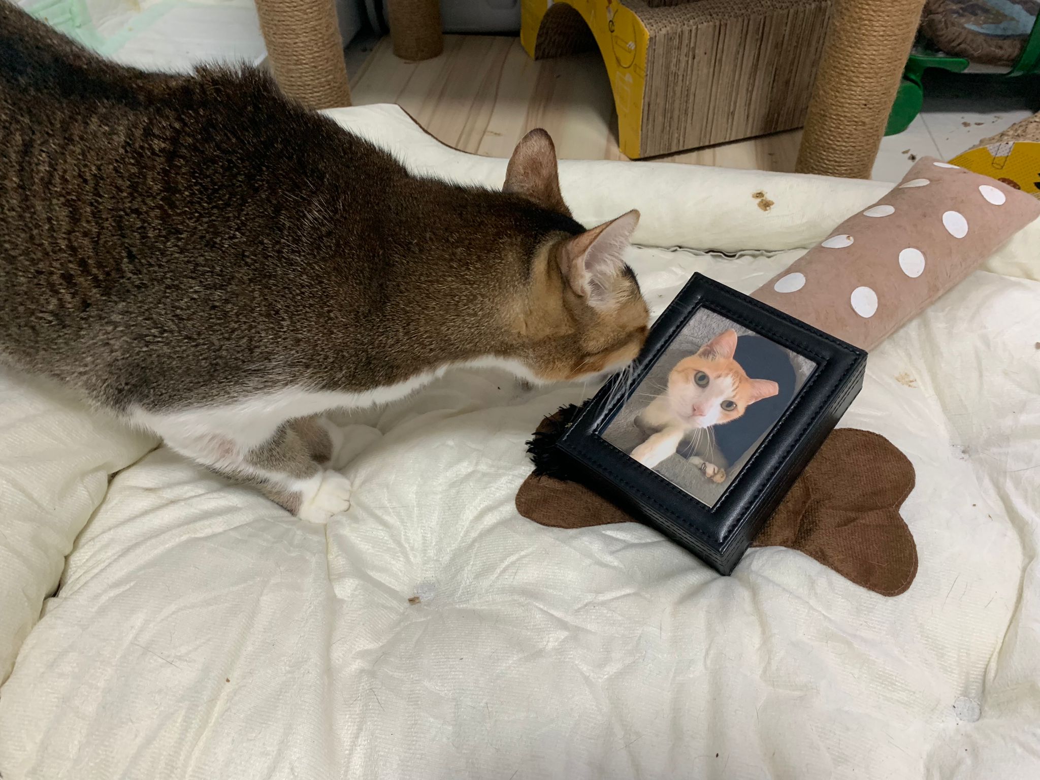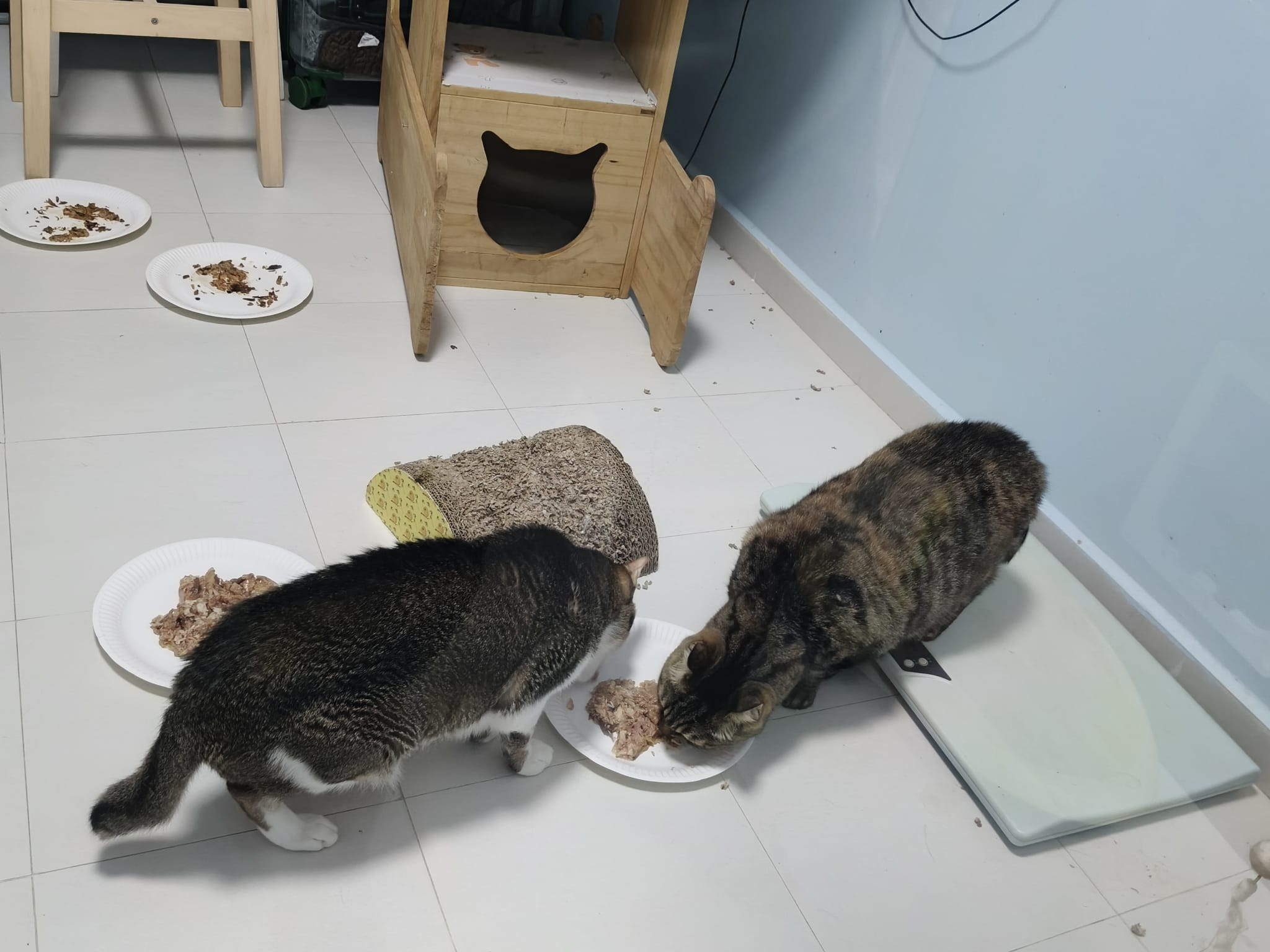 1pm+: I Waited so long their bench delivery not here yet. Today throw half their cat tree away. Rearrange a little. Tmr then give them the bench 🙂