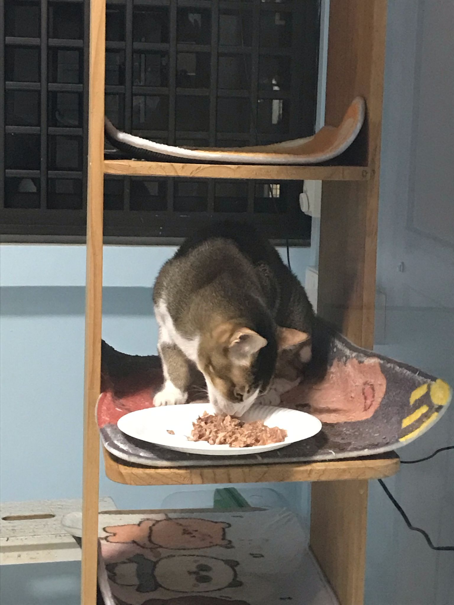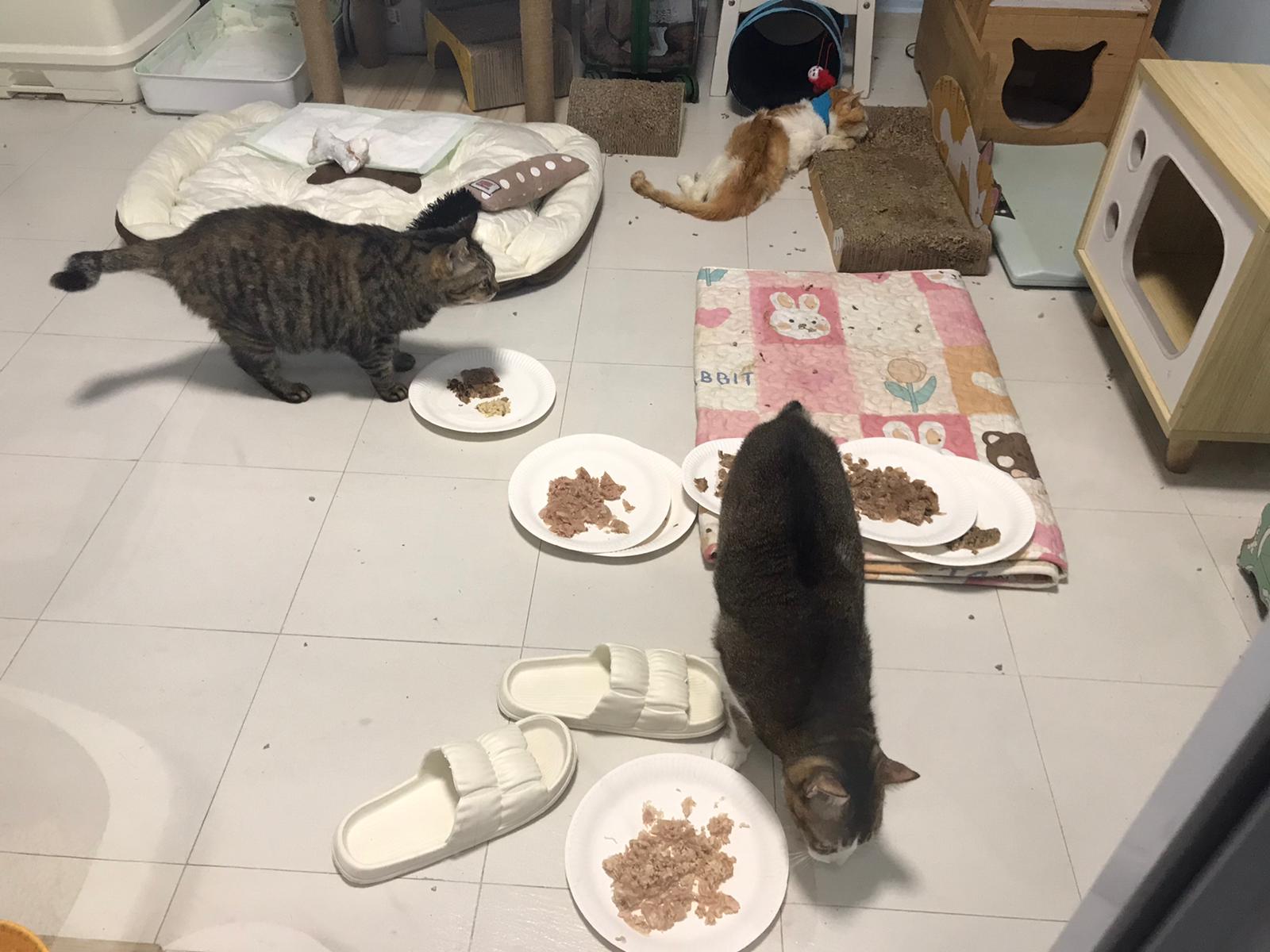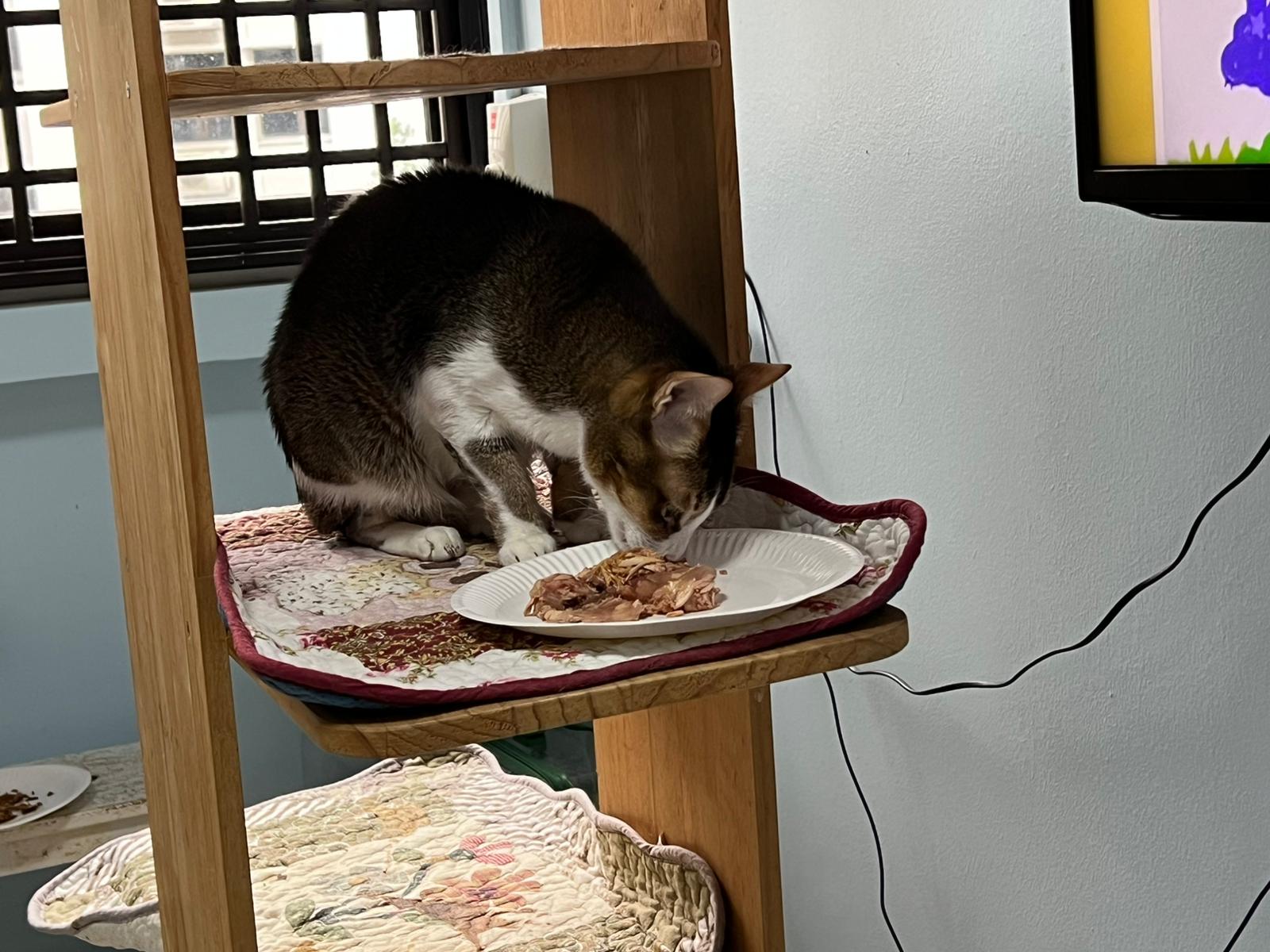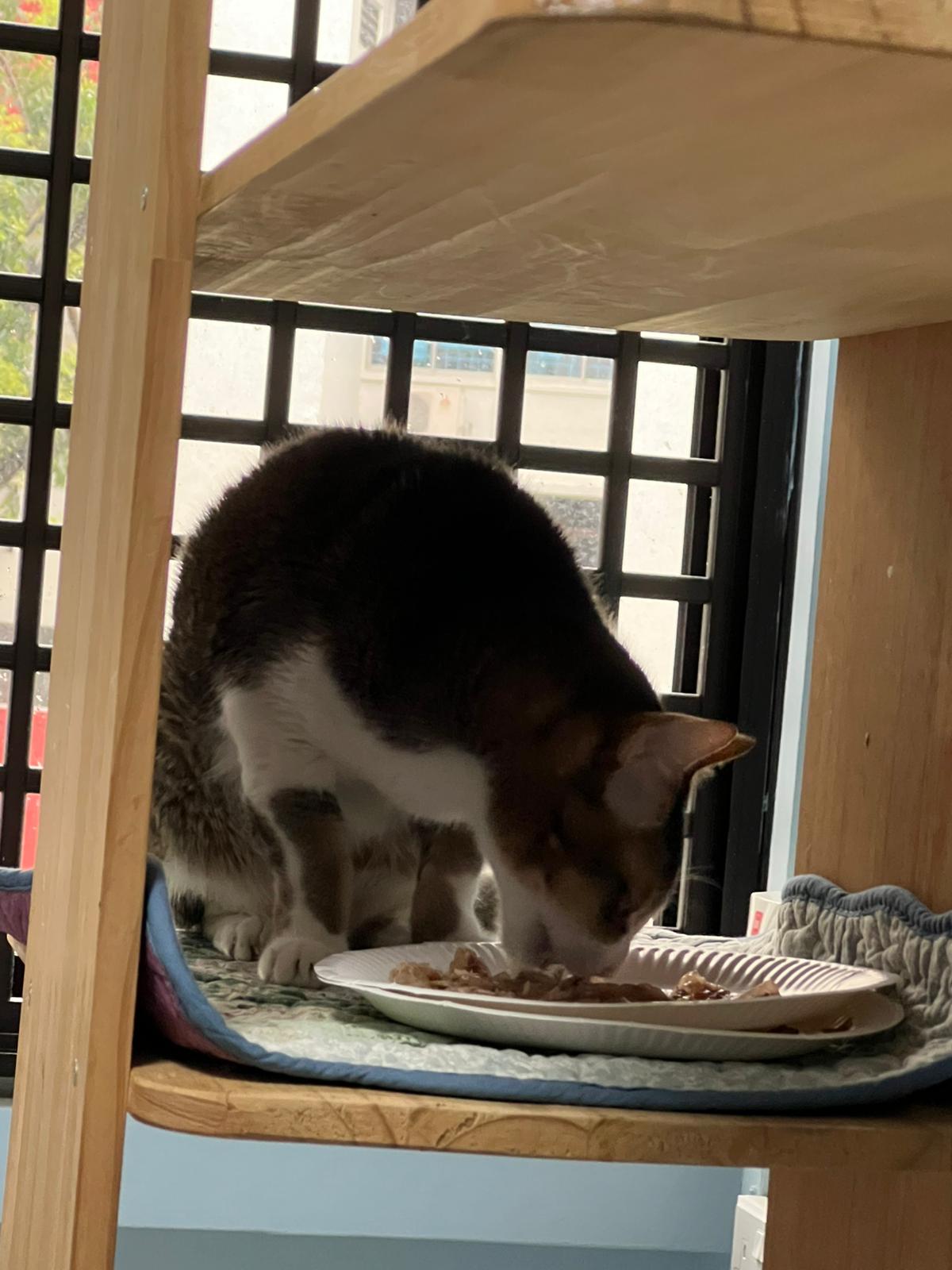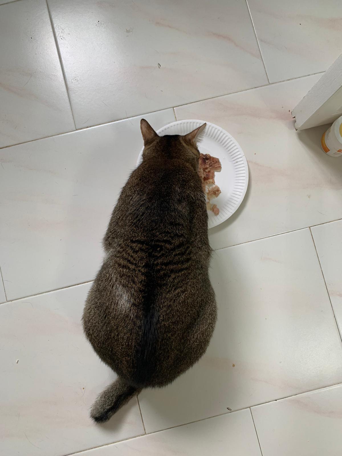 Morning; I sit on the floor outside his room packing the storage box and he meow wait for me. 1pm+: given him Clav jab and 0.15ml bupre. serve ff he finish n went on to Kerry plate. Comb both fur they r happy kid