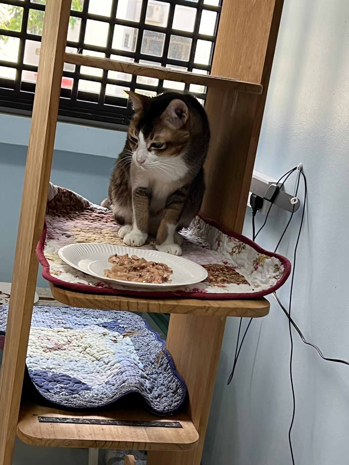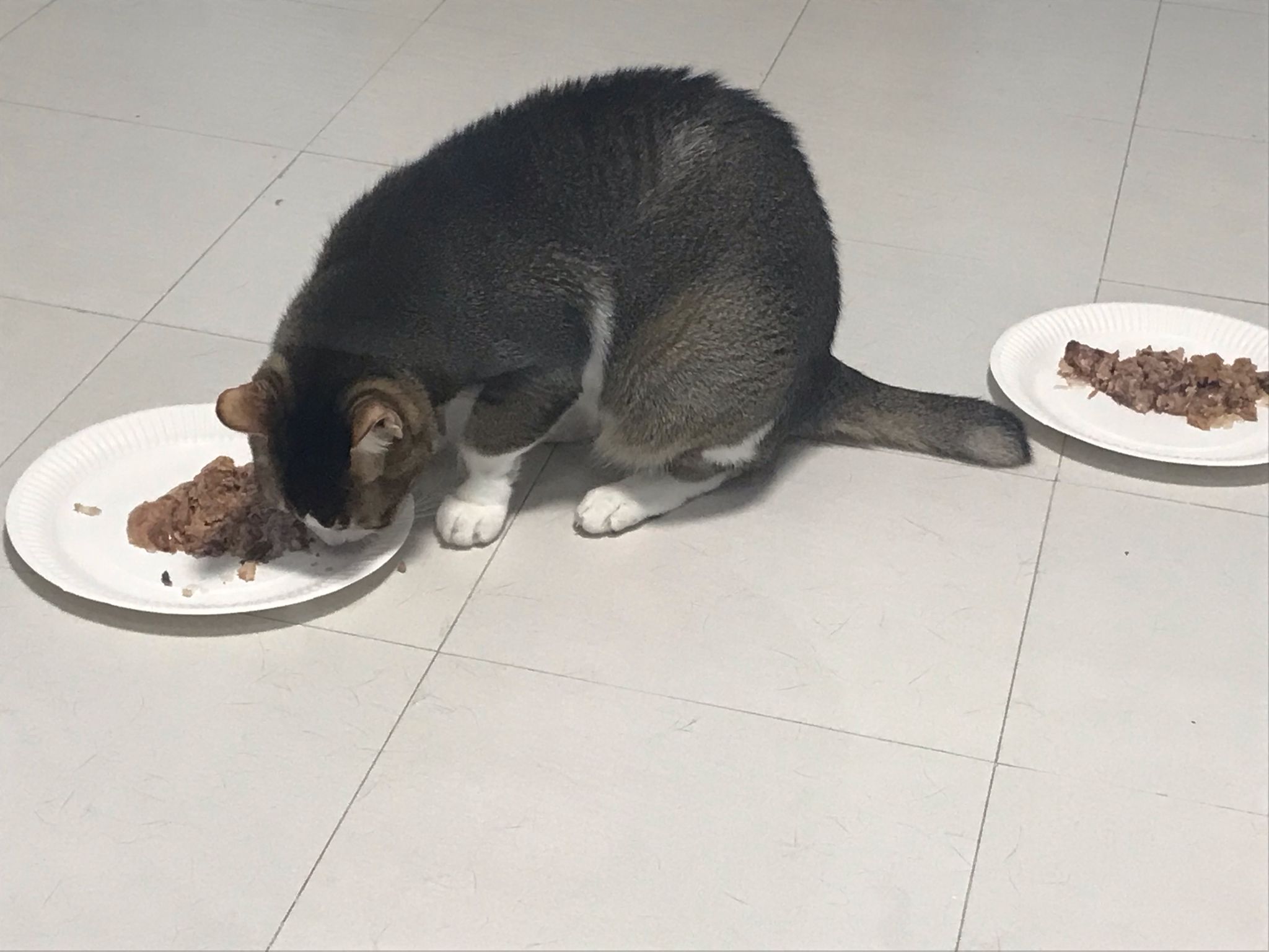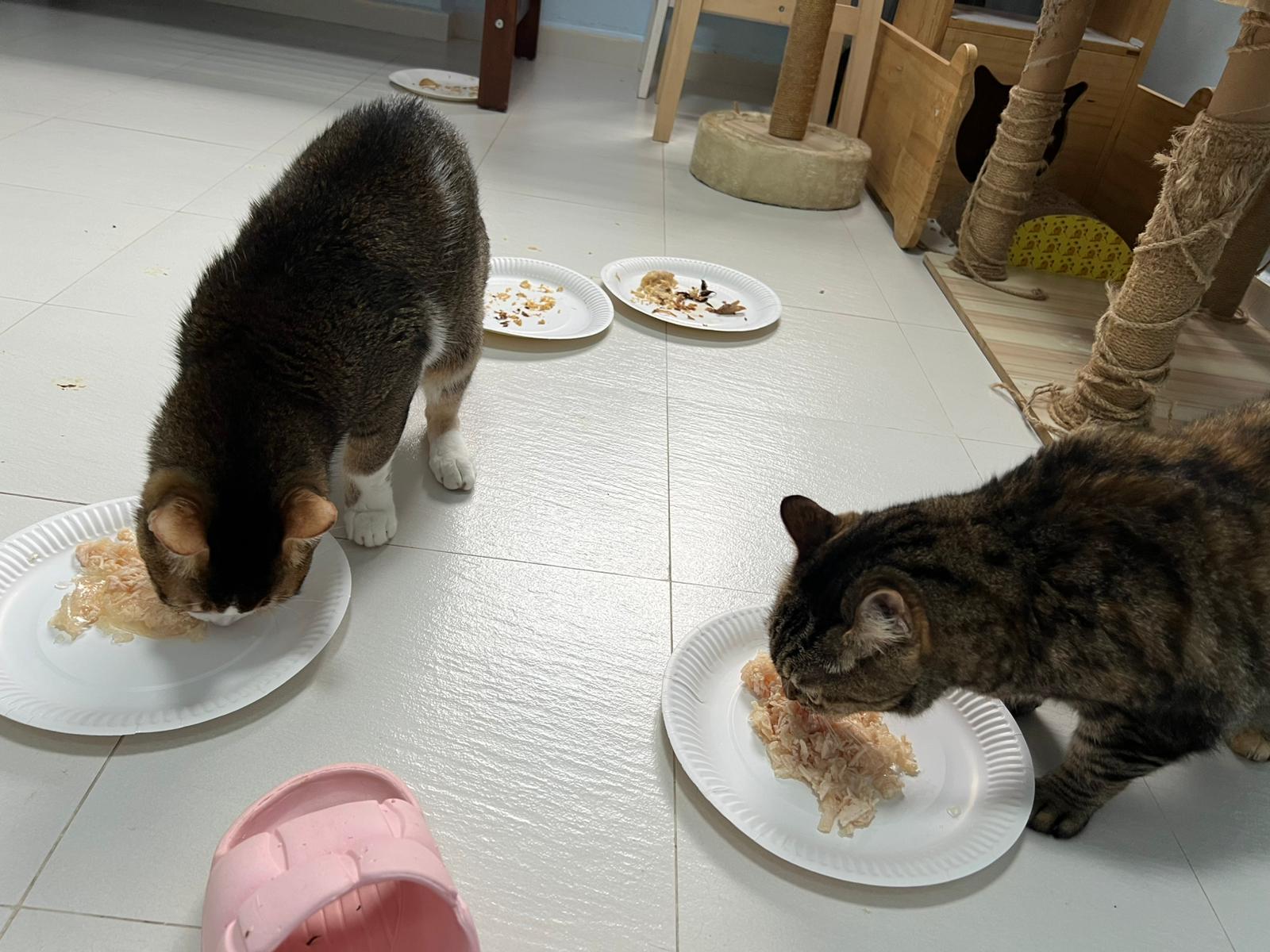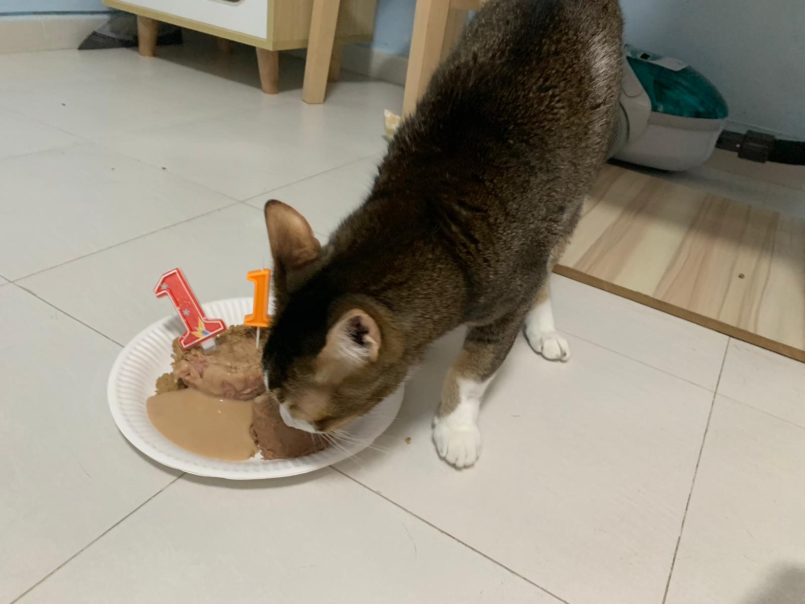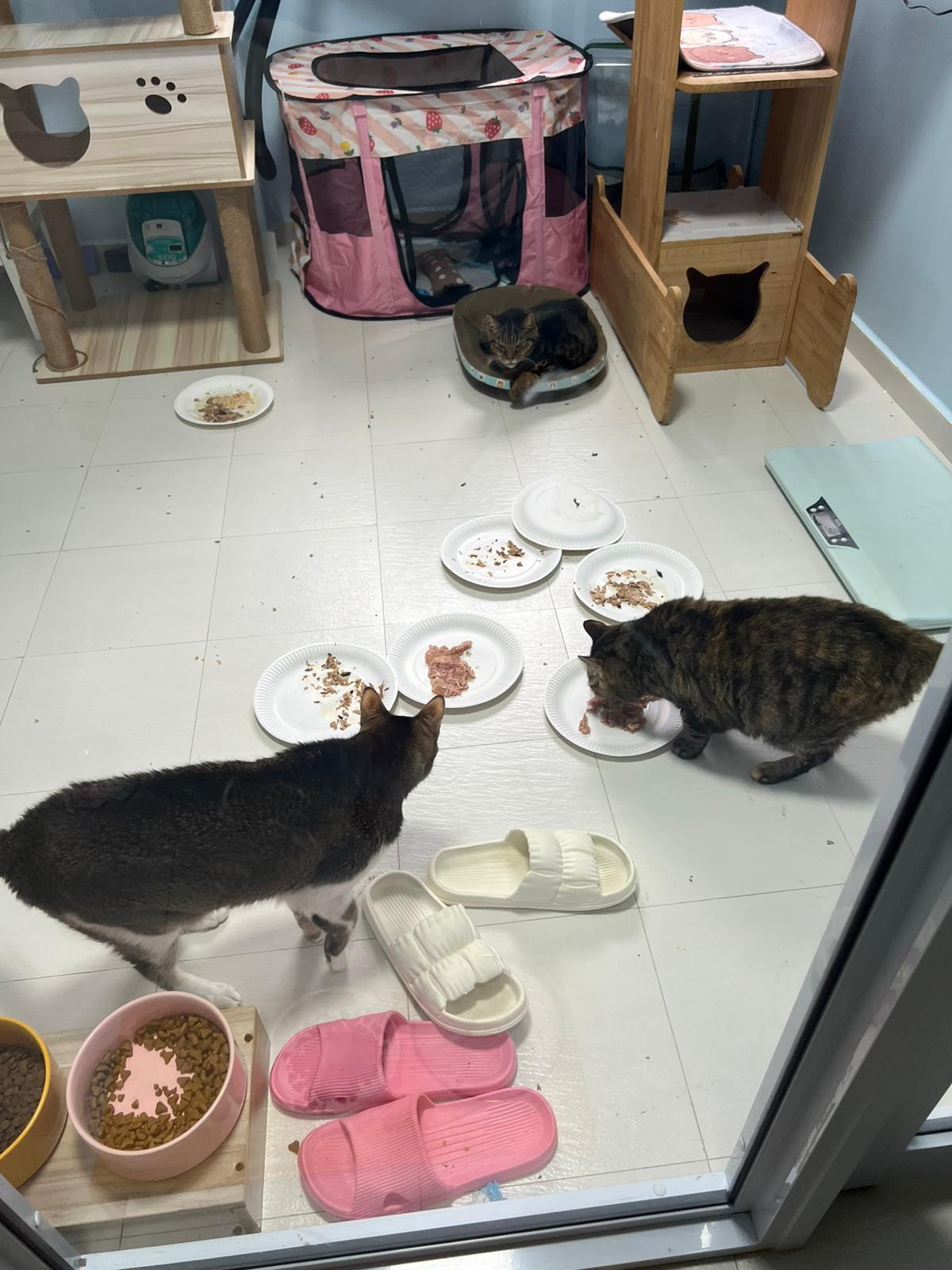Morning; I sit on the floor outside his room packing the storage box and he meow wait for me. 1pm+: given him Clav jab and 0.15ml bupre. serve ff he finish n went on to Kerry plate. Comb both fur they r happy kid