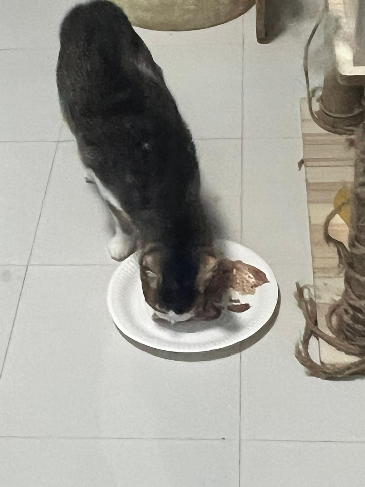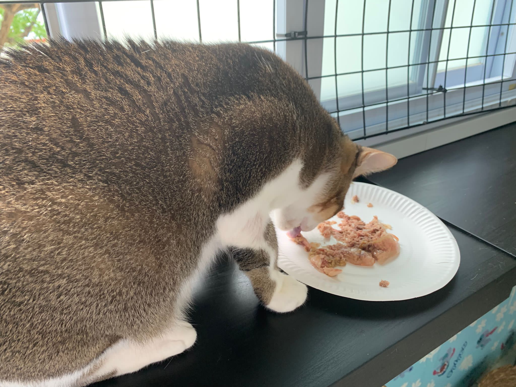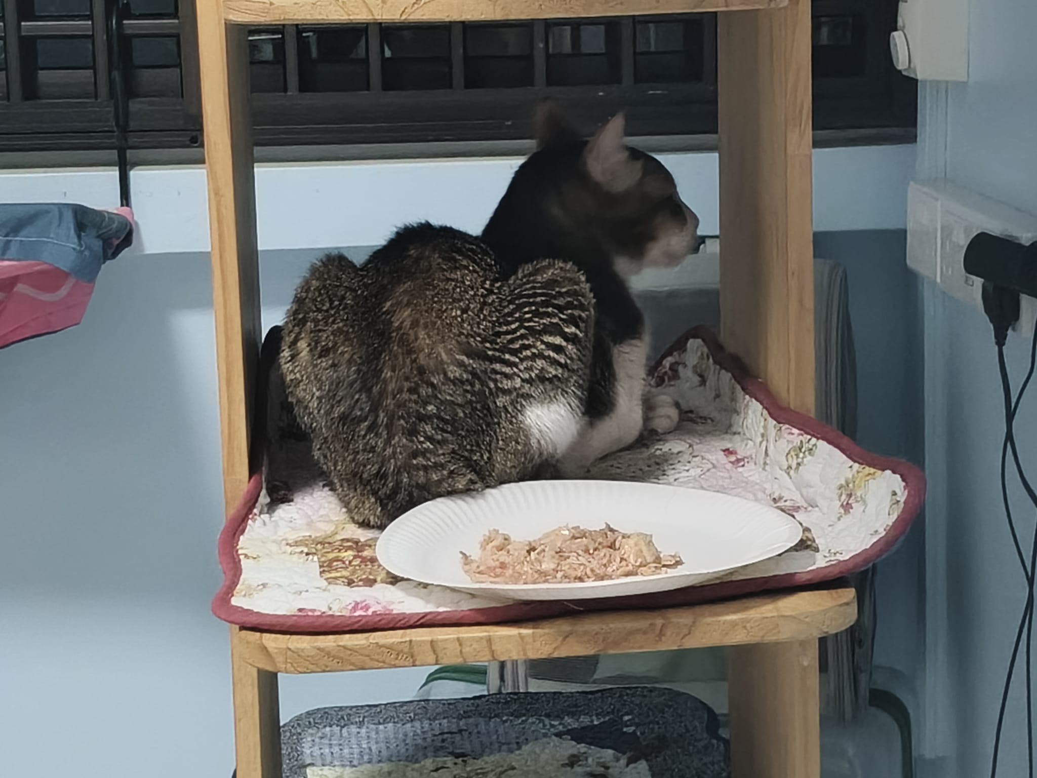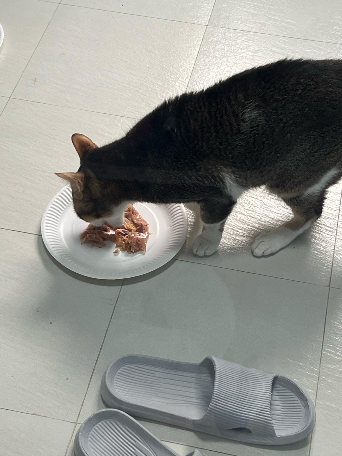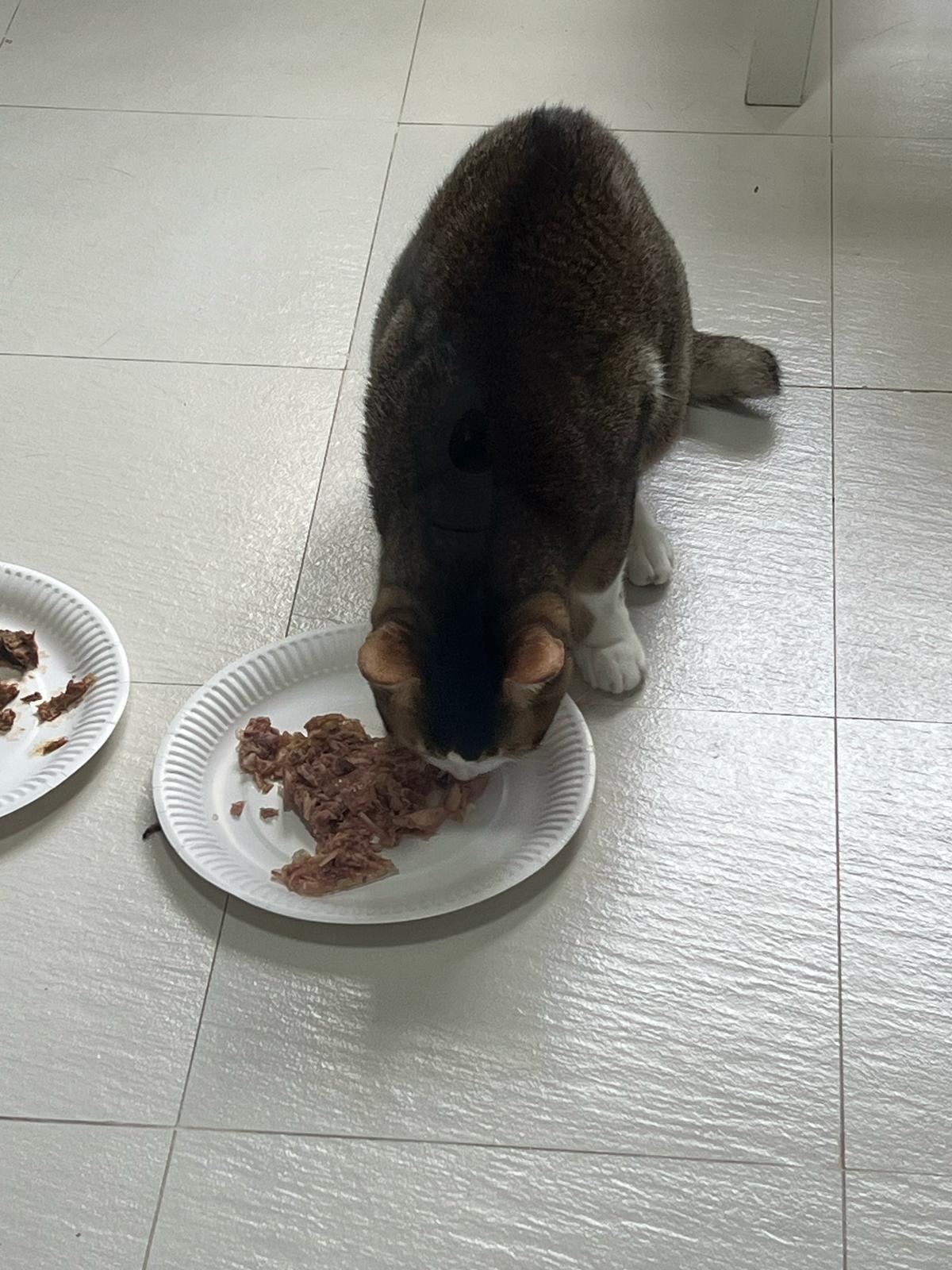 Morning; I sit on the floor outside his room packing the storage box and he meow wait for me. 1pm+: given him Clav jab and 0.15ml bupre. serve ff he finish n went on to Kerry plate. Comb both fur they r happy kid