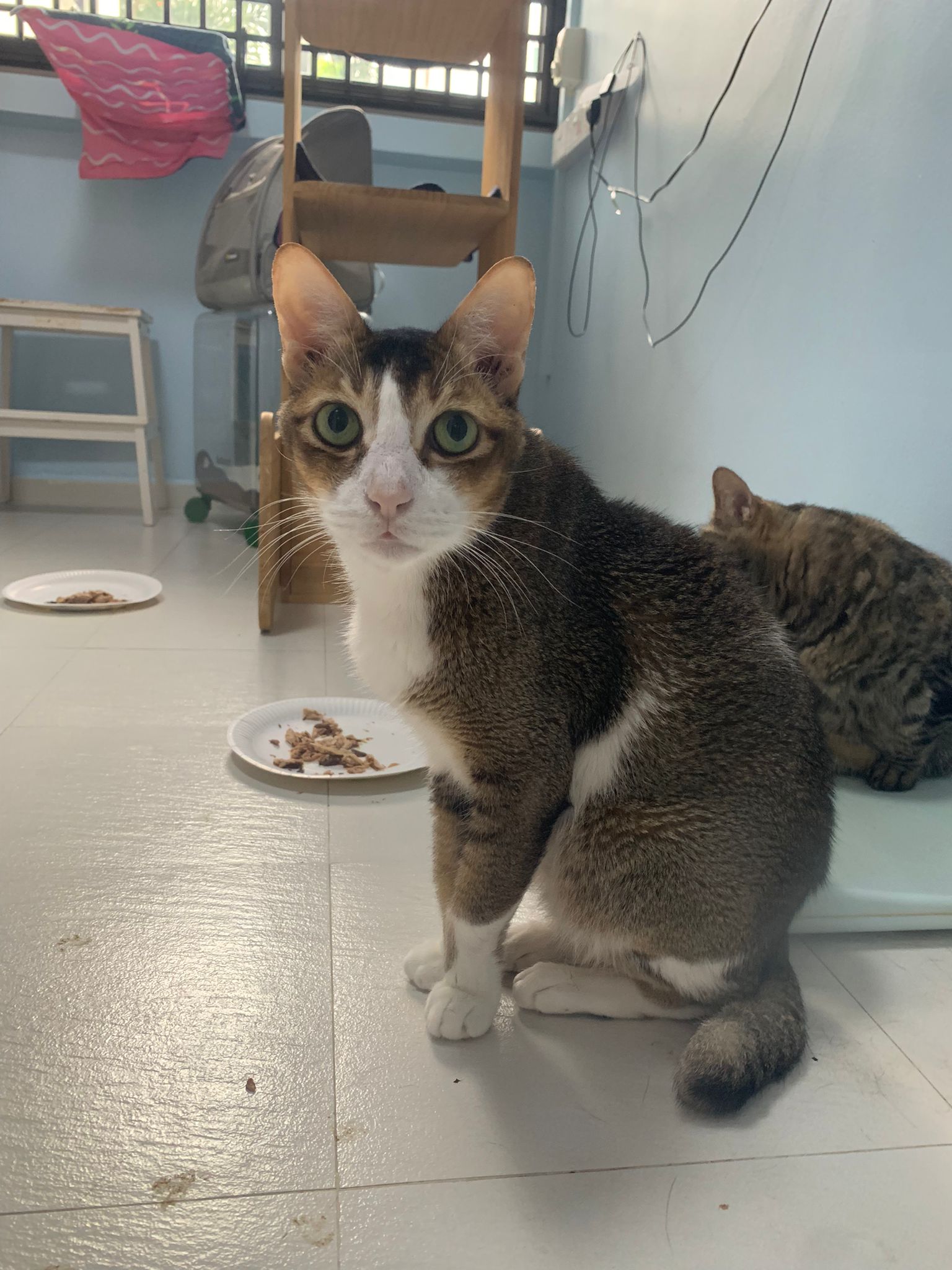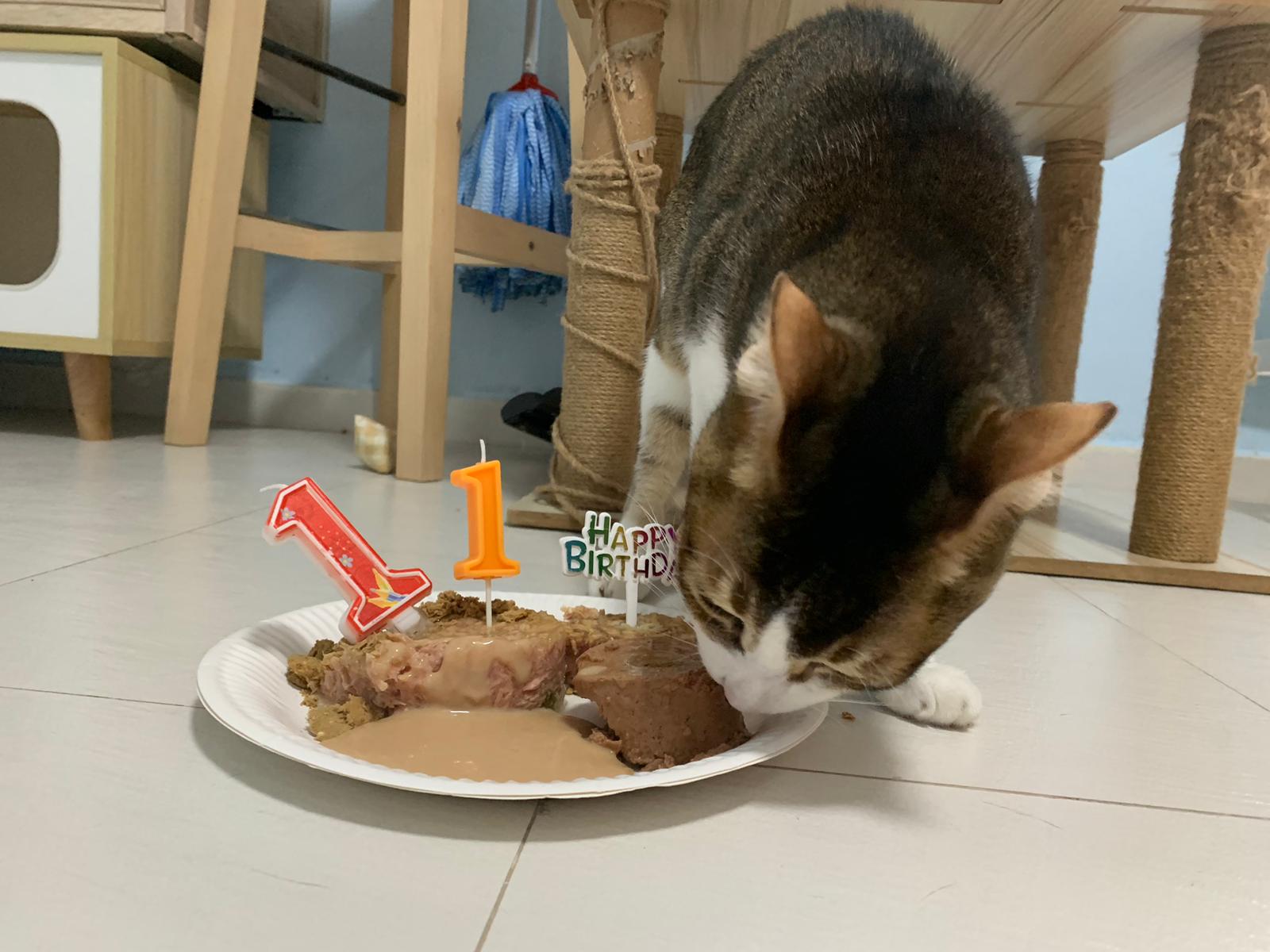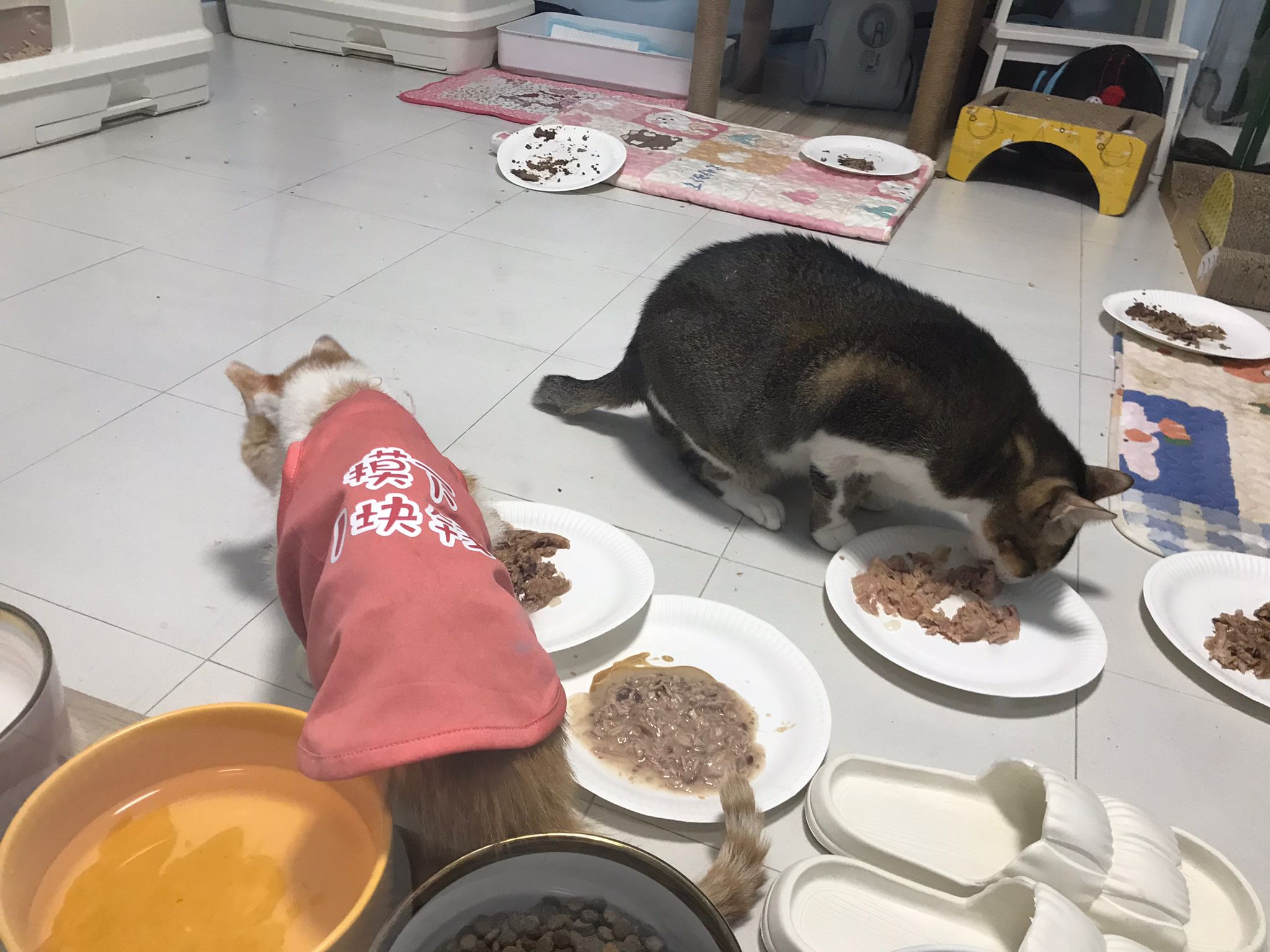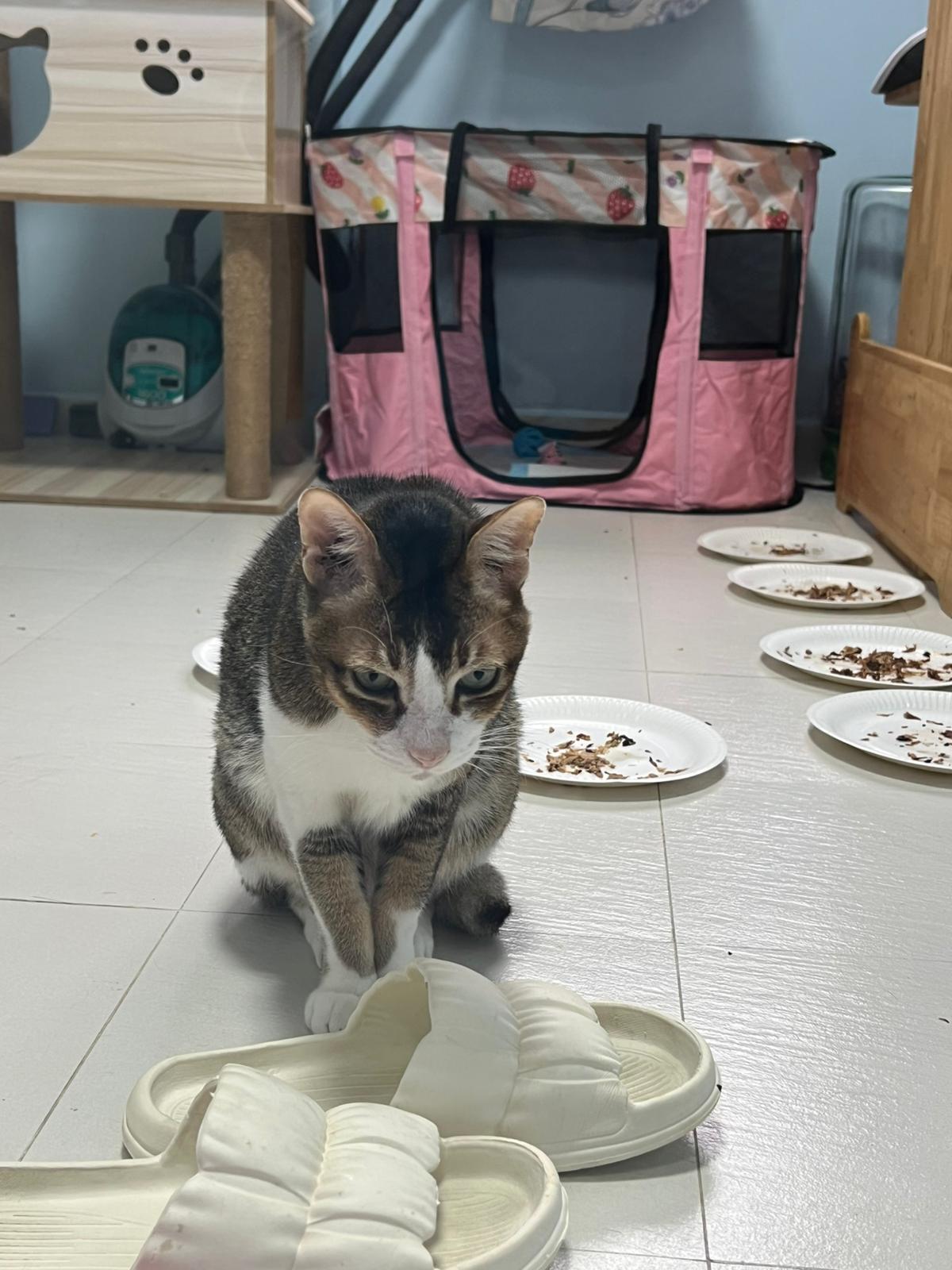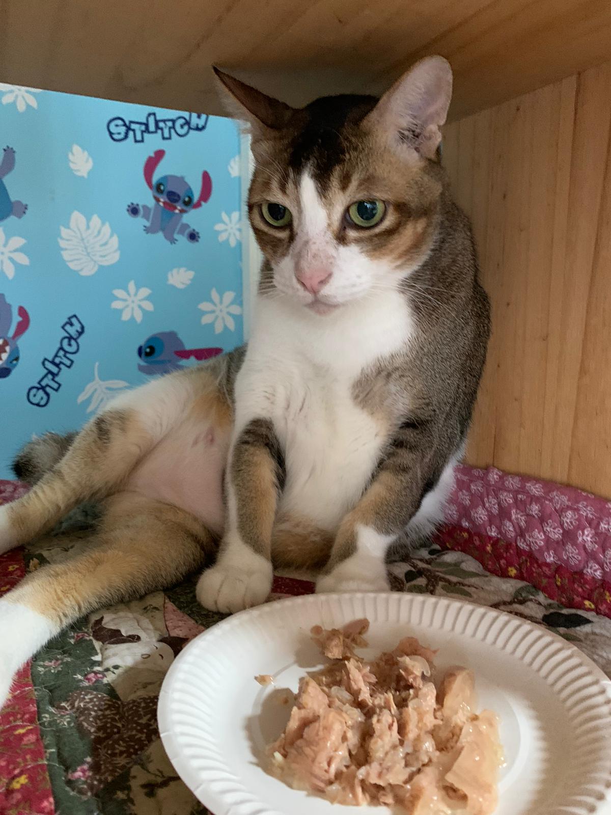 Morning; I sit on the floor outside his room packing the storage box and he meow wait for me. 1pm+: given him Clav jab and 0.15ml bupre. serve ff he finish n went on to Kerry plate. Comb both fur they r happy kid