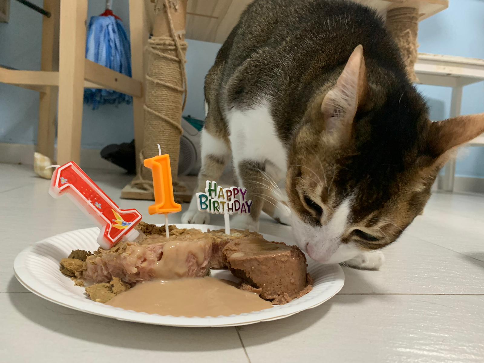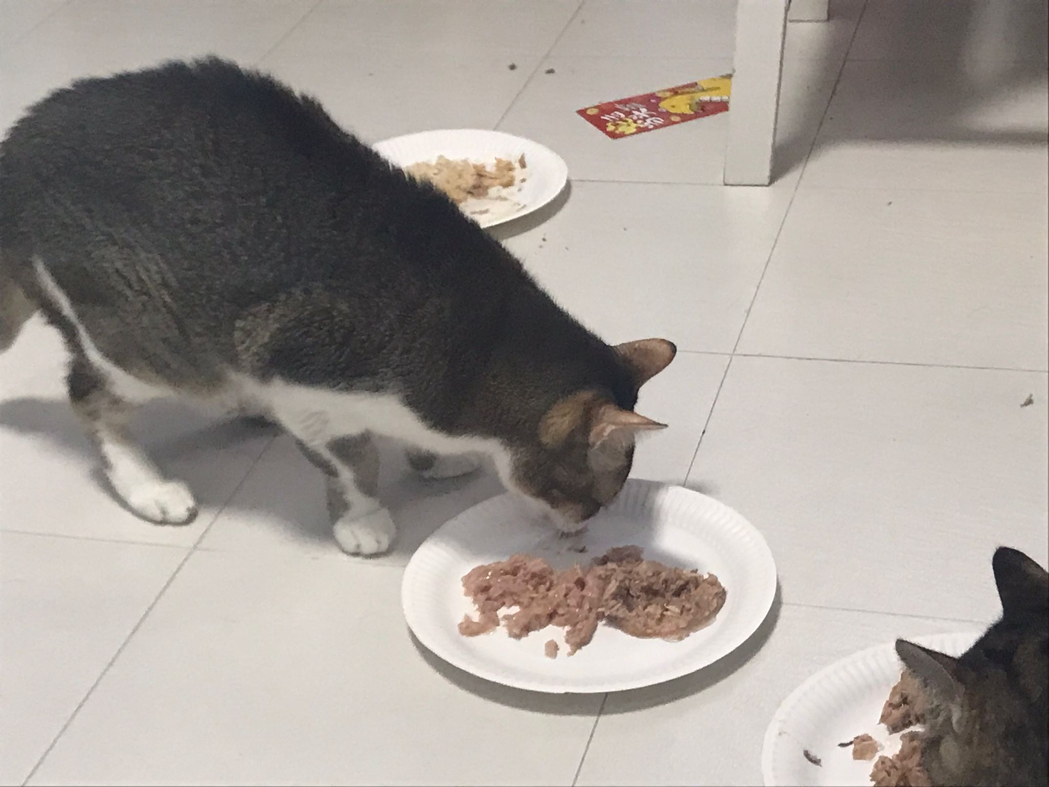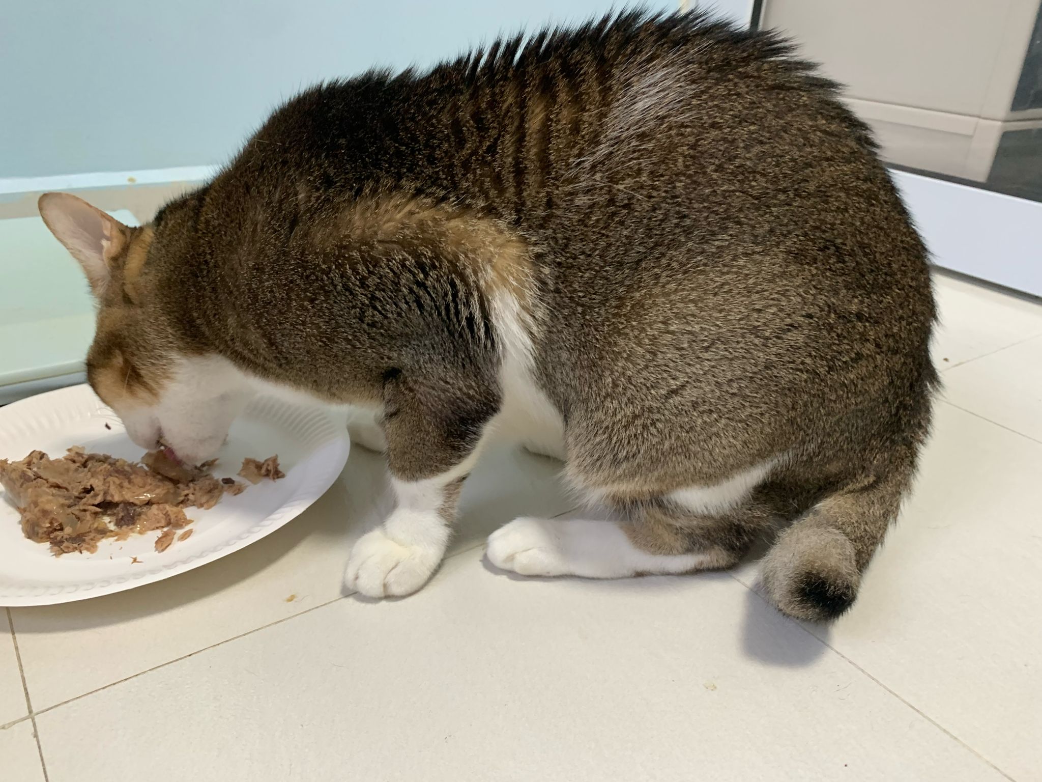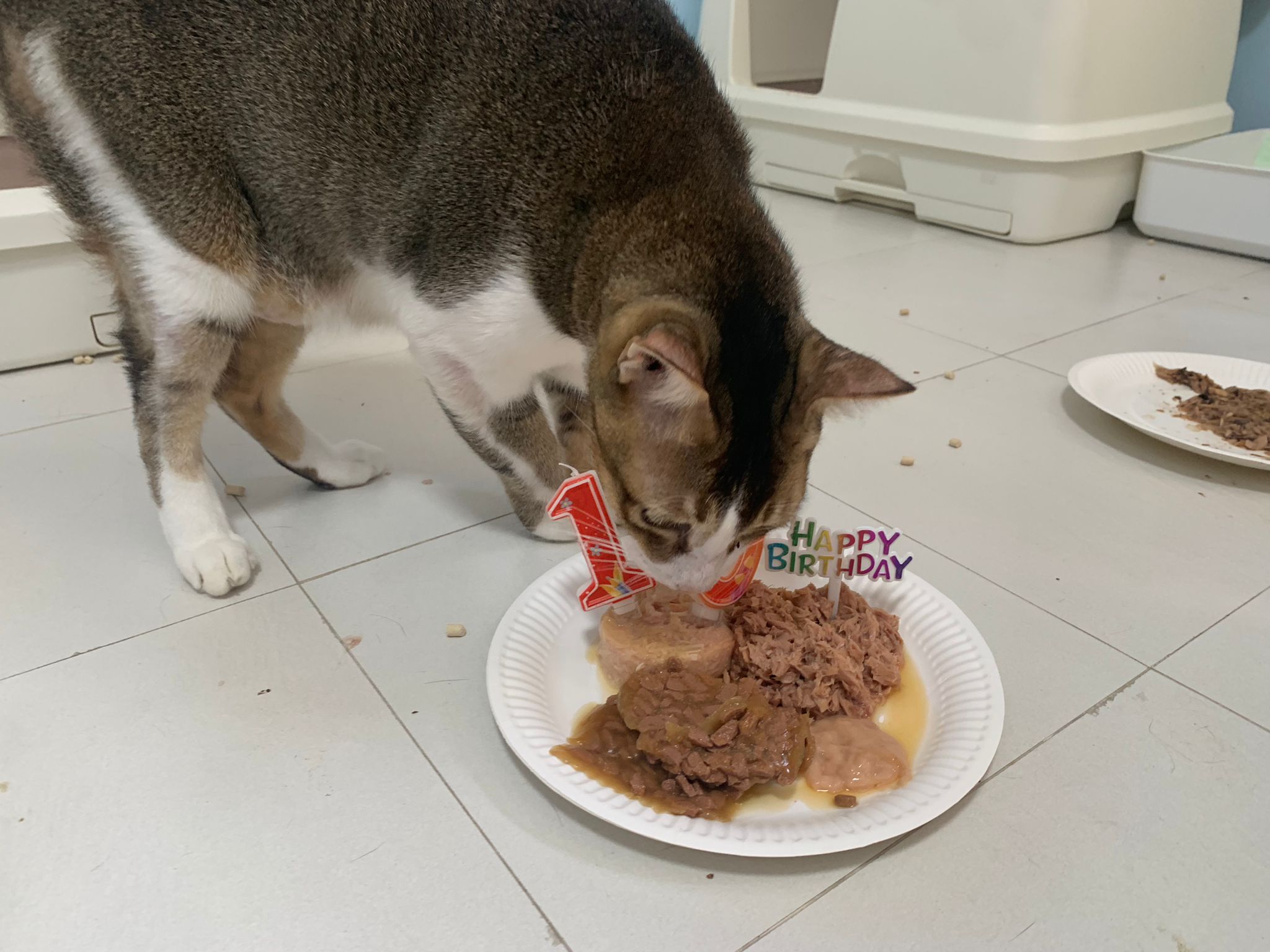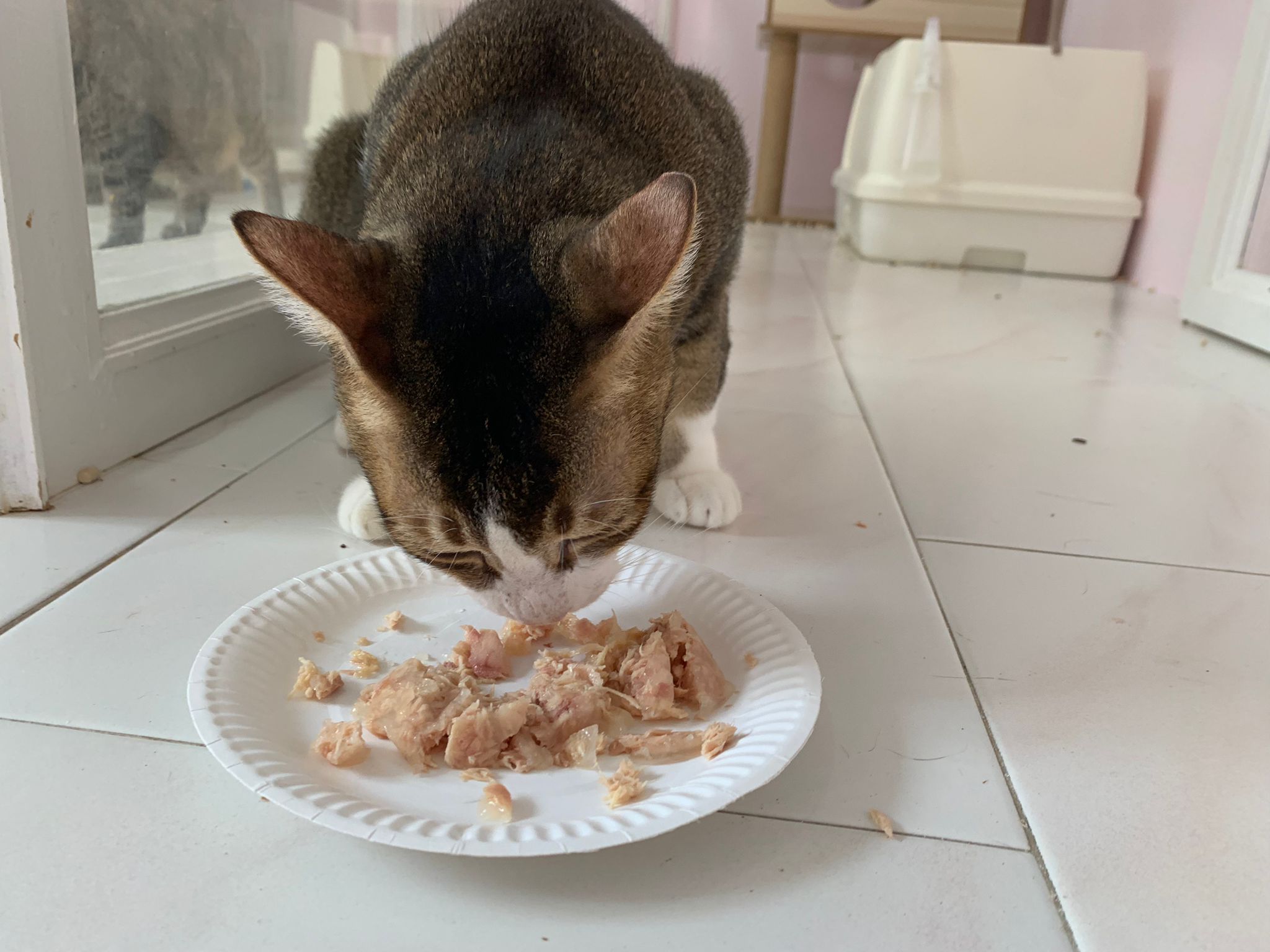 Morning; I sit on the floor outside his room packing the storage box and he meow wait for me. 1pm+: given him Clav jab and 0.15ml bupre. serve ff he finish n went on to Kerry plate. Comb both fur they r happy kid