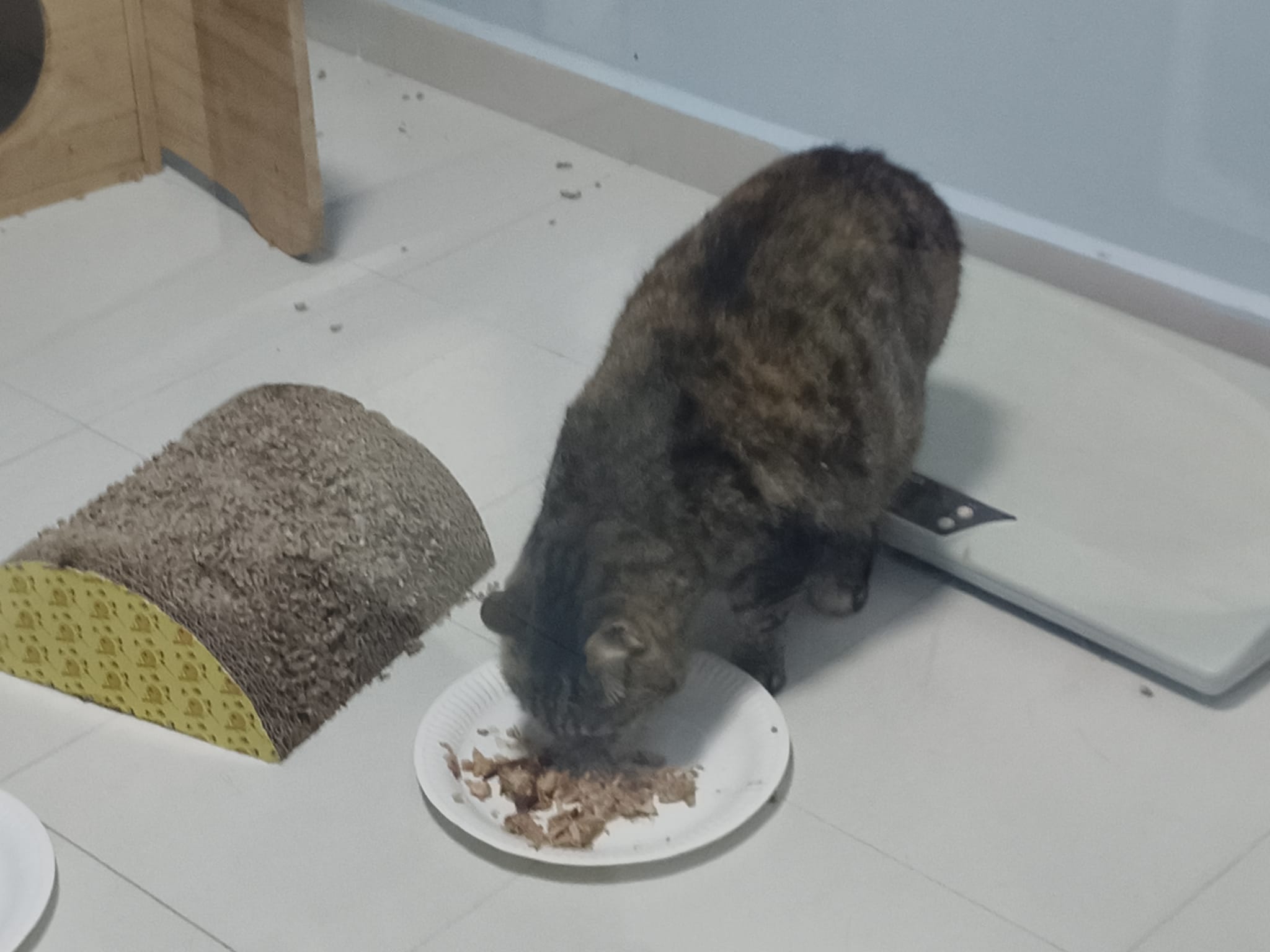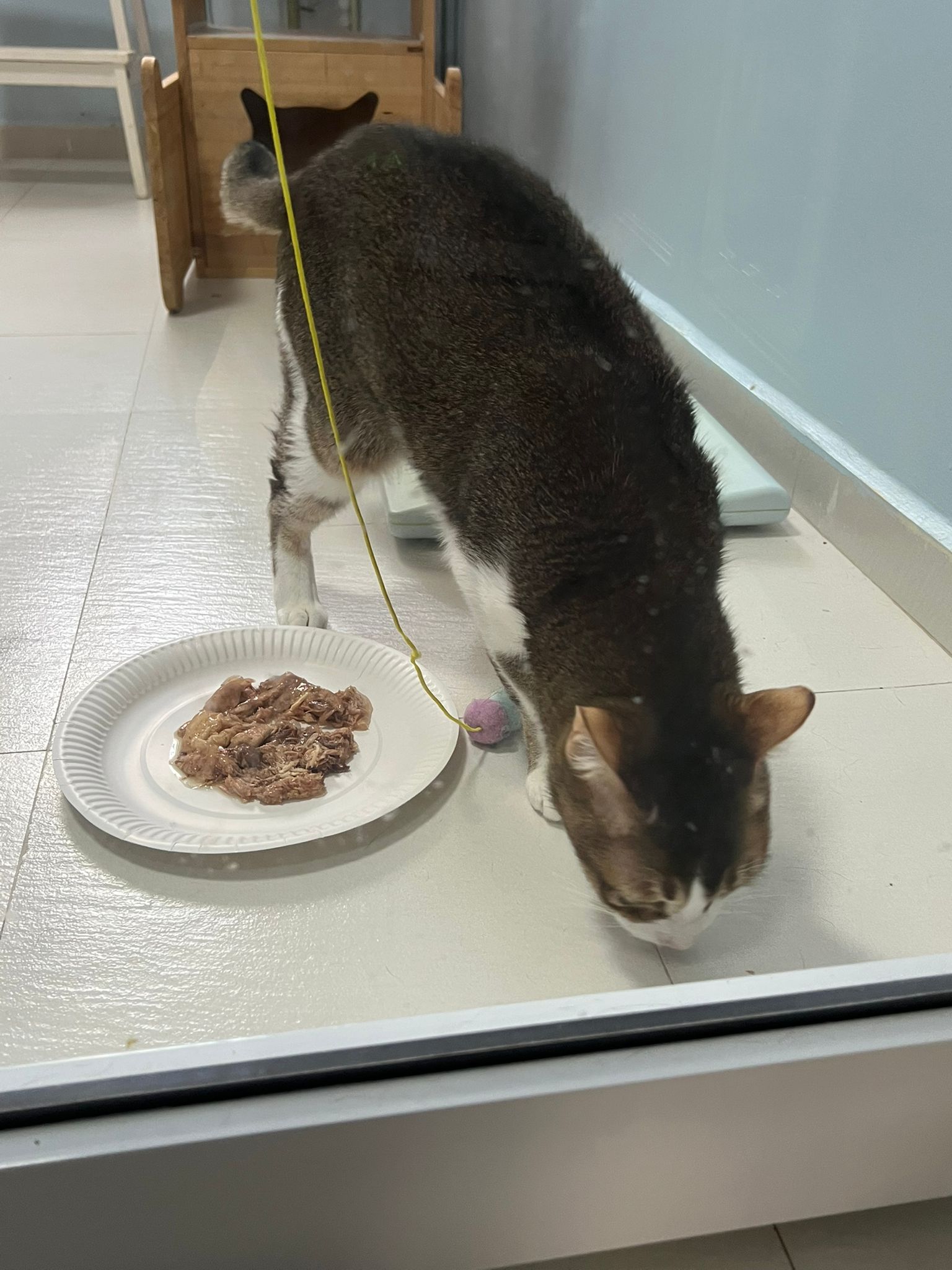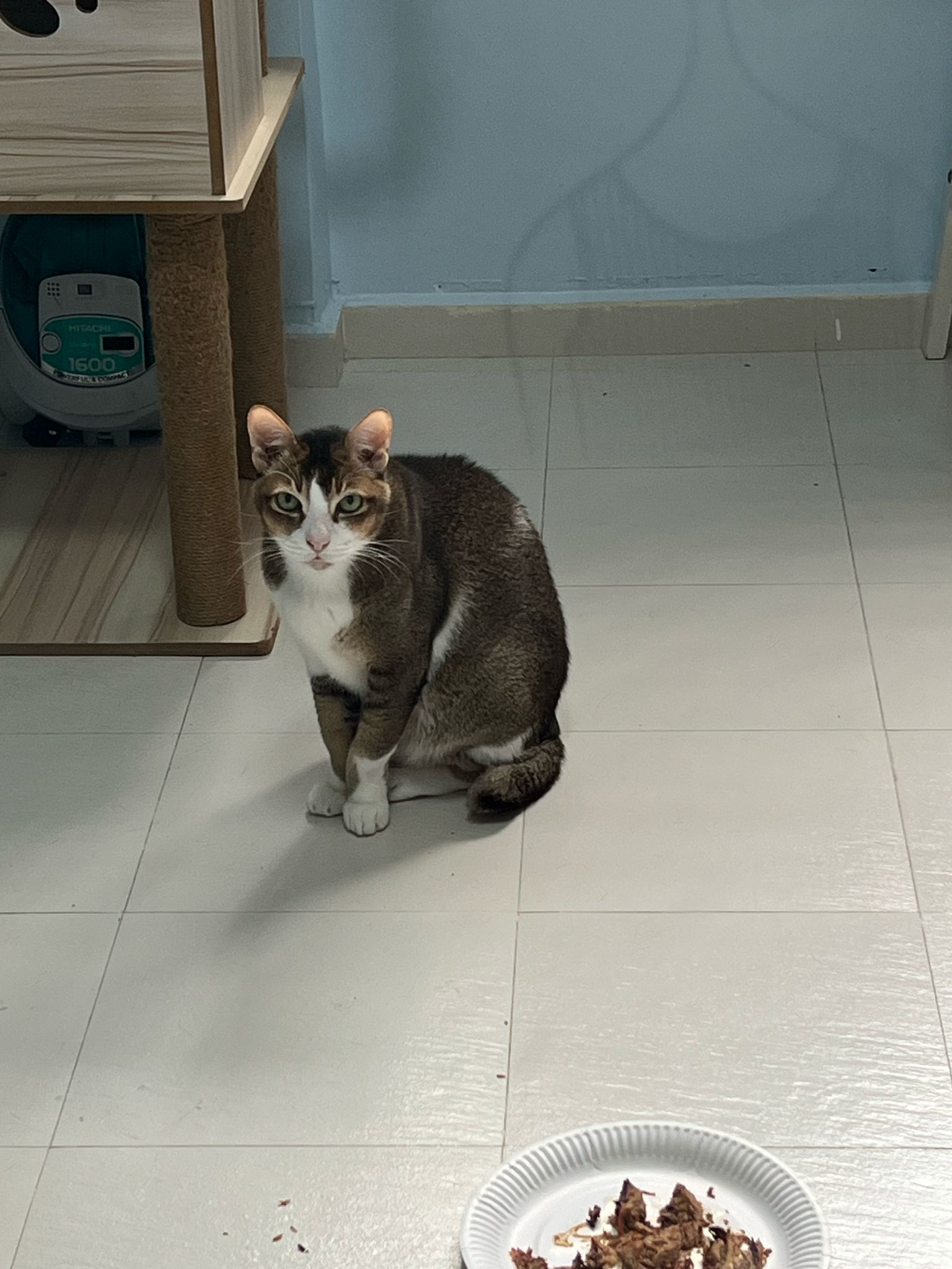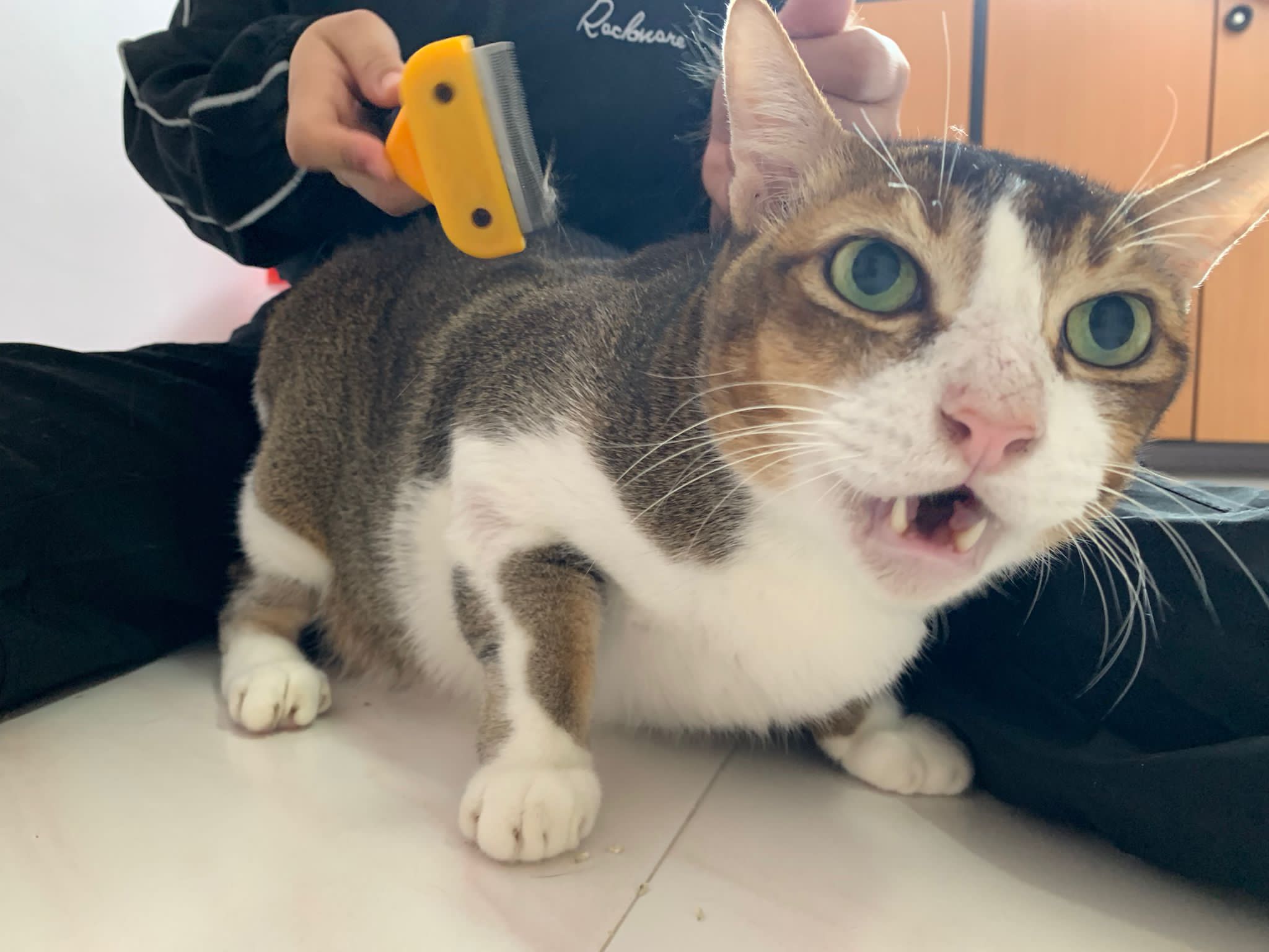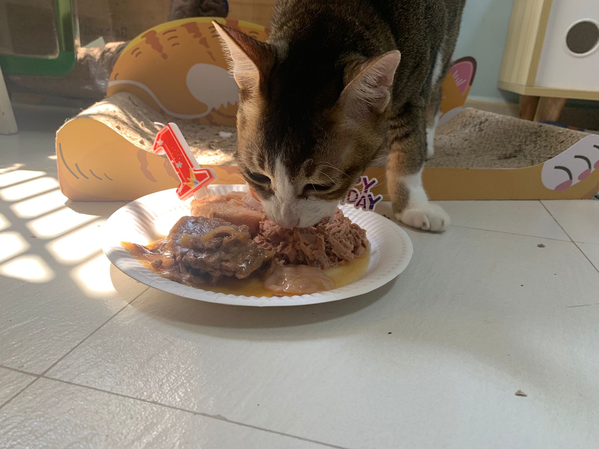 Morning; I sit on the floor outside his room packing the storage box and he meow wait for me. 1pm+: given him Clav jab and 0.15ml bupre. serve ff he finish n went on to Kerry plate. Comb both fur they r happy kid
