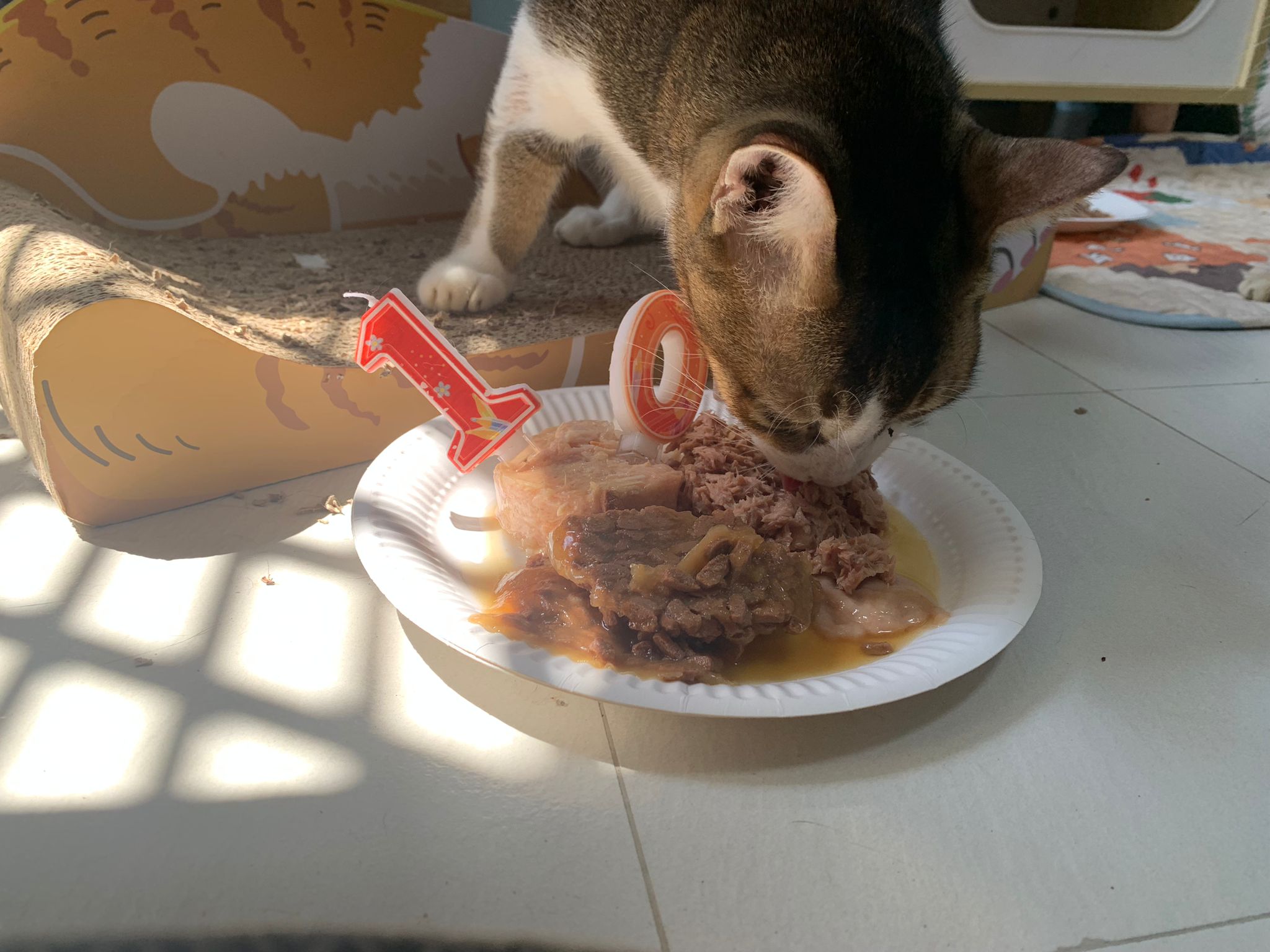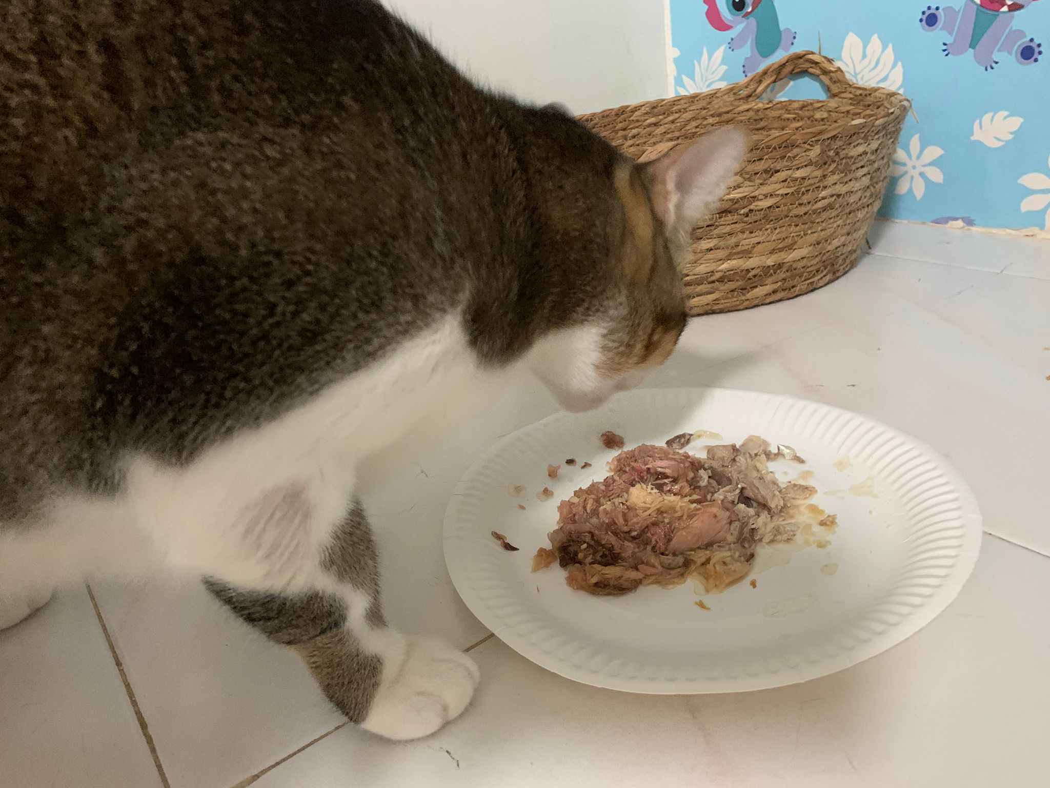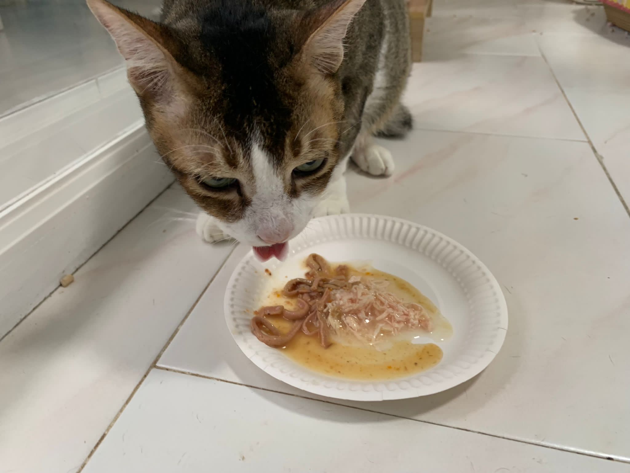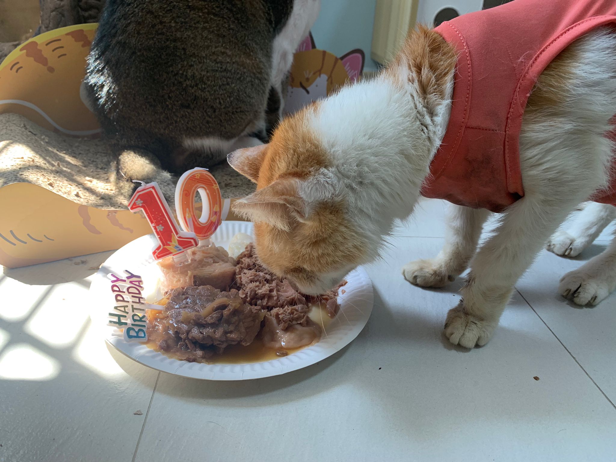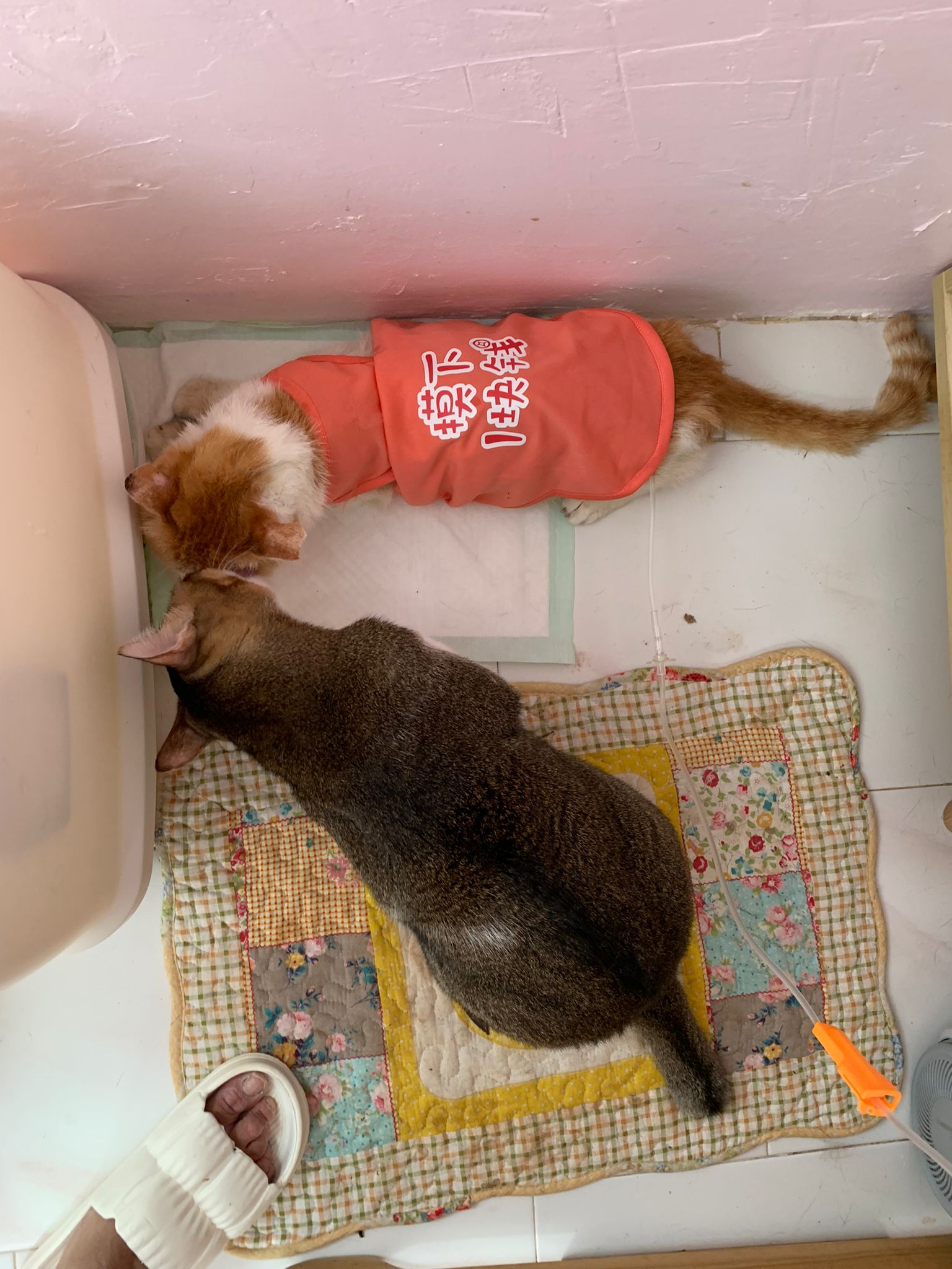 Morning; I sit on the floor outside his room packing the storage box and he meow wait for me. 1pm+: given him Clav jab and 0.15ml bupre. serve ff he finish n went on to Kerry plate. Comb both fur they r happy kid