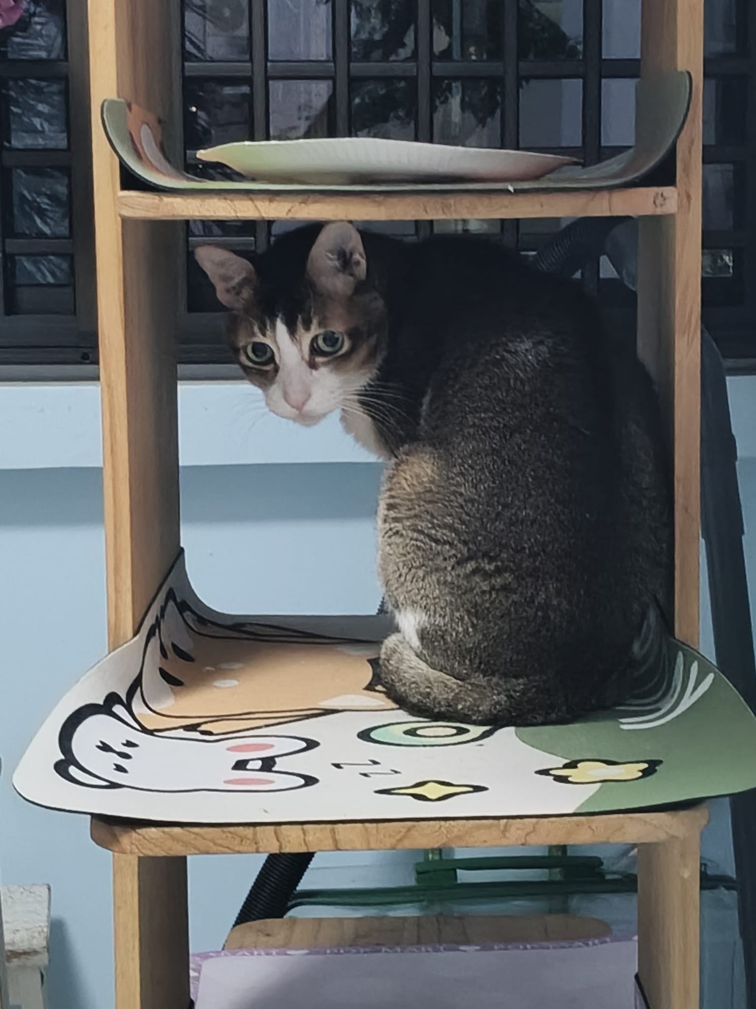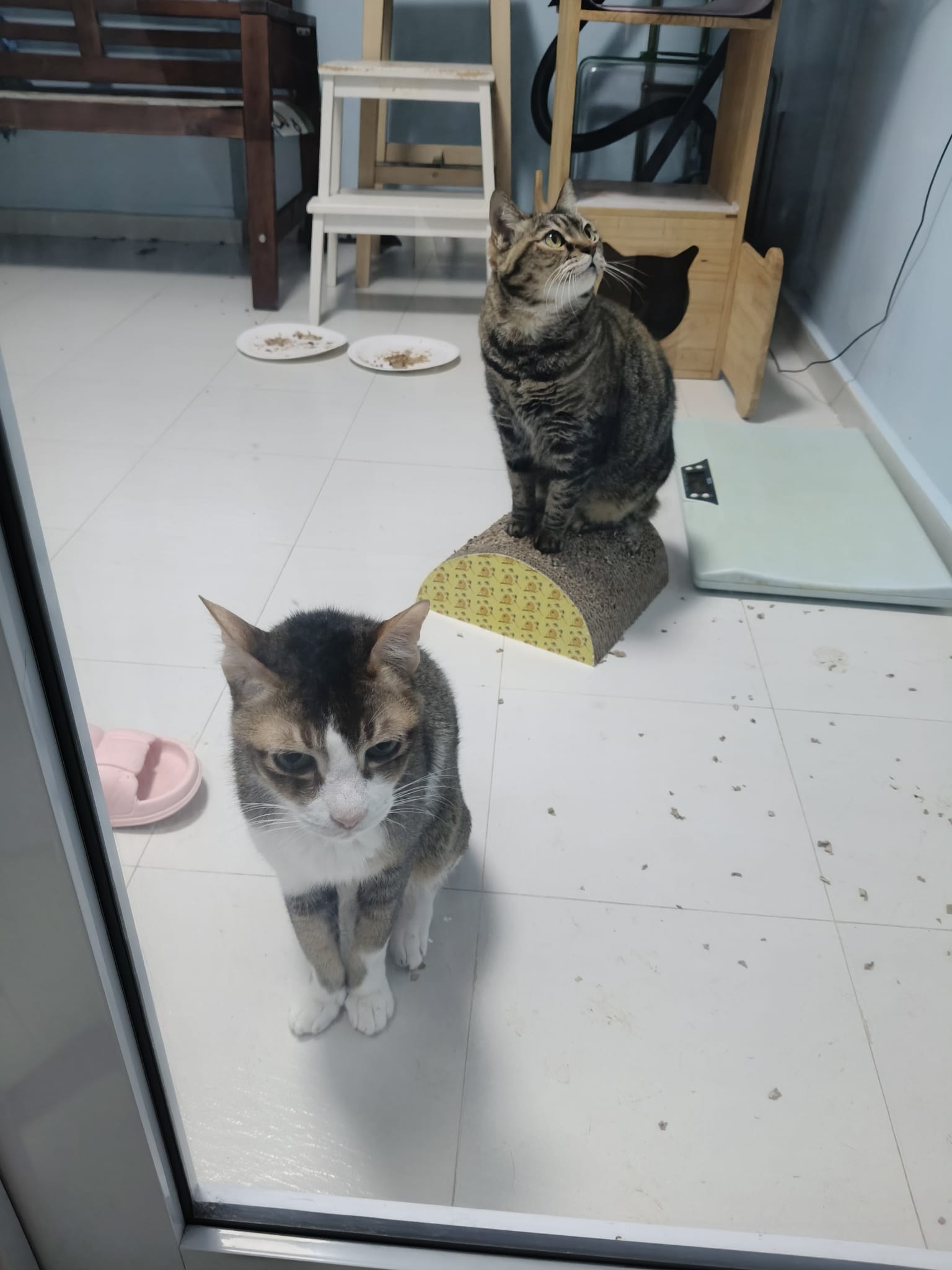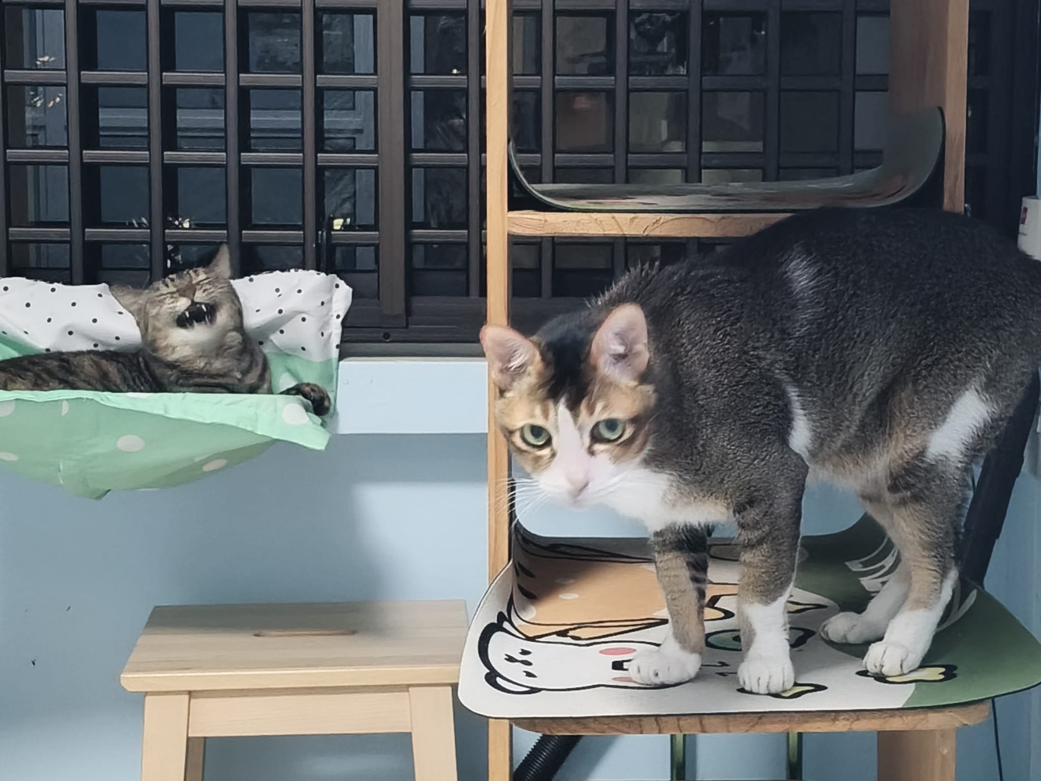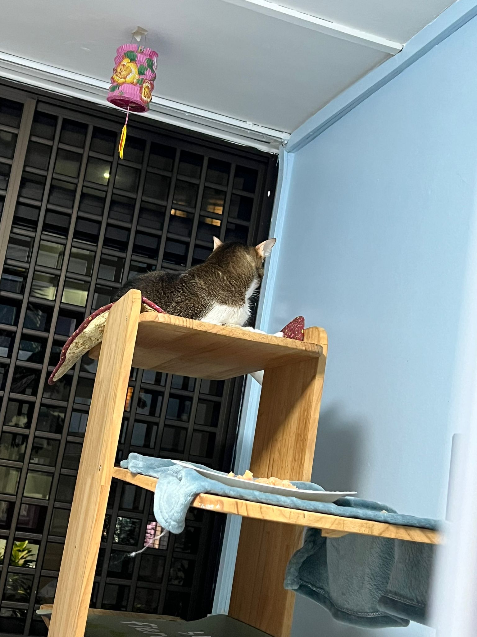1pm+: I Waited so long their bench delivery not here yet. Today throw half their cat tree away. Rearrange a little. Tmr then give them the bench 🙂