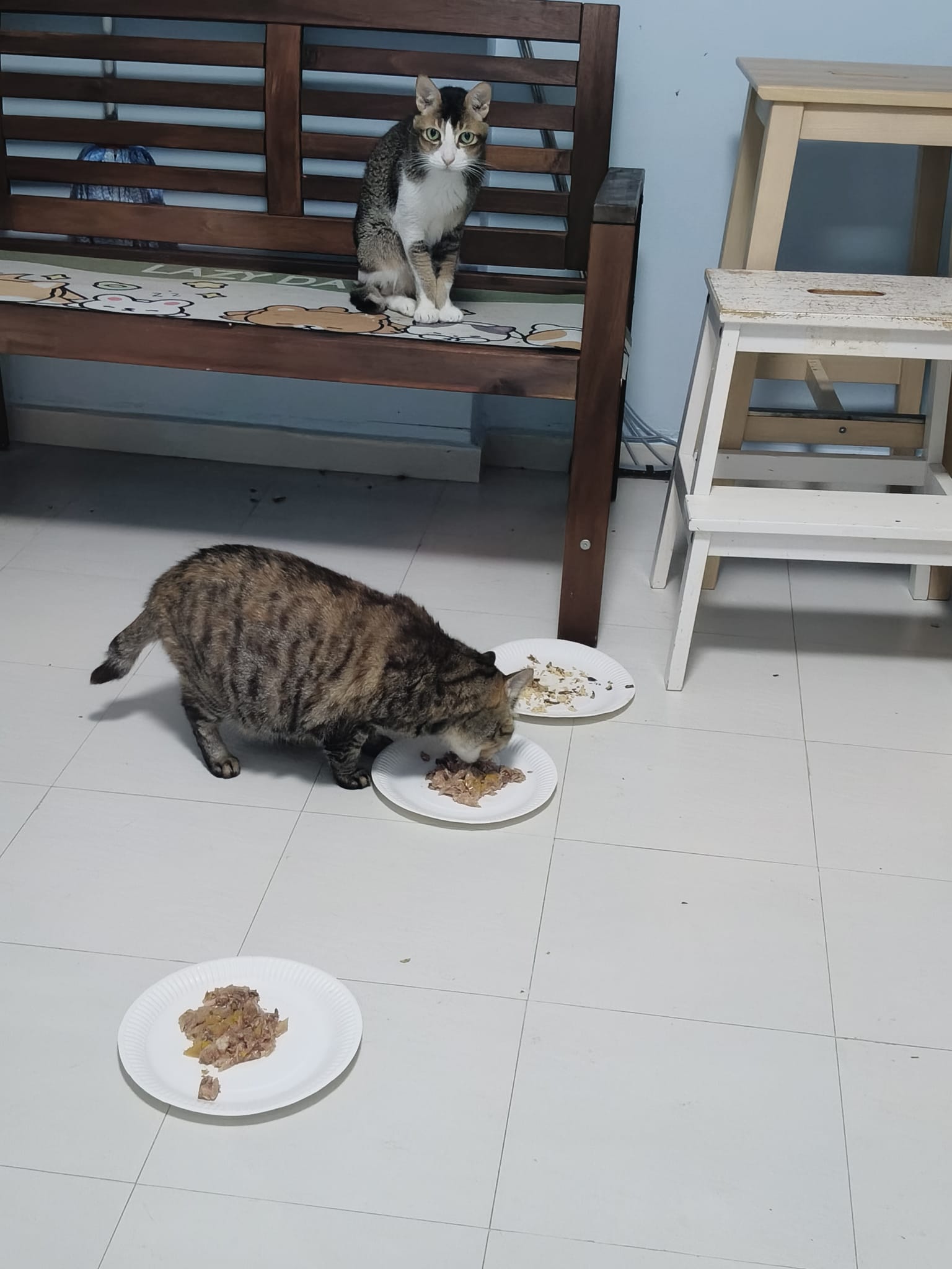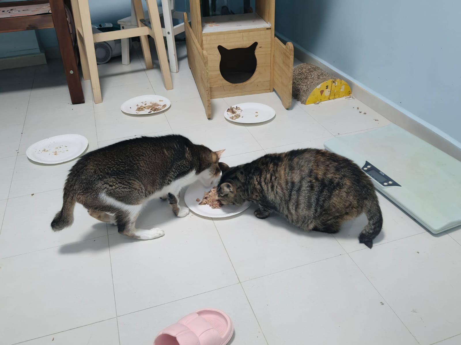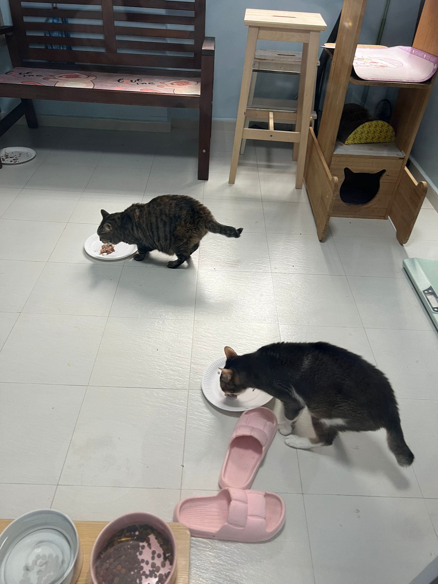 12pm: these 2 know that bench is sayang corner now. Will both jump onto bench want me sayang n brush them. Kerry a little siao siao throw temper like sena yo buddy. She keep attacking daring, I scare daring will become really angry. Given daring bupre jab today.