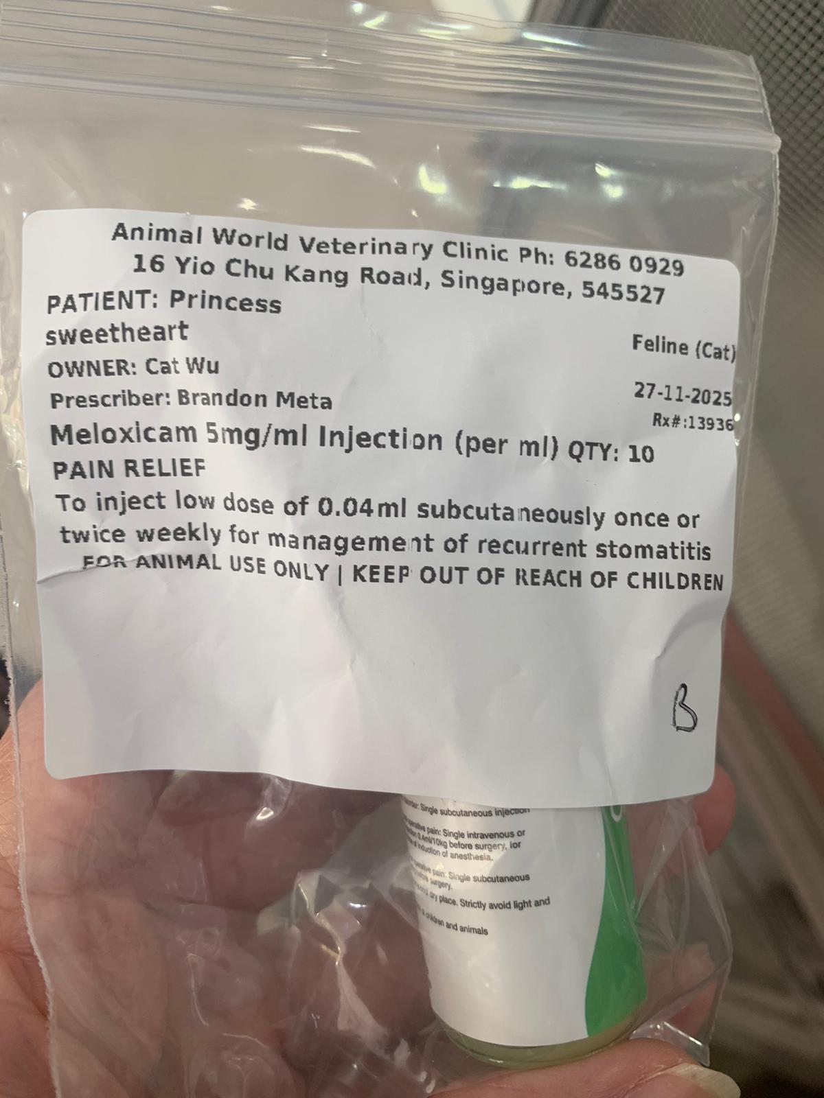Dr Cheryl check – bladder big, but later she check not that big – just monitor. Lung sound clear. Didn’t see him weighing. She noted that didi main issue today is I found a lump on his left mouth, a marble – she said yes marble. It’s not even gingivitis: is a cancer lump. I said no oral med, got one point she say then no point le, I say can jab – she say some vet (maybe she don’t) believe that meloxicam can help. But she needs to check kidney, I say ok check full bloods including urine then. I’ll check what if oral can, what med she is ok to give? Need to give ab?