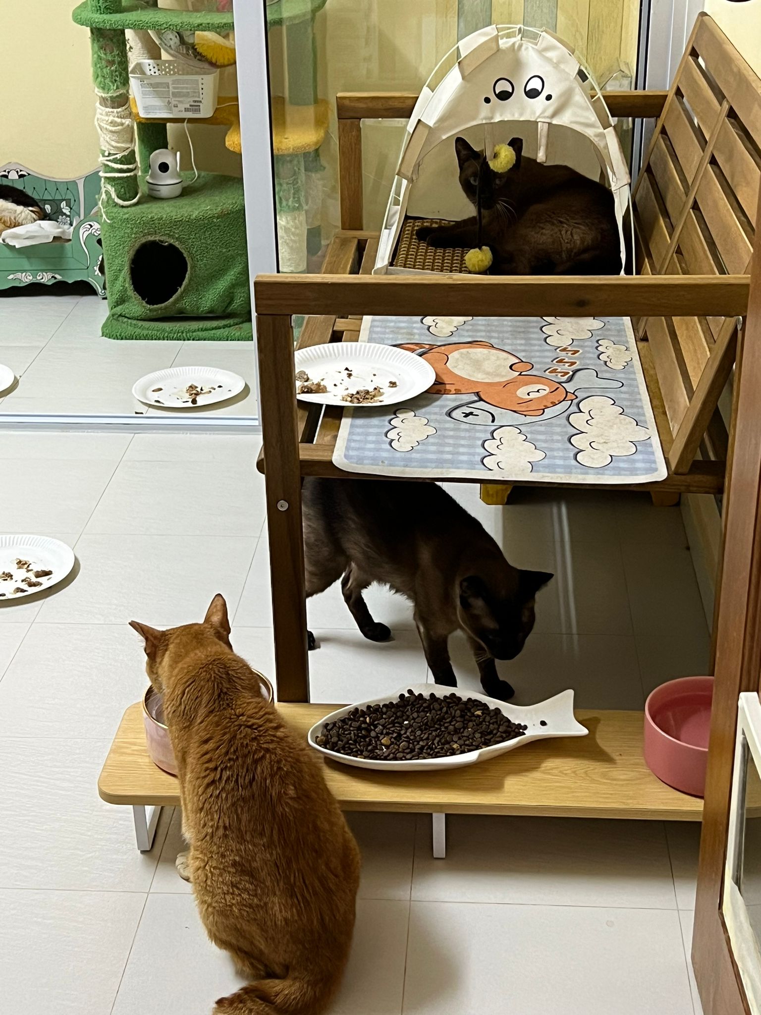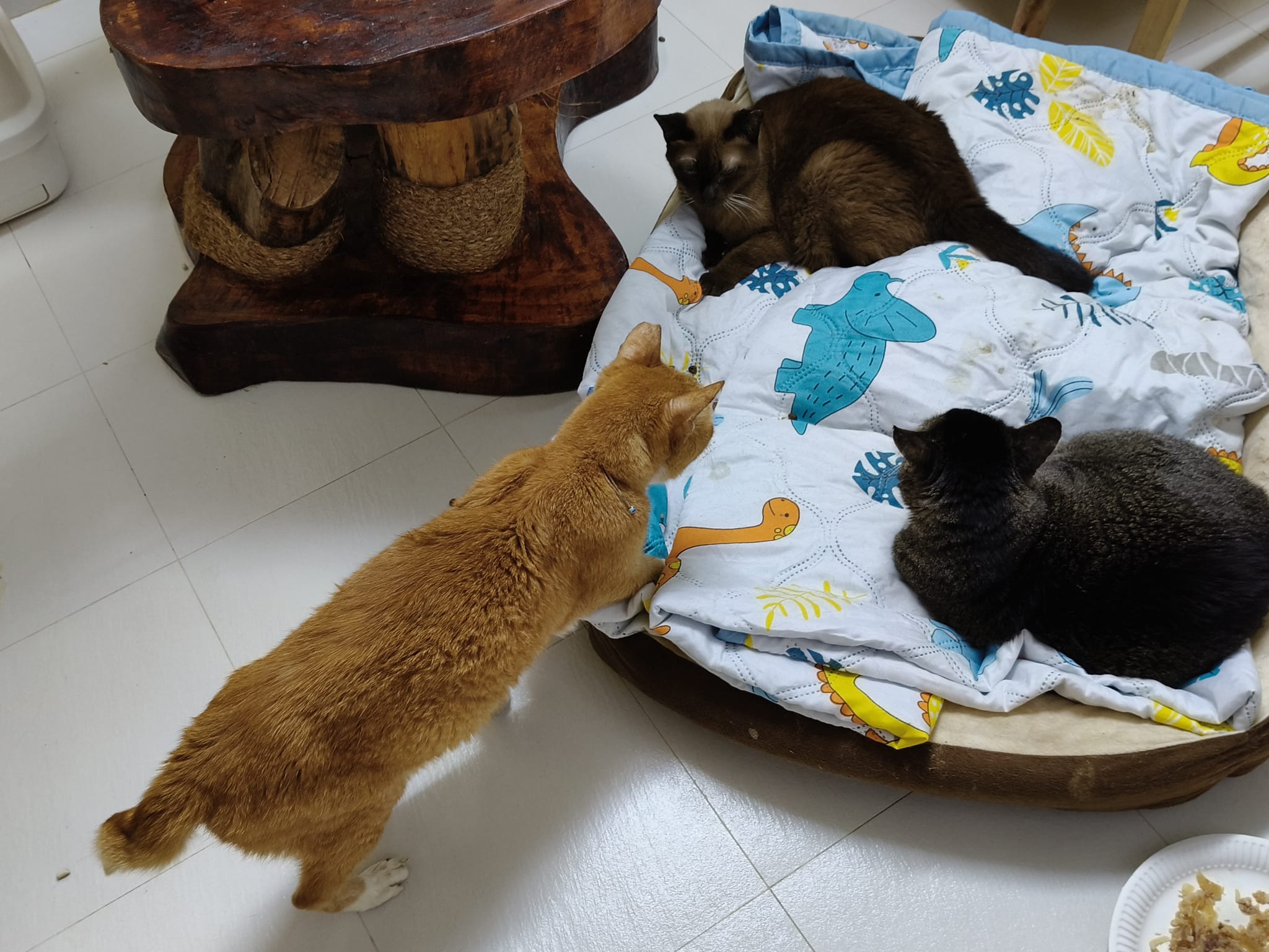 1pm: cola back from grooming, Got head butt w didi but she hiss, make didi semi angry so I carry her away. She ask for trouble siak.
