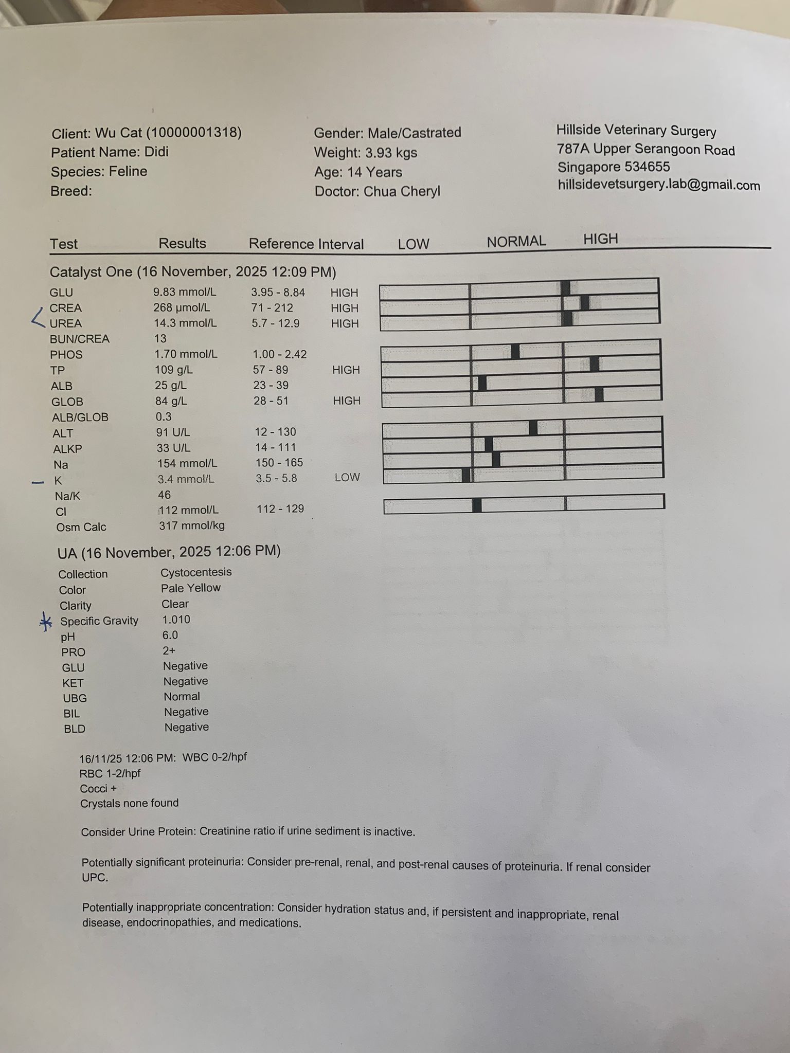 I even open Fancy Feast for him – all not keen. Maybe nausea? Given 0.4ml Cerenia I got no stock le. Sigh. Have to spend on bulk medi again. Booked dr Brandon slot Tmr to have opinion. But Tmr is day 11, not sure to take any bloods or not. kidney worsen? Need to check Chem10. I don’t think HCT drop anything serious but I wanna ask dr wanna start any ab or not so don’t take Cbc how to ans? Only lytes I think sure must take cos I scare his k is too low. Maybe Chem10 should retake cos I scare of his glucose. Diabetic?! Erm.