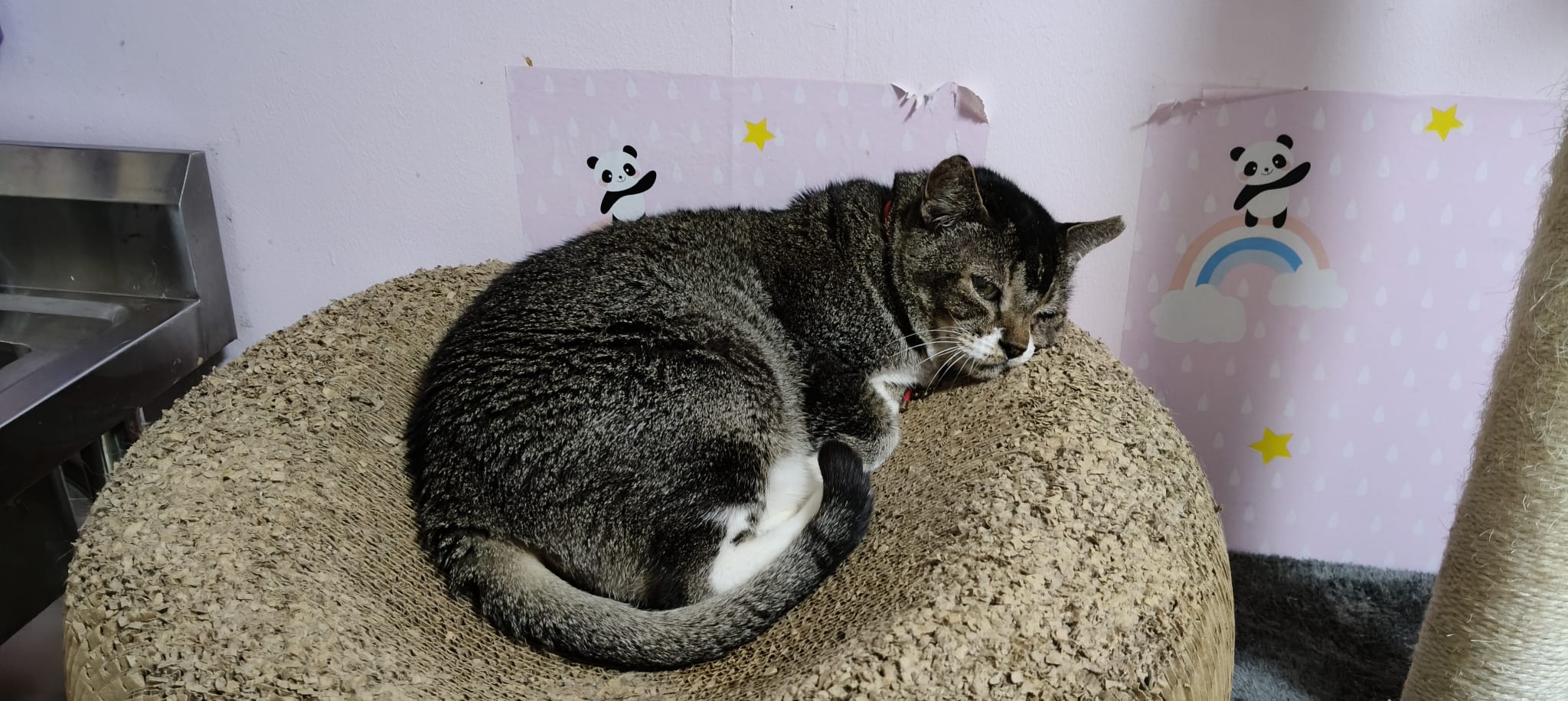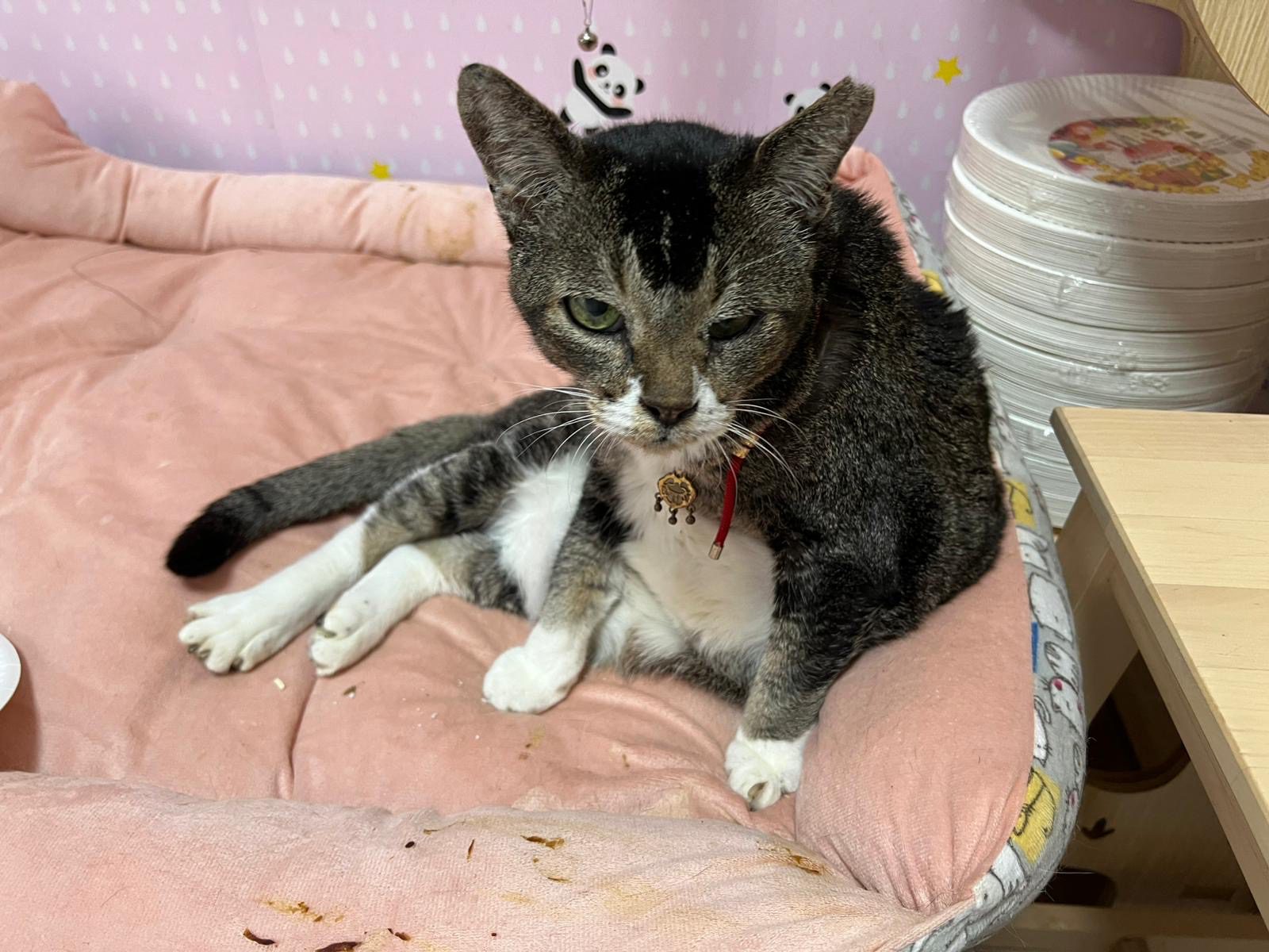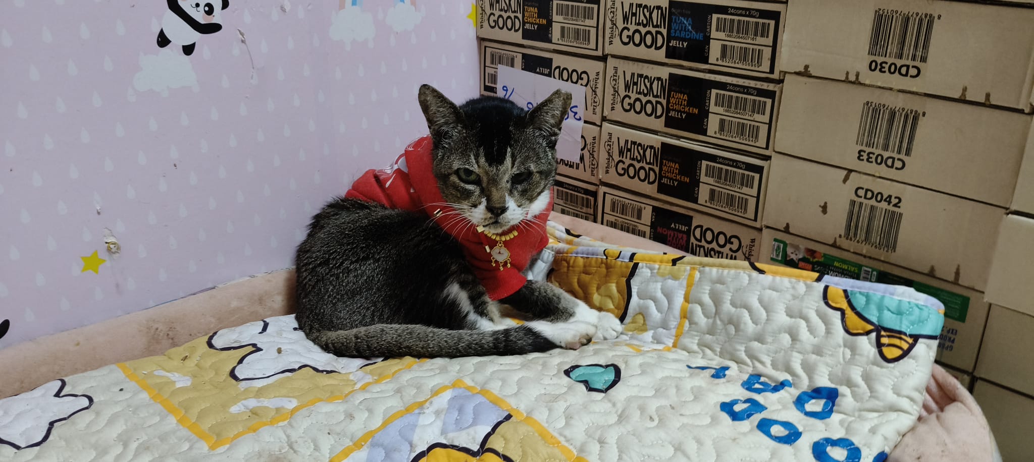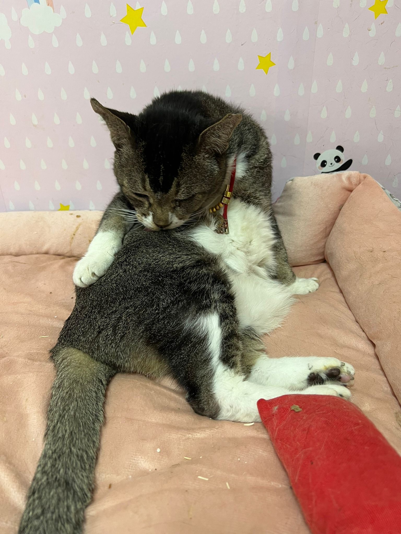 猫房 taken him in cos he was supposed to go to a shelter w one eye blind right after an adoption drive end. After proper vet checks, he is not blind. He upgraded his status in 猫房 as the cats’ papa.
