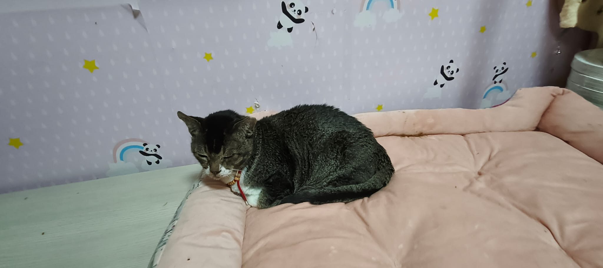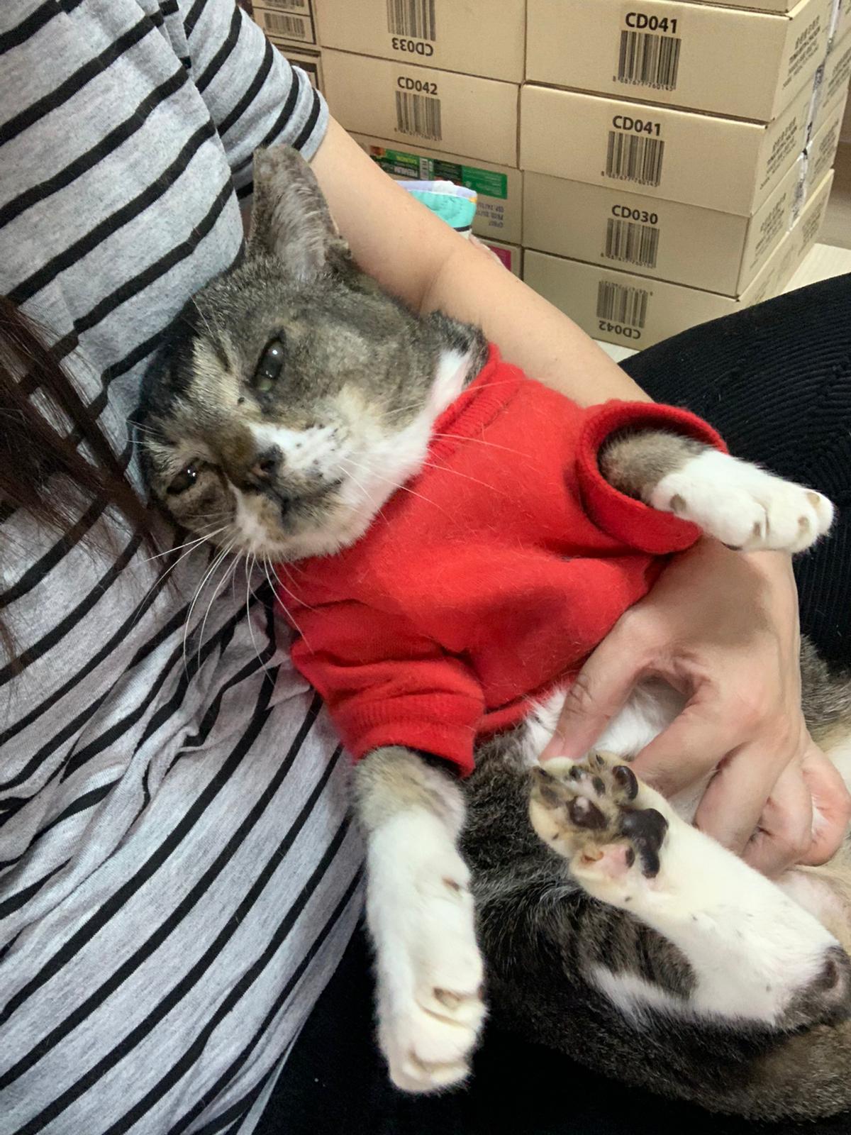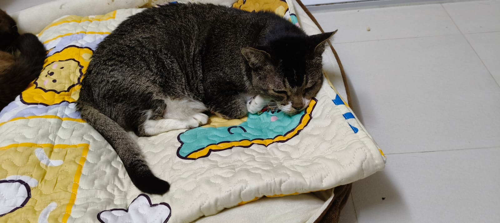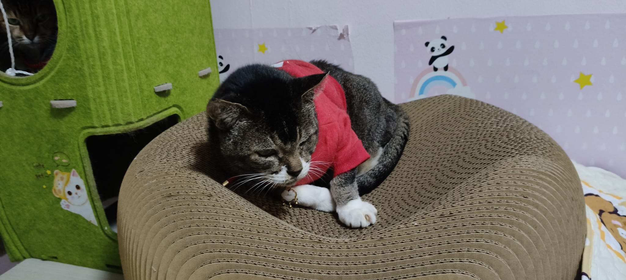 猫房 taken him in cos he was supposed to go to a shelter w one eye blind right after an adoption drive end. After proper vet checks, he is not blind. He upgraded his status in 猫房 as the cats’ papa.