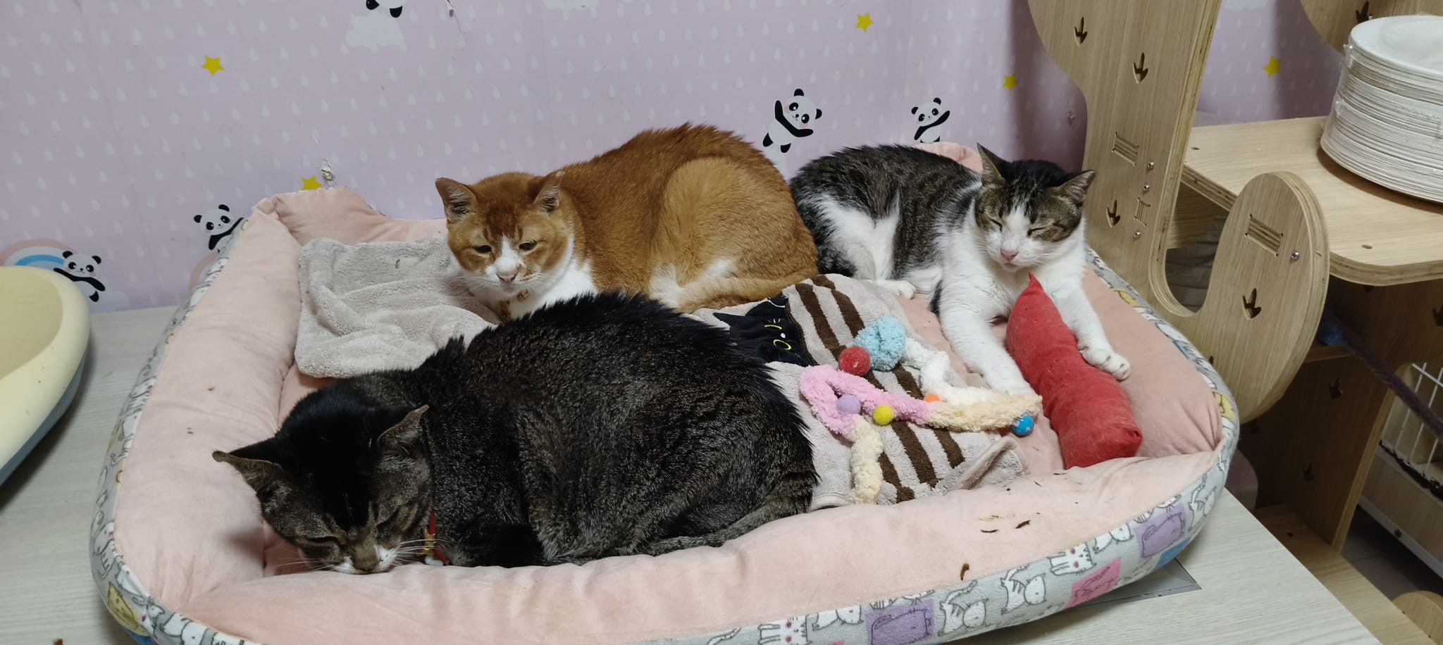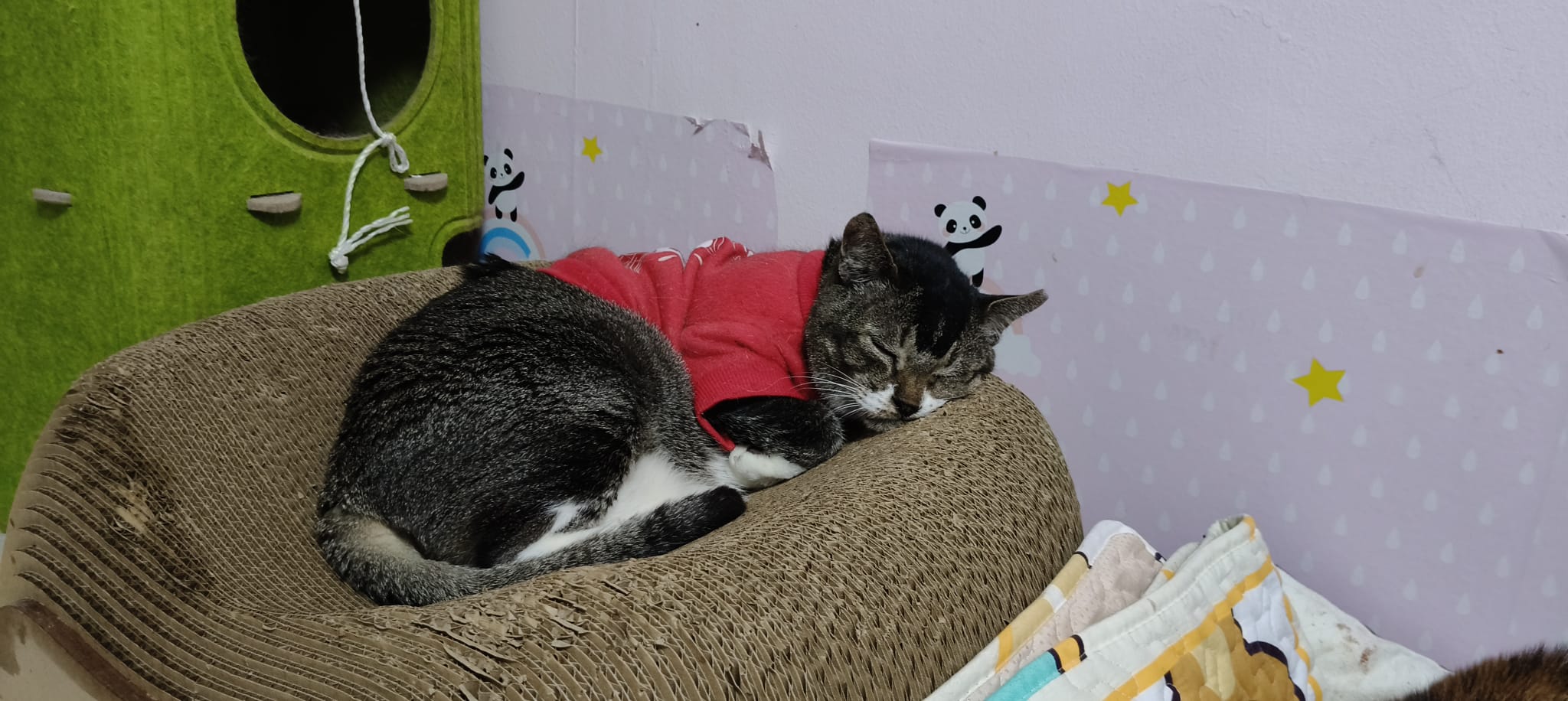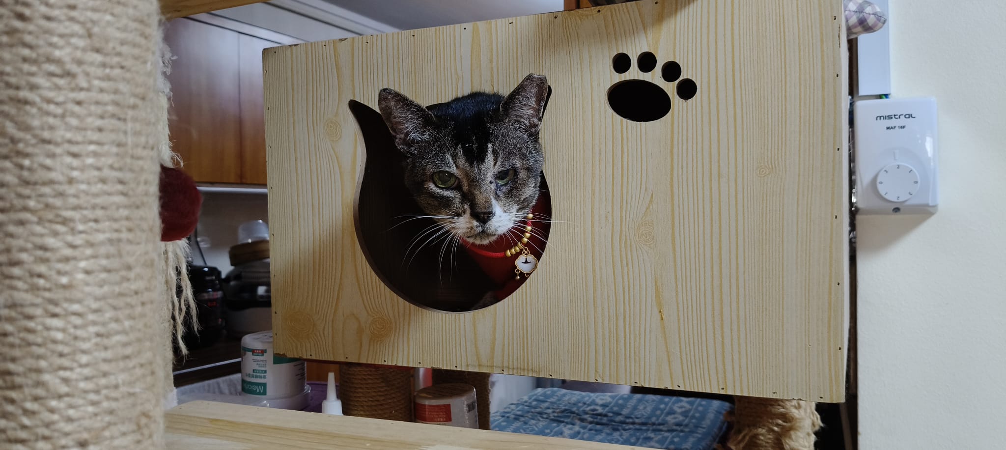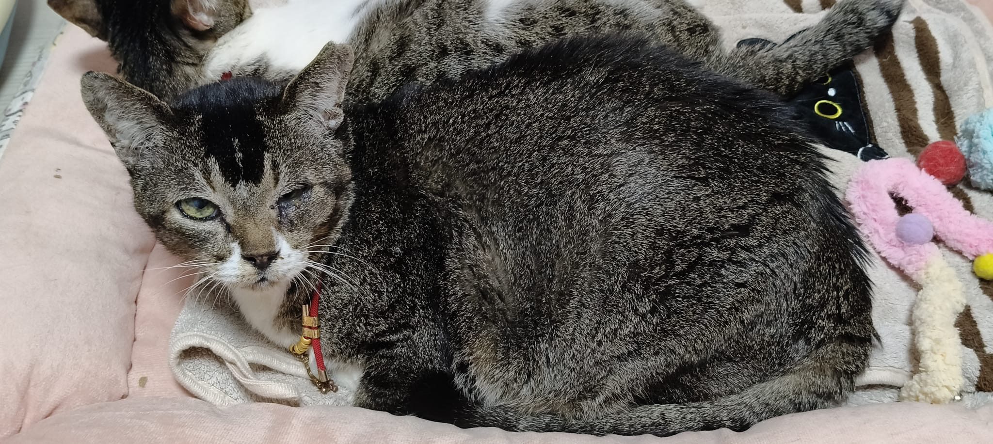 猫房 taken him in cos he was supposed to go to a shelter w one eye blind right after an adoption drive end. After proper vet checks, he is not blind. He upgraded his status in 猫房 as the cats’ papa.