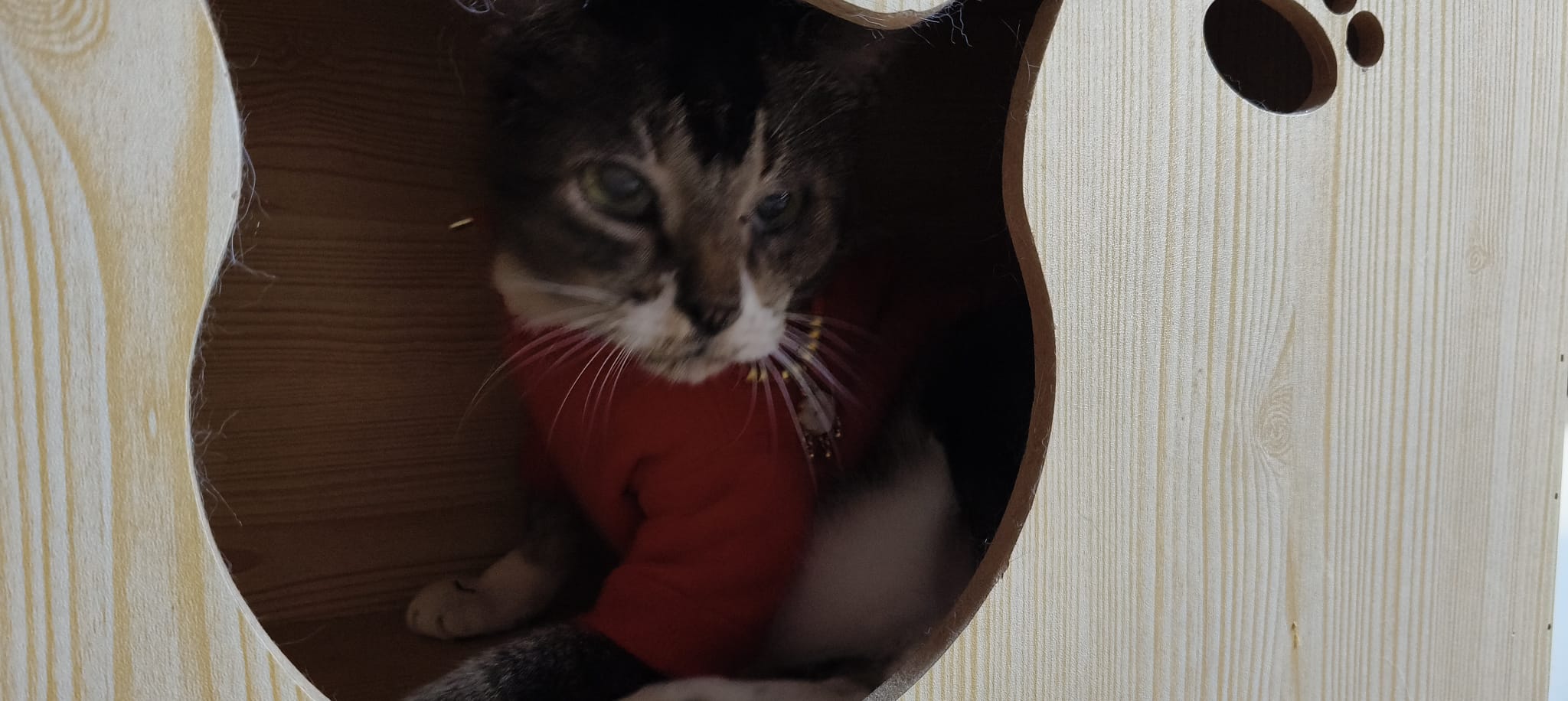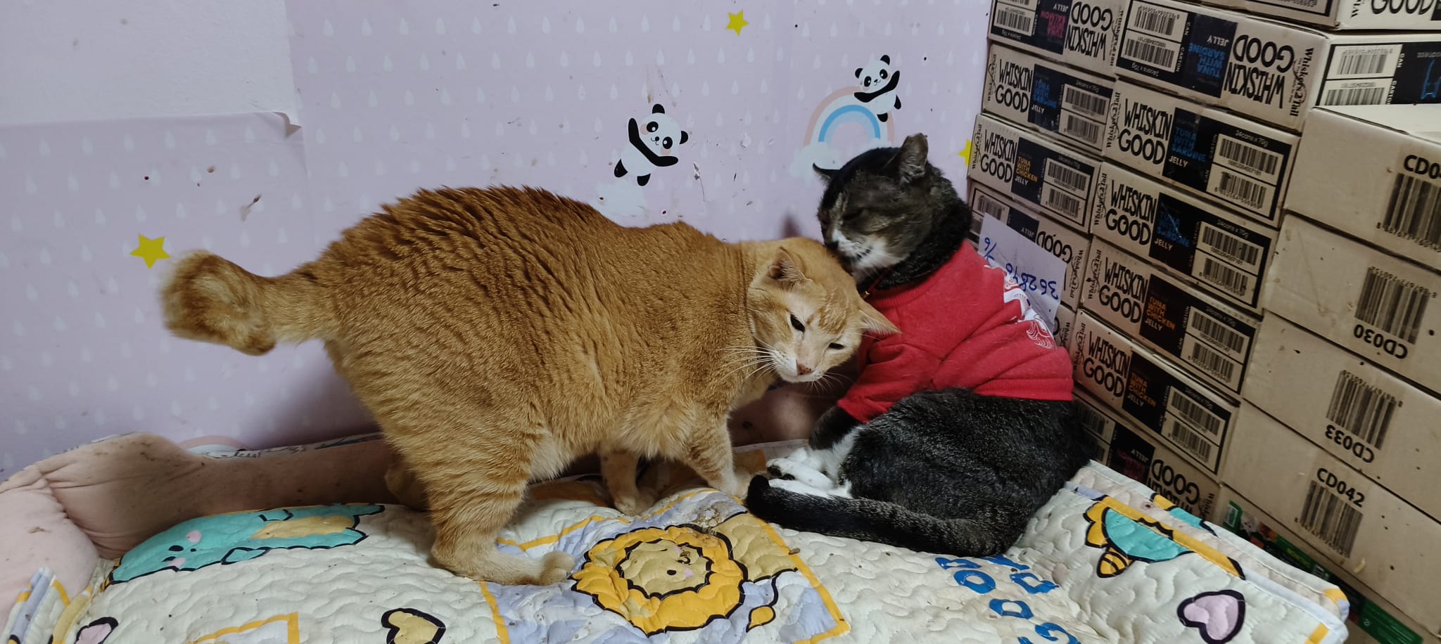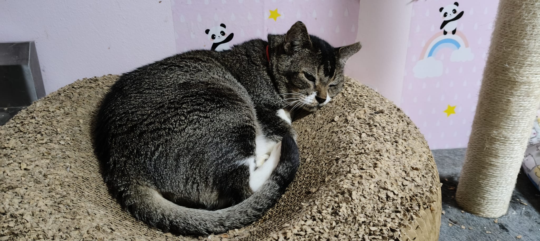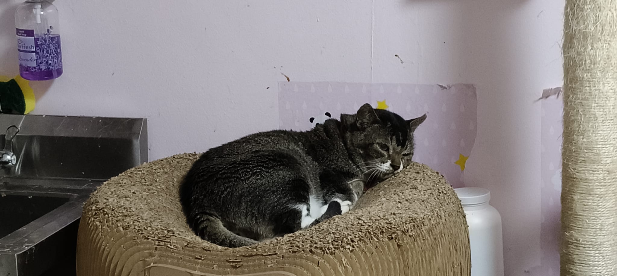 猫房 taken him in cos he was supposed to go to a shelter w one eye blind right after an adoption drive end. After proper vet checks, he is not blind. He upgraded his status in 猫房 as the cats’ papa.