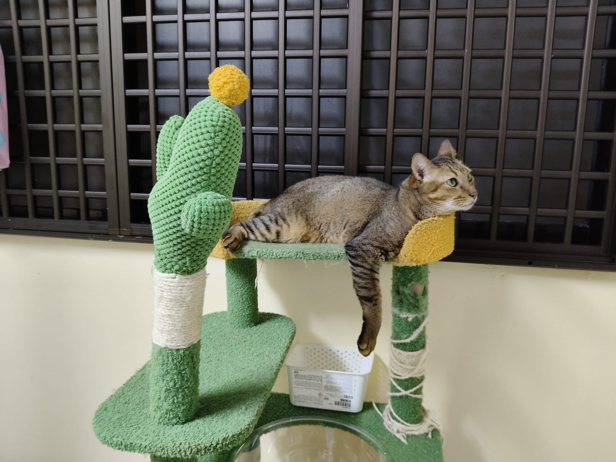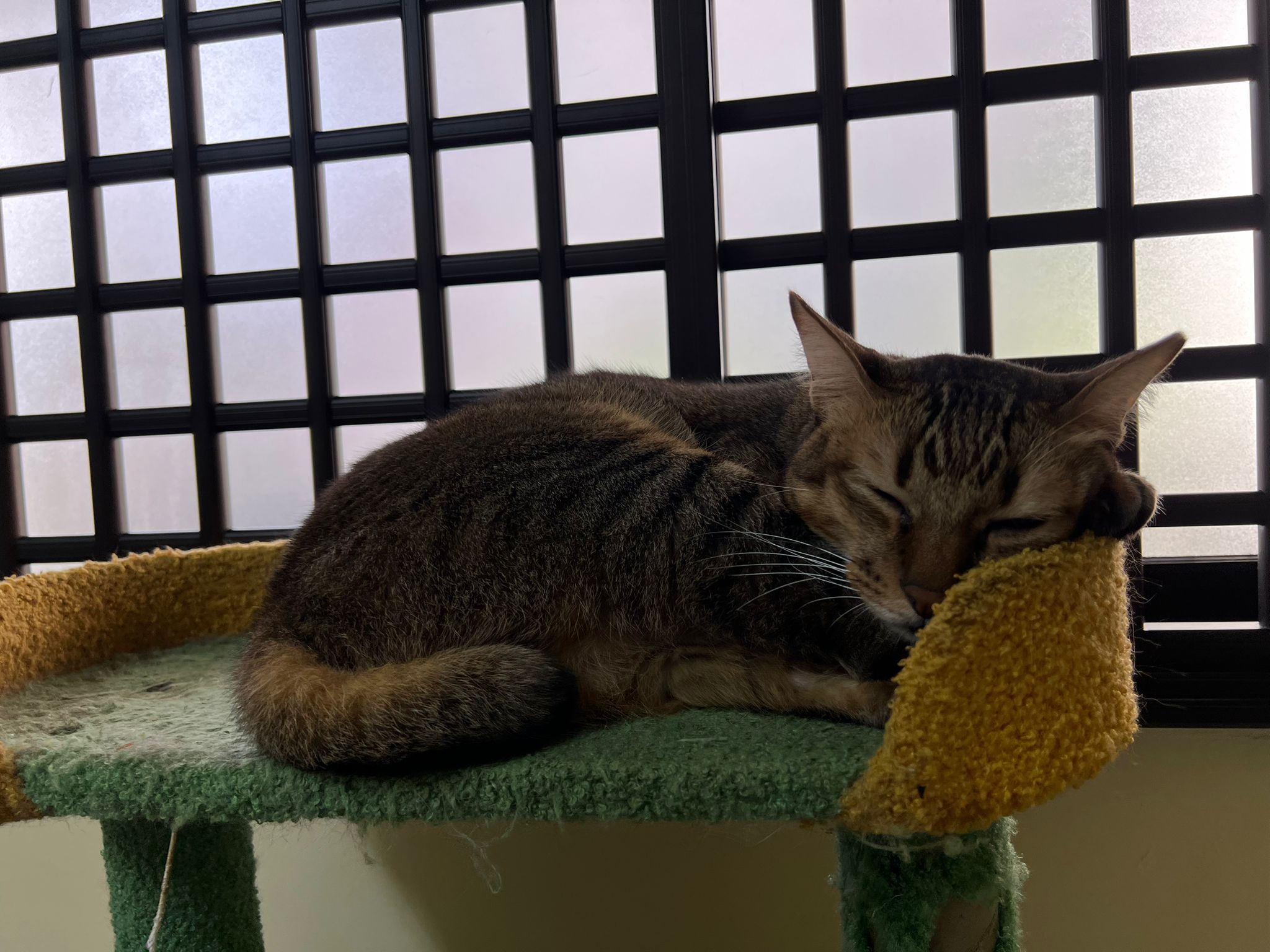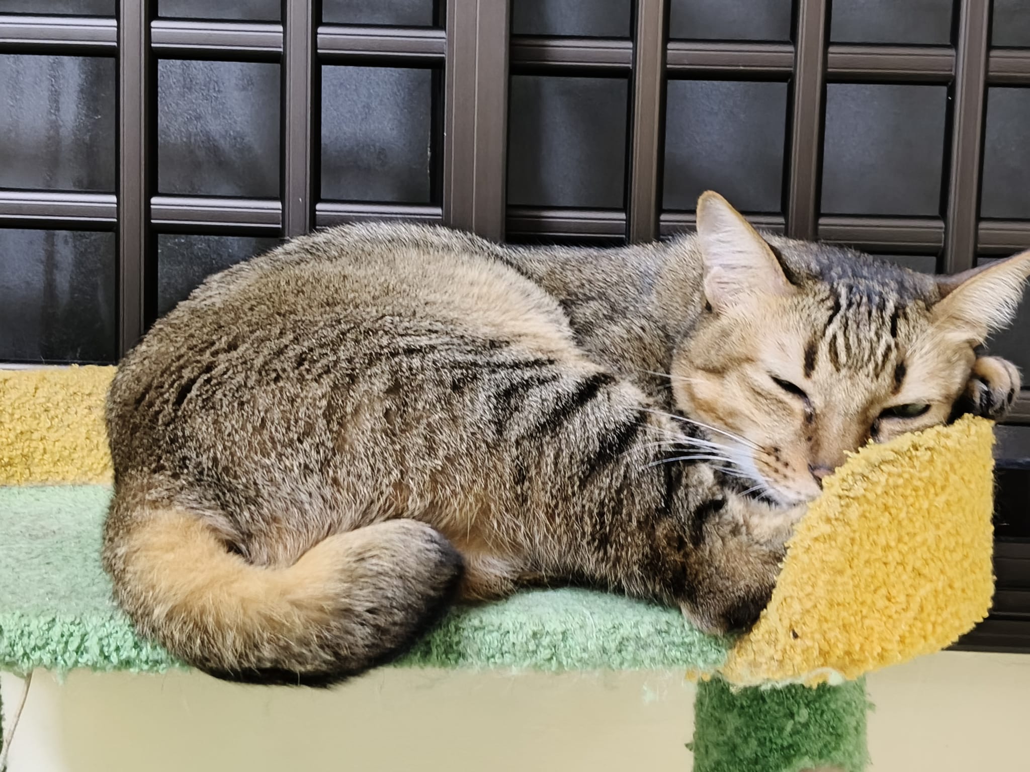 Night: photo show that he flop on the green cat tree, morning he is there too. Either he likes it a lot or ?? But morning I did greet all of them, he is fine.
