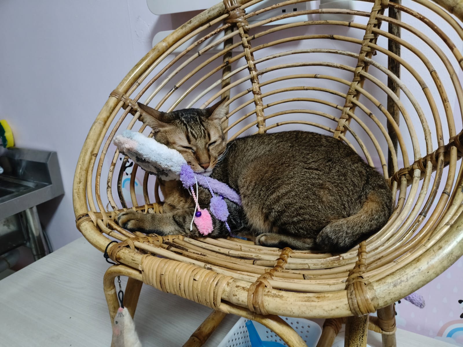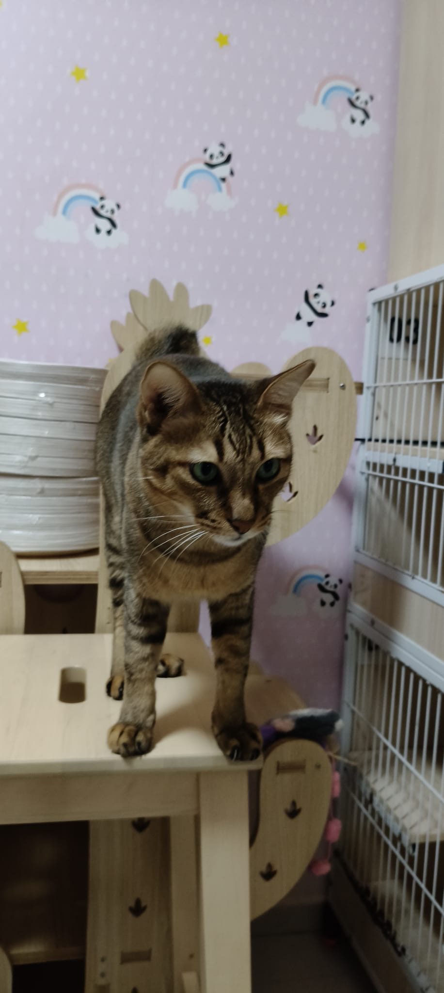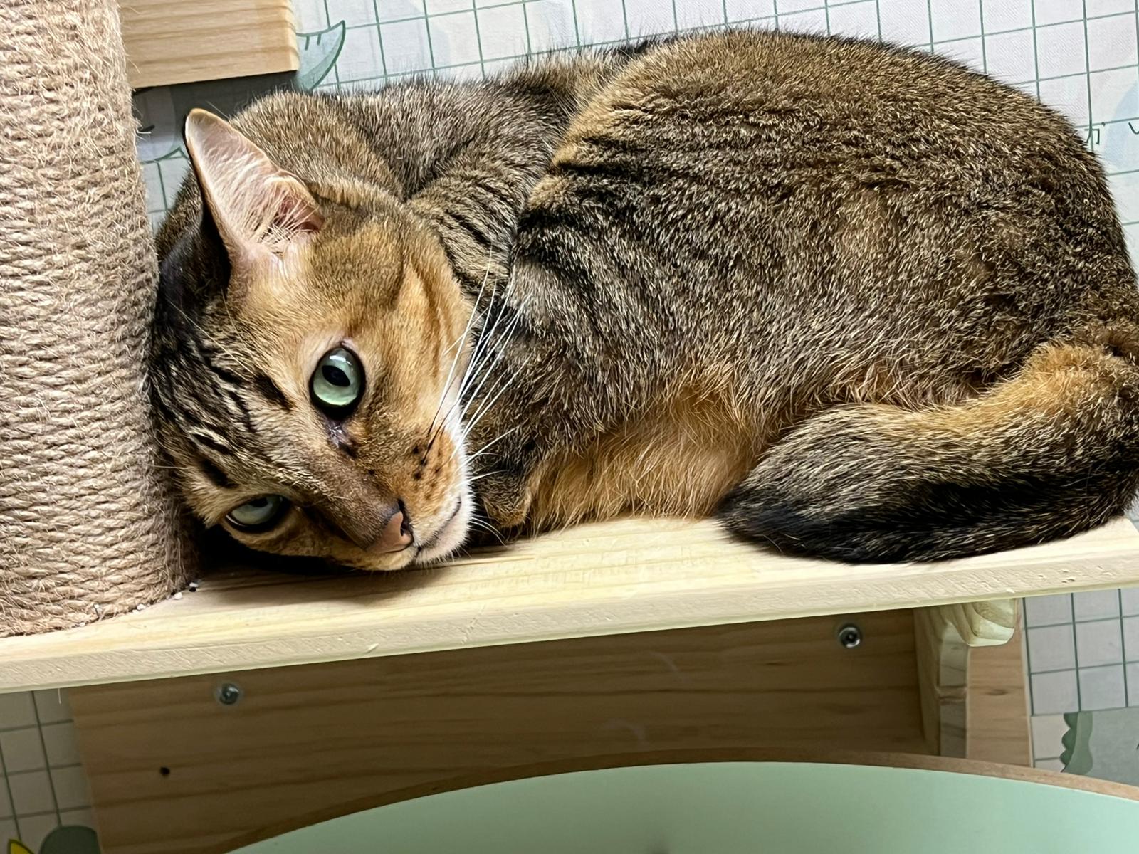 Become an active boy in 猫房 – good friends w Stitch and Brownie. Good if he and Brownie can be adopted together 🙂 His meow super high pitch, super cute like to sit at corner to play whacking w me.