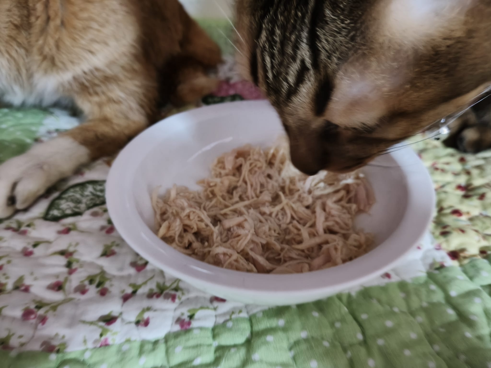 • has served them 2 bowls of kibble, 1 bowl water, 3 plates of tuna w salmon.