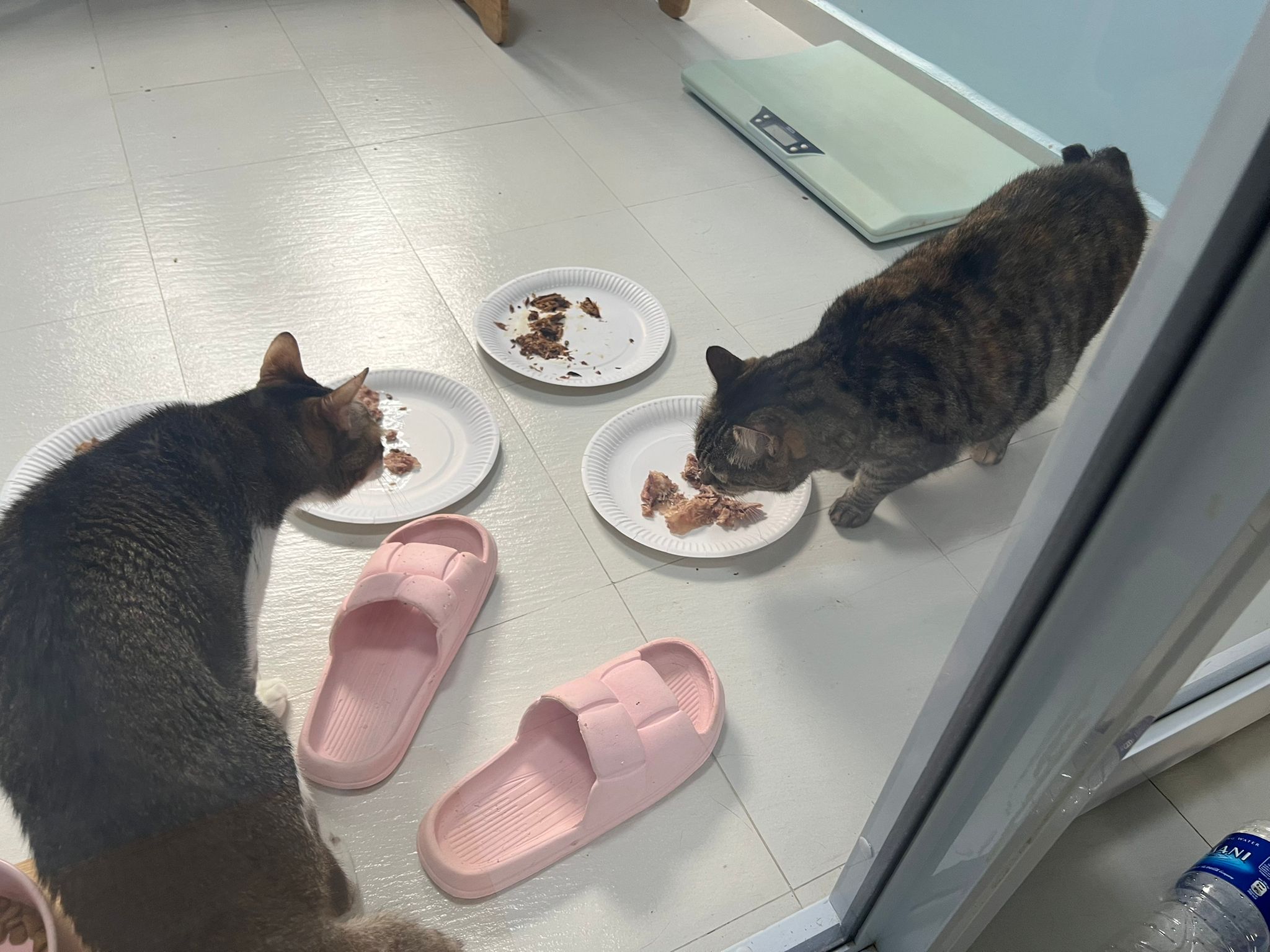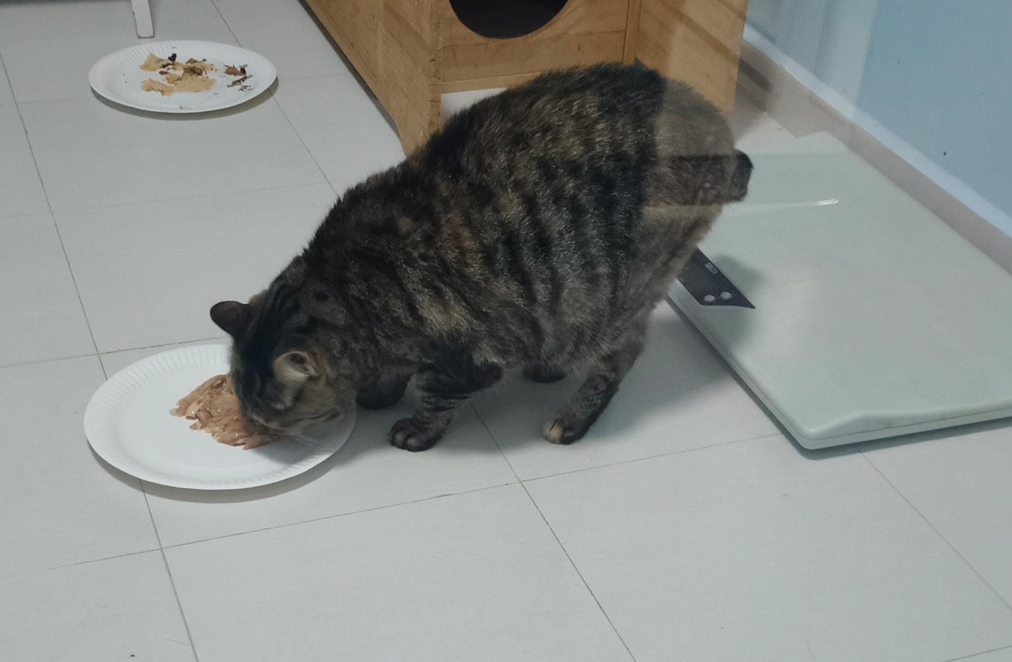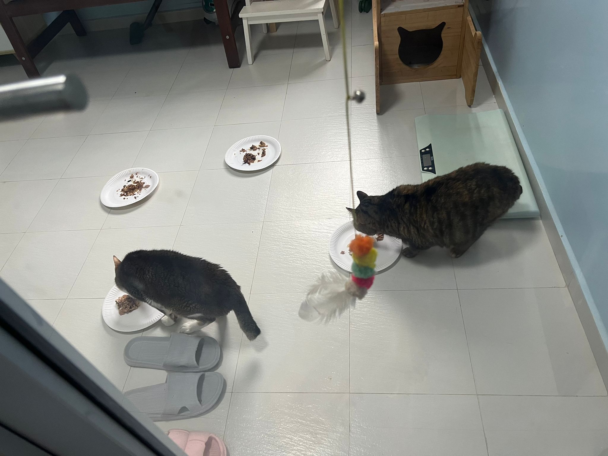 11Am; we moving to 猫房 5G. 5.05kg – drop 90g – yap didn’t look as round. Scare, keep staying under the cat Box shelf. near don, but not together. V scare.