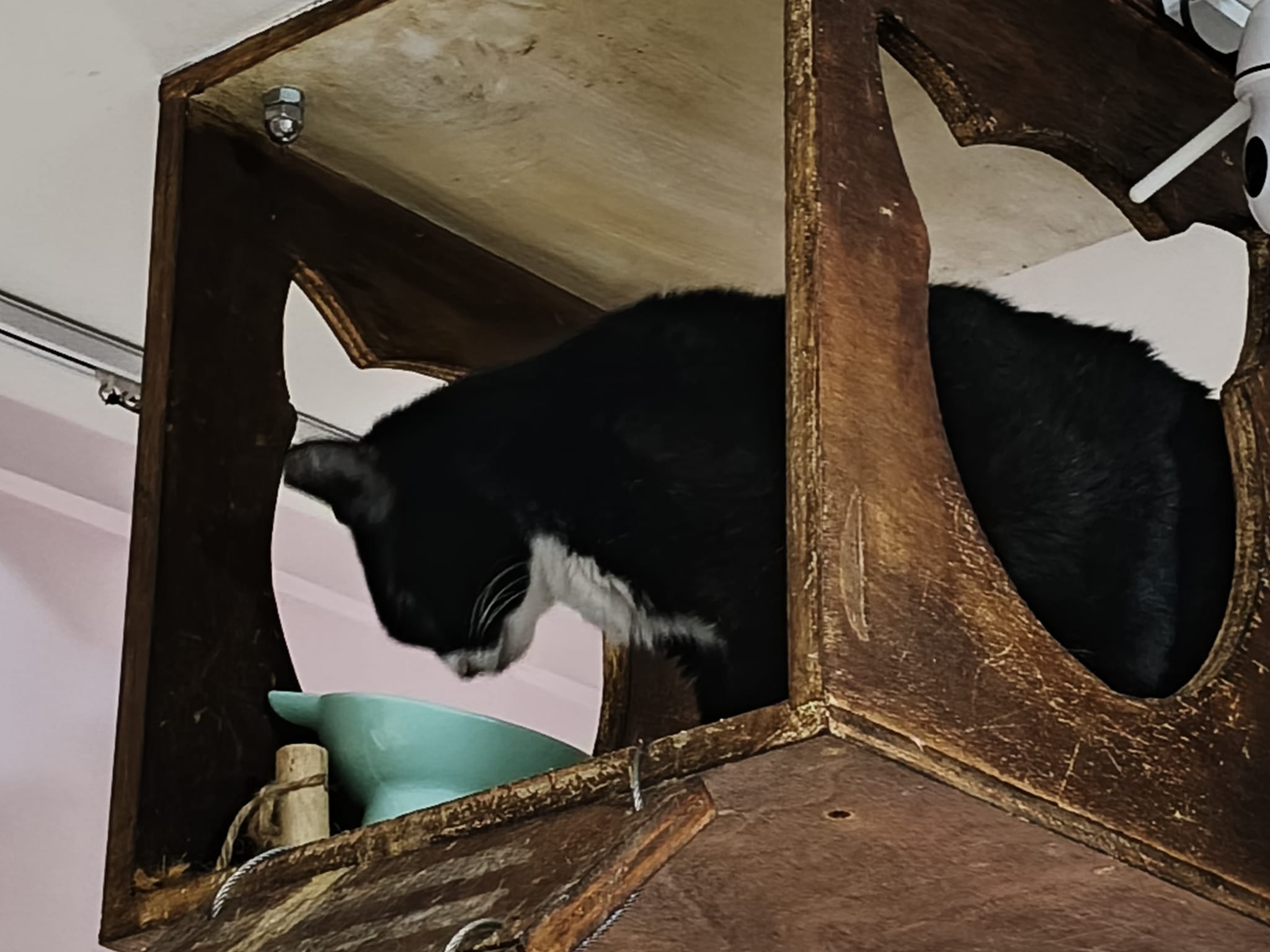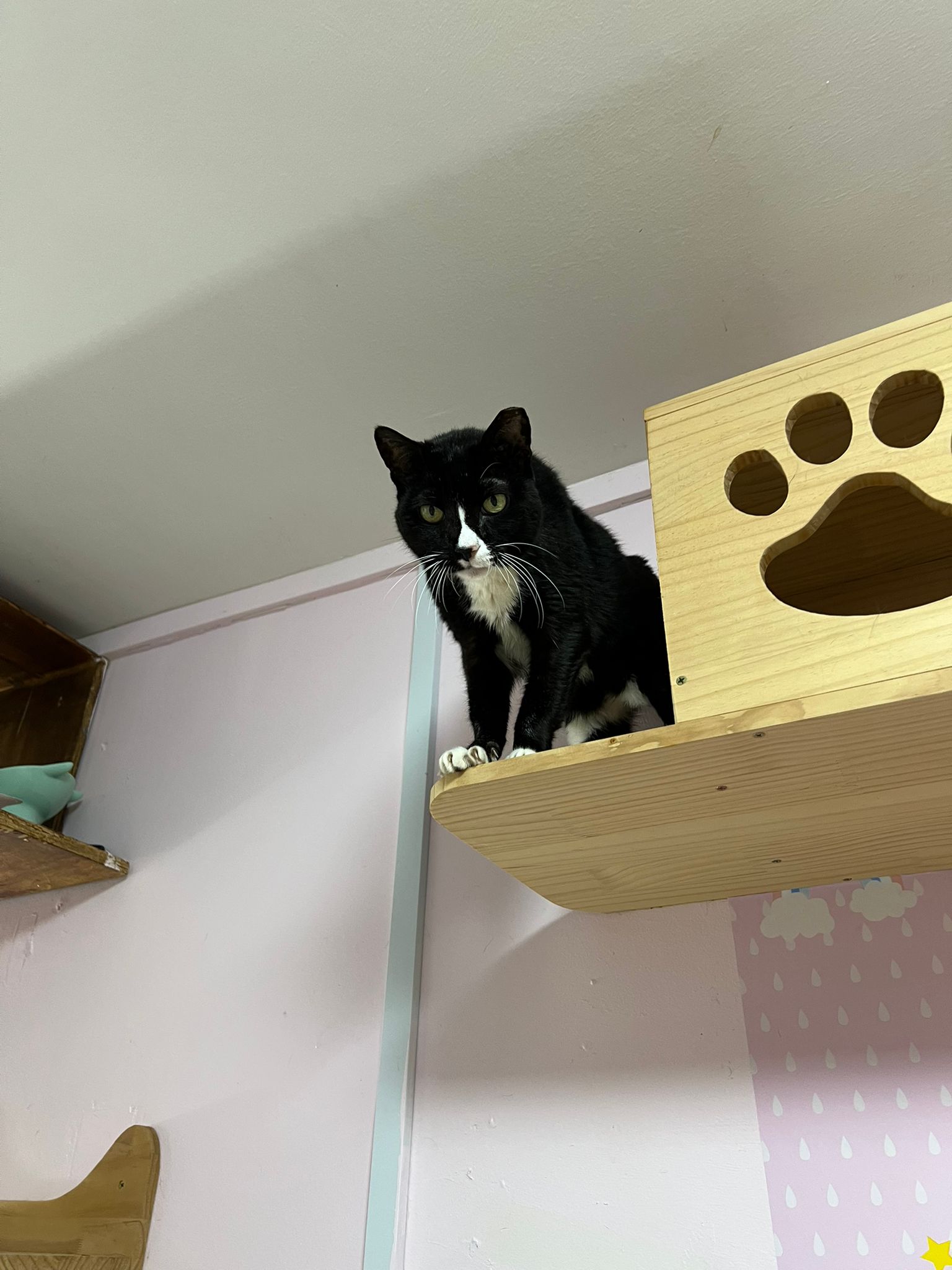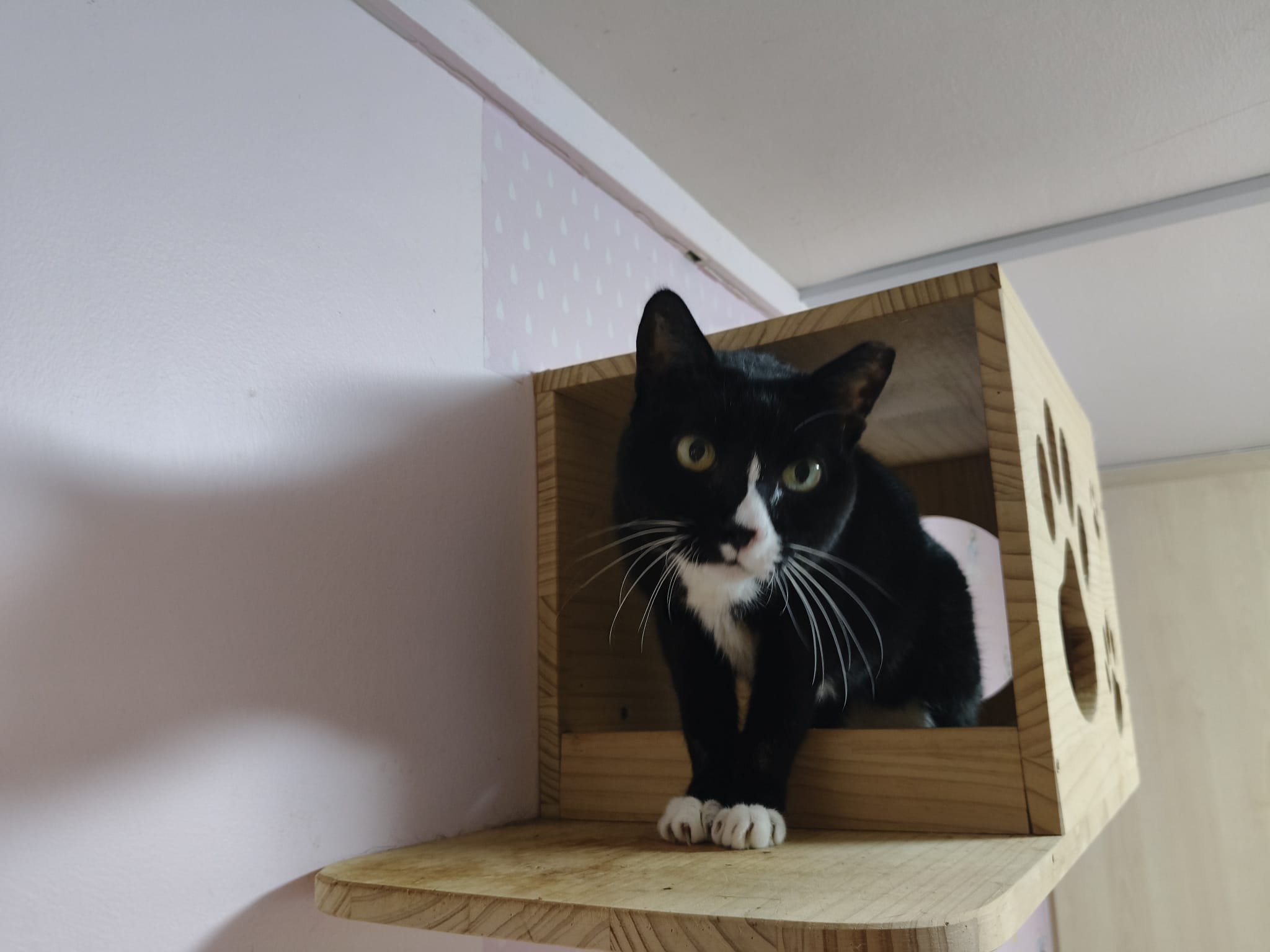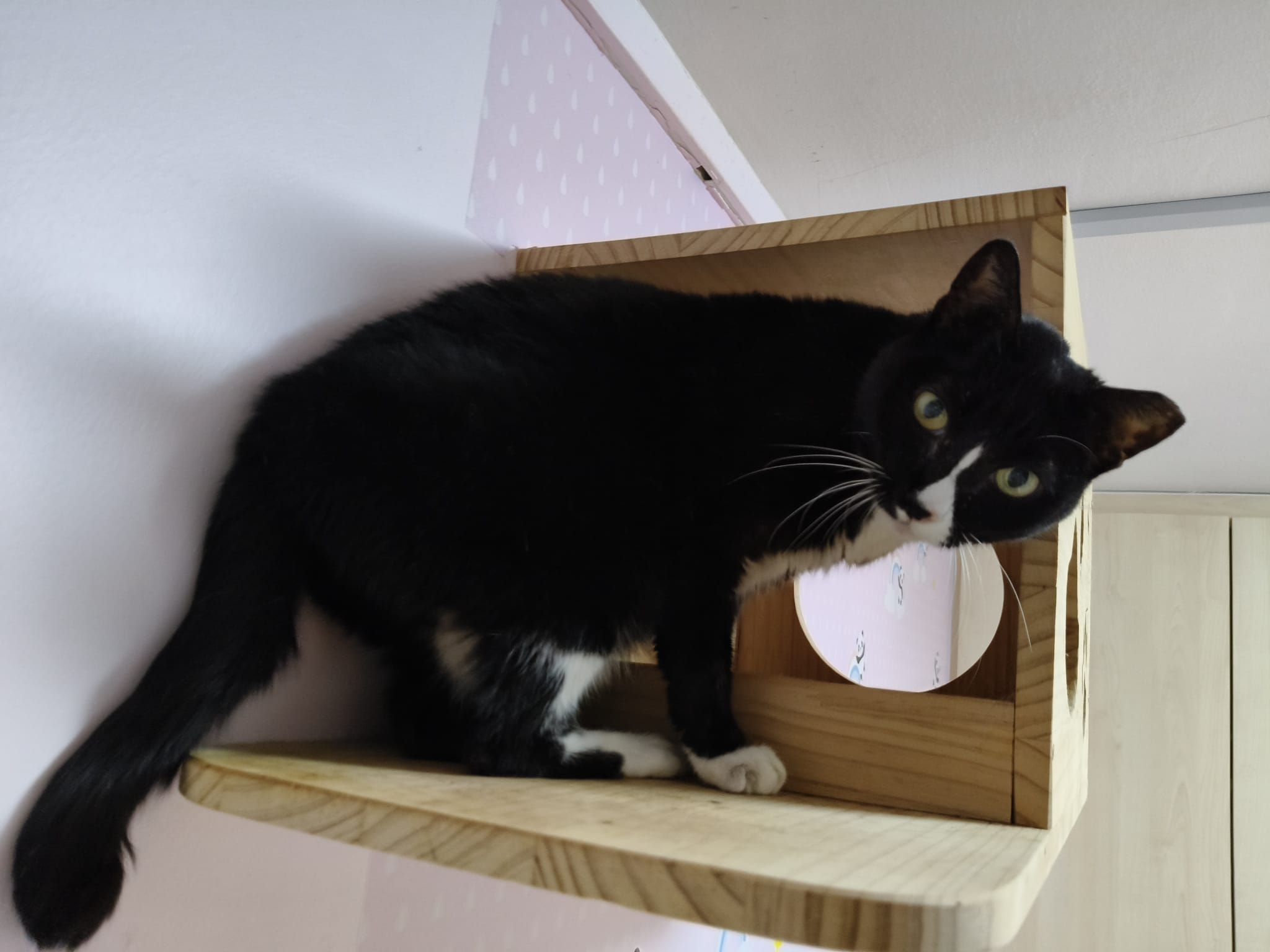 Jump skillfully well up the wall/ ledge to hanging bed. She likes hanging bed.
