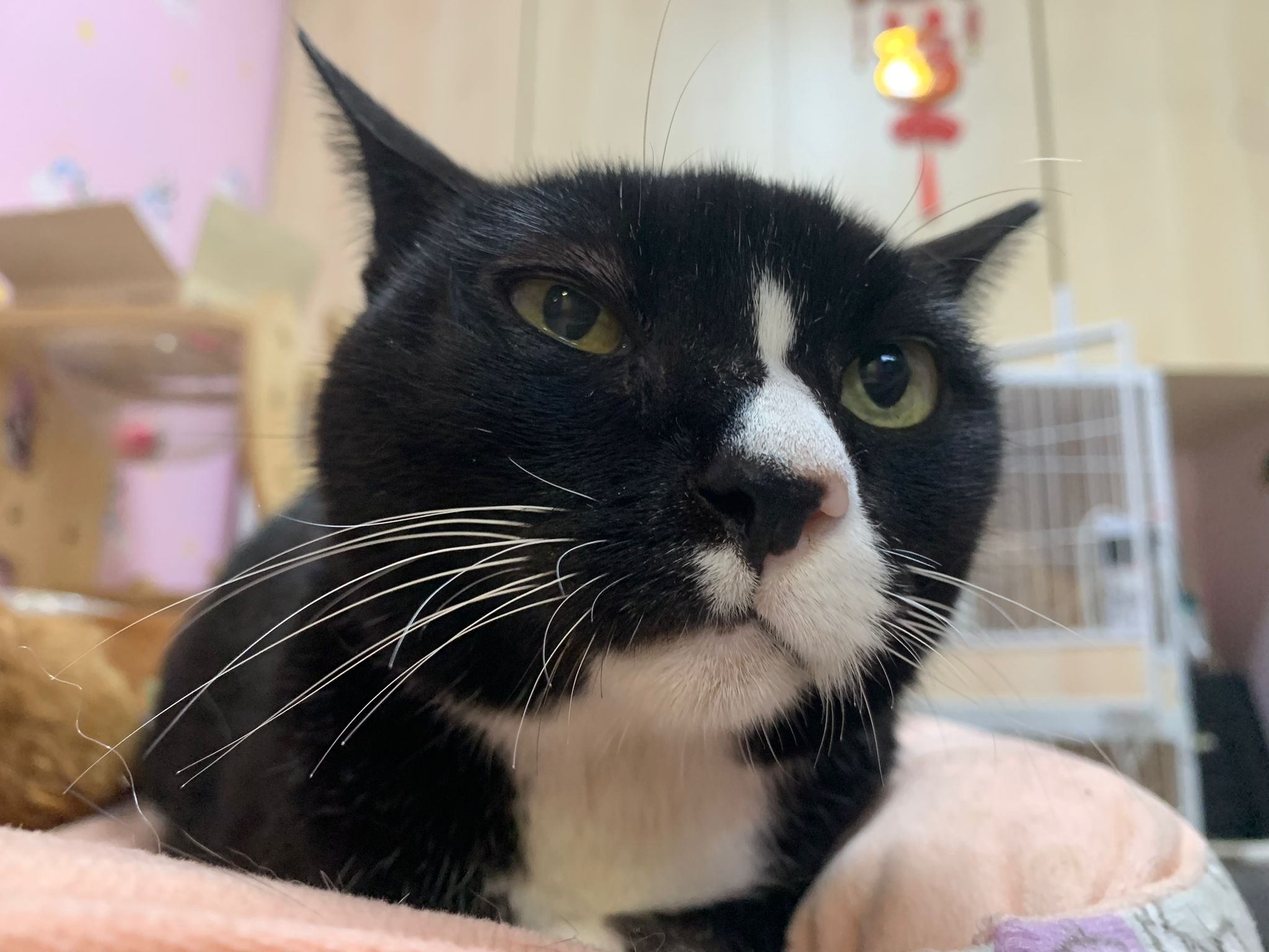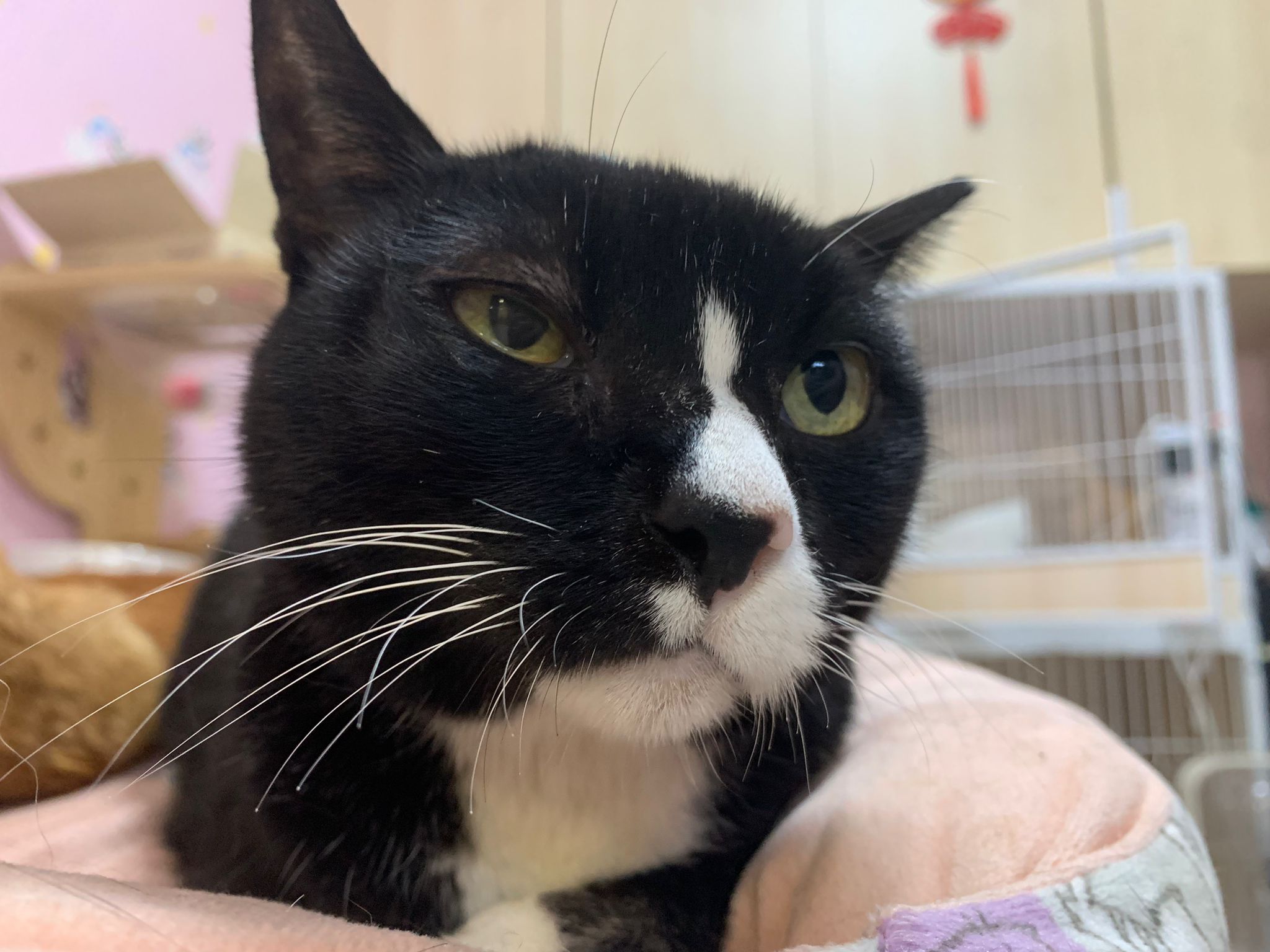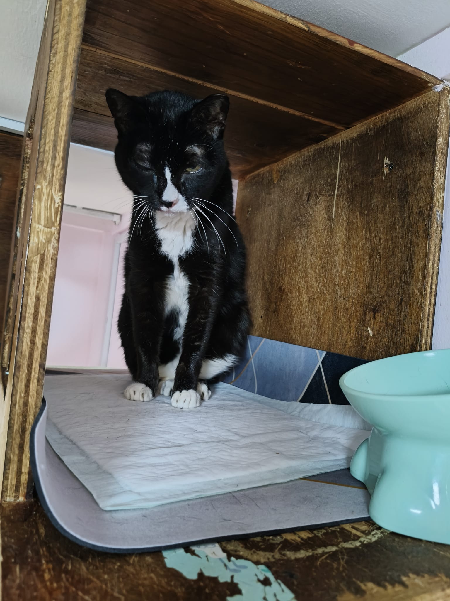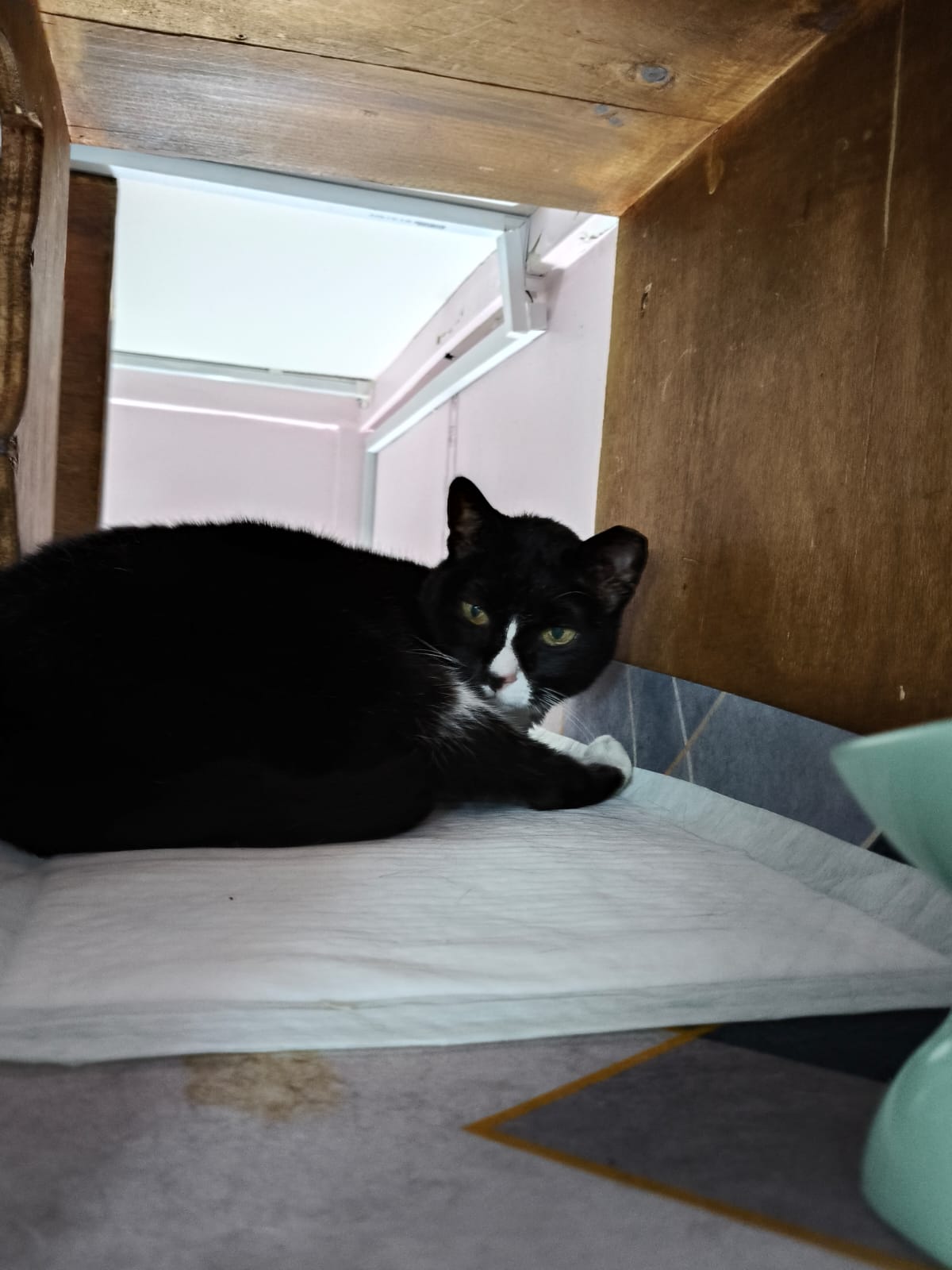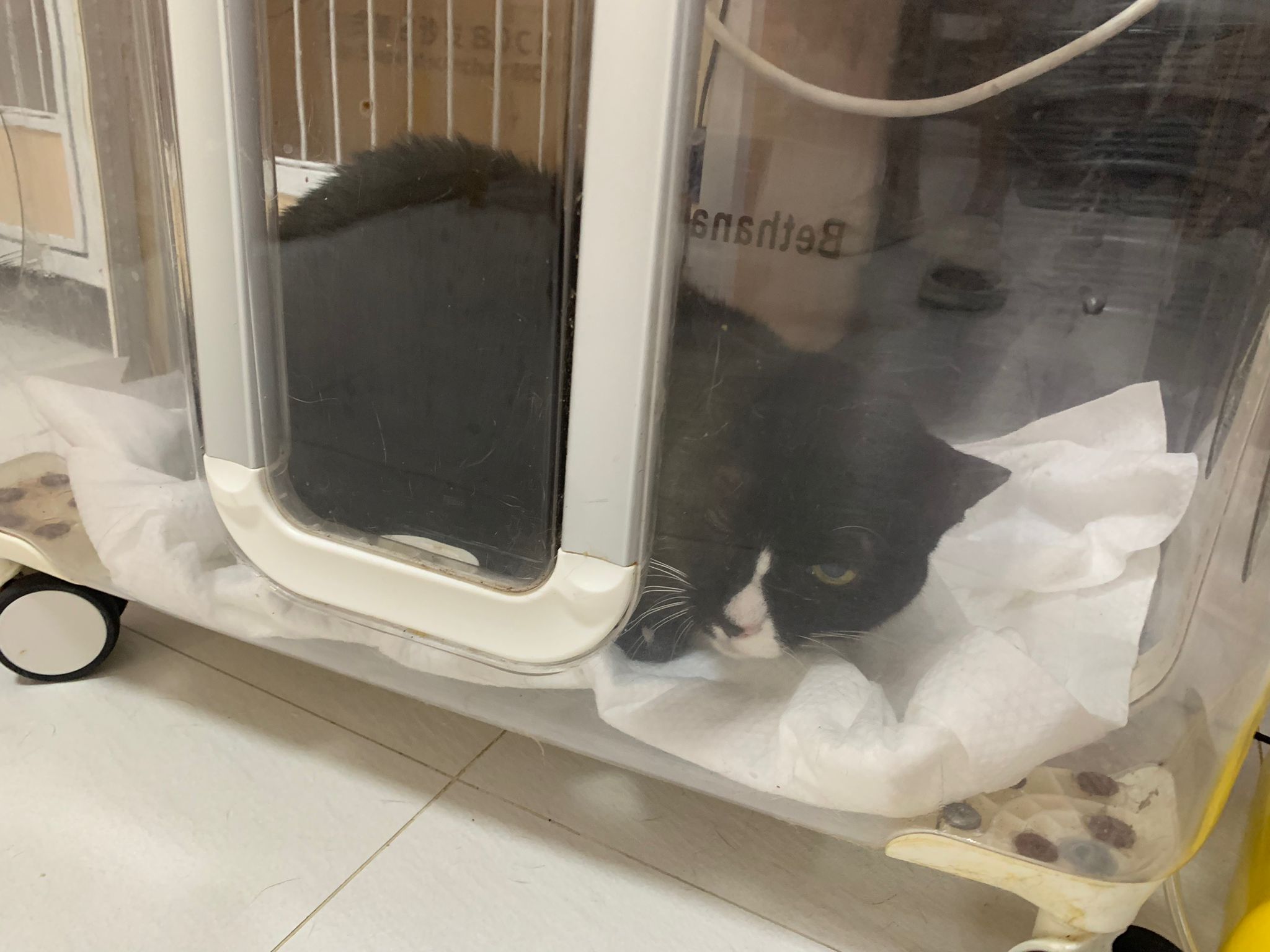 Lucky in 猫房 iso room, settle down in carrier box w towel.