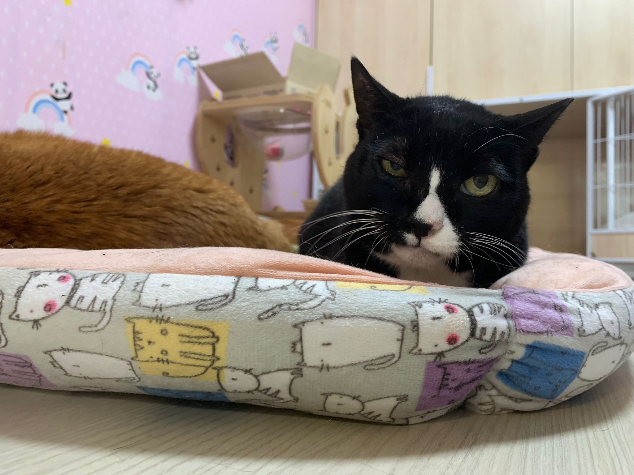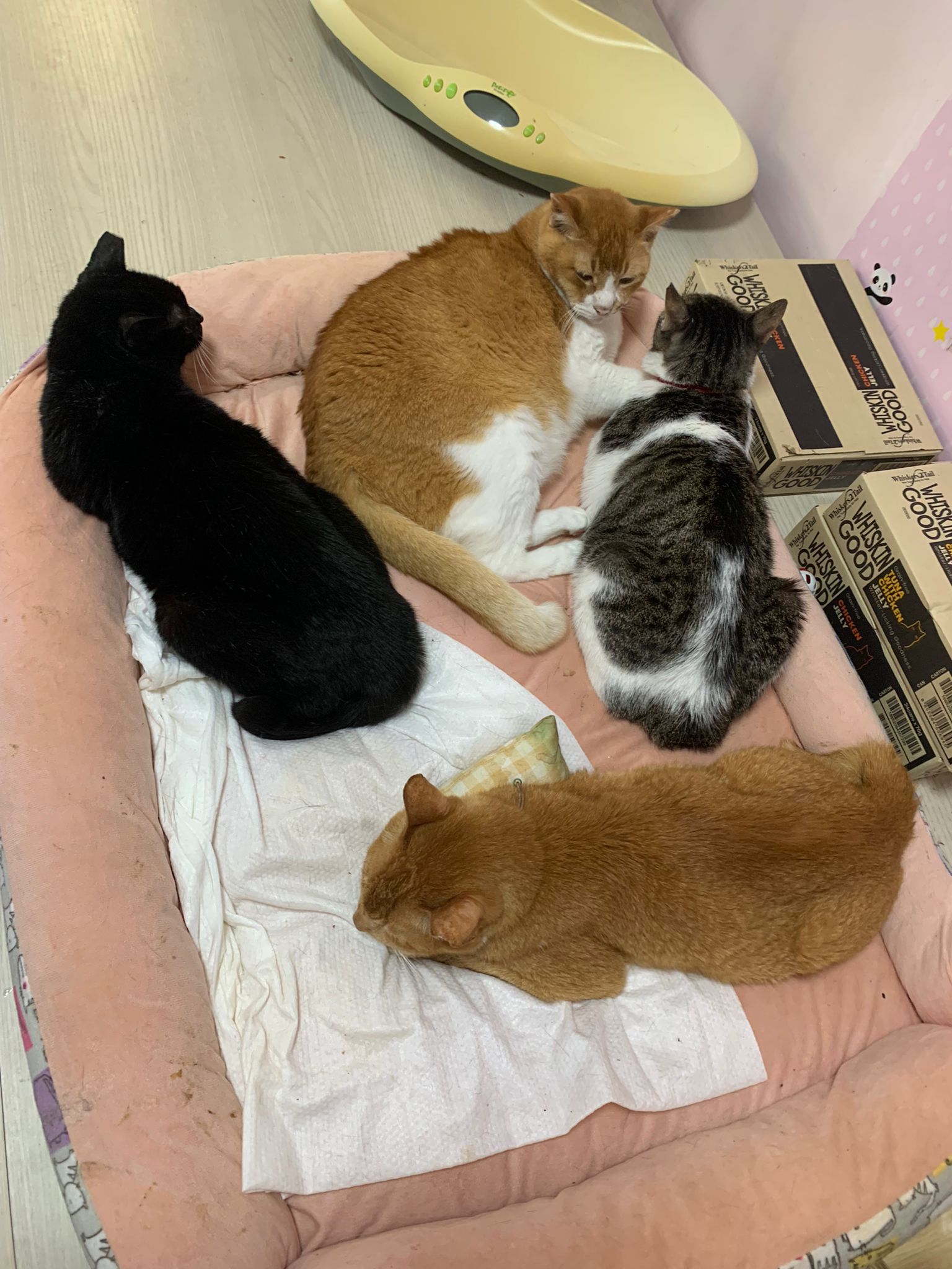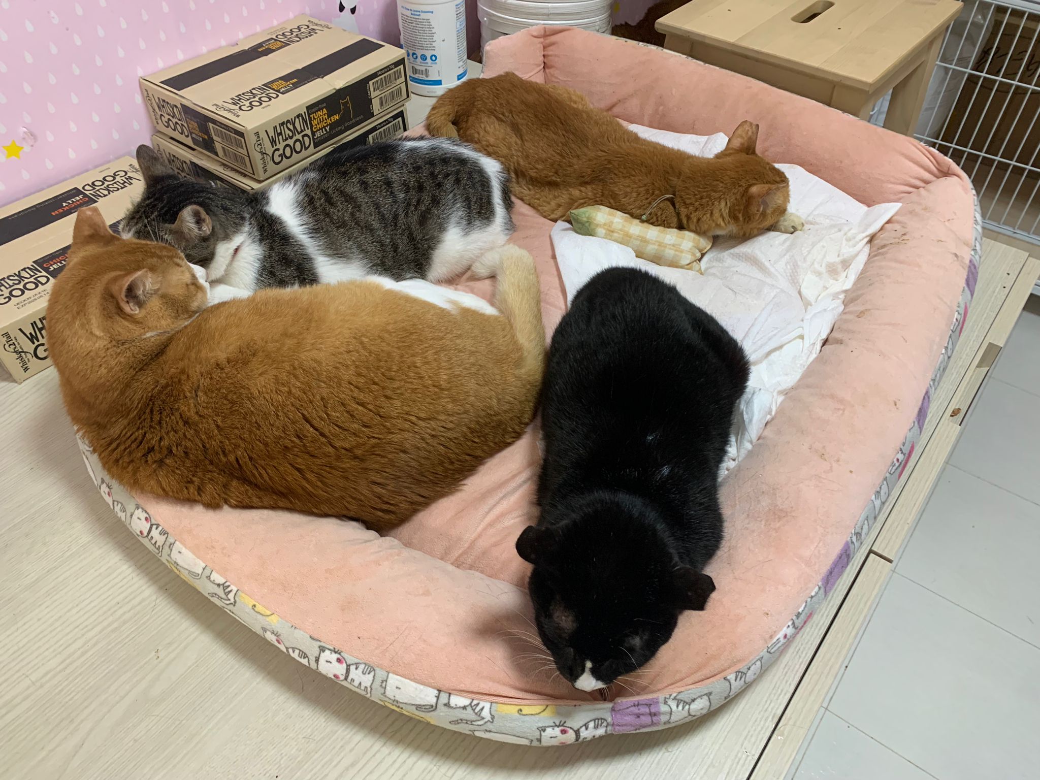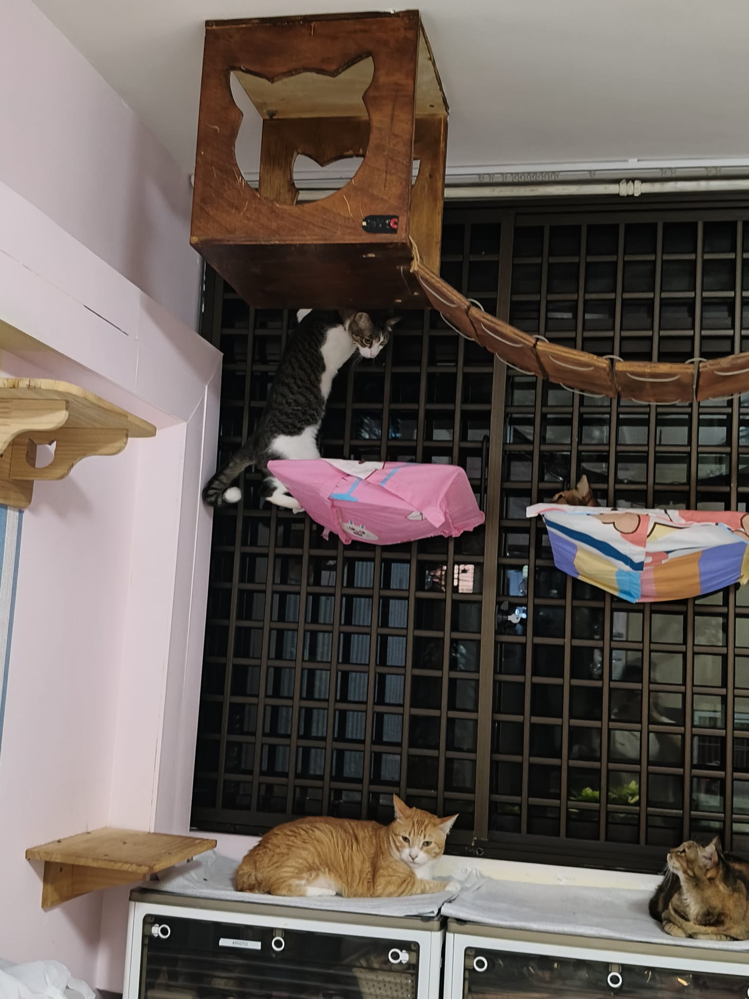 Morning: quarantined tgt w Princess sweetheart, char, rena and teddy in new room for the installation of aircon, put in 3 hanging beds for her. She settle well in them. Teach her how to use bin, but not sure she will pee on pillow case or come down to pee. The rest are so calm cats