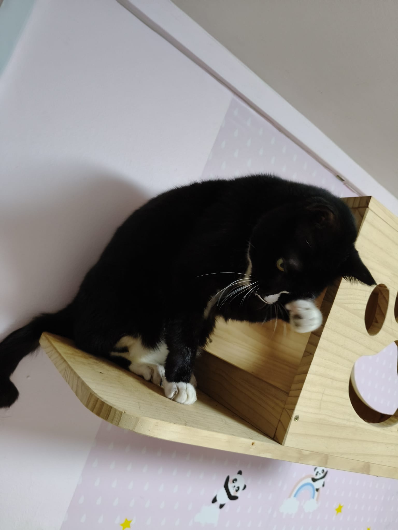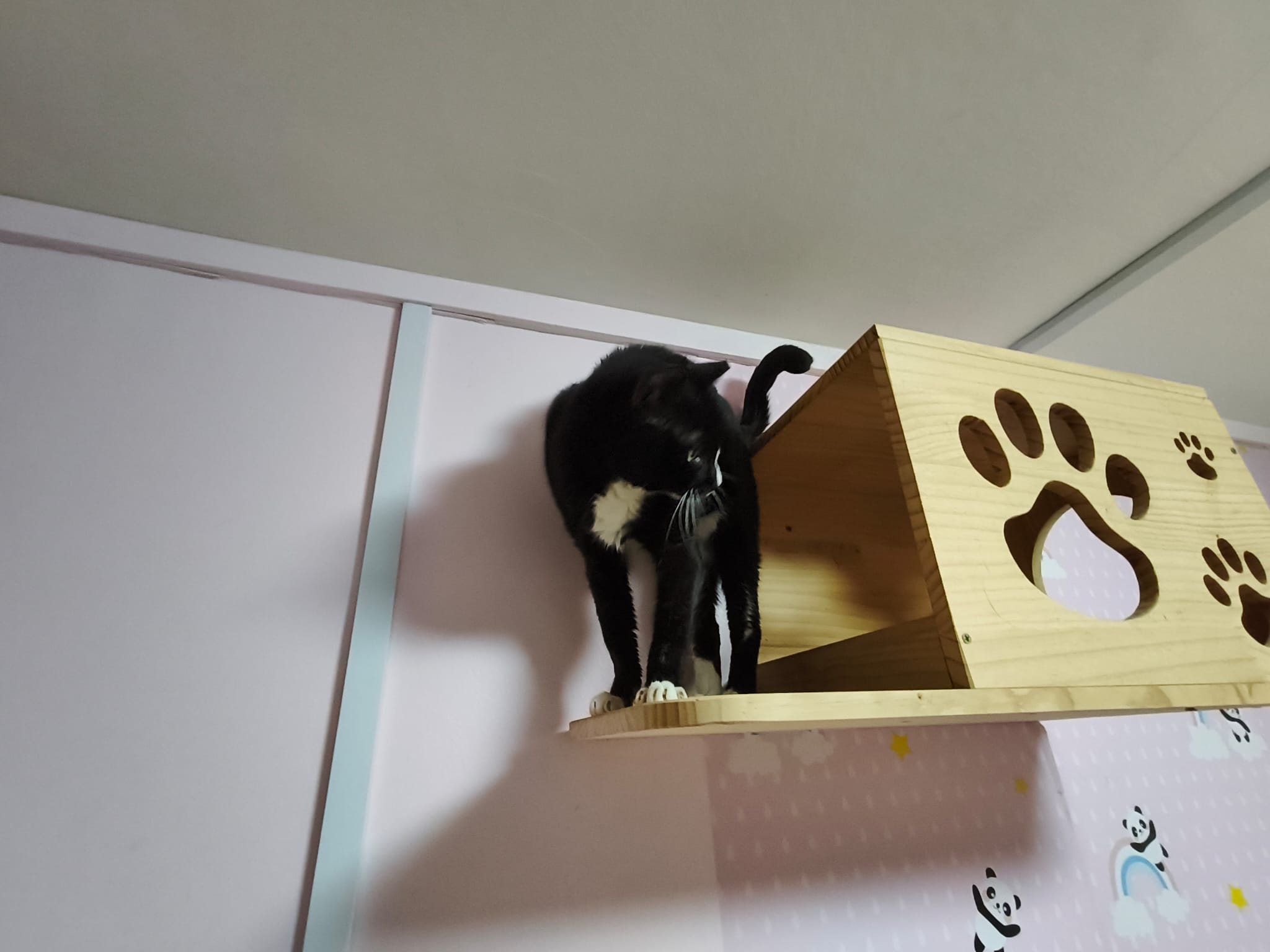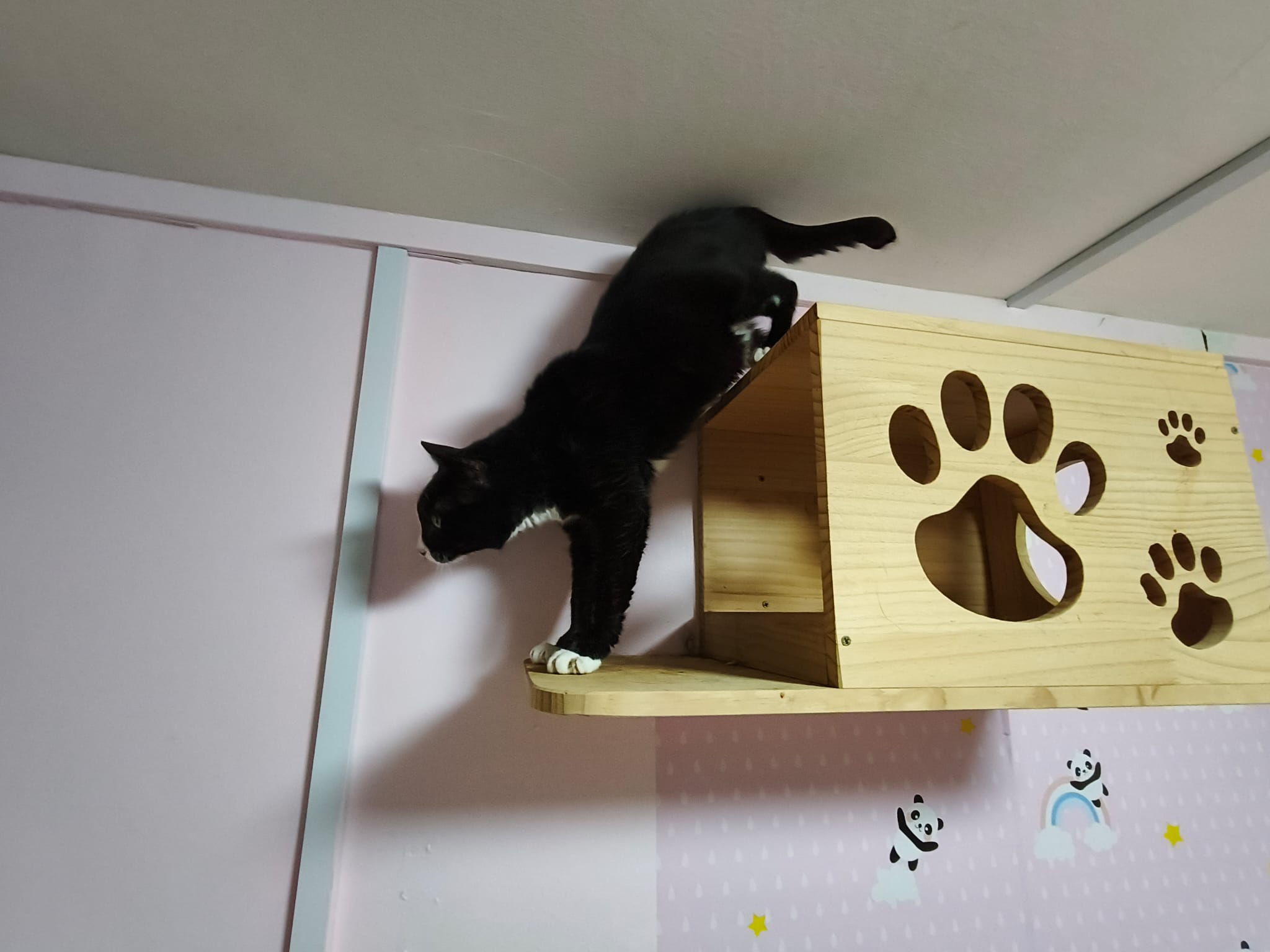 Jump skillfully well up the wall/ ledge to hanging bed. She likes hanging bed.