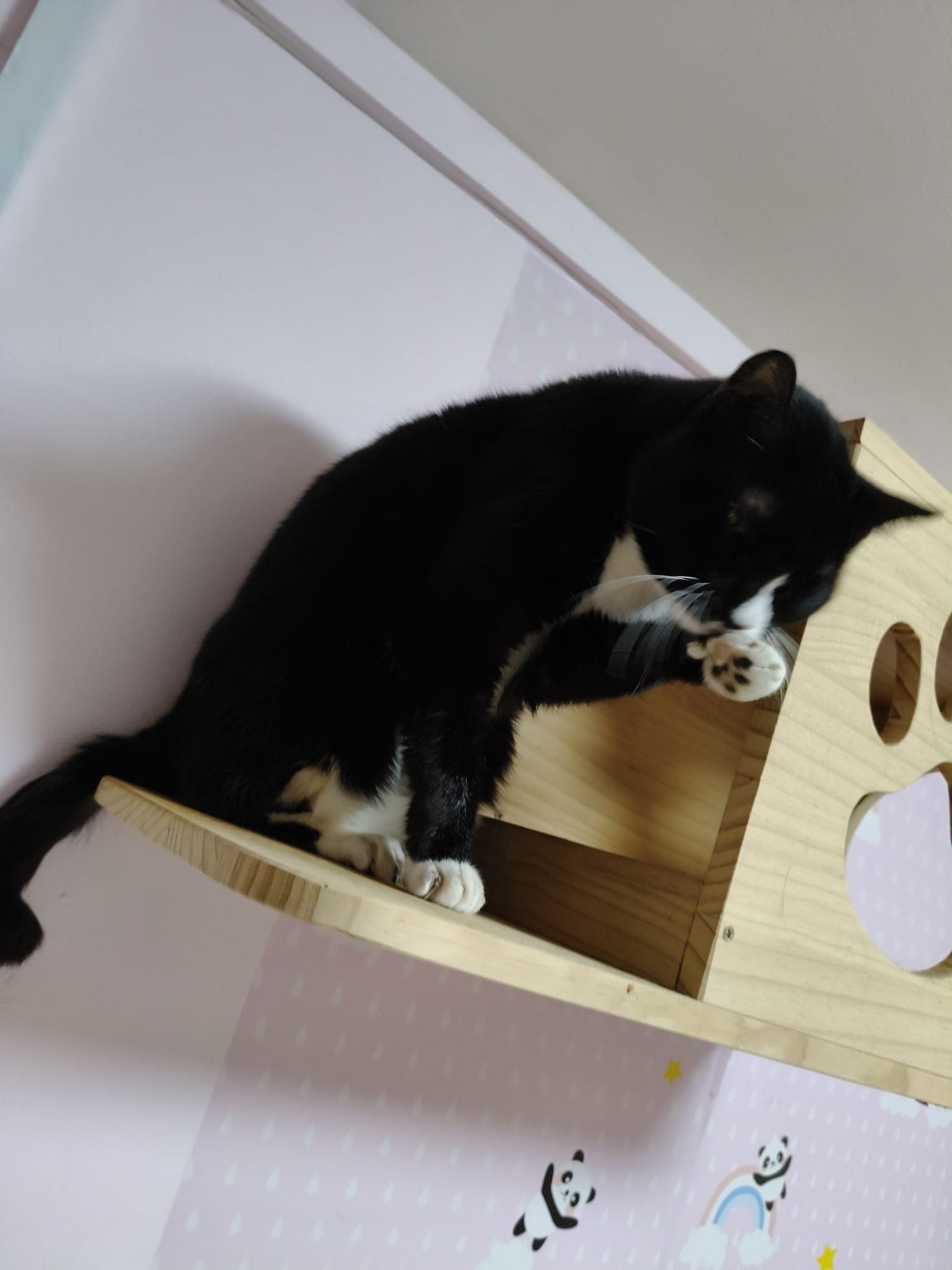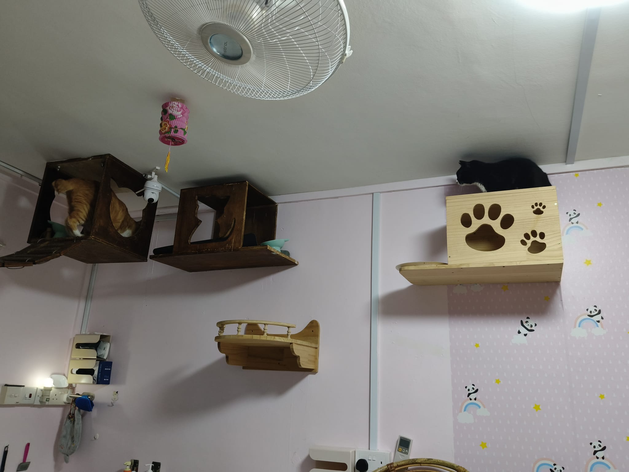 Morning: quarantined tgt w Princess sweetheart, char, rena and teddy in new room for the installation of aircon, put in 3 hanging beds for her. She settle well in them. Teach her how to use bin, but not sure she will pee on pillow case or come down to pee. The rest are so calm cats