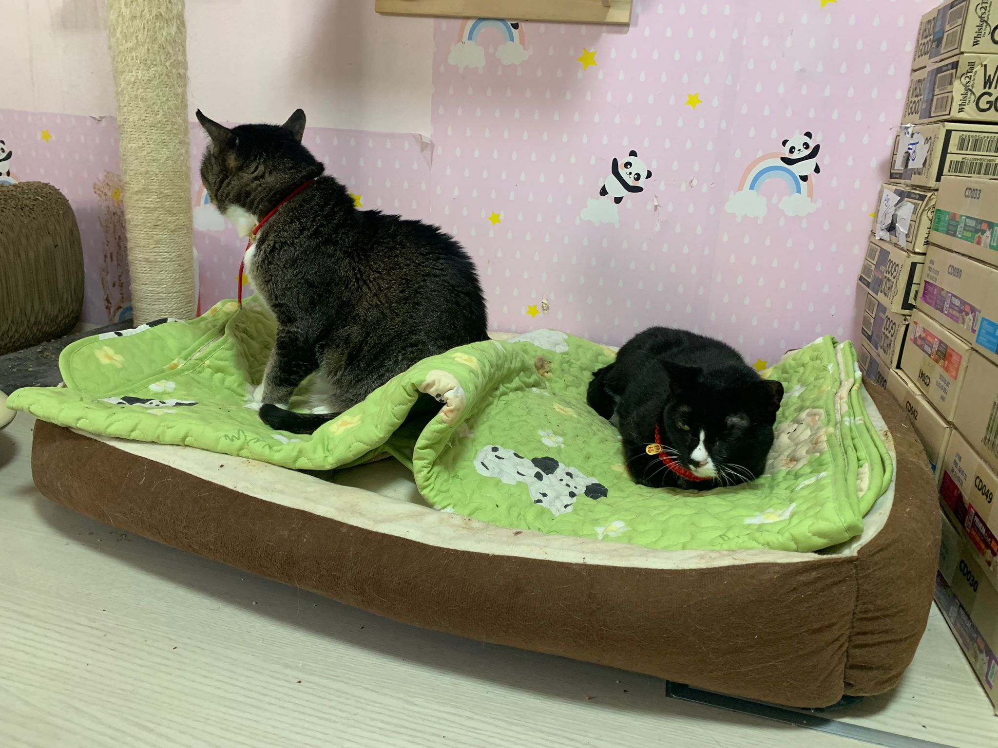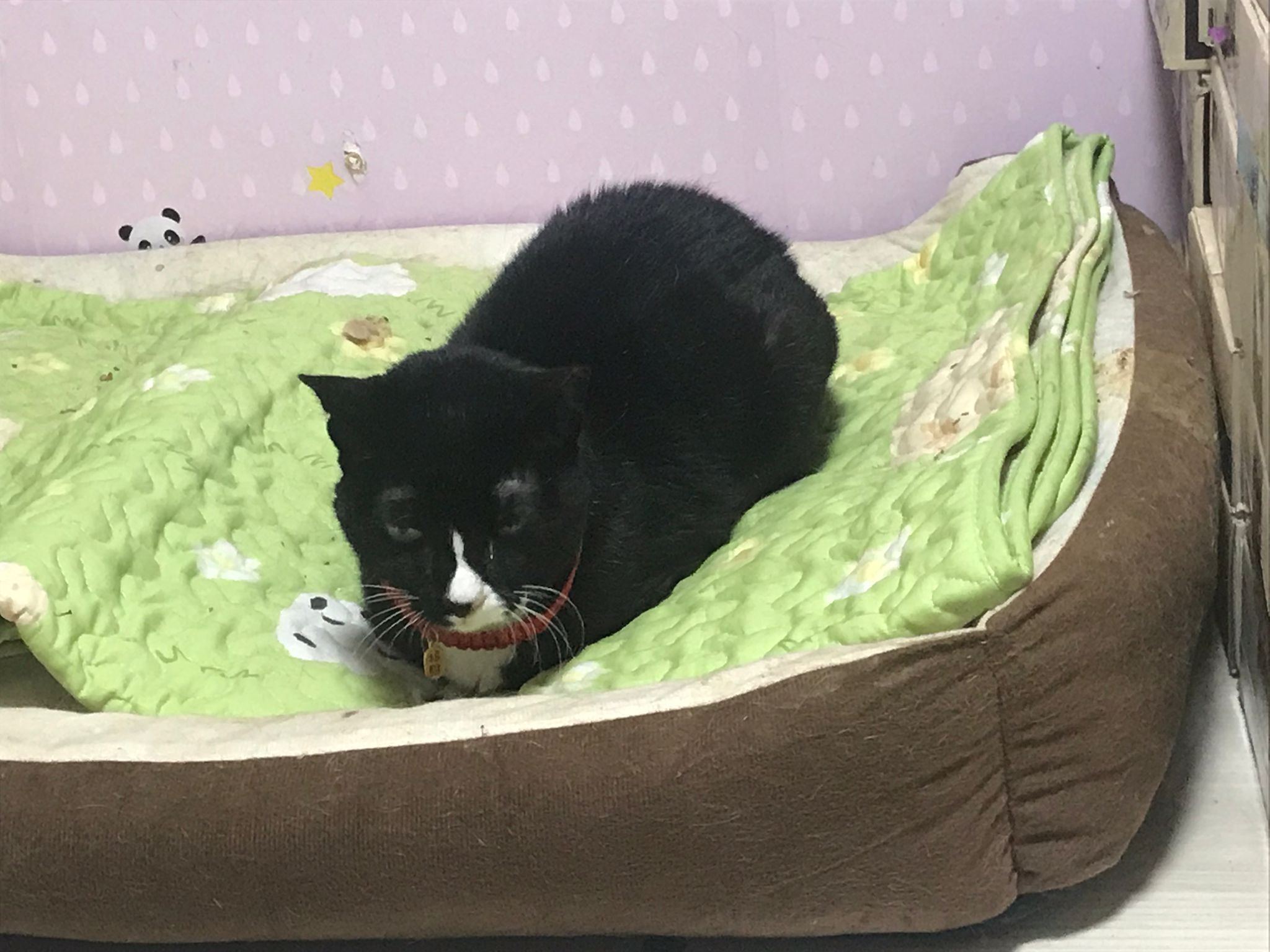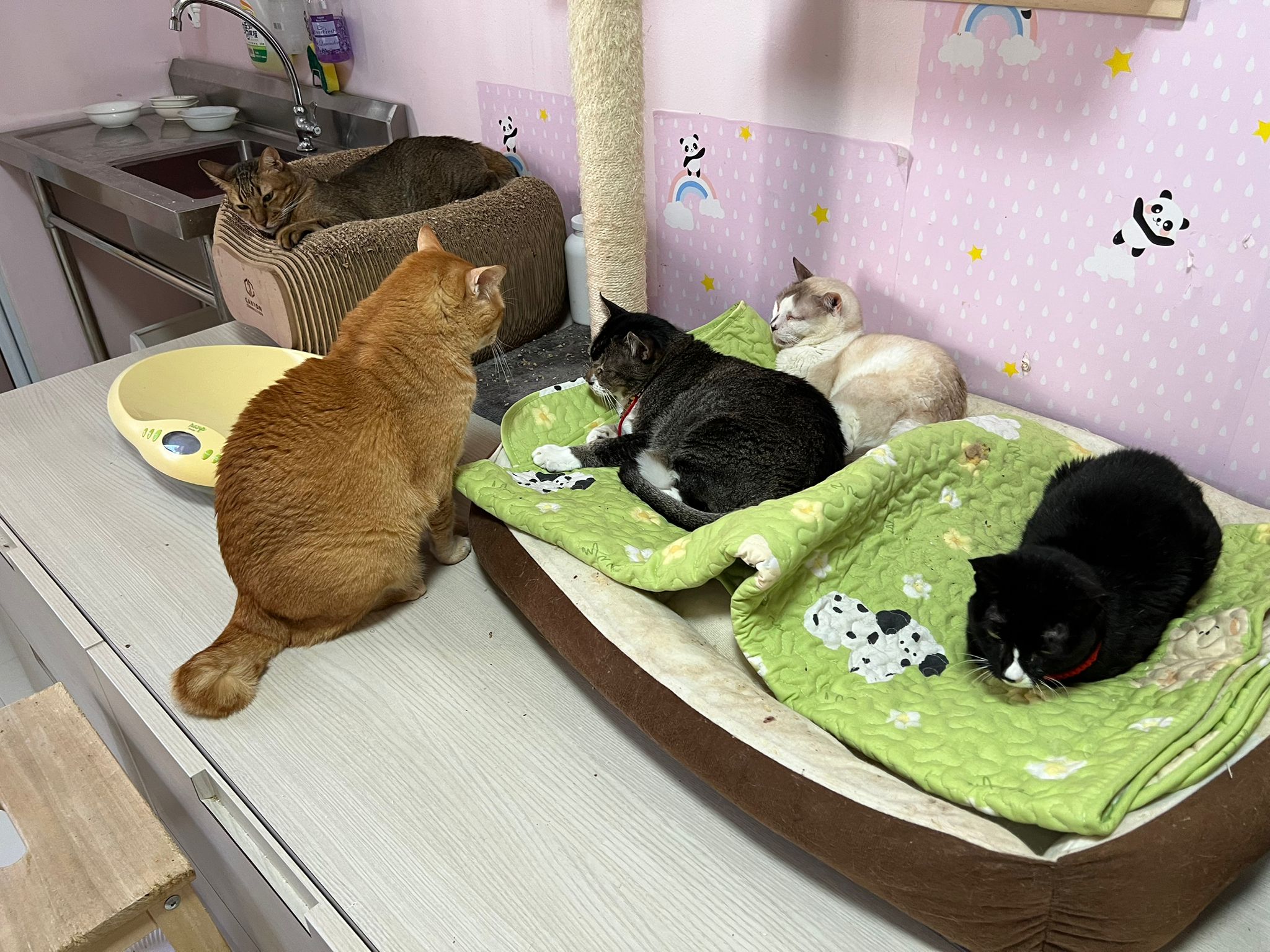 11.00am: I’m back and Mimi r back to upstairs, but her deck is occupied by tao. She stay put at the food corner. The blanket she lie on on the big bed is full of pee, soak, I throw away the whole blanket.