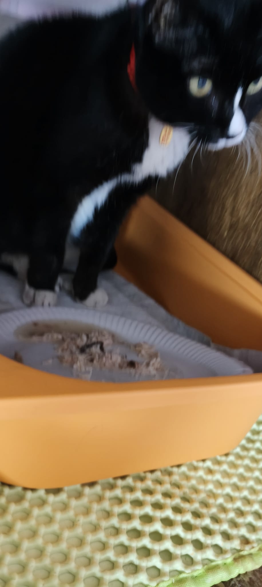 10am: sitting in carrier box, got pee, no poo yet day 03. tuna w salmon cleared, bistro chicken half clear. Kibble confirm got eat. So got eat la.