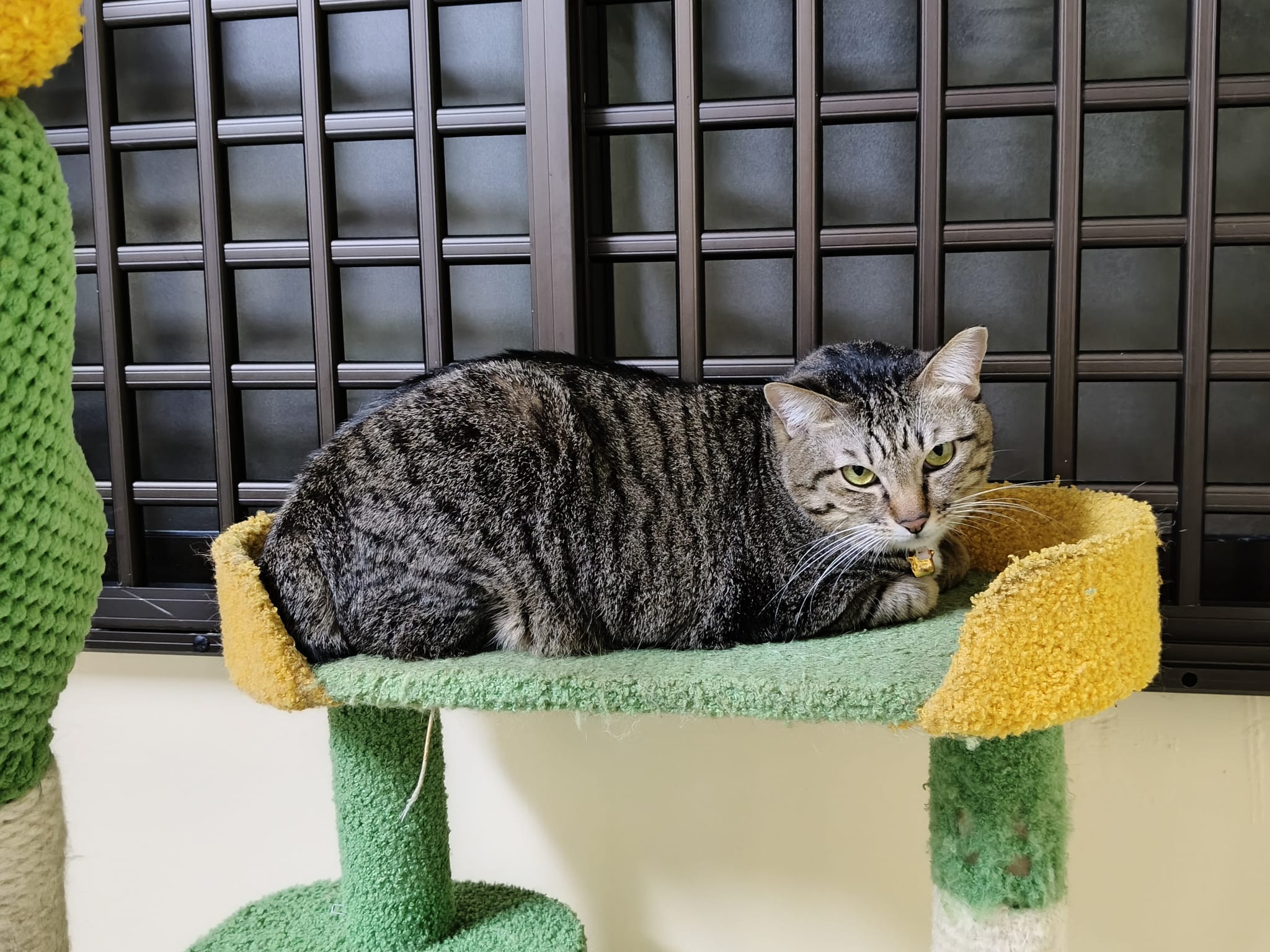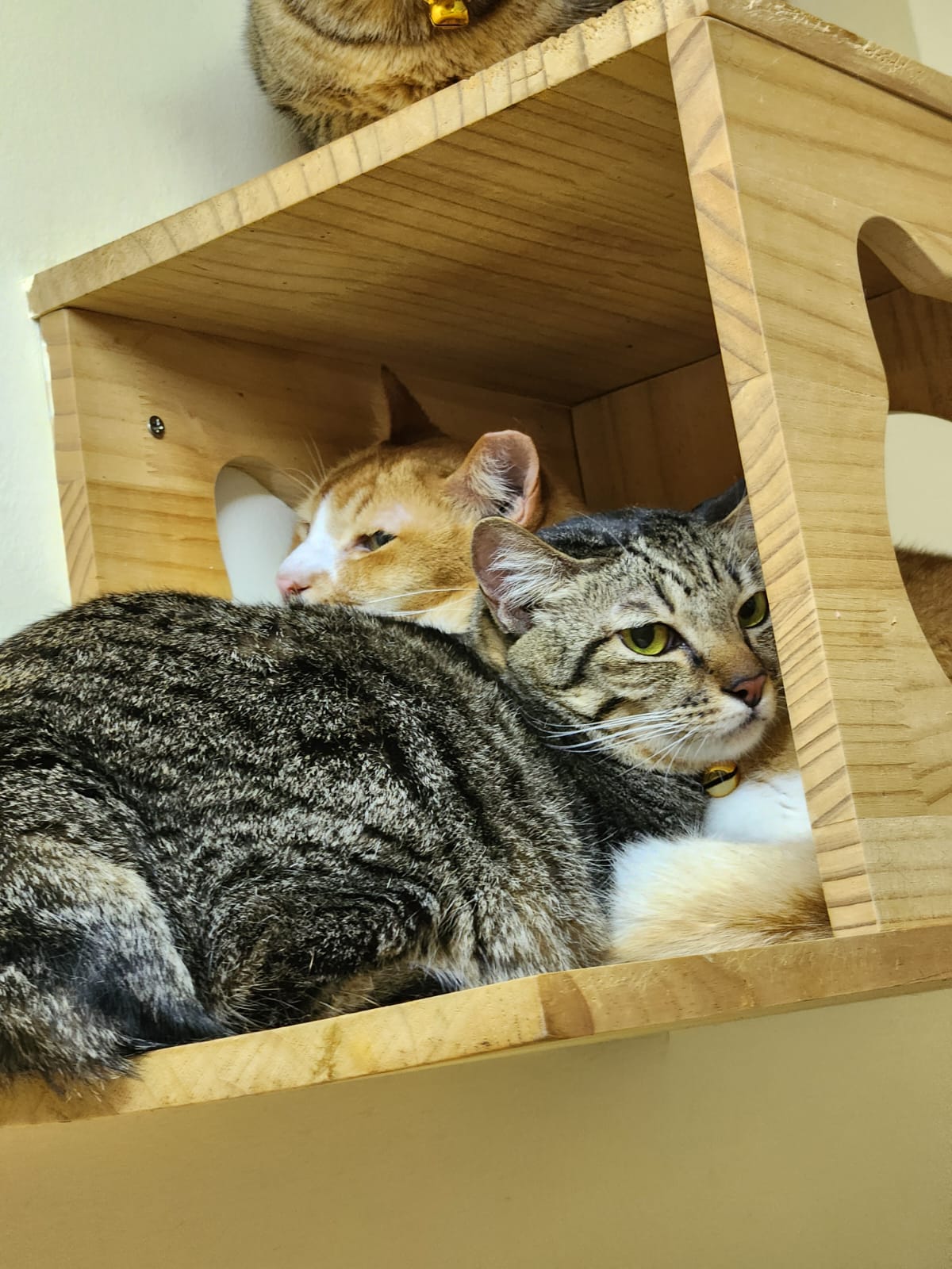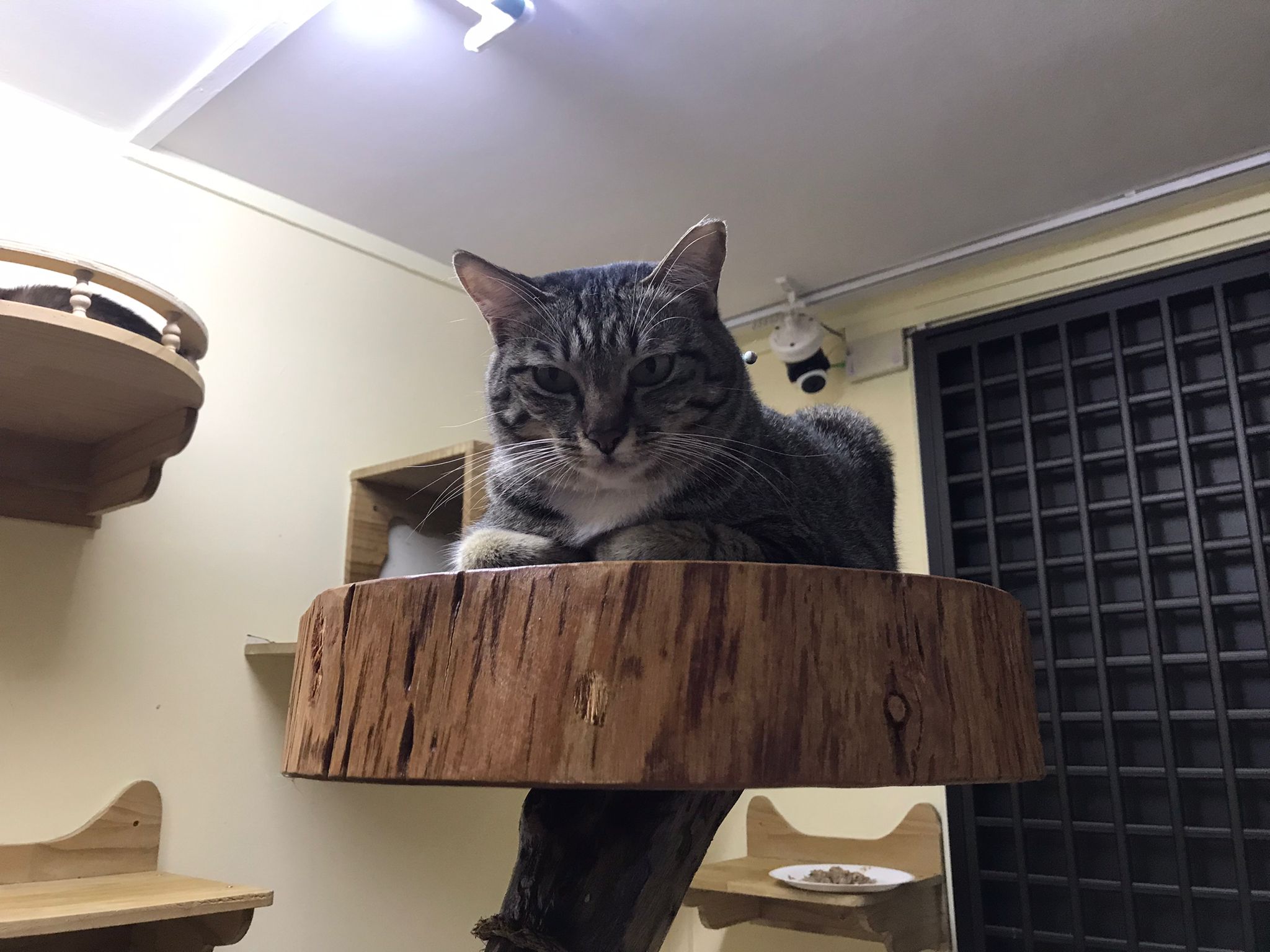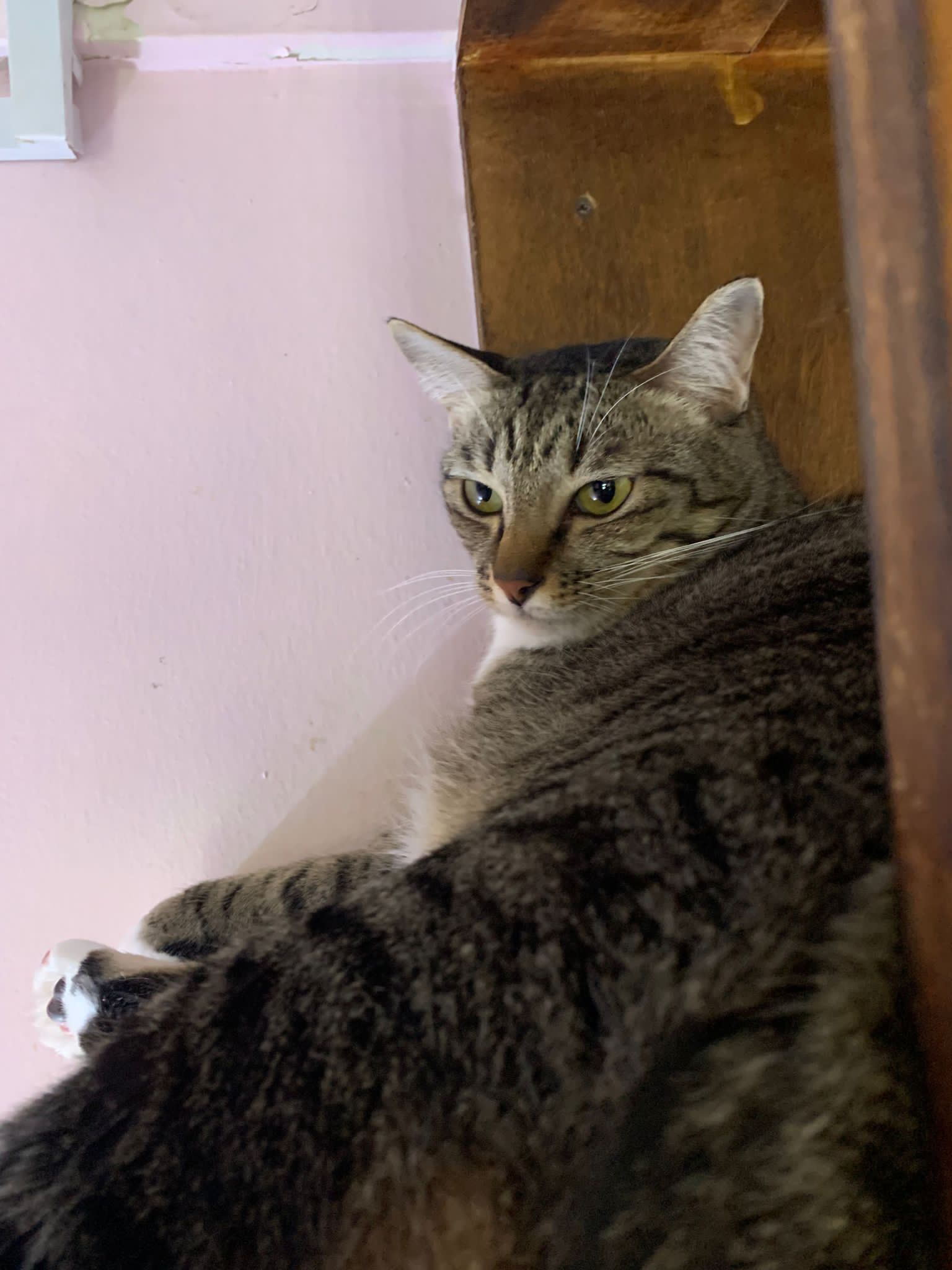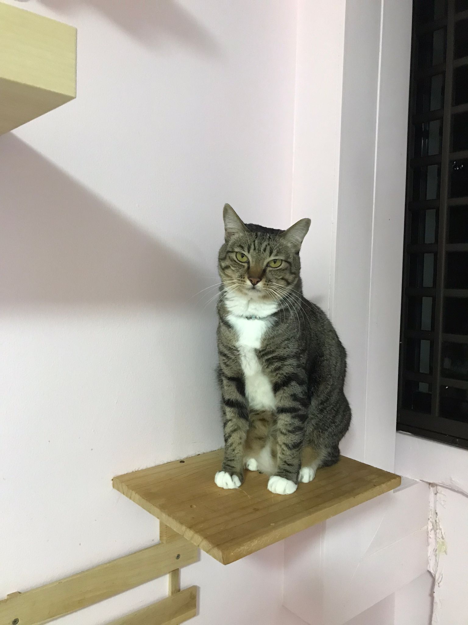 Entered 猫房 w her 2 brothers as 3 fierce kittens. Over the time in 猫房 free roaming and mixing with other cats n making friends, the boys are fine n I can kiss them. Nala still scare of everything, don’t allow touch will jump away. She will find Jack papa for comfy. Got to find a very patient adopter for her.