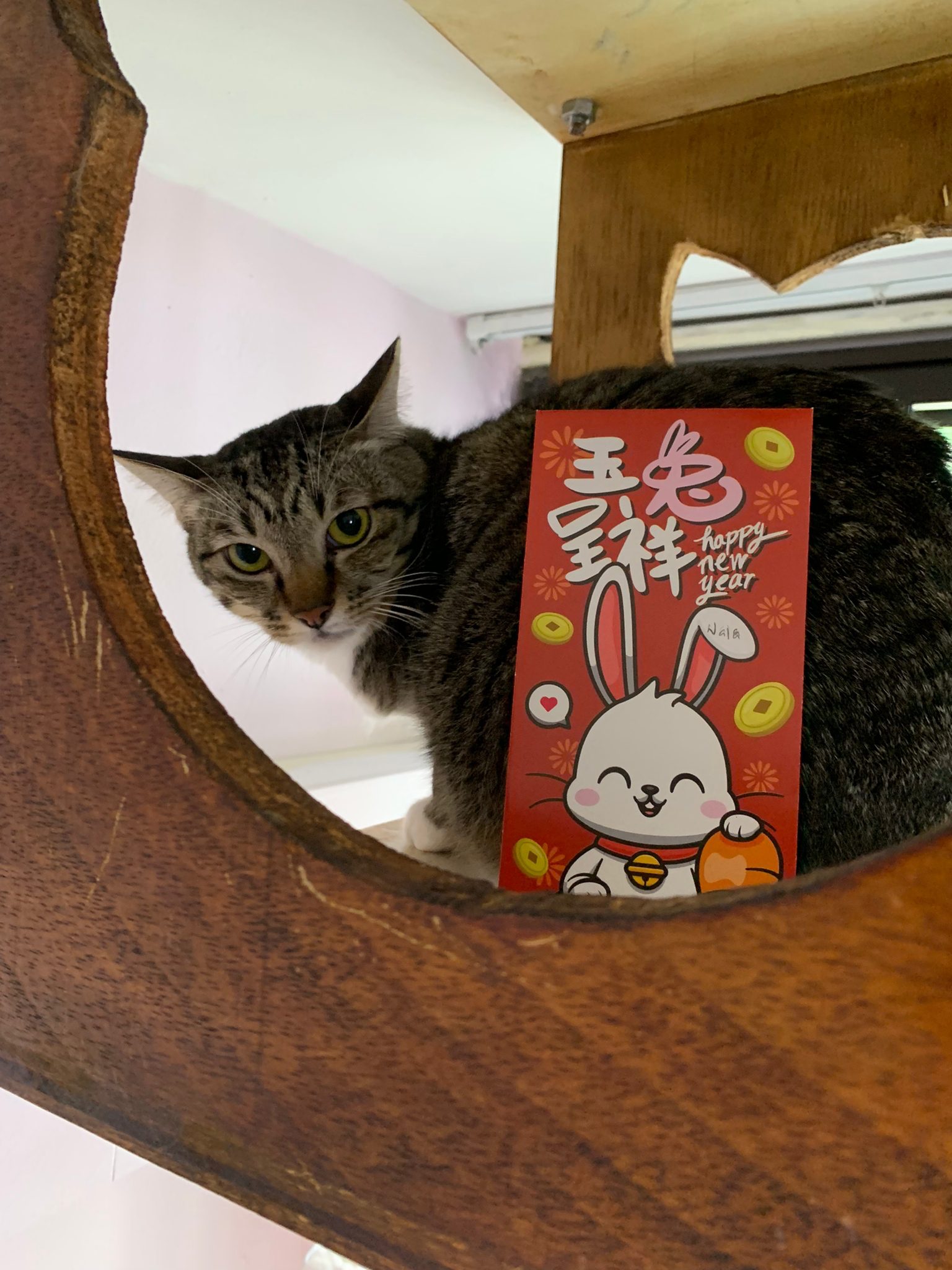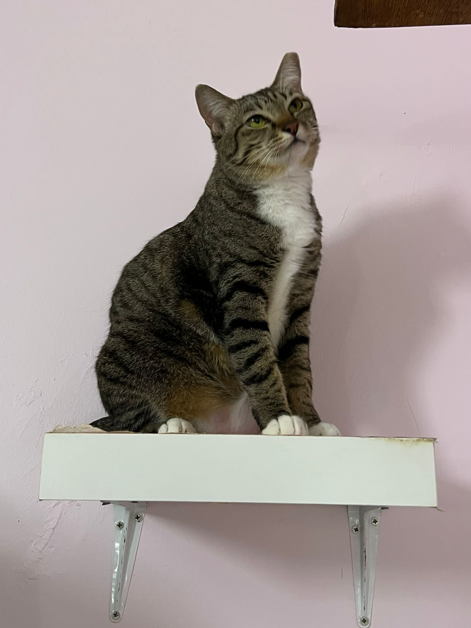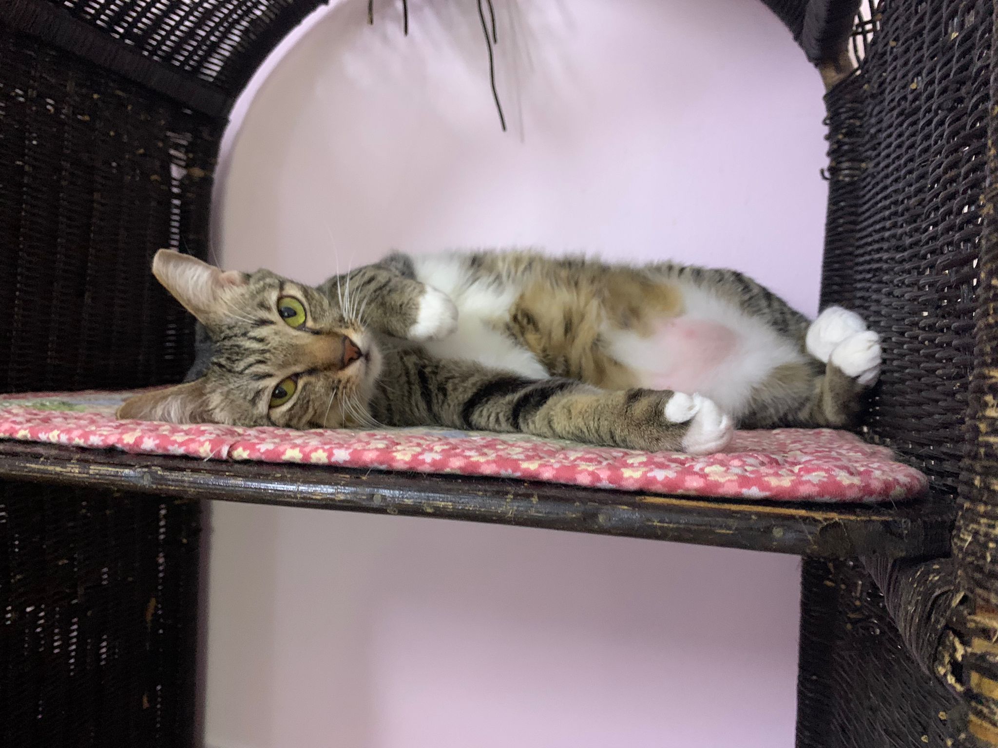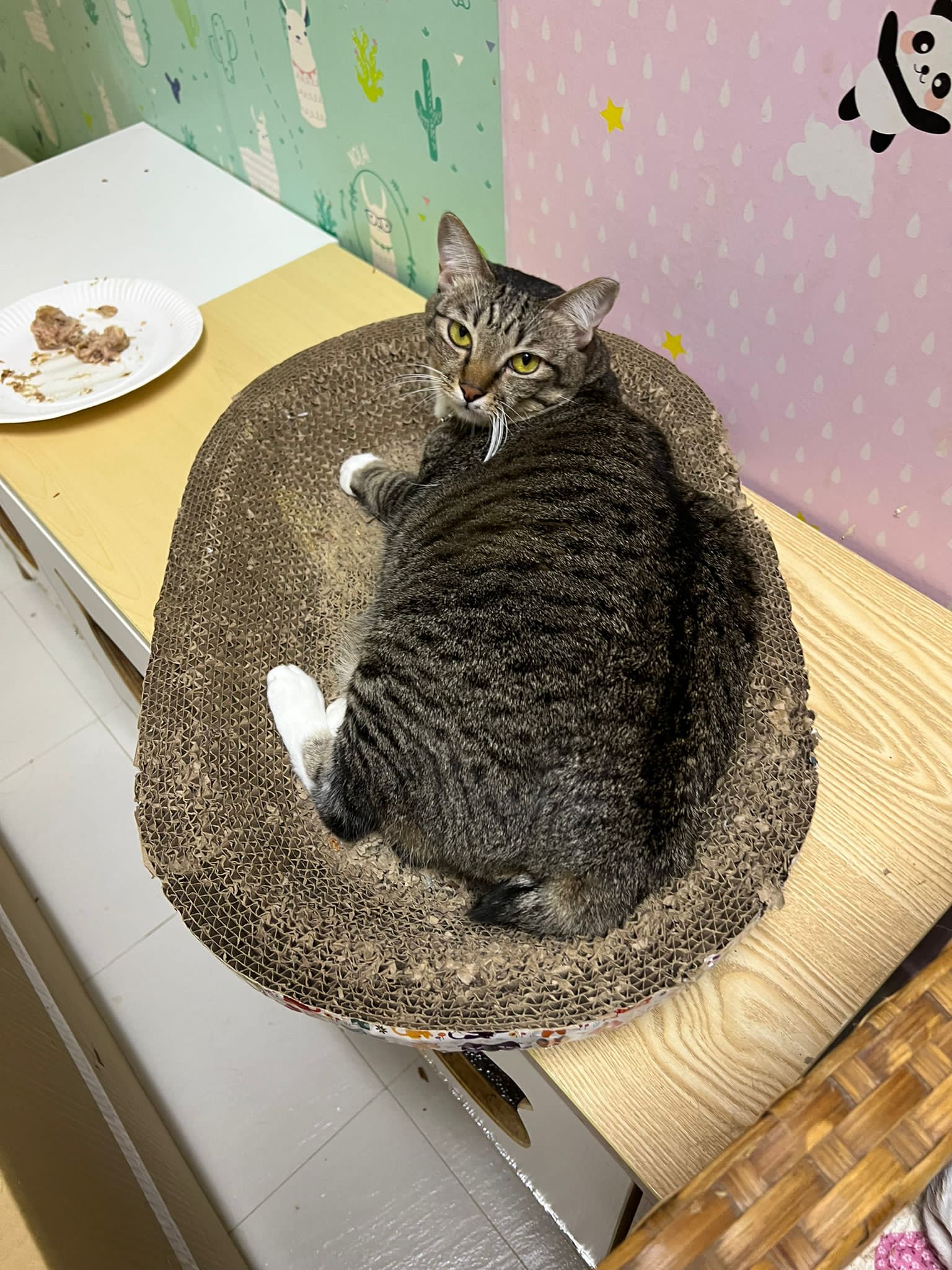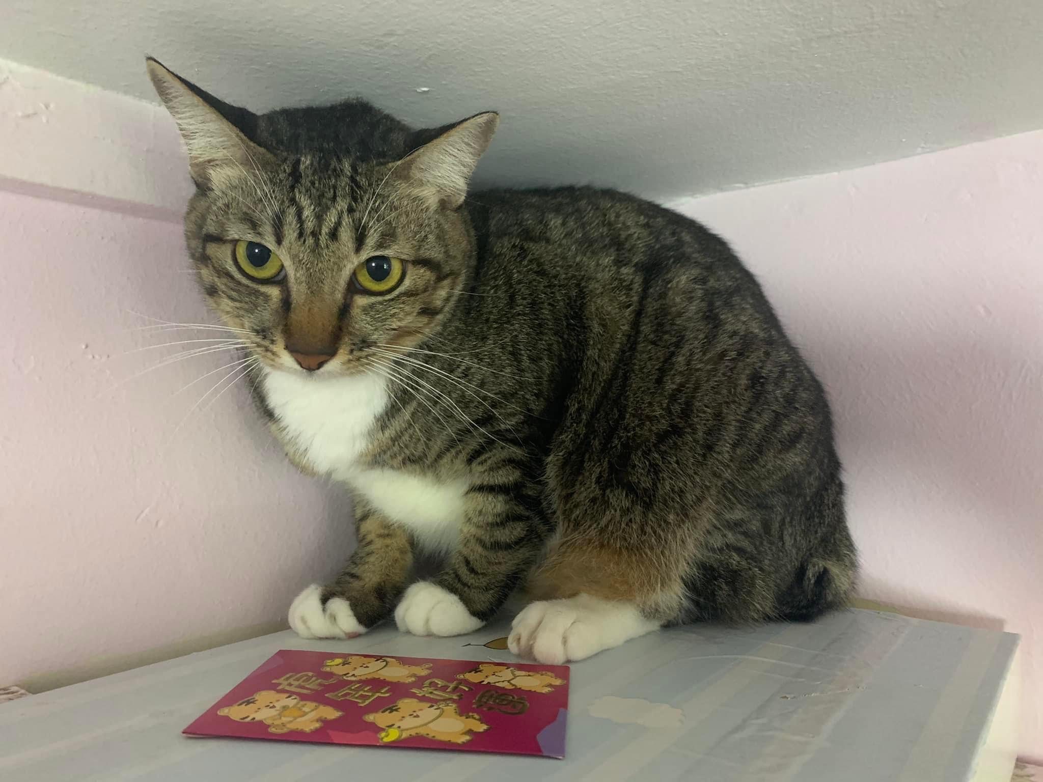Entered 猫房 w her 2 brothers as 3 fierce kittens. Over the time in 猫房 free roaming and mixing with other cats n making friends, the boys are fine n I can kiss them. Nala still scare of everything, don’t allow touch will jump away. She will find Jack papa for comfy. Got to find a very patient adopter for her.