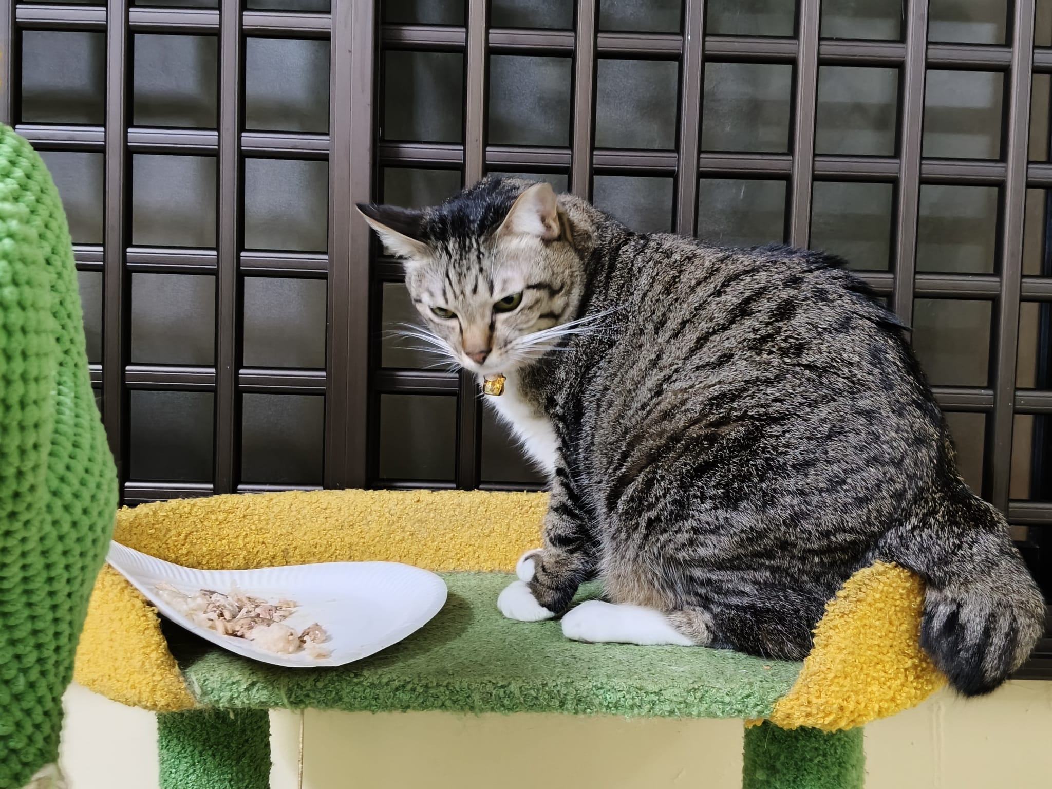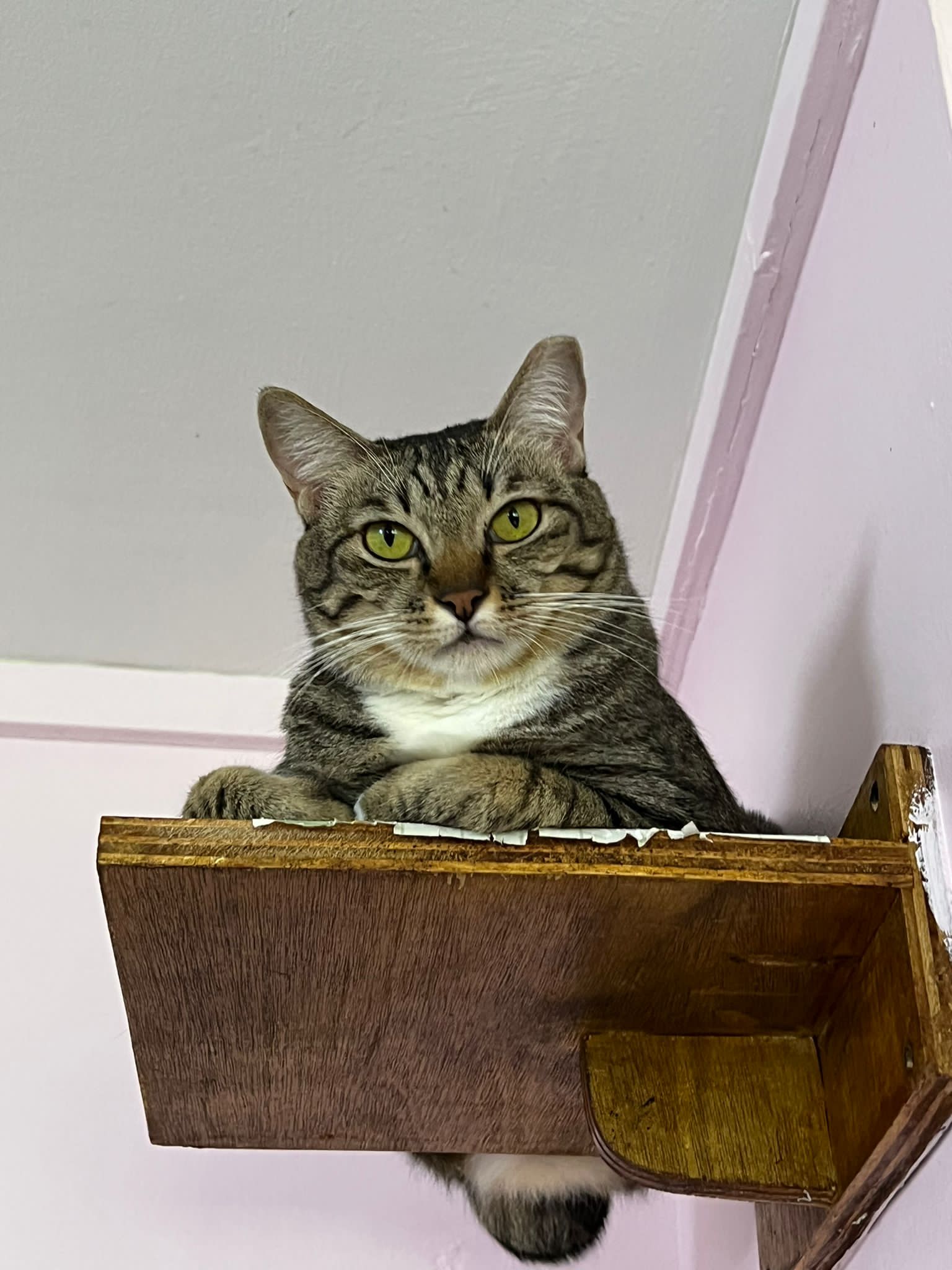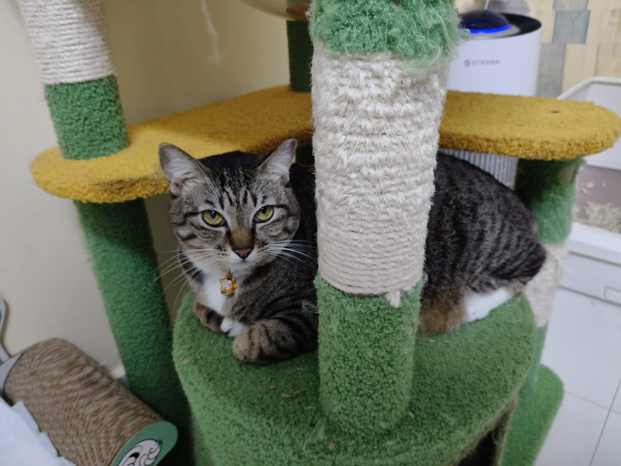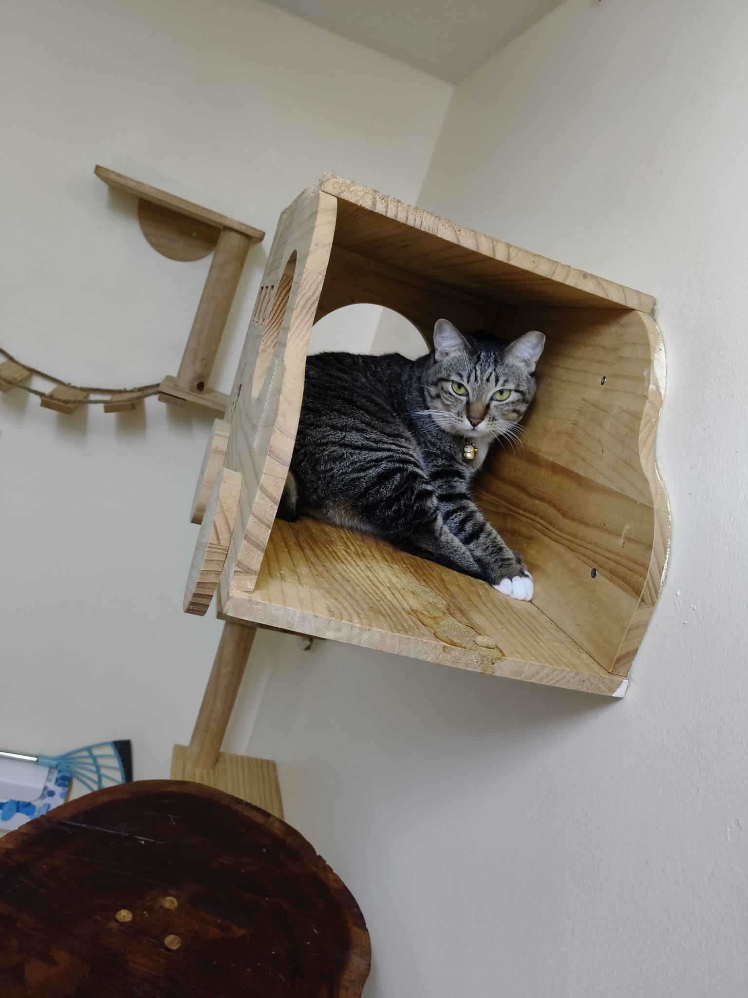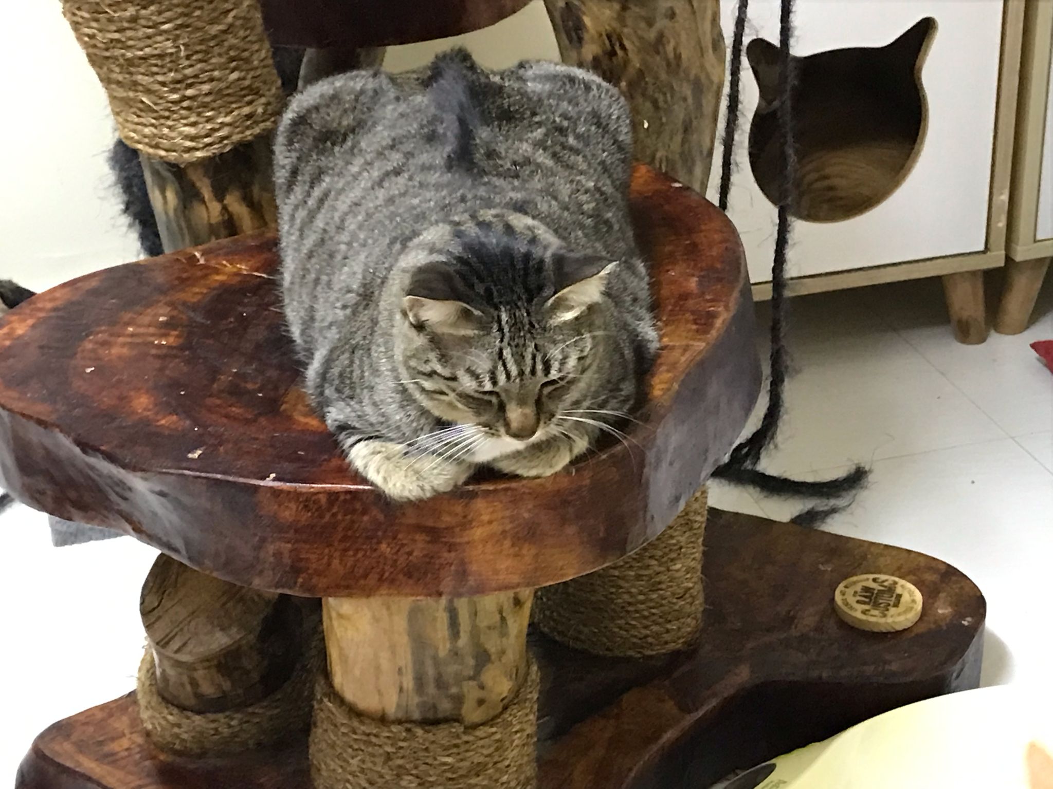 Entered 猫房 w her 2 brothers as 3 fierce kittens. Over the time in 猫房 free roaming and mixing with other cats n making friends, the boys are fine n I can kiss them. Nala still scare of everything, don’t allow touch will jump away. She will find Jack papa for comfy. Got to find a very patient adopter for her.