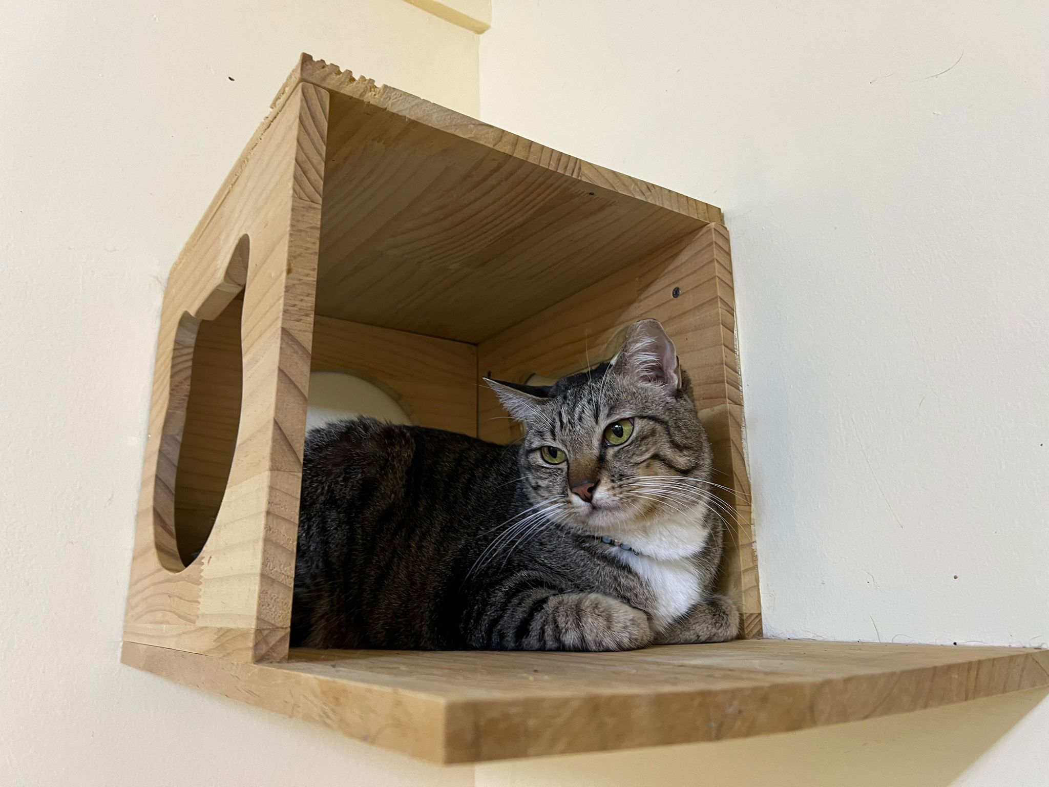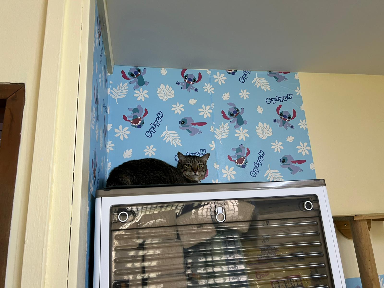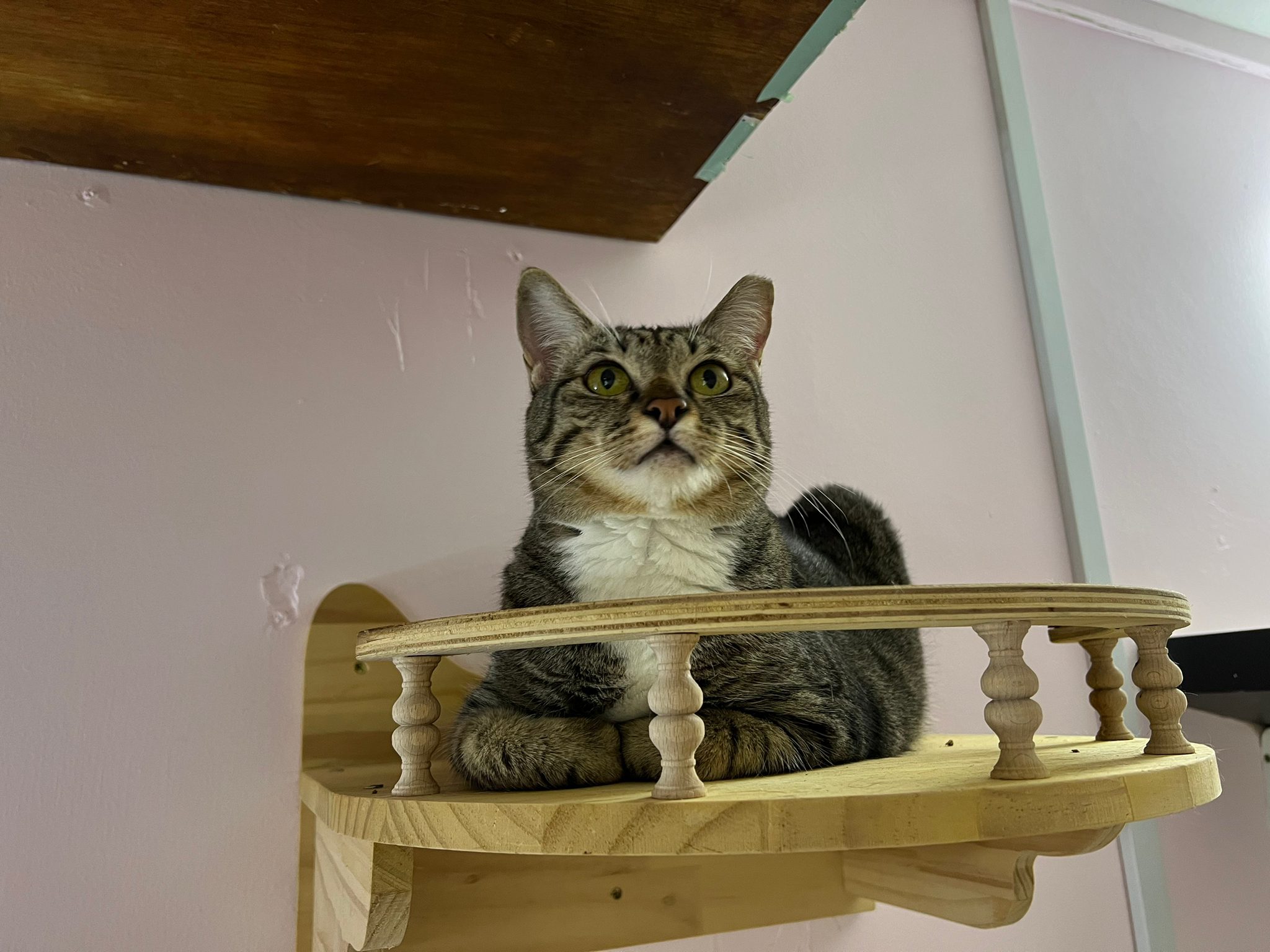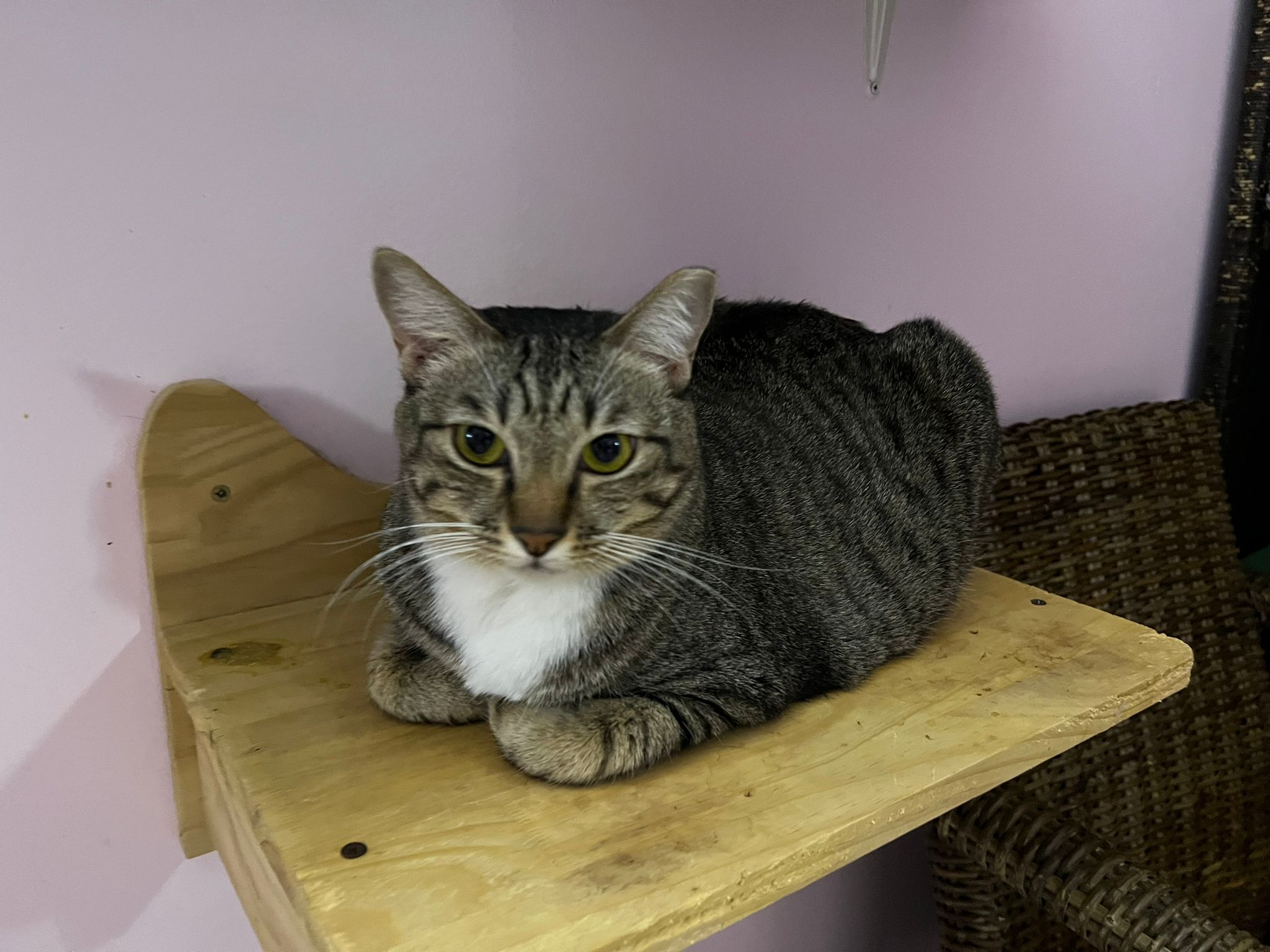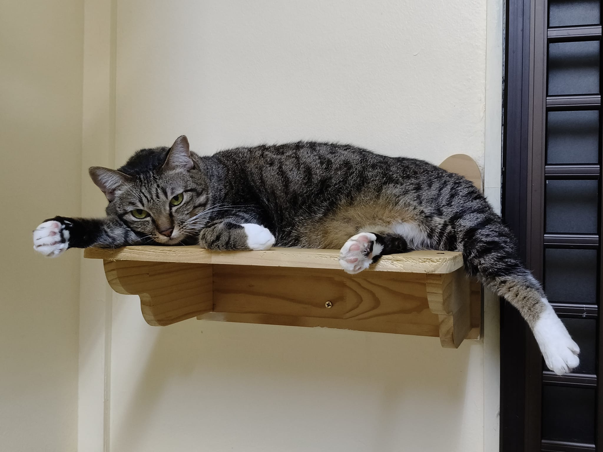 Entered 猫房 w her 2 brothers as 3 fierce kittens. Over the time in 猫房 free roaming and mixing with other cats n making friends, the boys are fine n I can kiss them. Nala still scare of everything, don’t allow touch will jump away. She will find Jack papa for comfy. Got to find a very patient adopter for her.