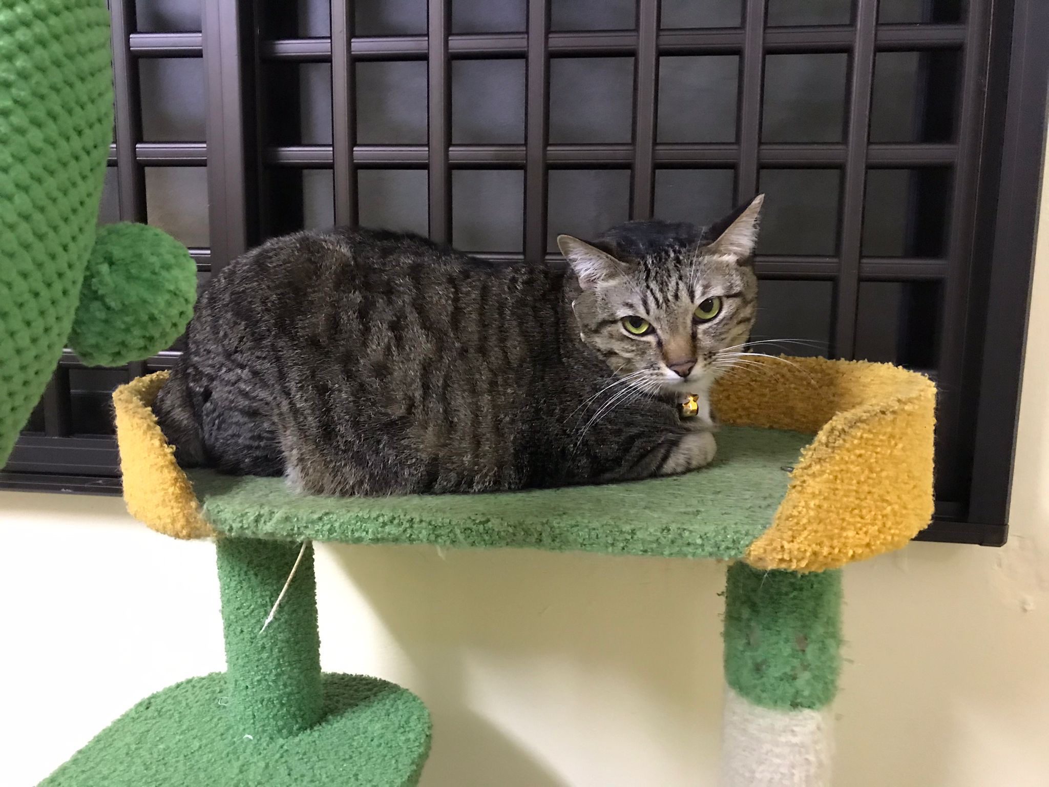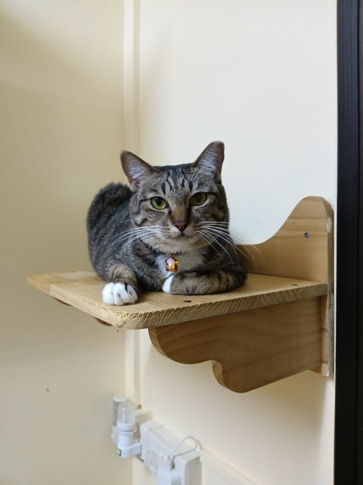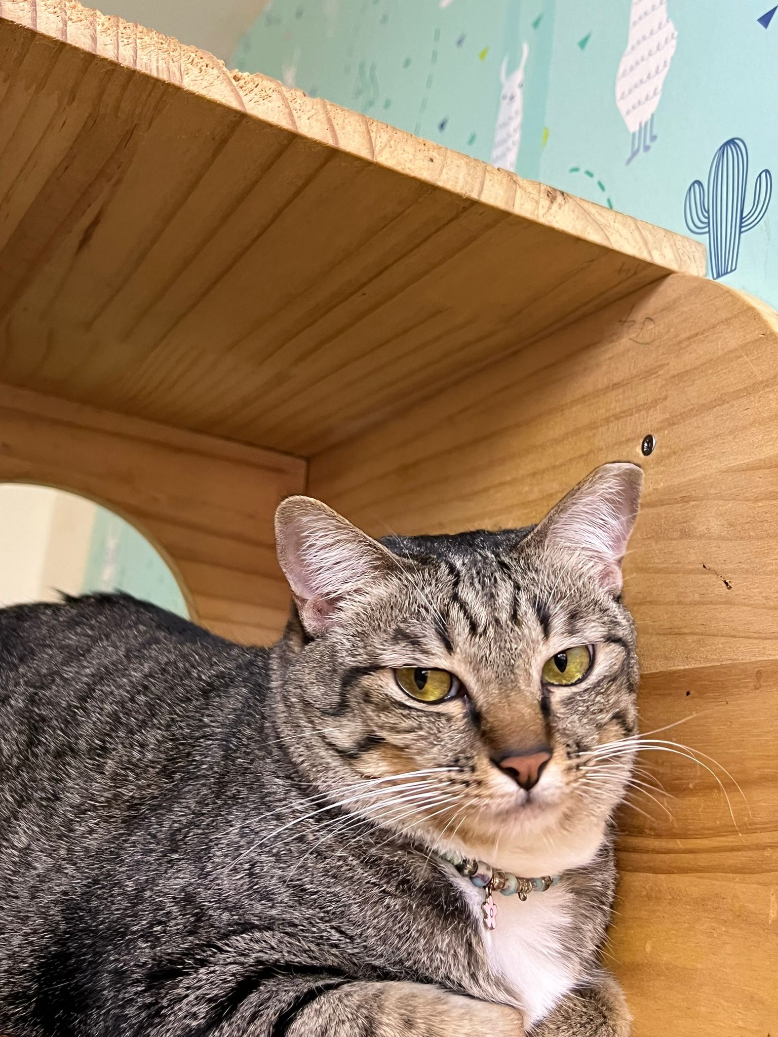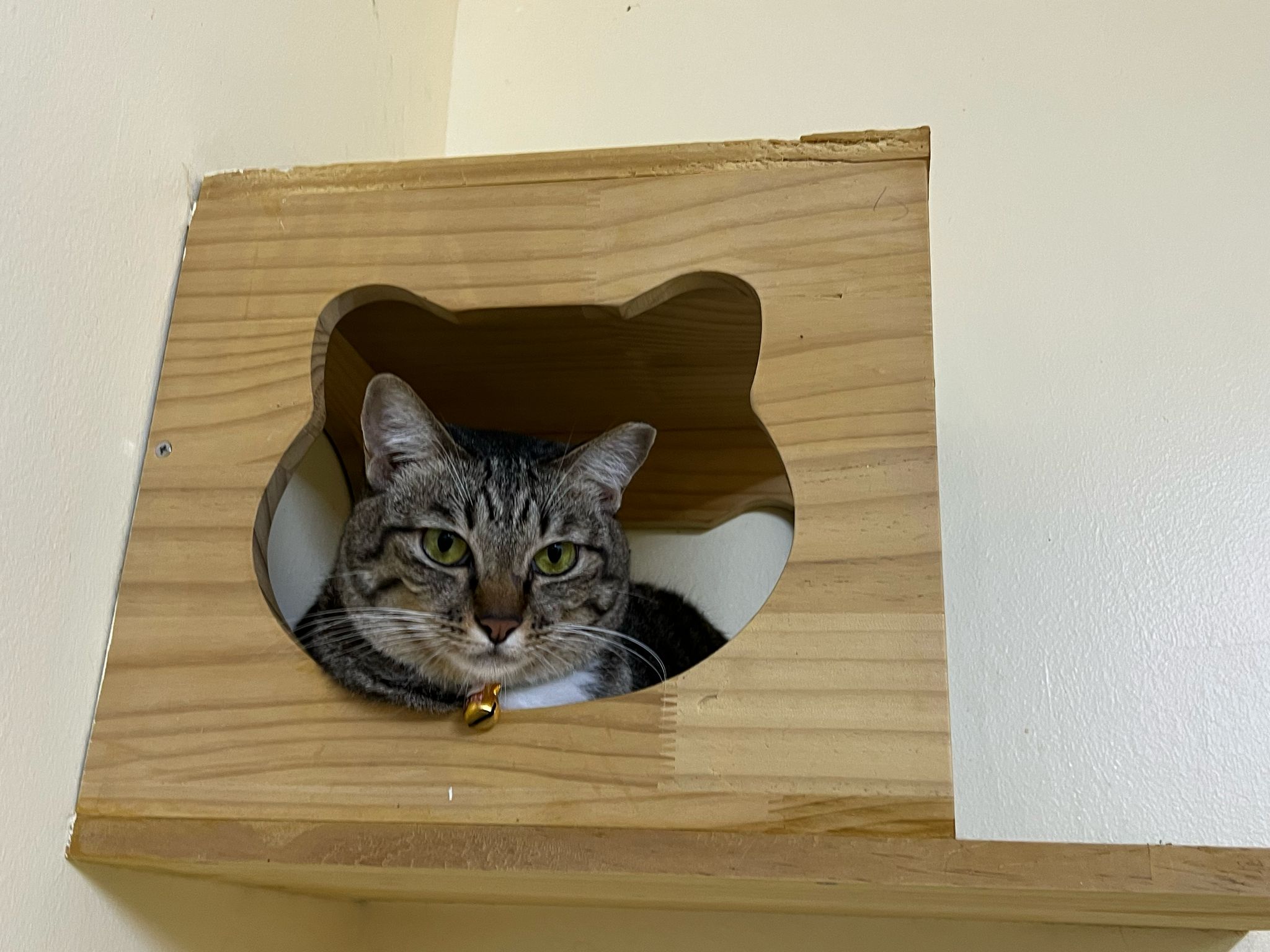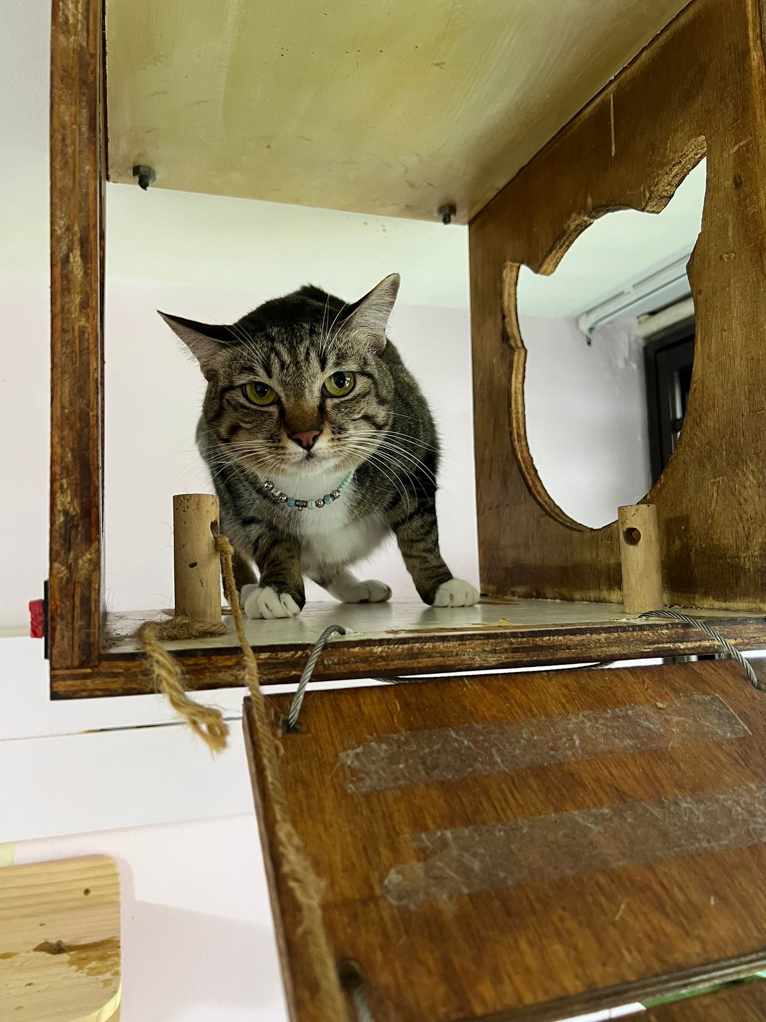 Entered 猫房 w her 2 brothers as 3 fierce kittens. Over the time in 猫房 free roaming and mixing with other cats n making friends, the boys are fine n I can kiss them. Nala still scare of everything, don’t allow touch will jump away. She will find Jack papa for comfy. Got to find a very patient adopter for her.