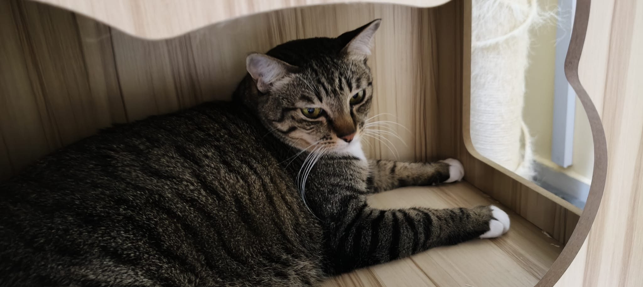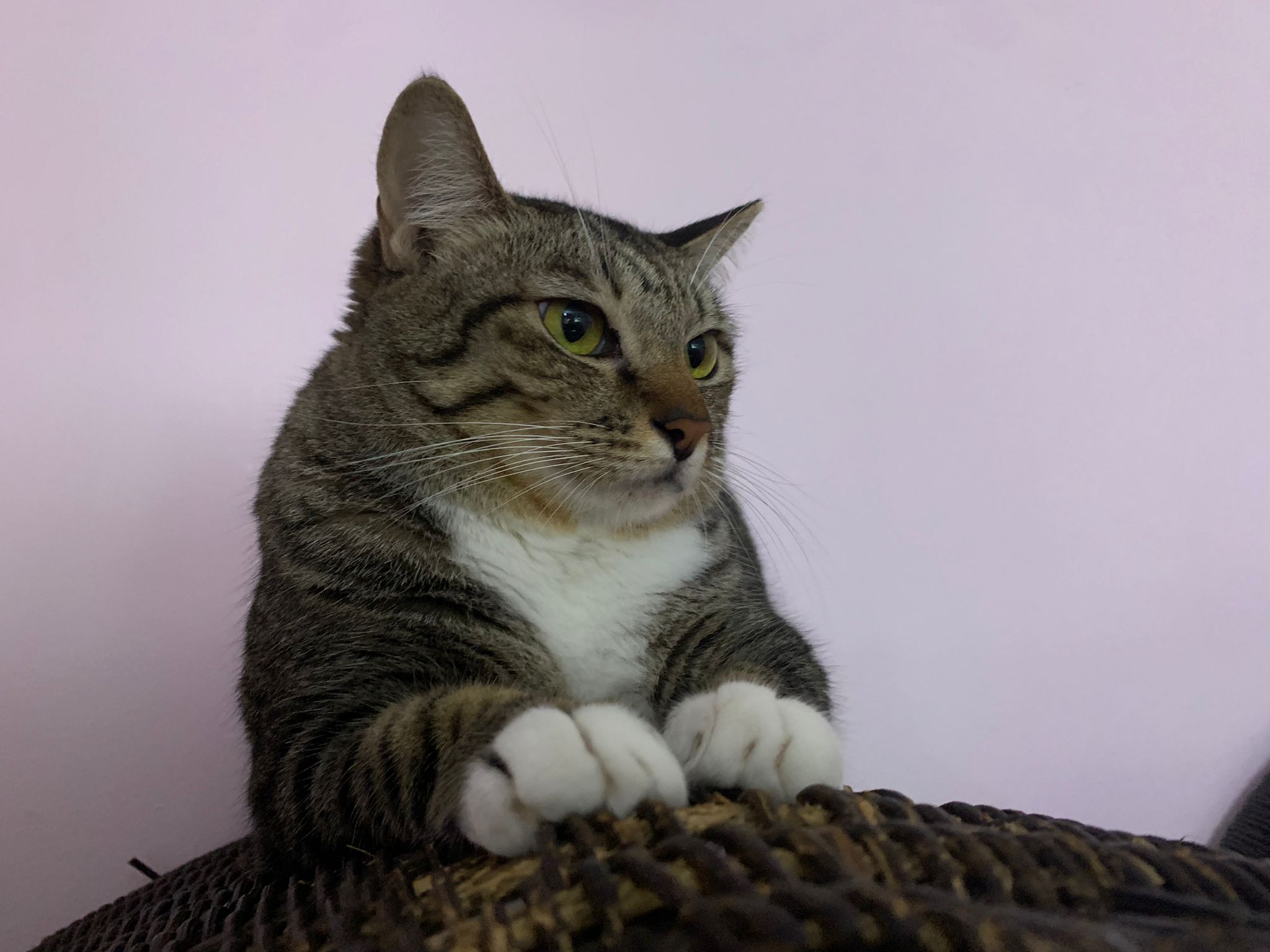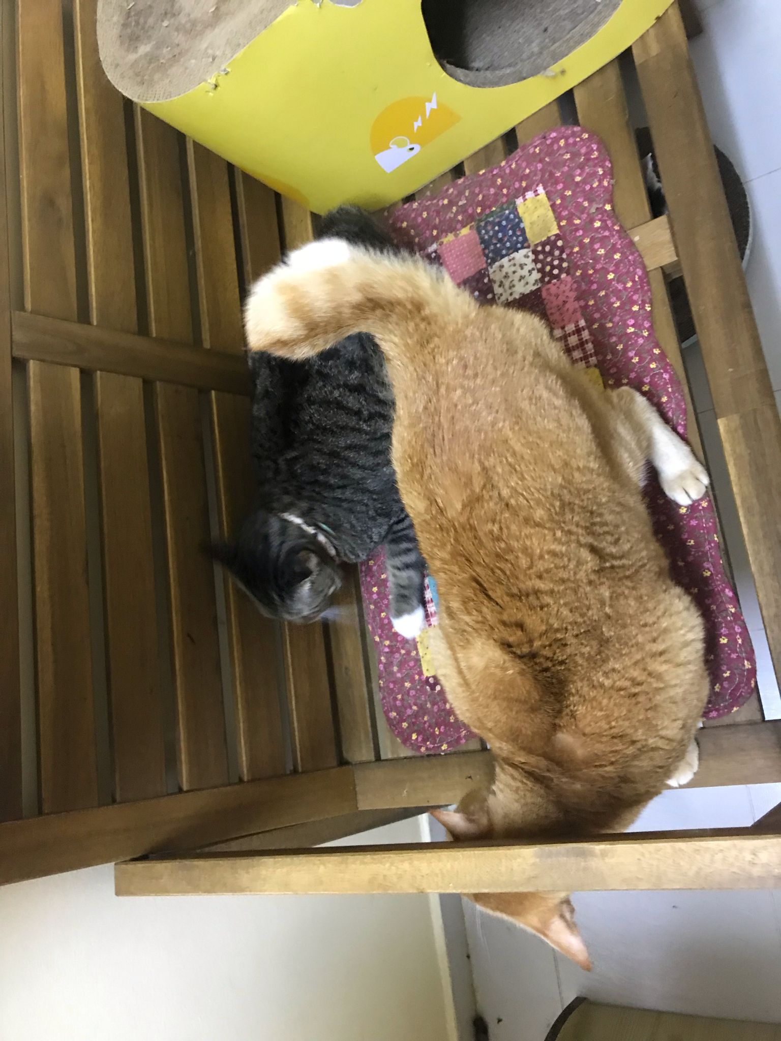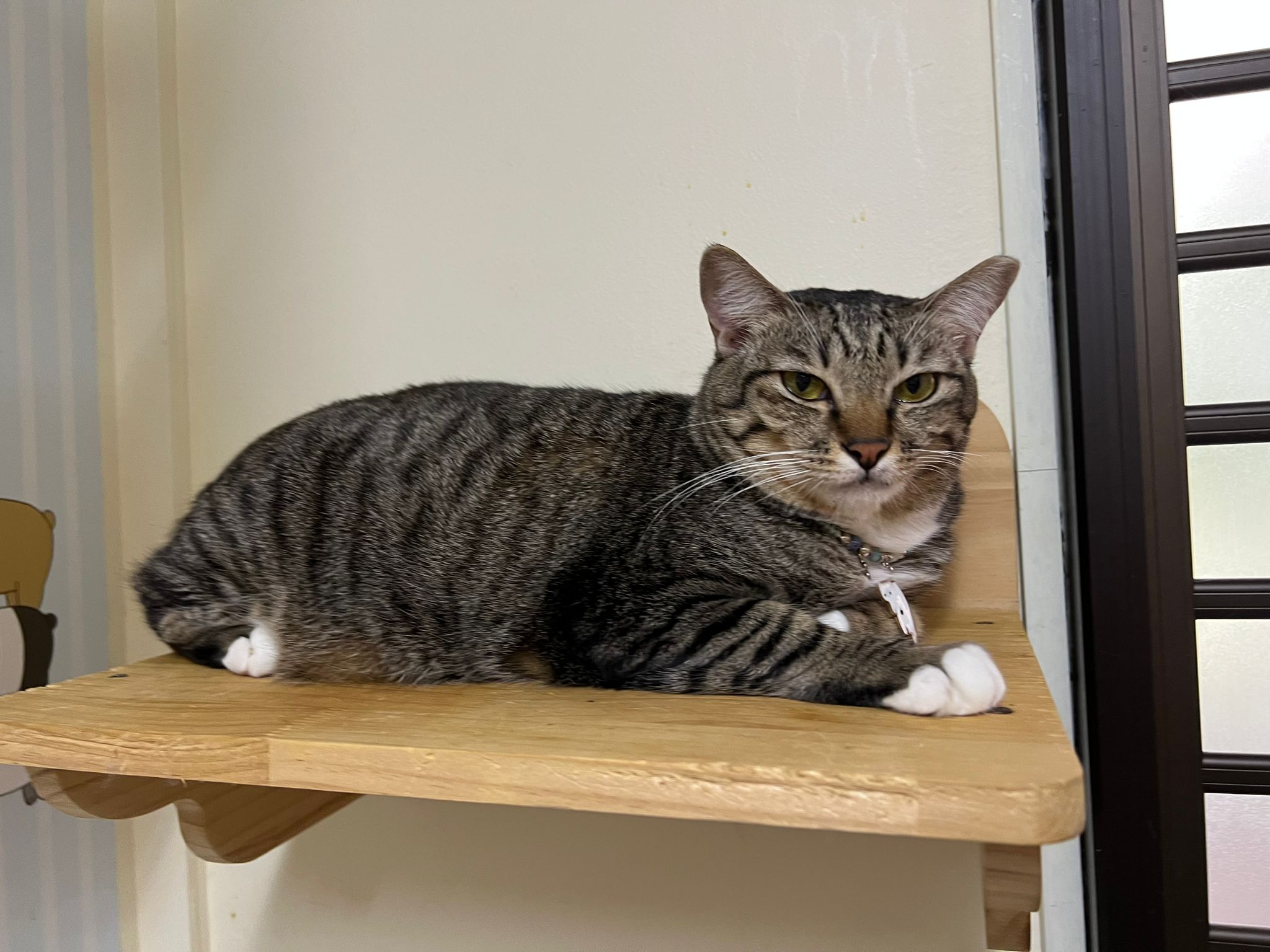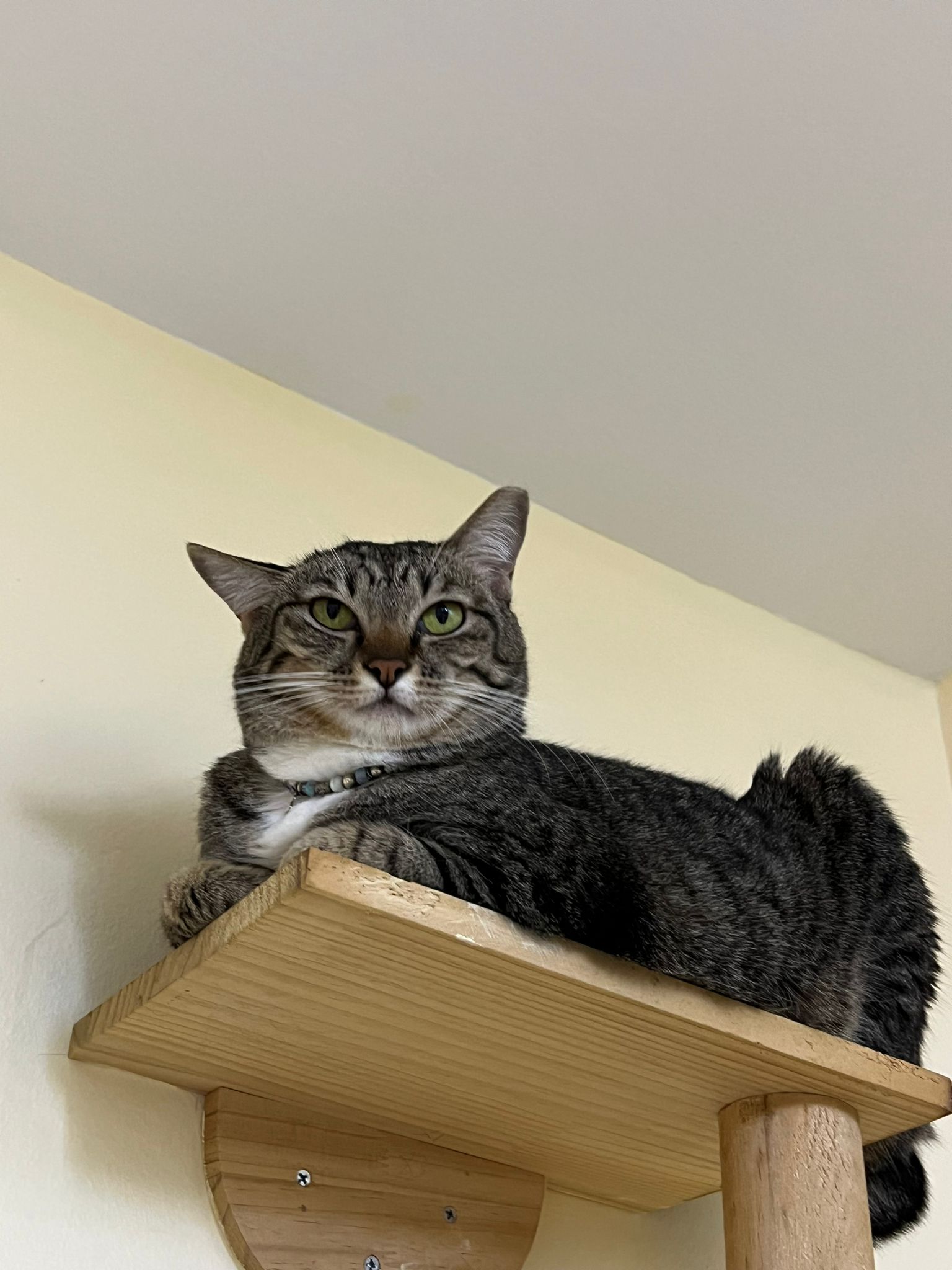 Entered 猫房 w her 2 brothers as 3 fierce kittens. Over the time in 猫房 free roaming and mixing with other cats n making friends, the boys are fine n I can kiss them. Nala still scare of everything, don’t allow touch will jump away. She will find Jack papa for comfy. Got to find a very patient adopter for her.