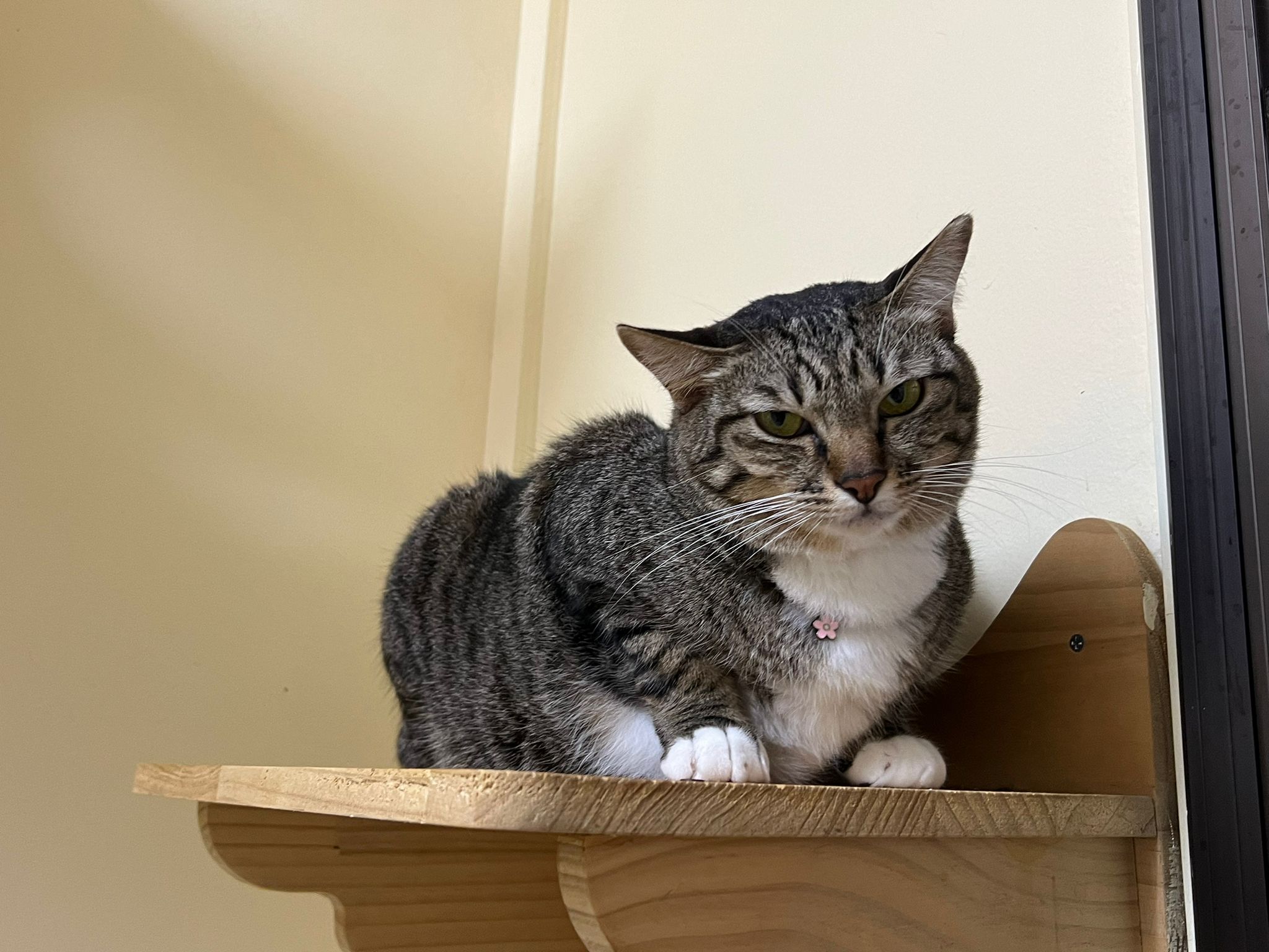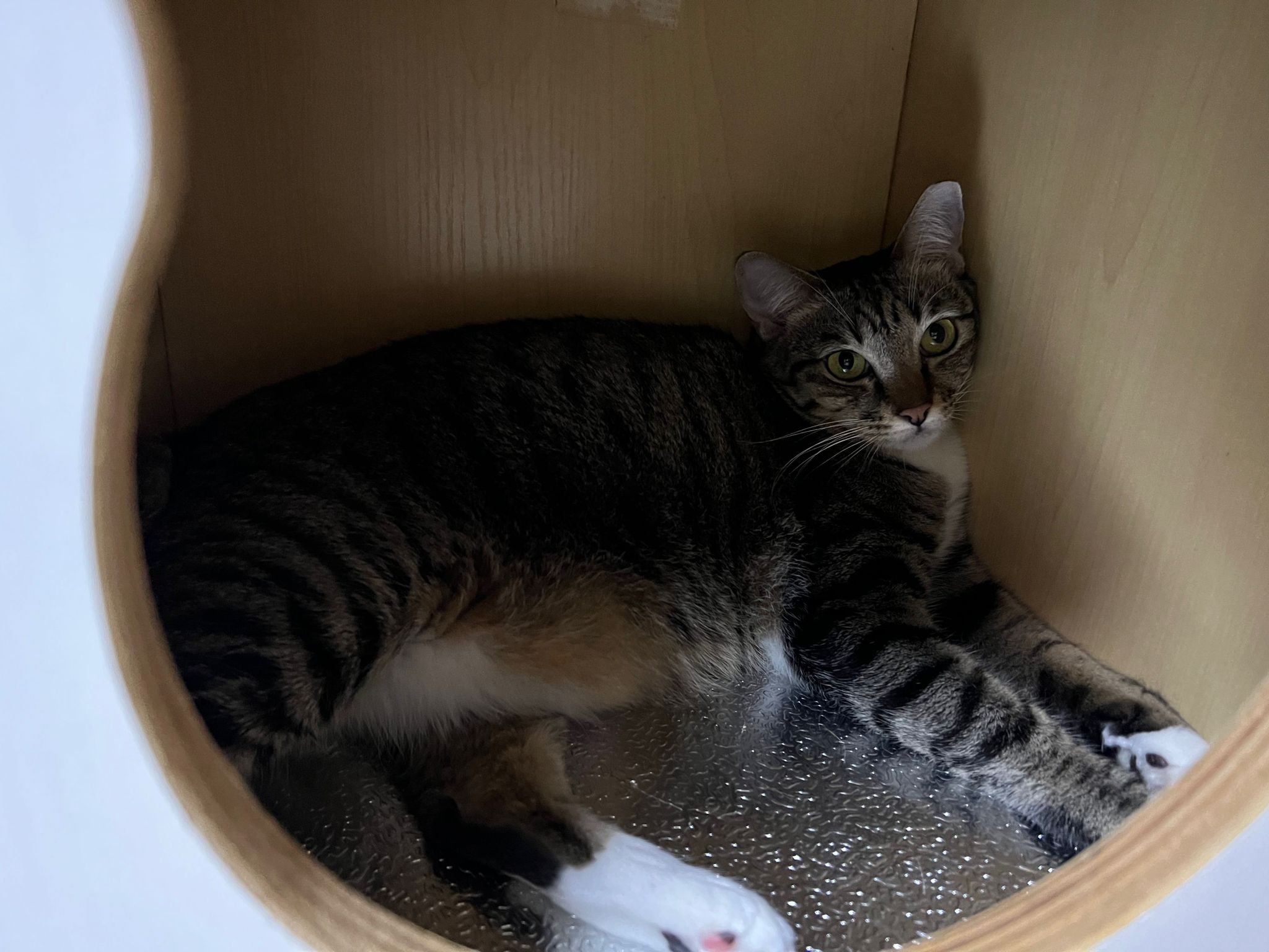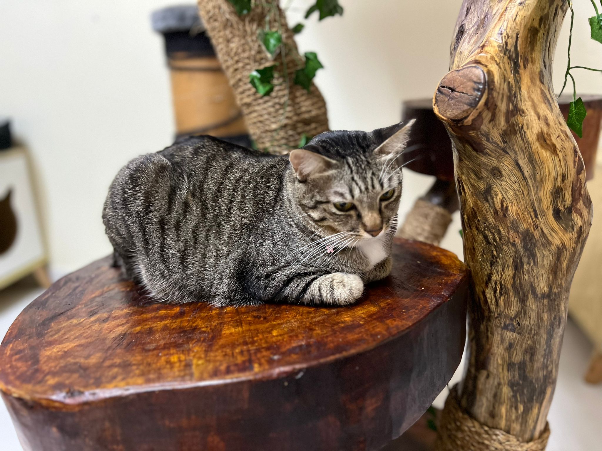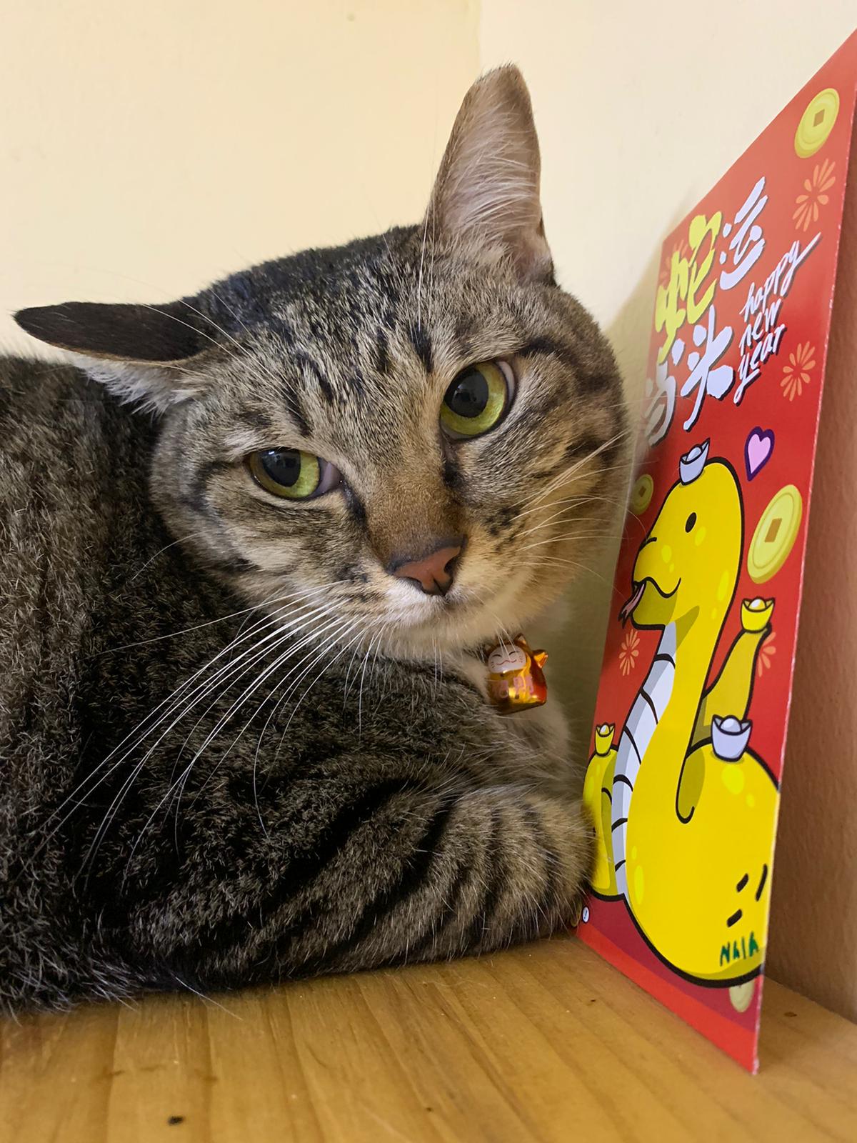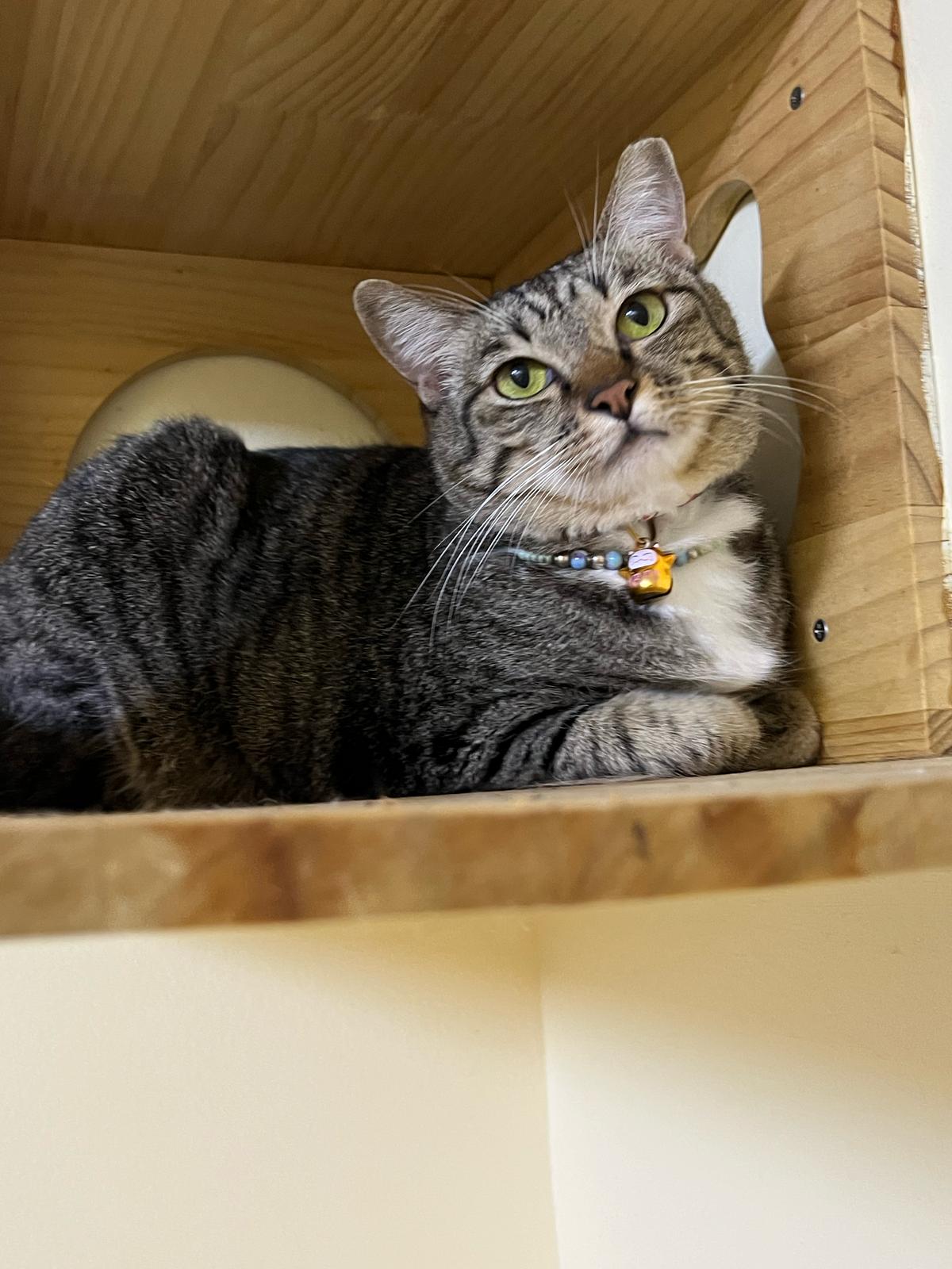 Entered 猫房 w her 2 brothers as 3 fierce kittens. Over the time in 猫房 free roaming and mixing with other cats n making friends, the boys are fine n I can kiss them. Nala still scare of everything, don’t allow touch will jump away. She will find Jack papa for comfy. Got to find a very patient adopter for her.