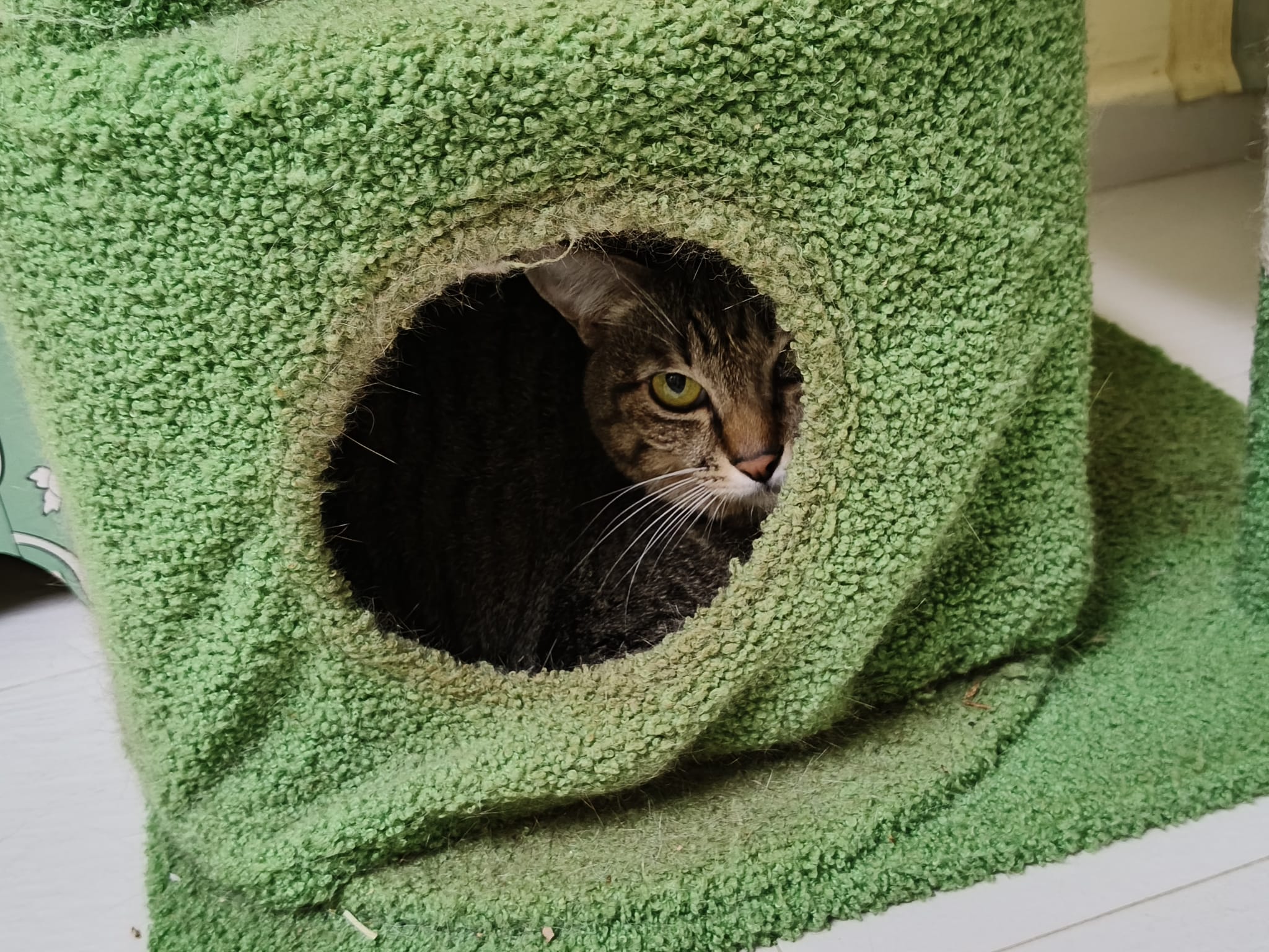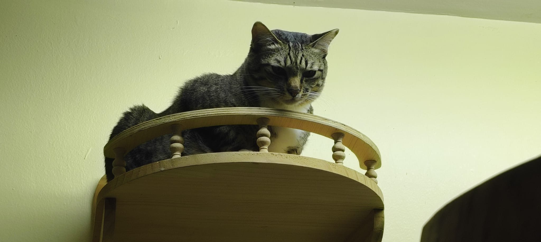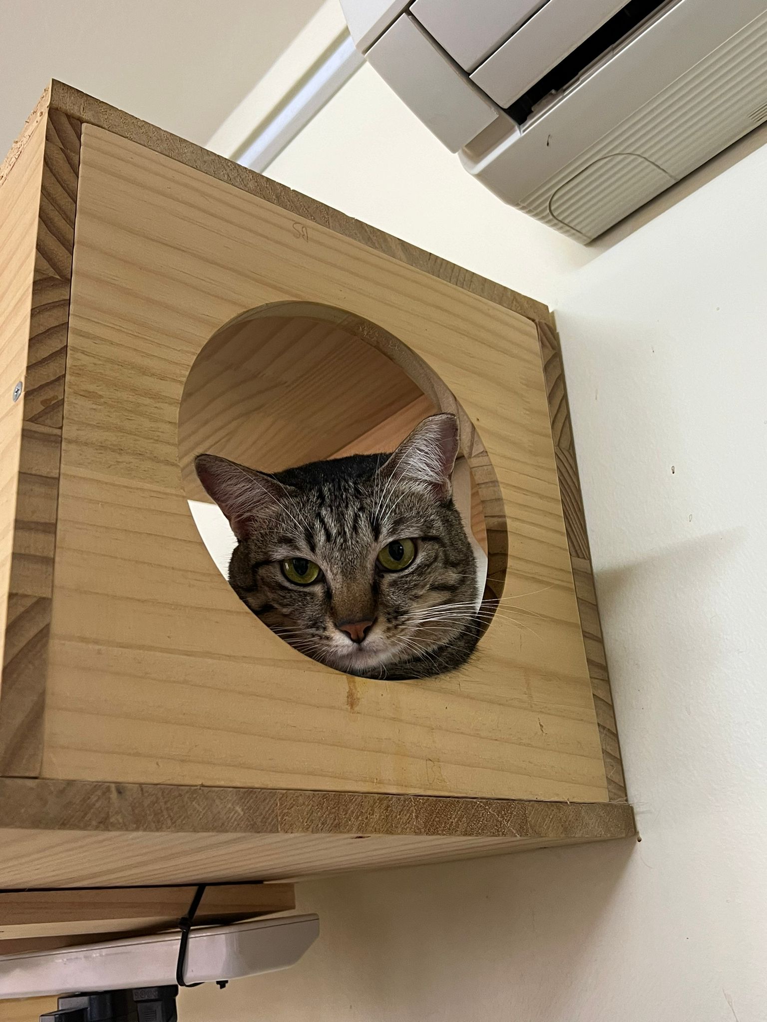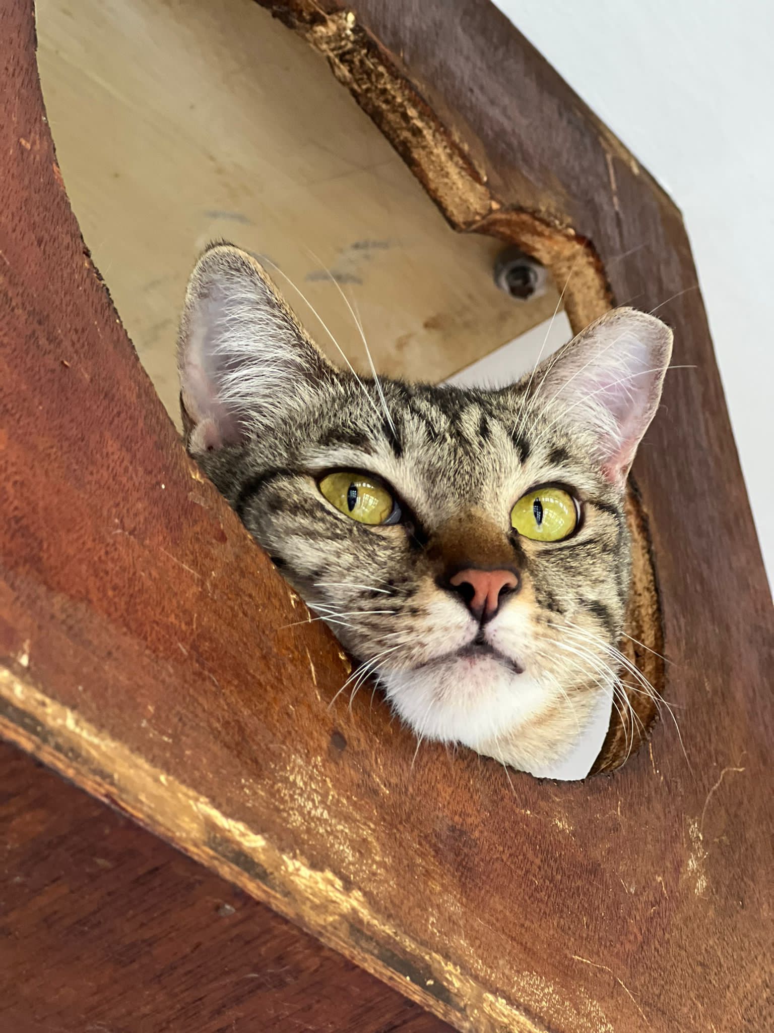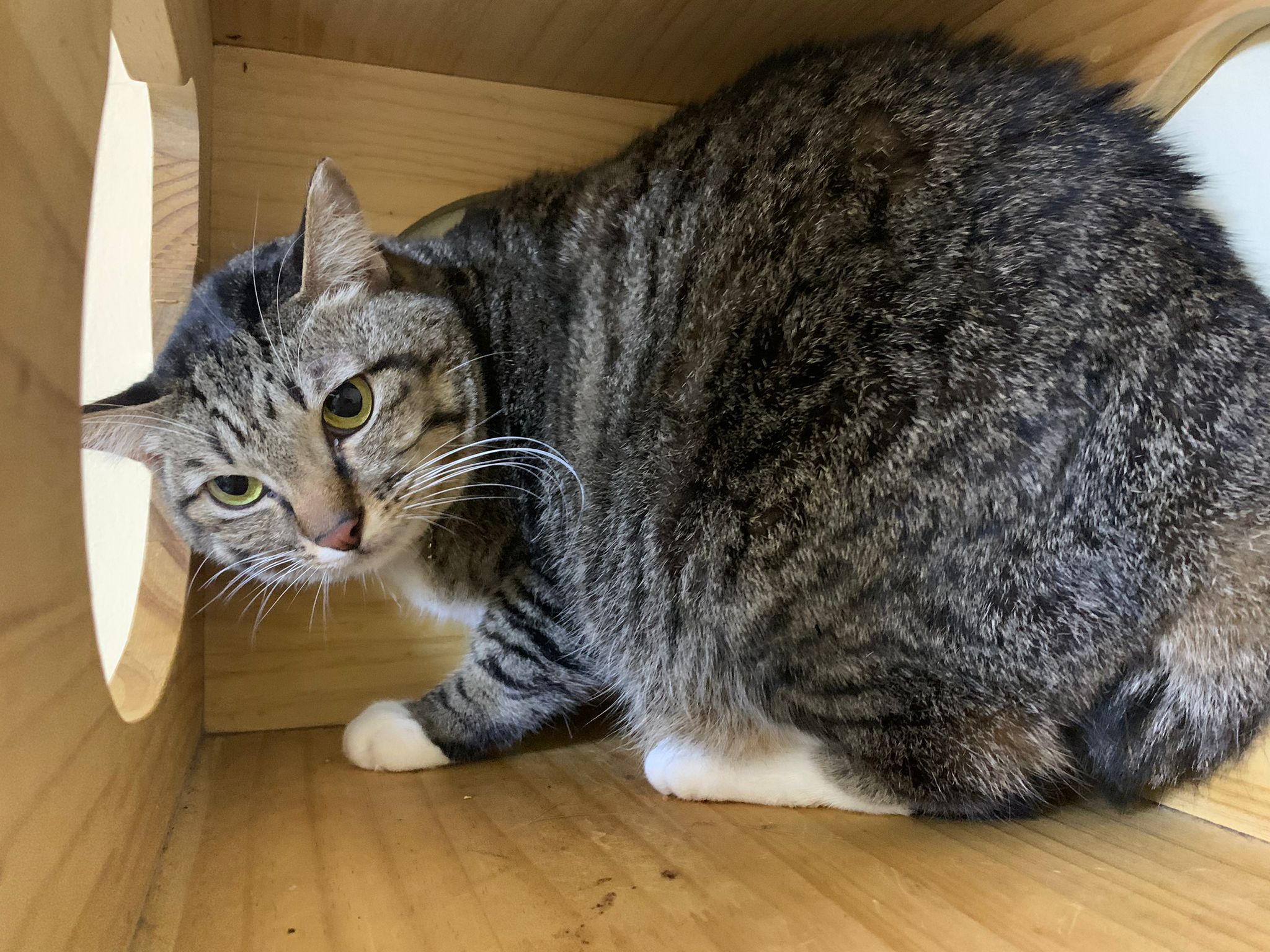 Entered 猫房 w her 2 brothers as 3 fierce kittens. Over the time in 猫房 free roaming and mixing with other cats n making friends, the boys are fine n I can kiss them. Nala still scare of everything, don’t allow touch will jump away. She will find Jack papa for comfy. Got to find a very patient adopter for her.
