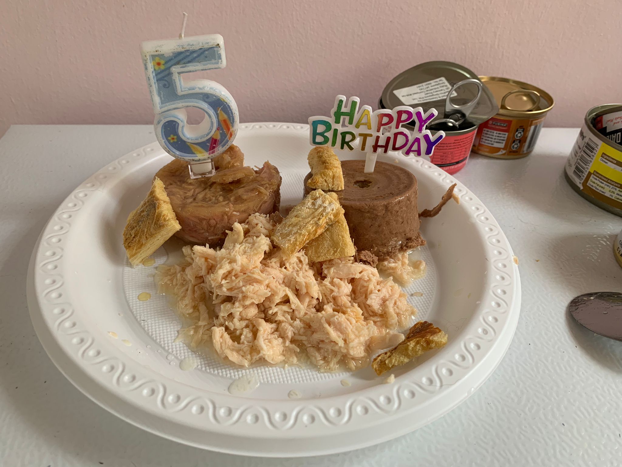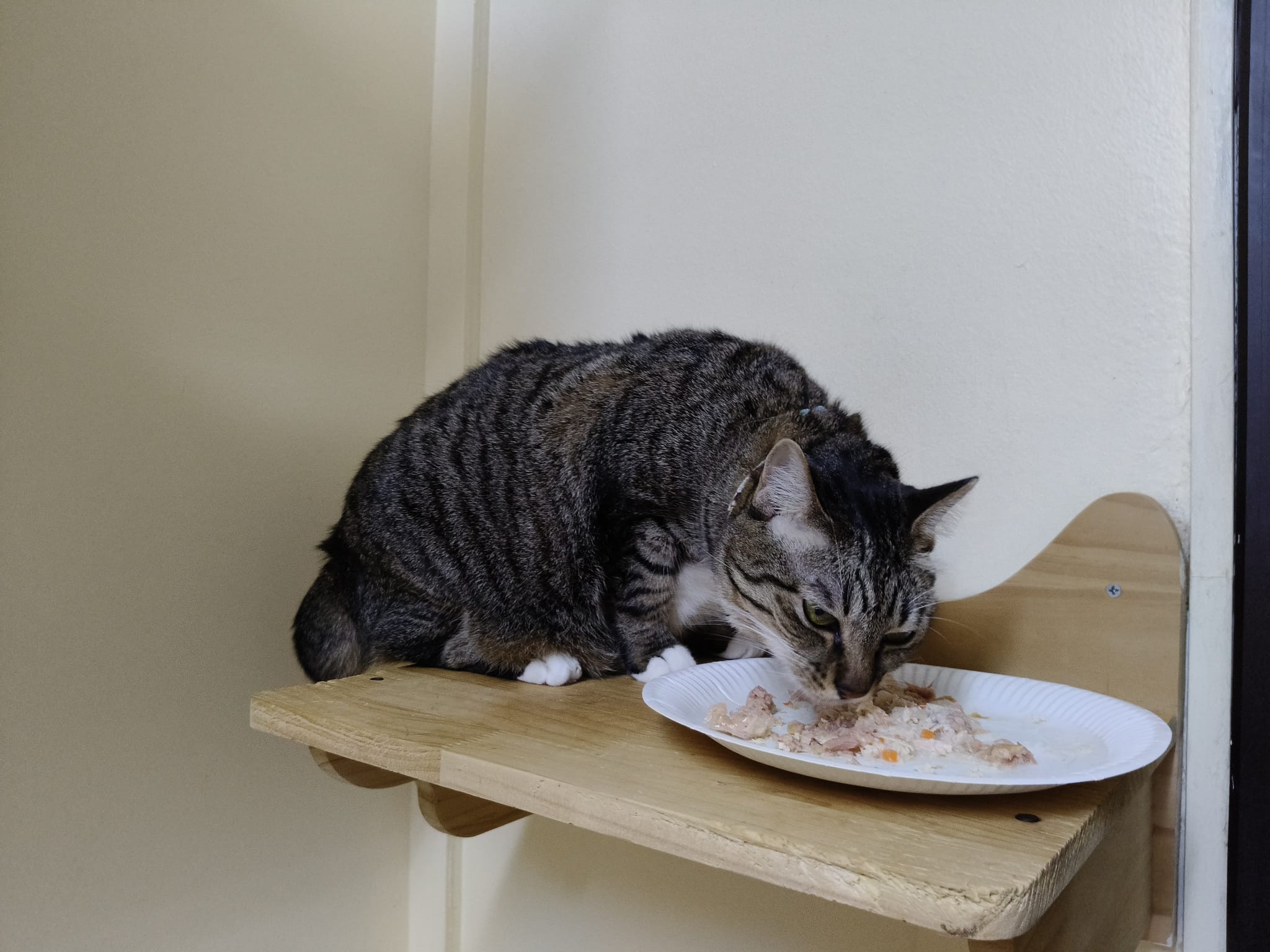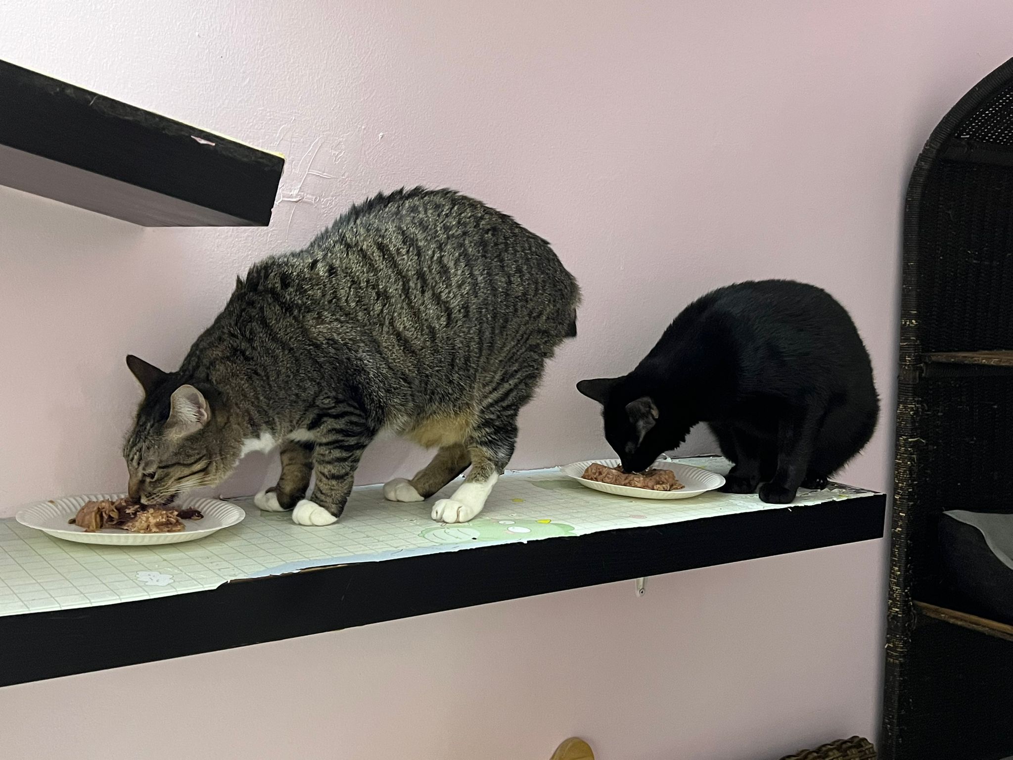 • has served them 2 bowls of kibble, 1 bowl water, 3 plates of tuna w salmon.