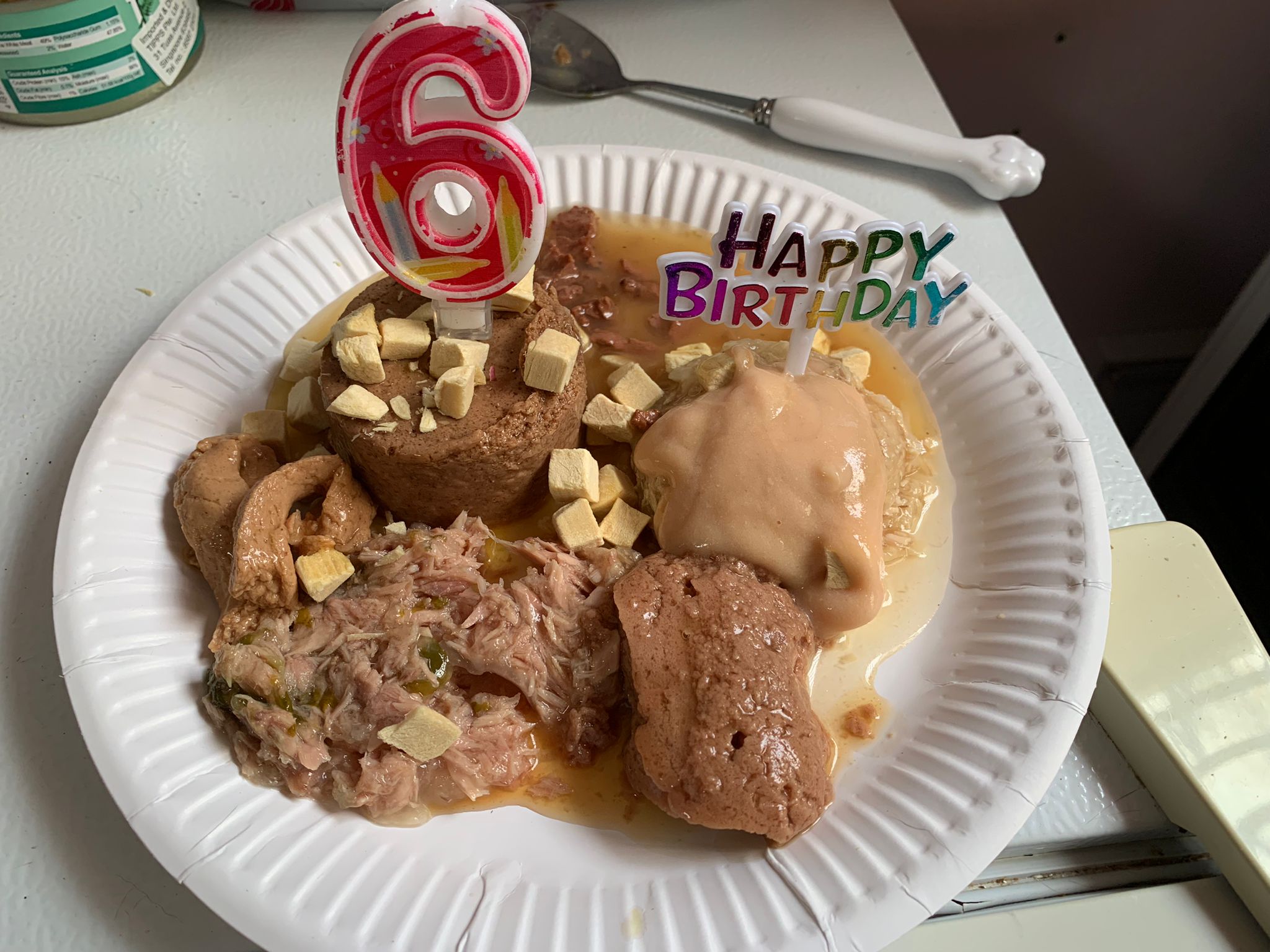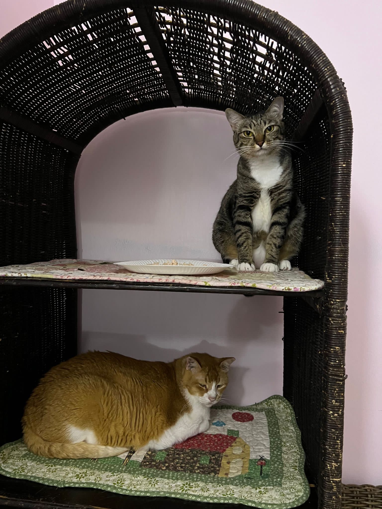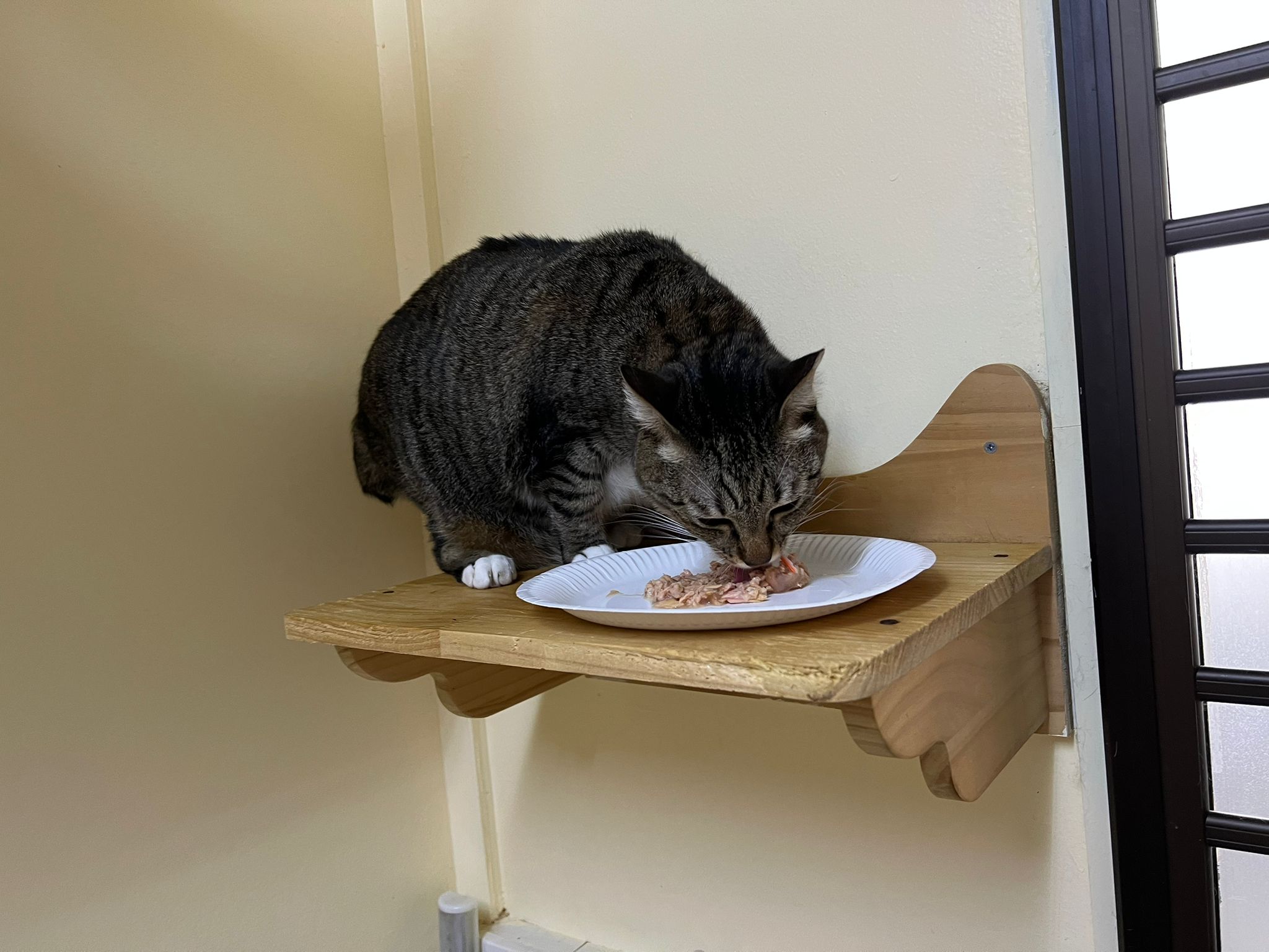 • has served them 2 bowls of kibble, 1 bowl water, 3 plates of tuna w salmon.