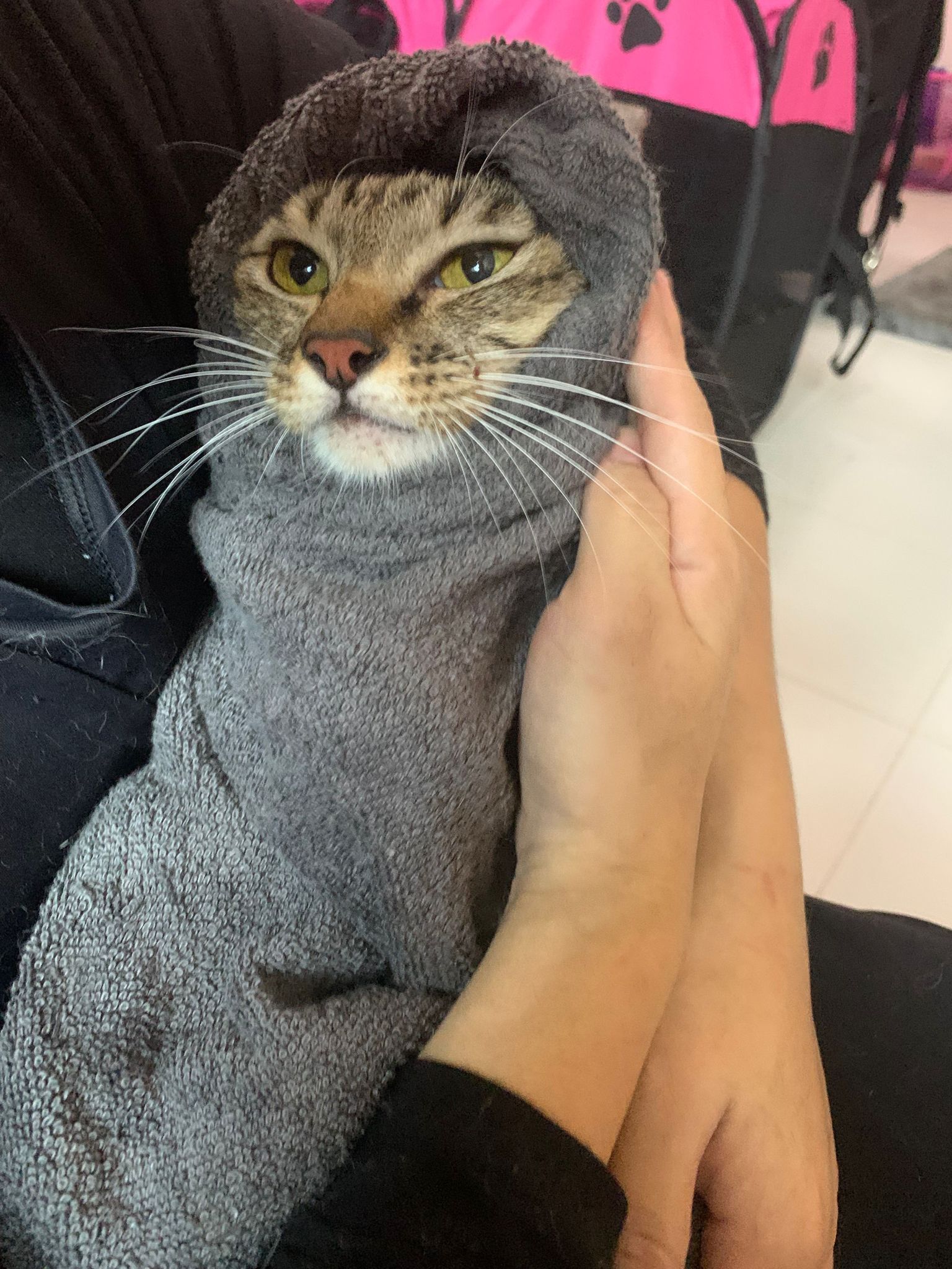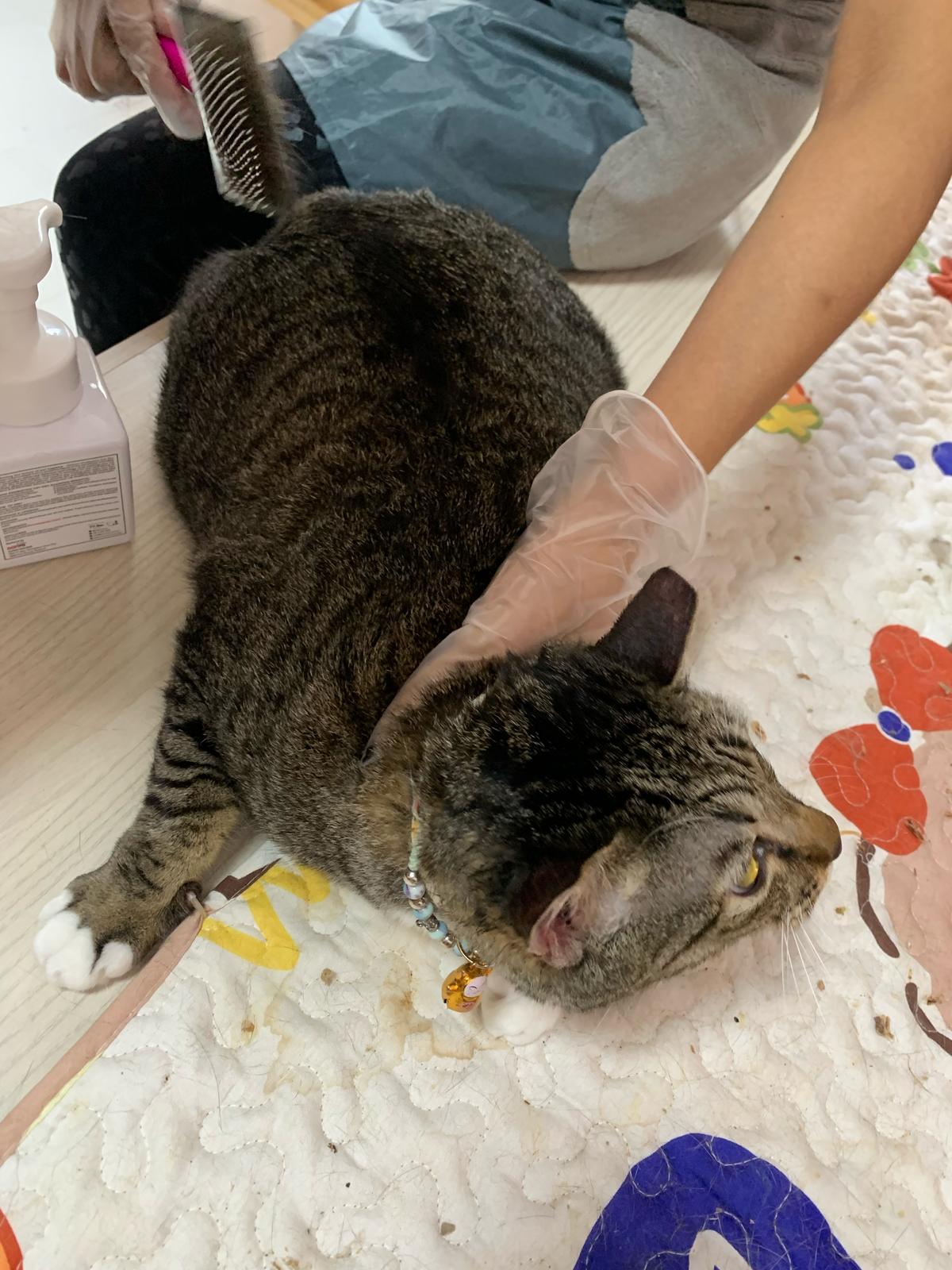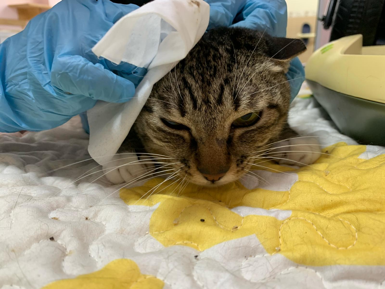 10am: basic grooming done – clean w dry shampoo, brush and wipe. Wipe ears and eyes. Nails cut. Sandra says she is purring when cleaning