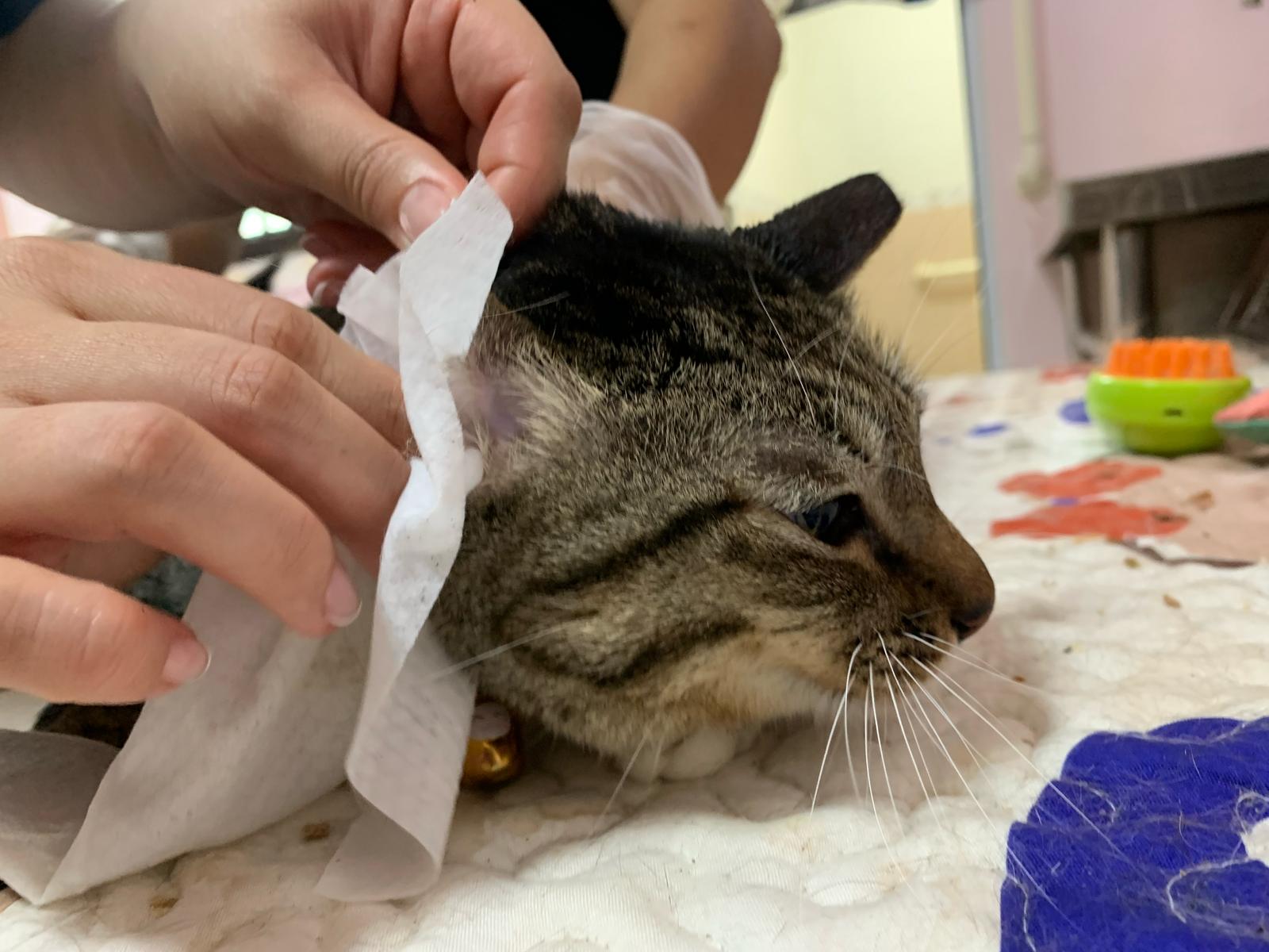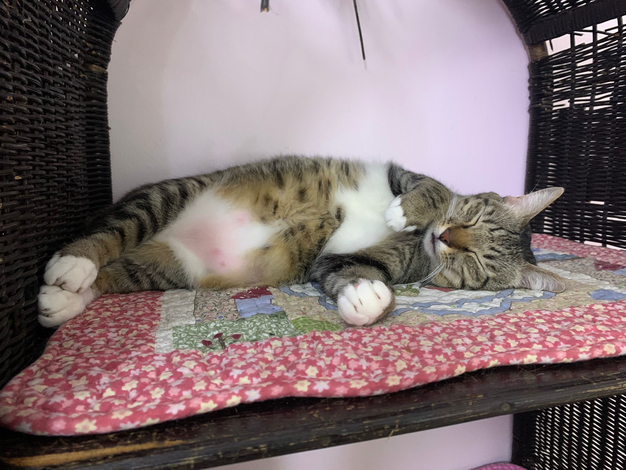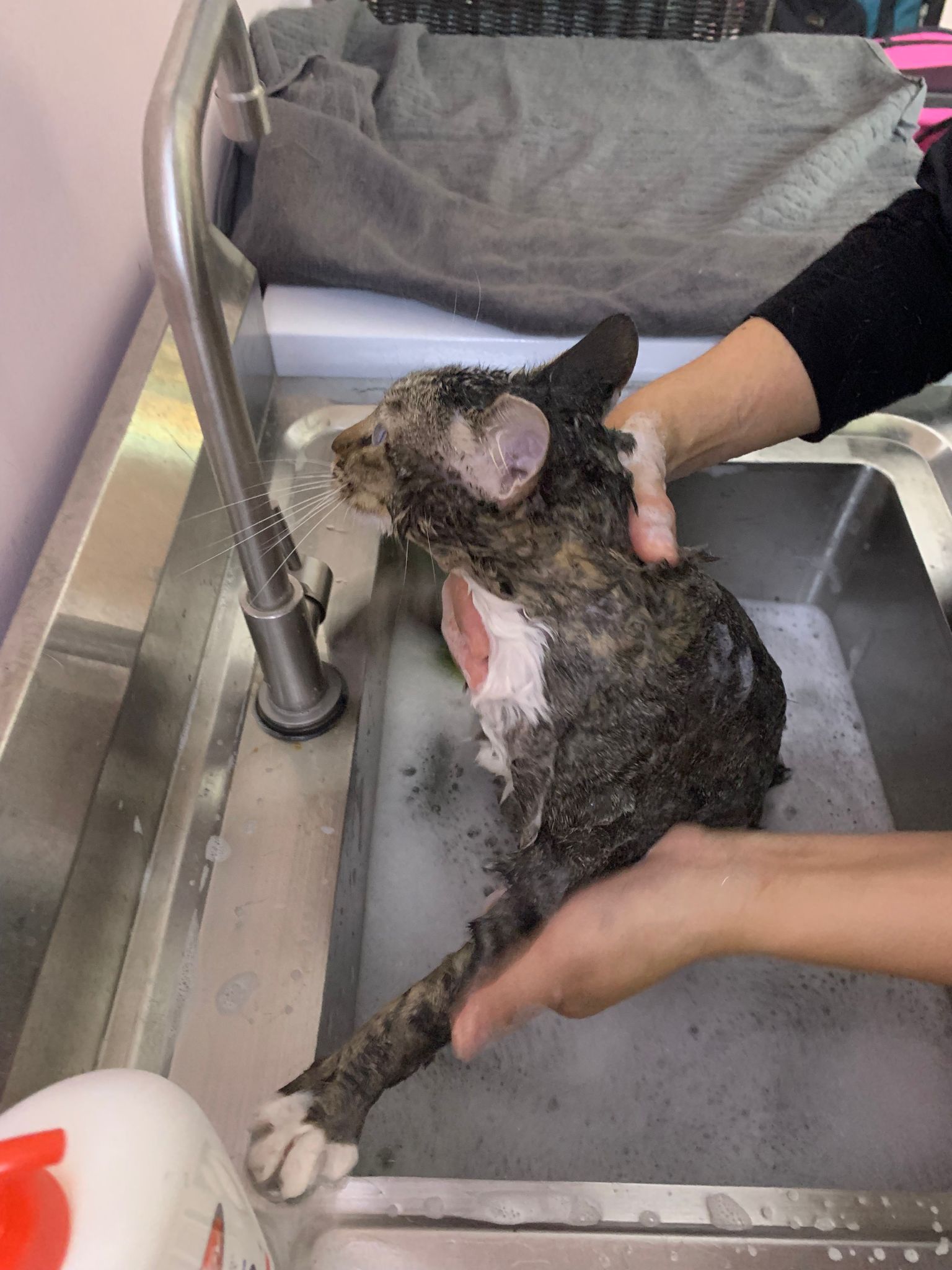 10am: basic grooming done – clean w dry shampoo, brush and wipe. Wipe ears and eyes. Nails cut. Sandra says she is purring when cleaning