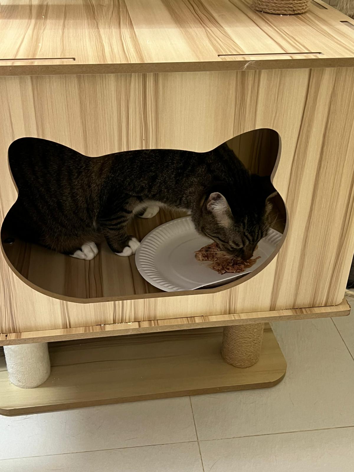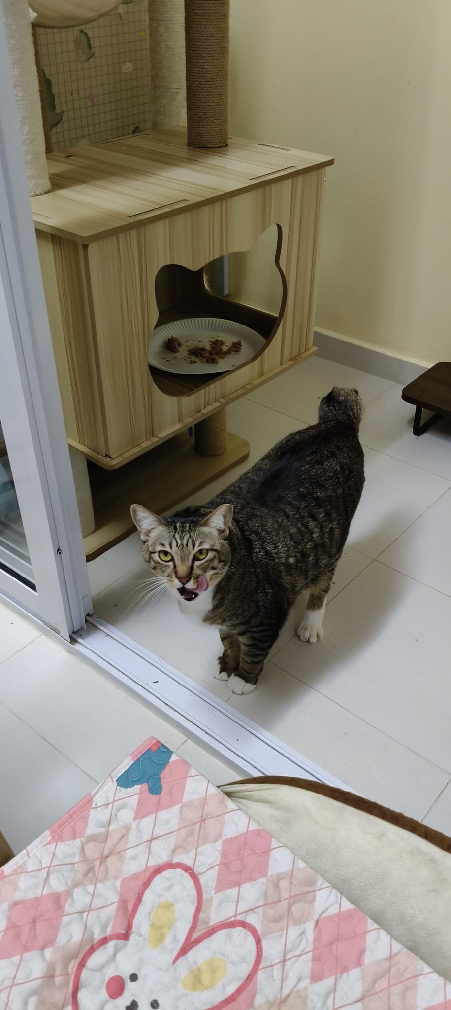 Night: she had been nonsense all along, scary for no reason, hiss for no reason, sometime even show attack mode for no reason, today smack her butt a few times to warn / scold her – still want attack. Later I go crazy hiss hiss n move forward want attack – then I tell her this is how u behave Loh. Sigh. I’m sure she don’t understand. Nvm. We close the night w me handing a soup of selar to her nose to give her. Fair enough, no one as crazy as Paul Paul.
