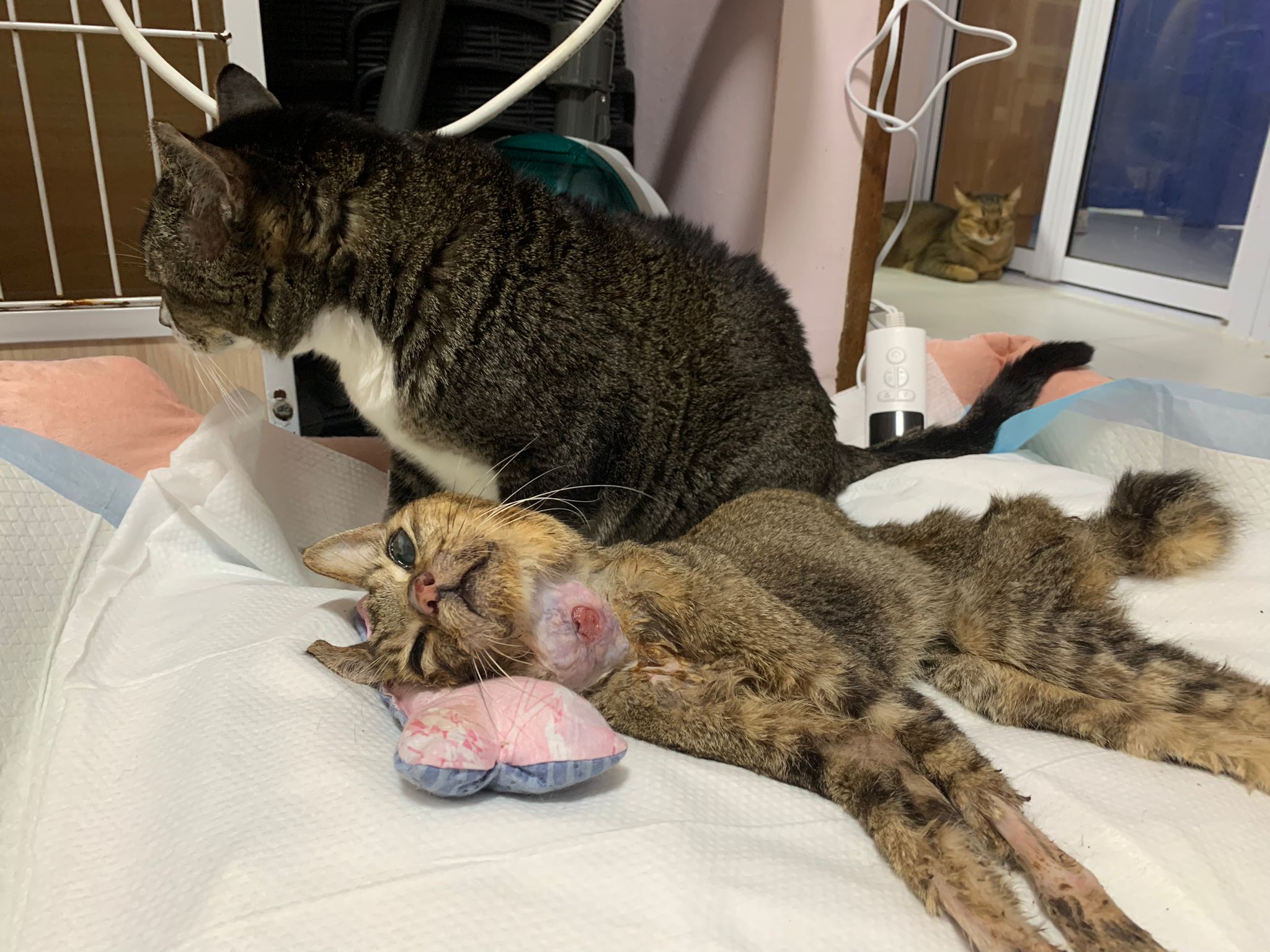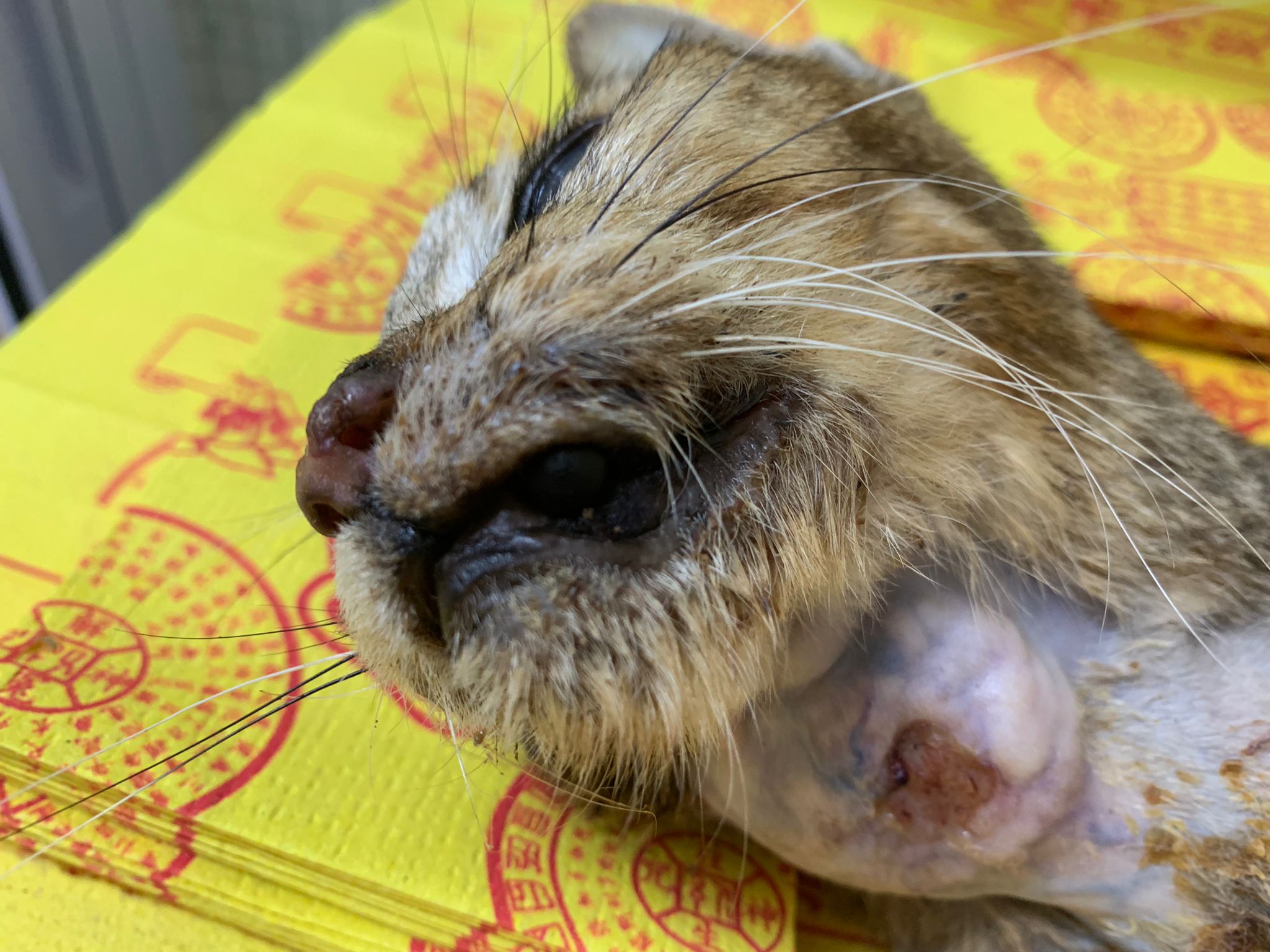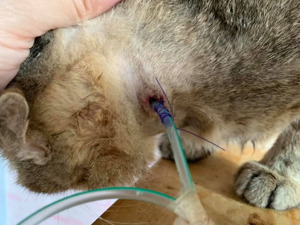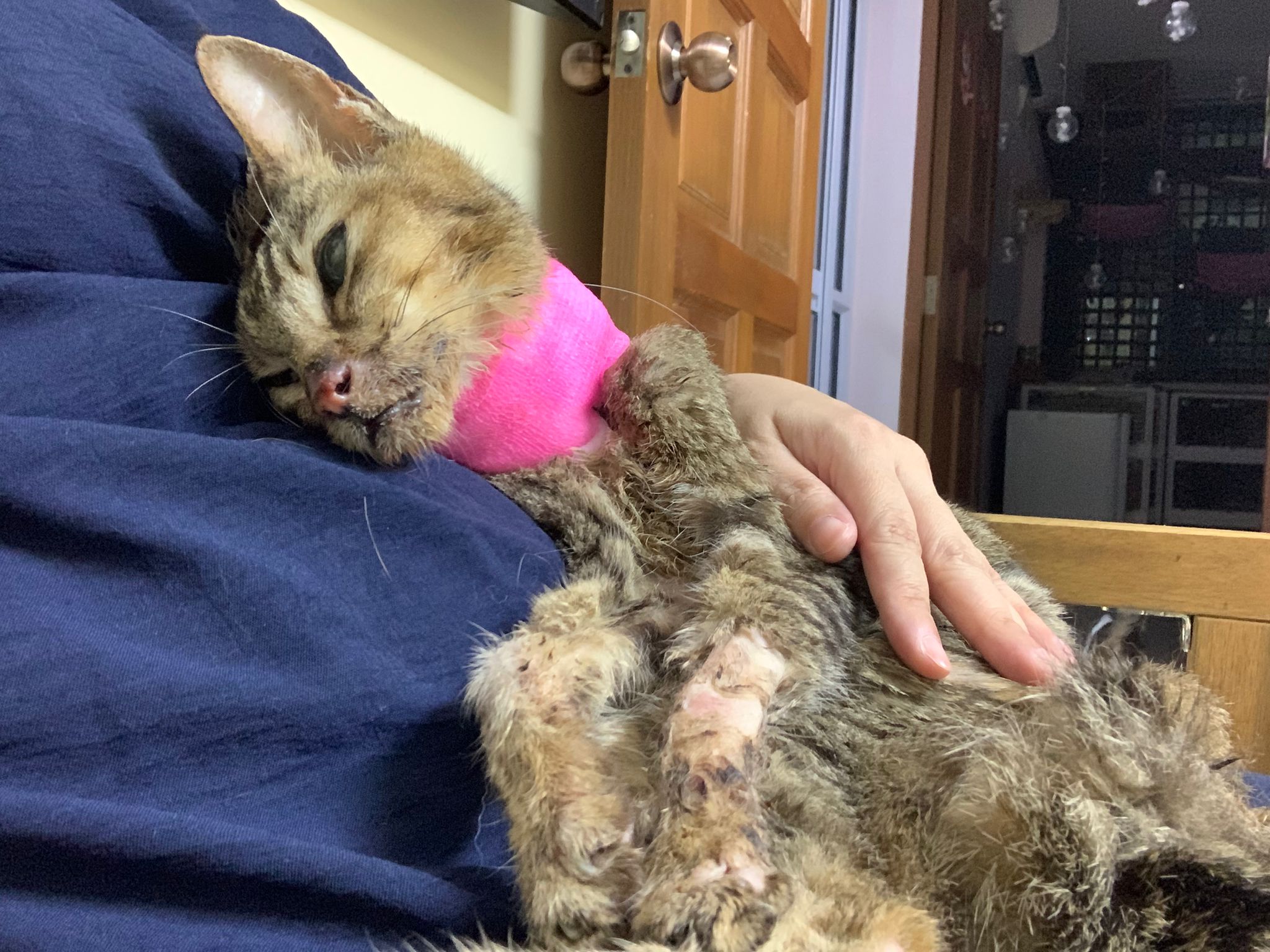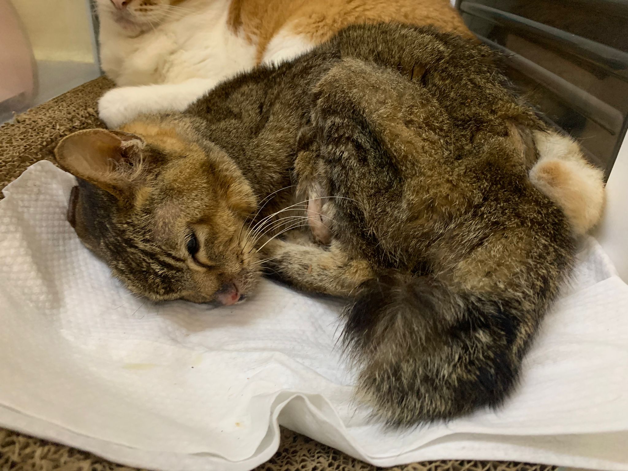 Morning: should be a good thing that she still got pus coming out … clean her up. She is still eating well. I’ll pack some of 猫房 stuff and give her another snack meal b4 I leave. I Subcut her left body, and the fluid flow to her leg again, now paw swollen. Tmr must remember to Subcut right side better (will flow to tummy)