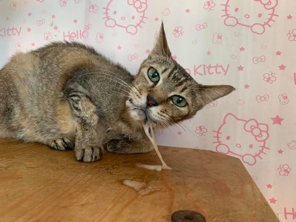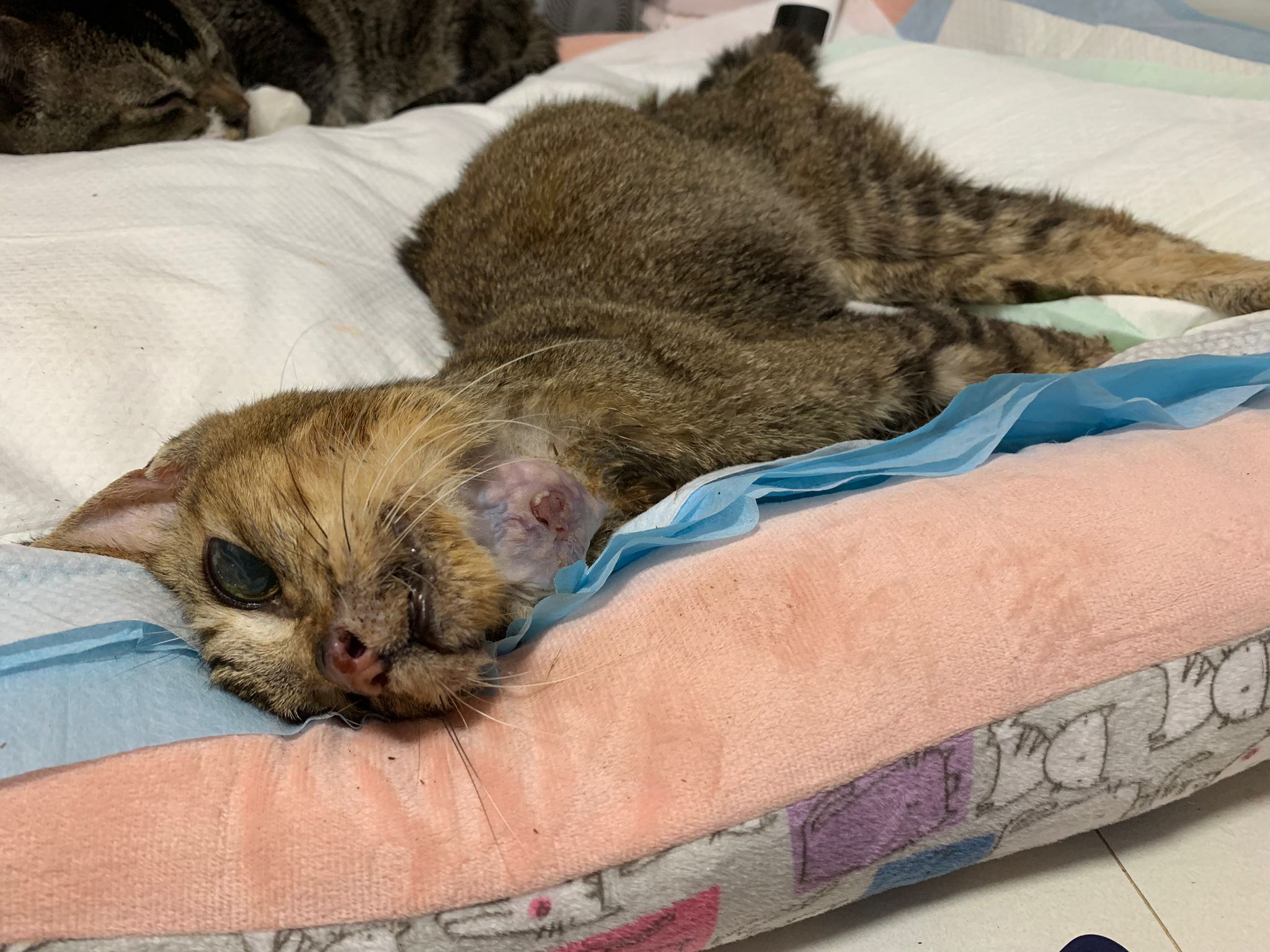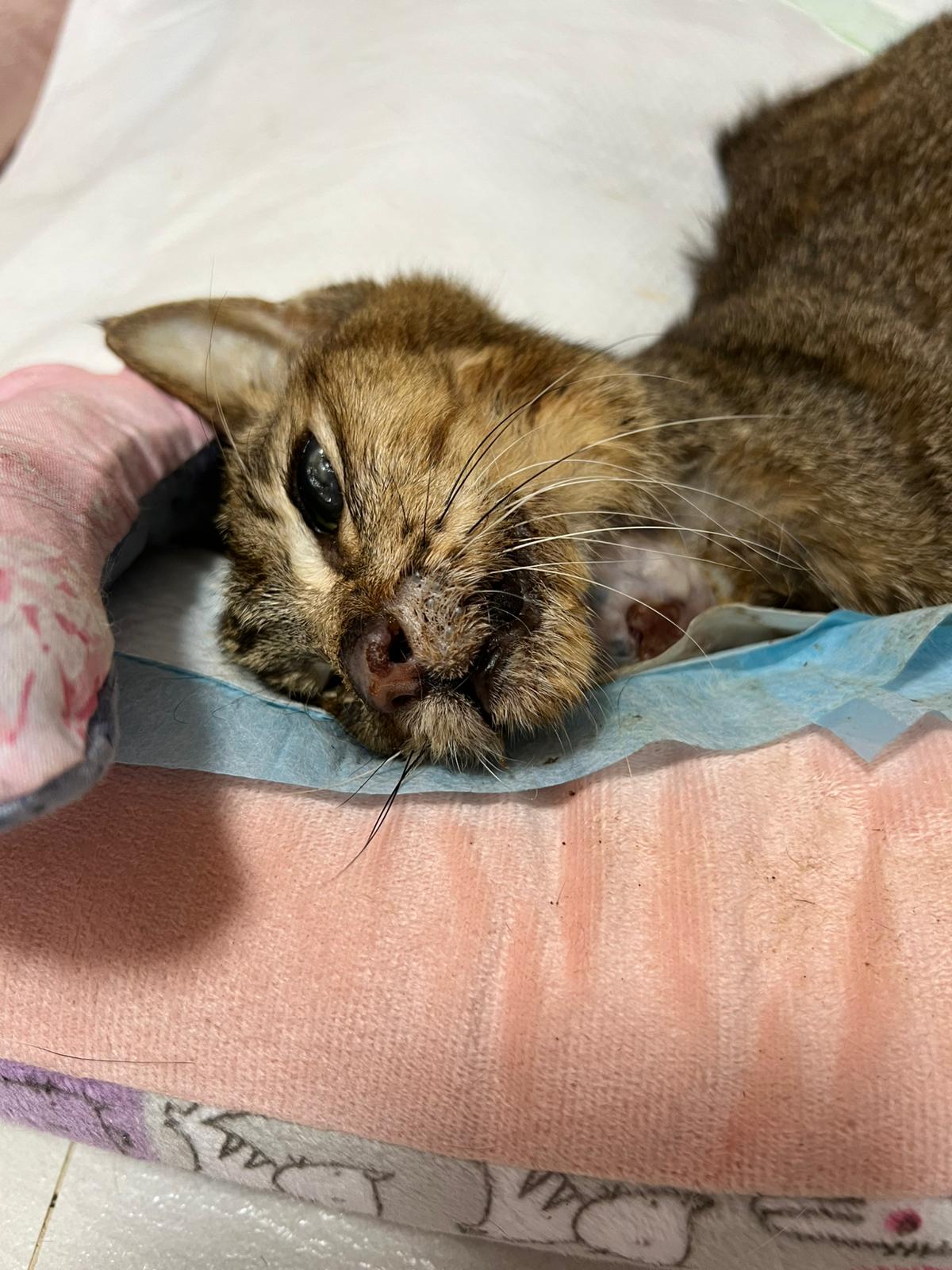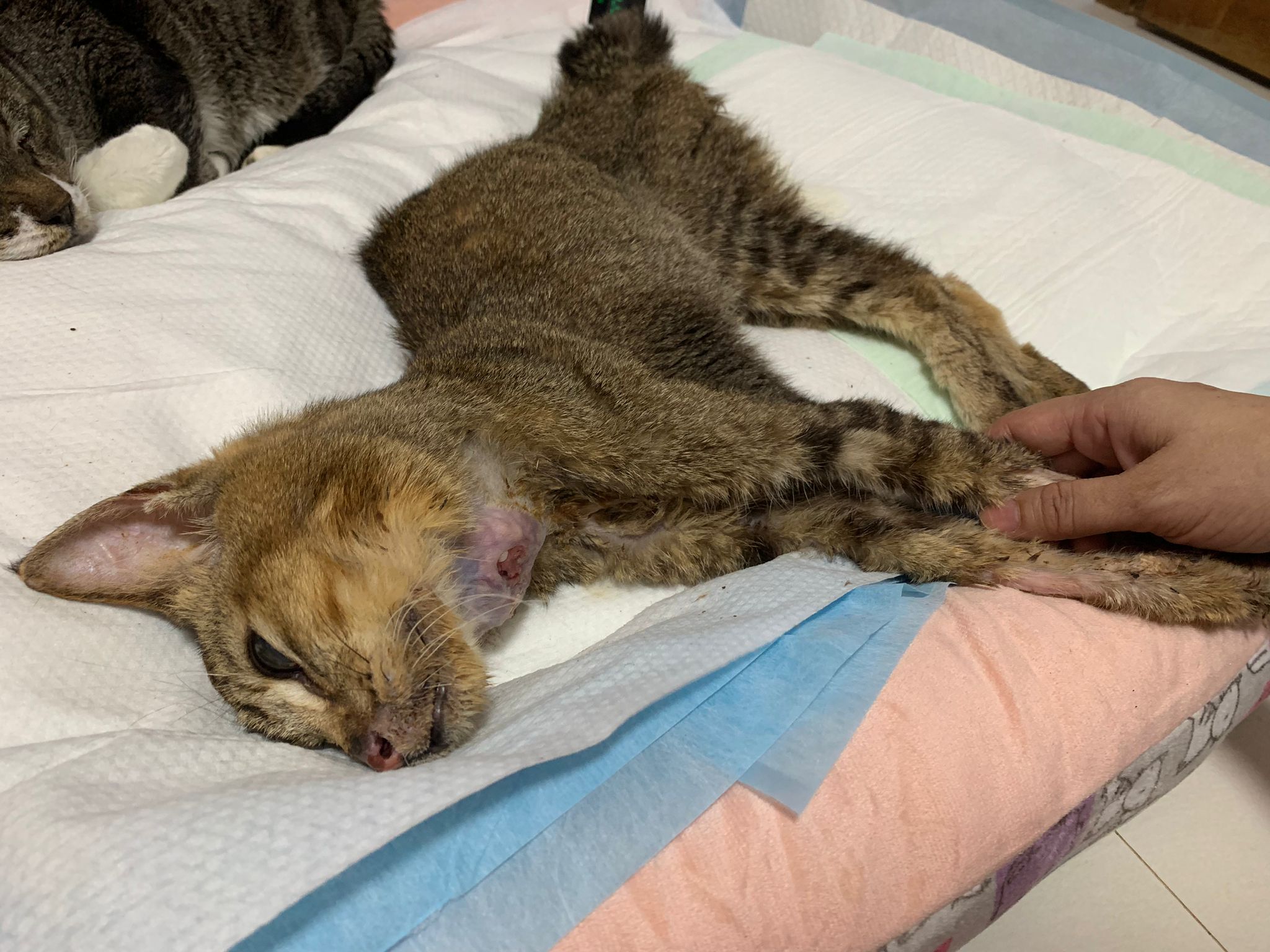 Morning: should be a good thing that she still got pus coming out … clean her up. She is still eating well. I’ll pack some of 猫房 stuff and give her another snack meal b4 I leave. I Subcut her left body, and the fluid flow to her leg again, now paw swollen. Tmr must remember to Subcut right side better (will flow to tummy)