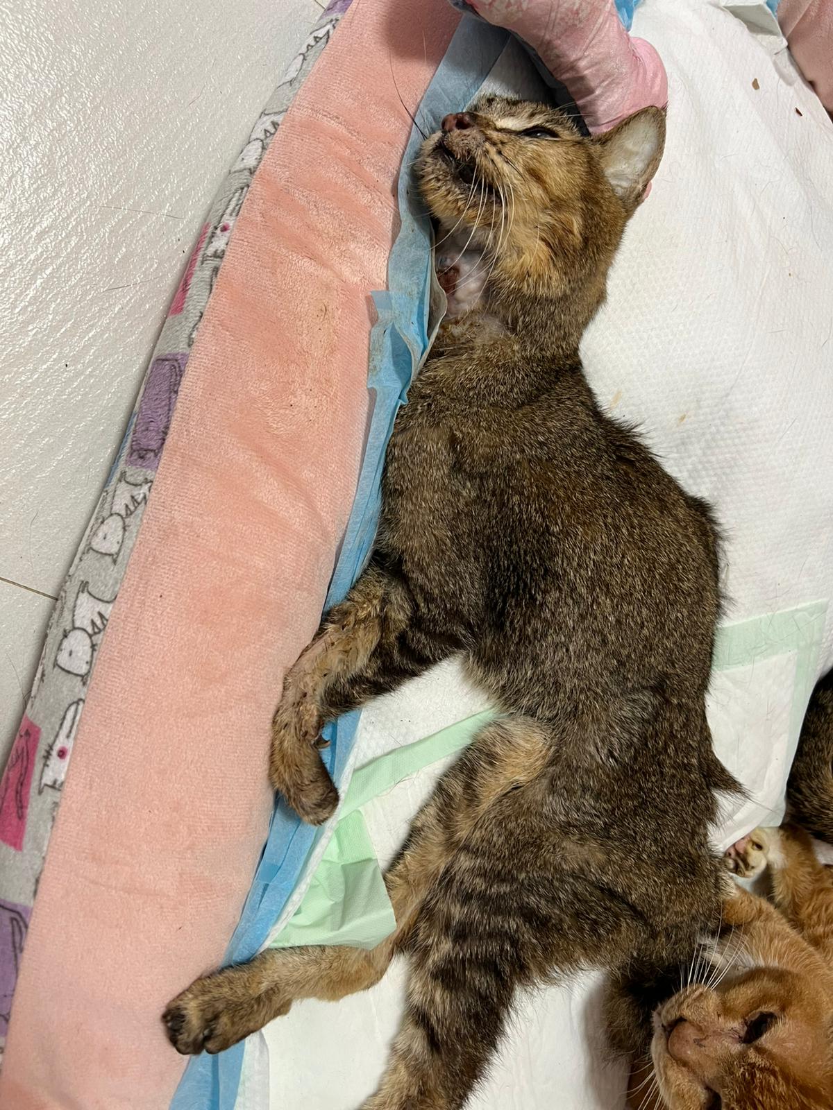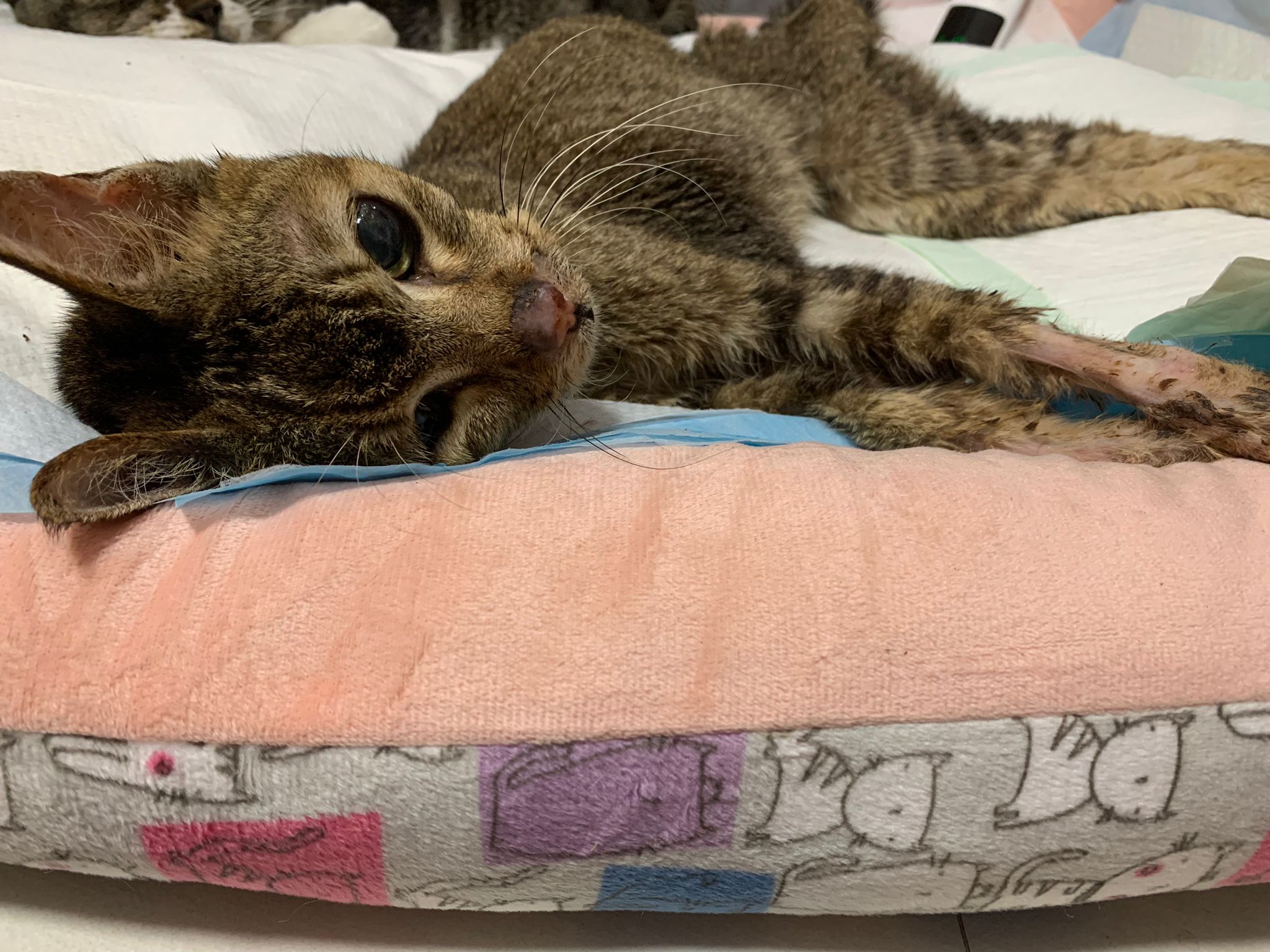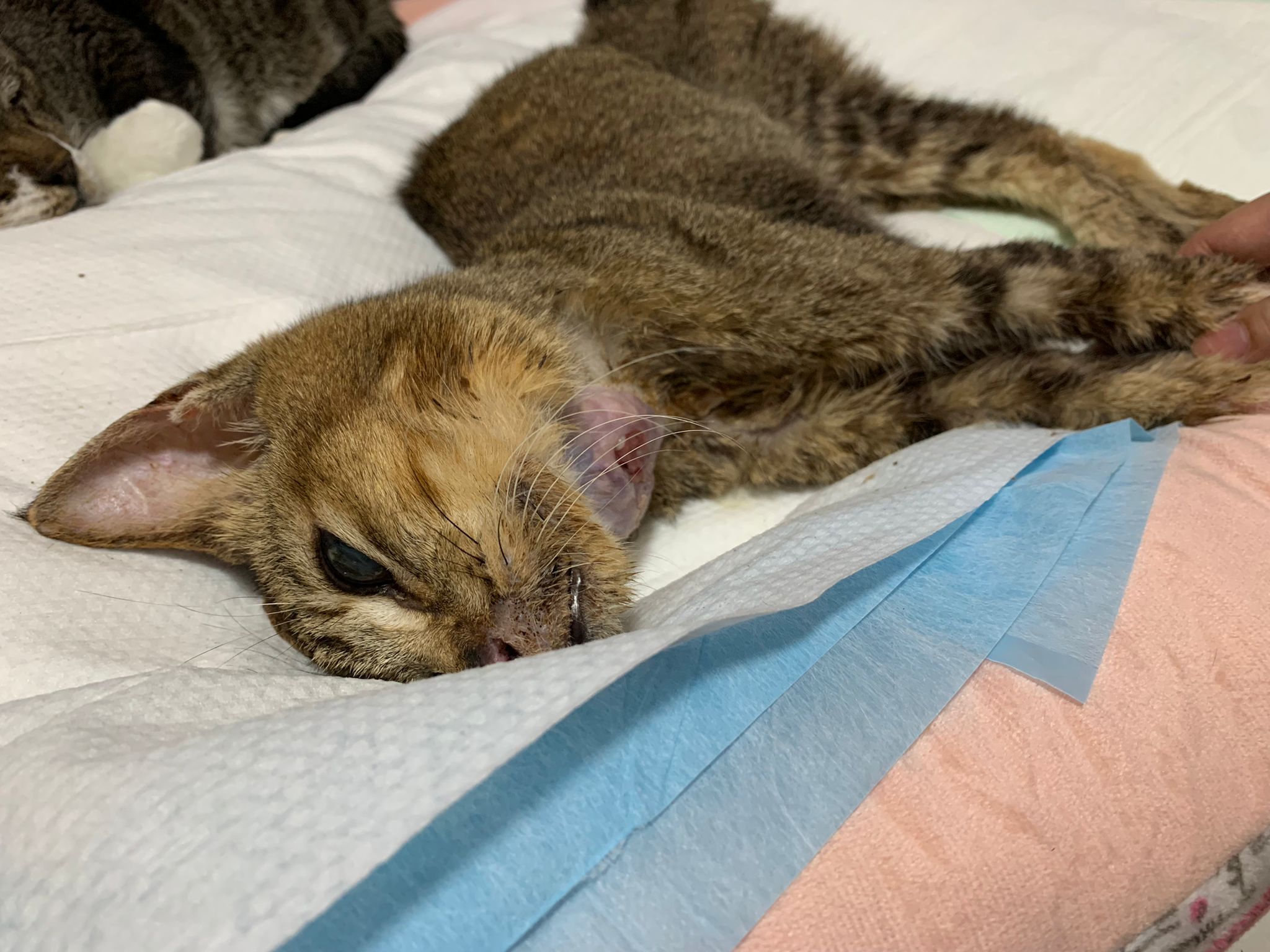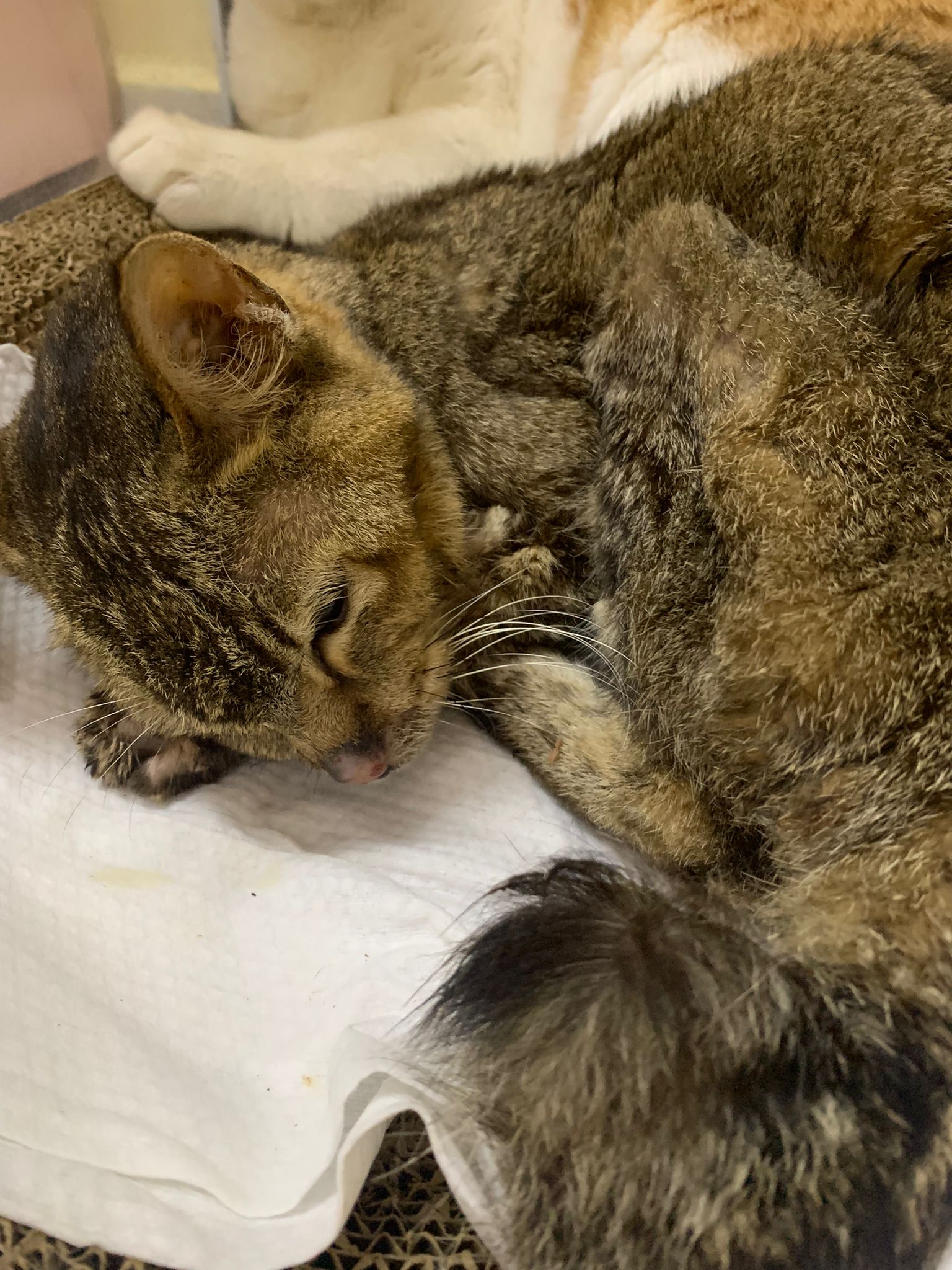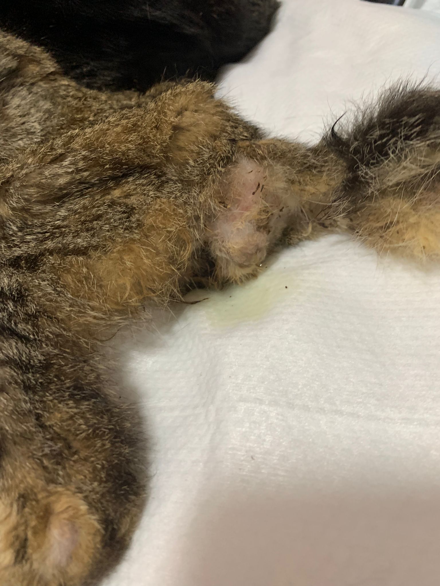 Morning: should be a good thing that she still got pus coming out … clean her up. She is still eating well. I’ll pack some of 猫房 stuff and give her another snack meal b4 I leave. I Subcut her left body, and the fluid flow to her leg again, now paw swollen. Tmr must remember to Subcut right side better (will flow to tummy)