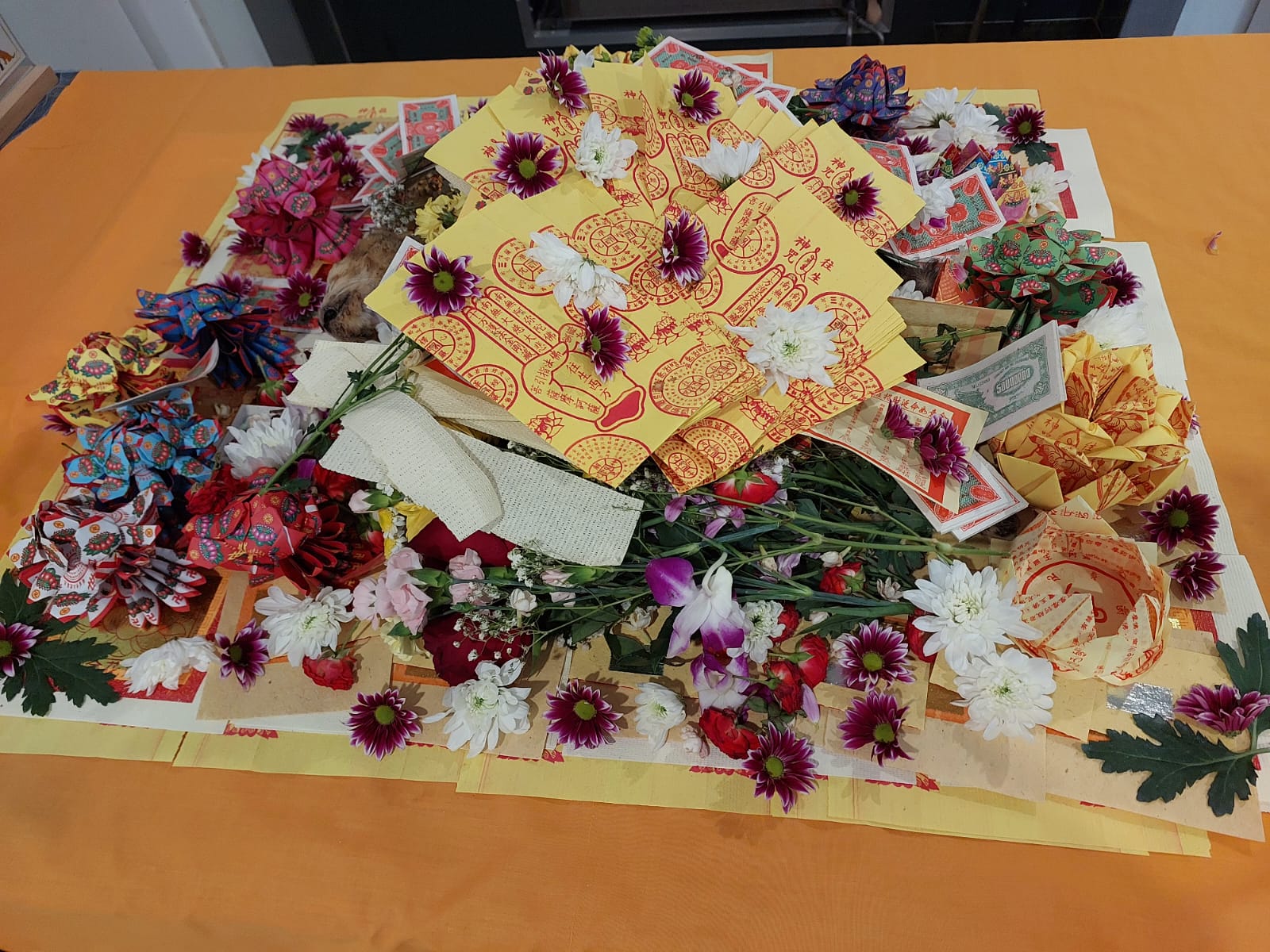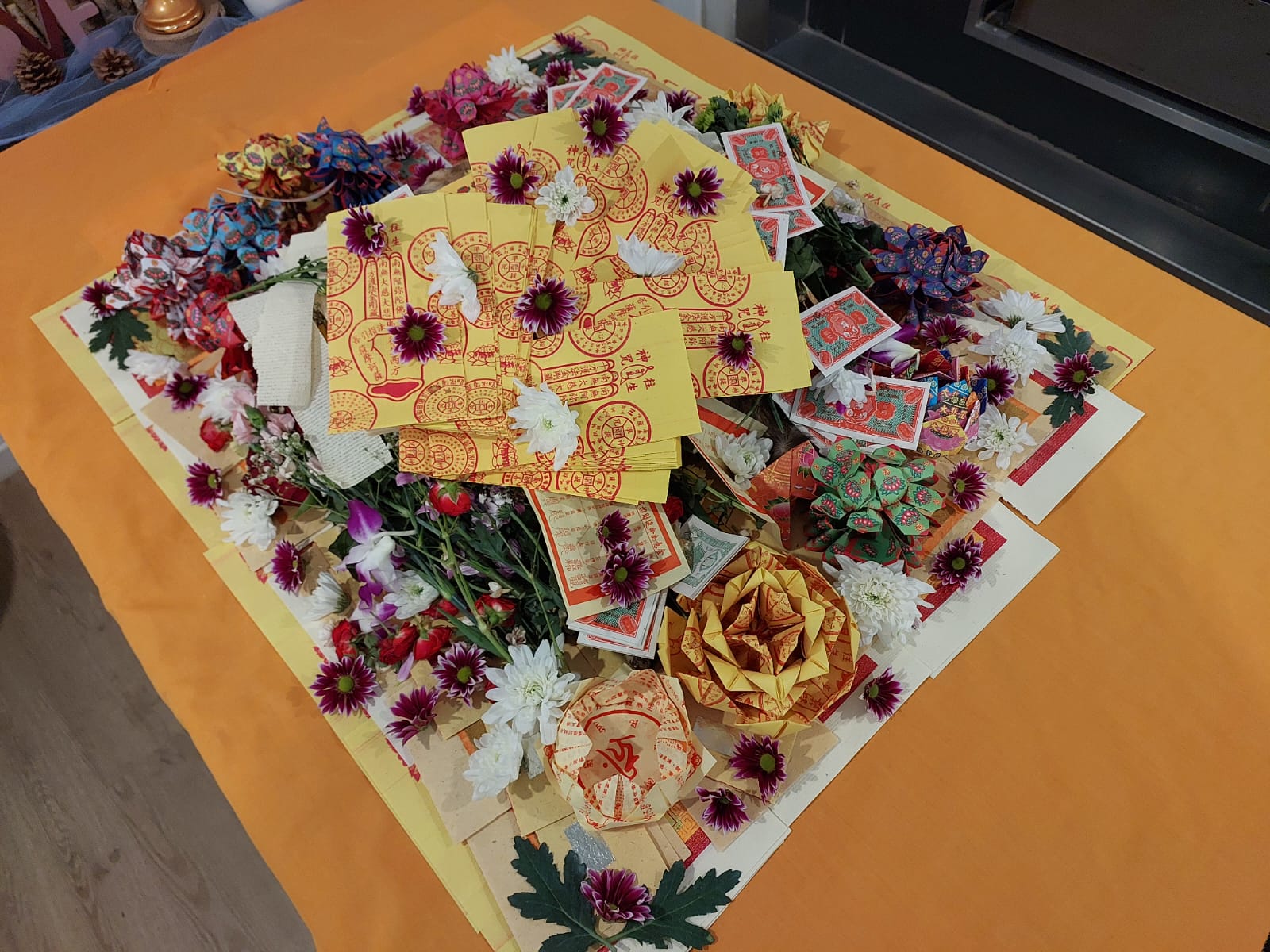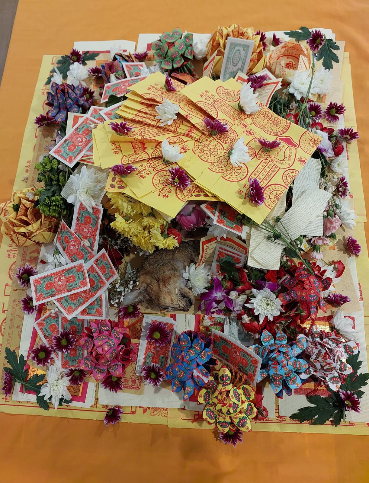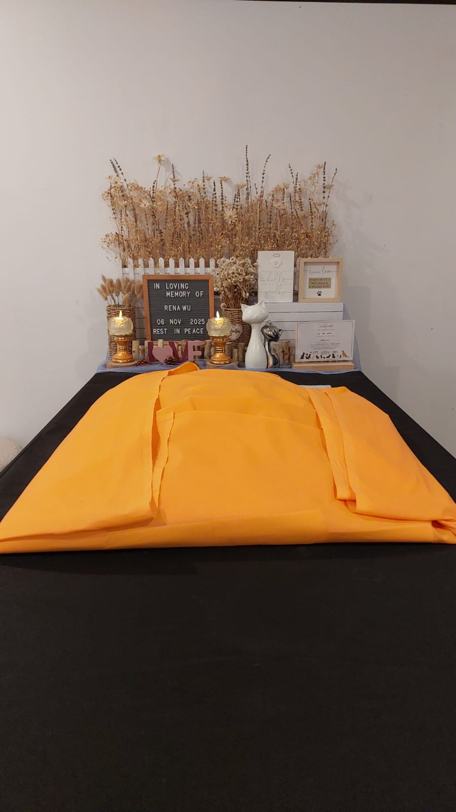 12pm+: by now, her funeral ready. I gave the basic bedding, and sal came by and she top more of those praying stuff, and 往生沙 and a pearl for rena to keep in mouth. Rena mouth is shut I know she don’t like pple to open her mouth, i tried cos of auntie blessing and she pray while I do that, but I don’t want force rena mouth open, so put at the side of her gum.