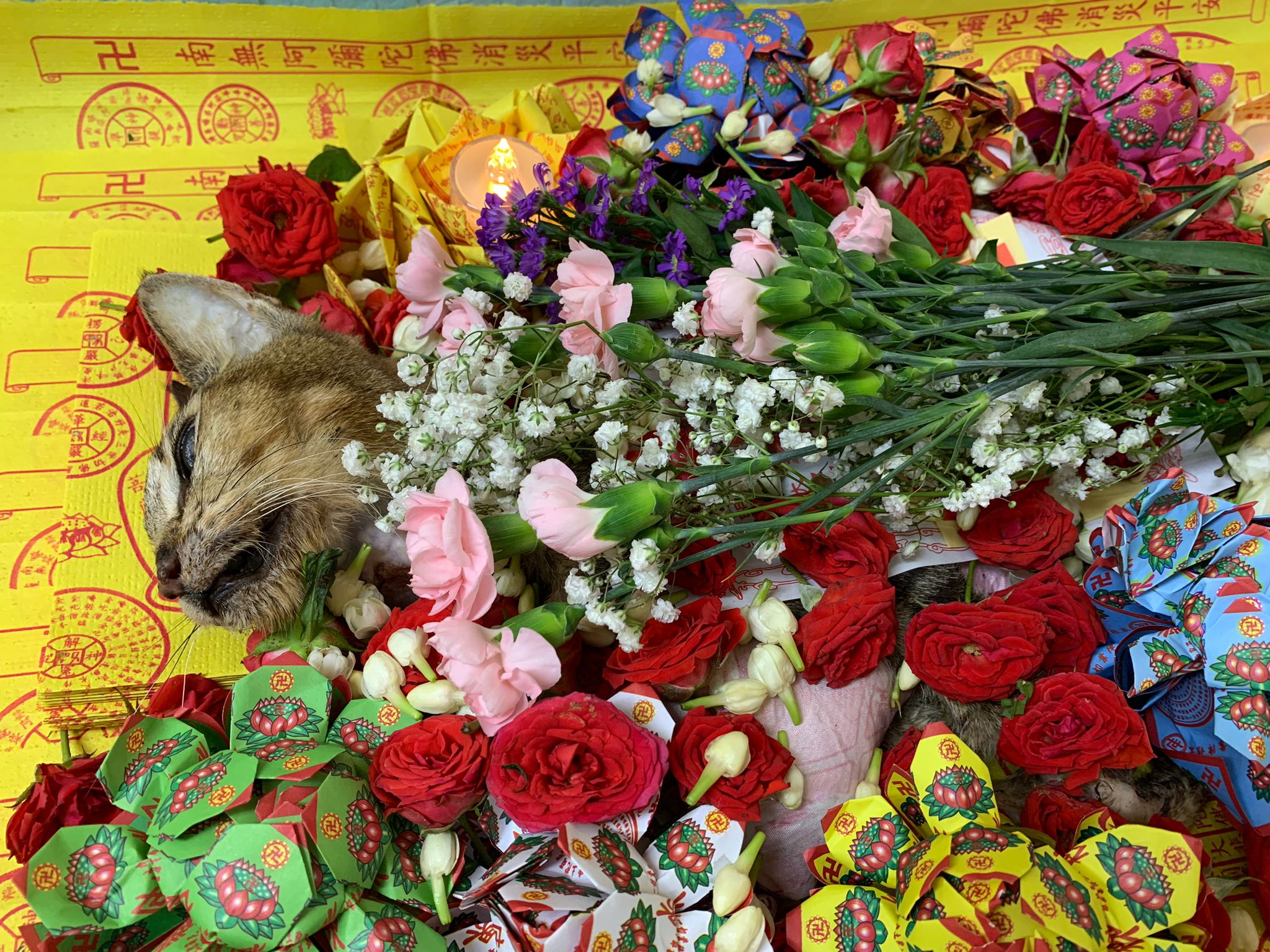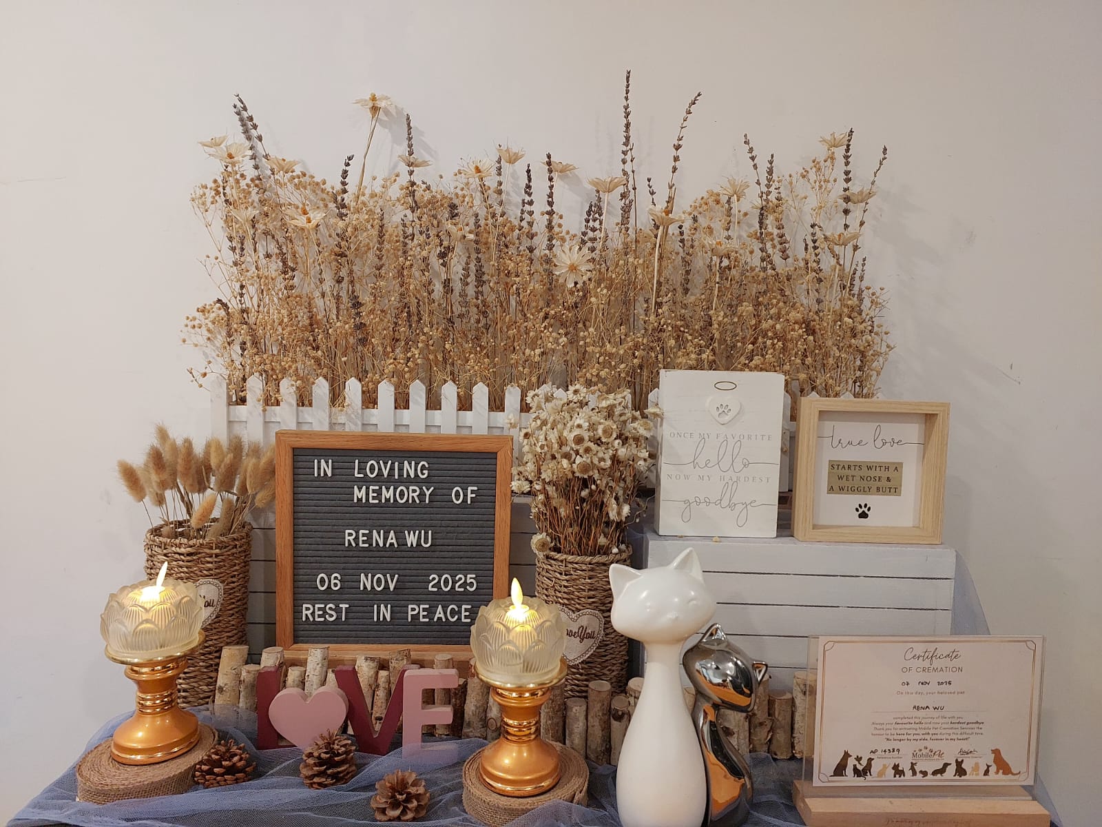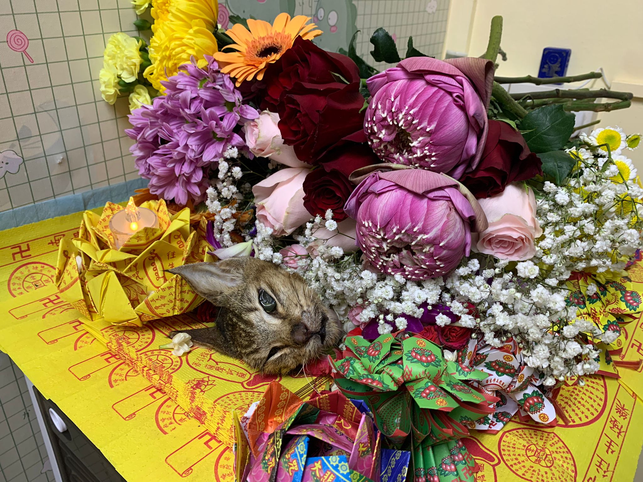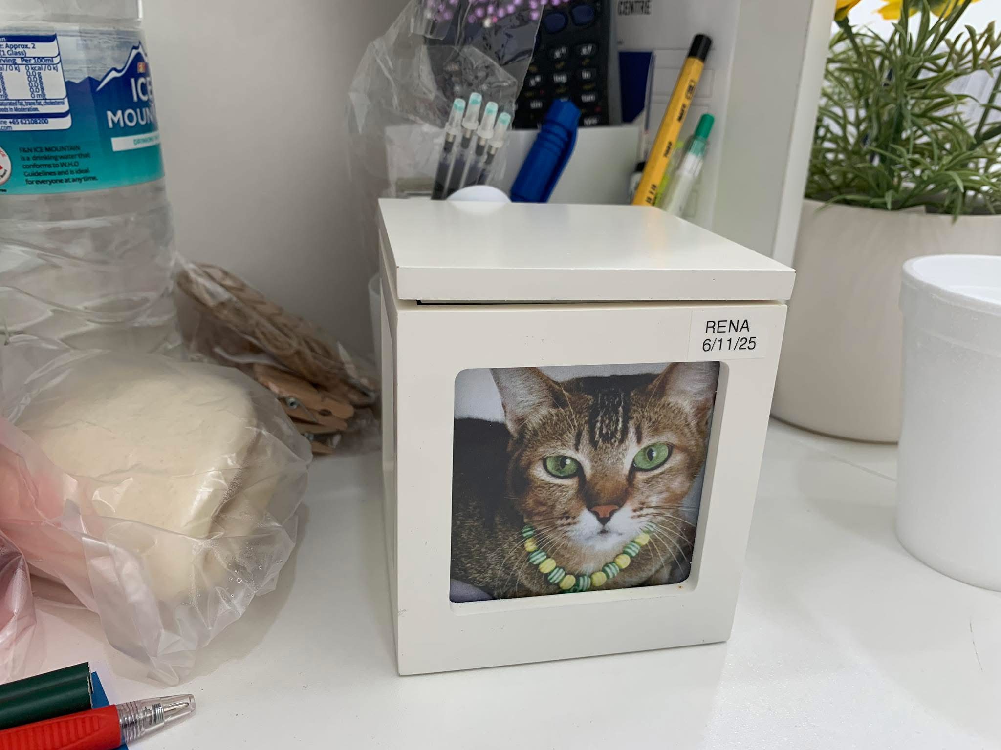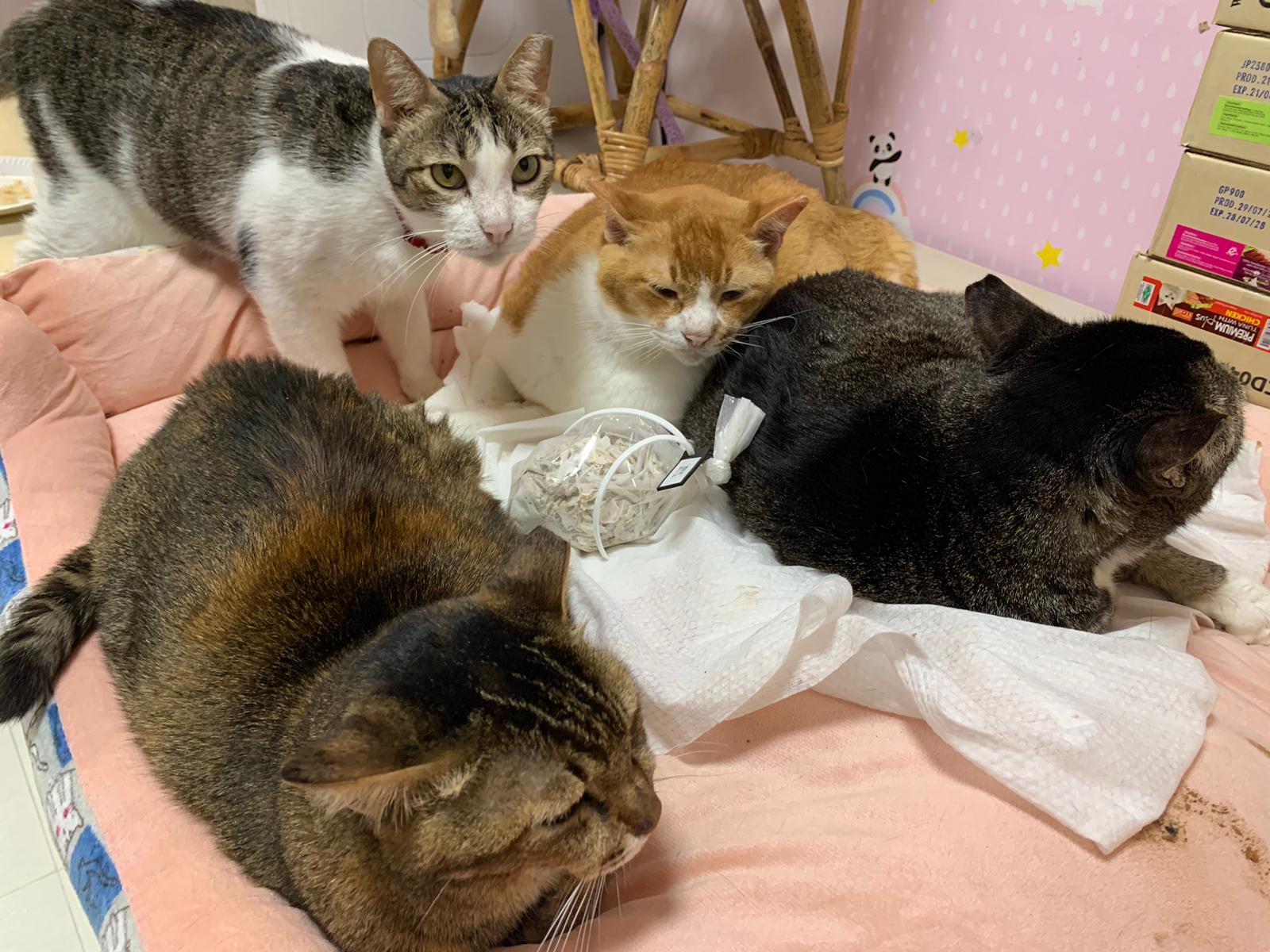 11.10am+: rena is back, n I bring her onto the bed, Jack, buddy sena is on it, so she can laze w them for a while. Kitty came to kiss rena, while I extract rena 10 years photos, last time Kitty and rena always in 2g kitchen food shelves 🙂 they r friends. told them I’m bringing rena back home to visit then go center prep her urn and party photos and labels.